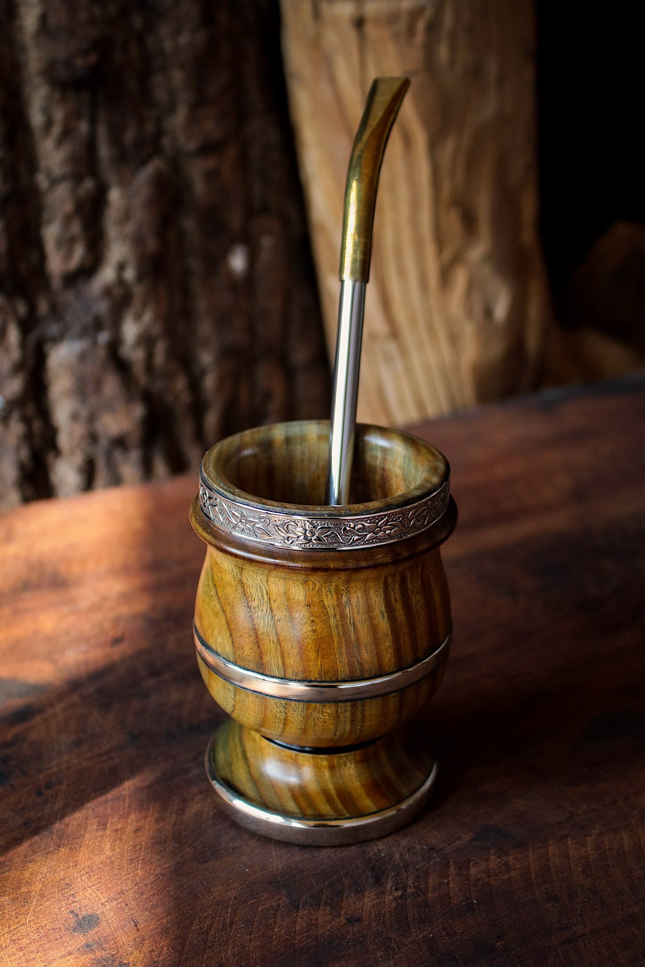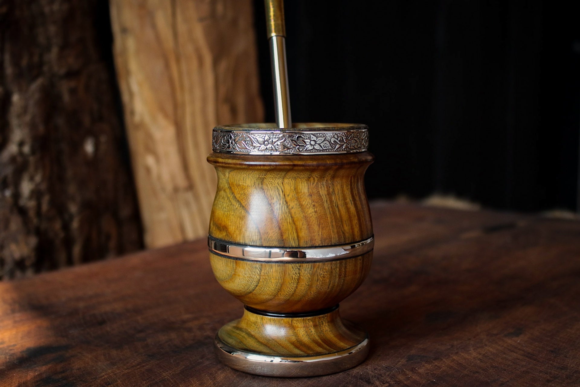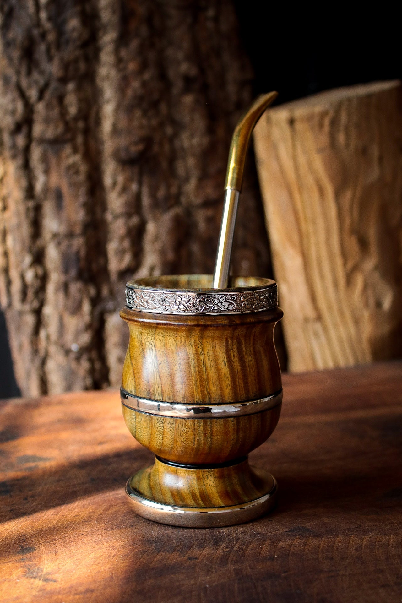 Mate de Palo Santo calado a mano en una sola pieza de madera y cincelado con alpaca en base y virola.
