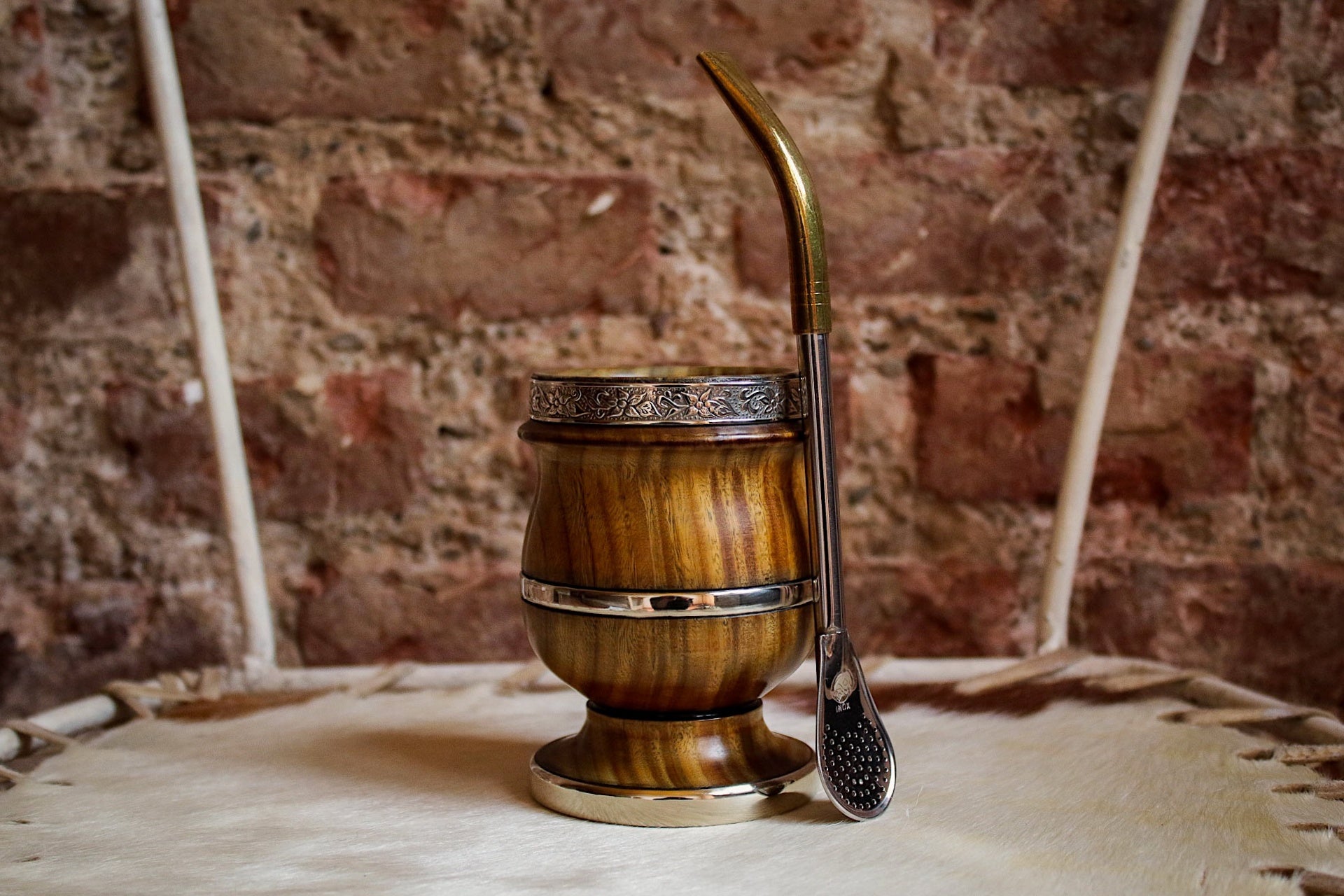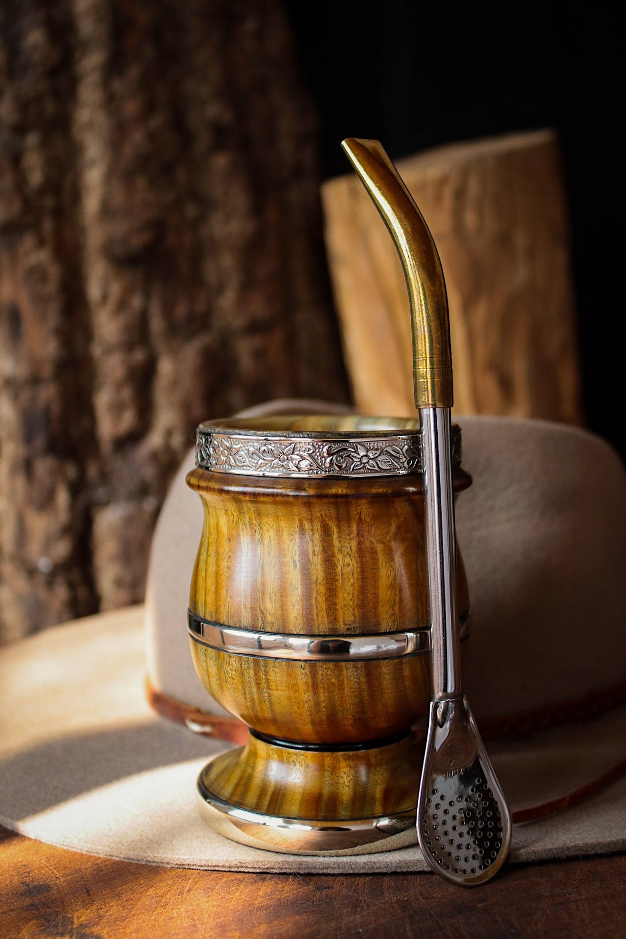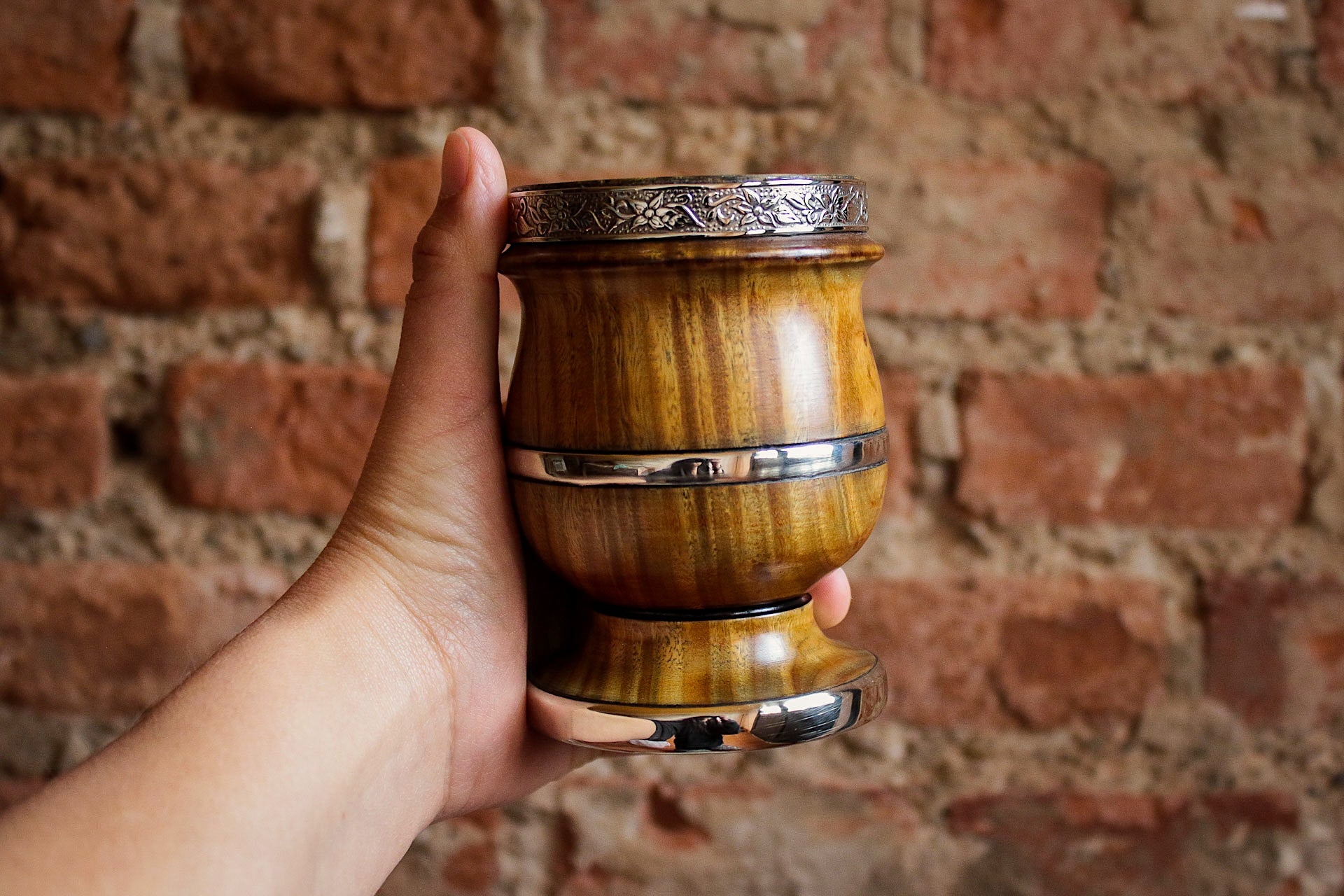 Mate de Palo Santo calado a mano en una sola pieza de madera y cincelado con alpaca en base y virola.