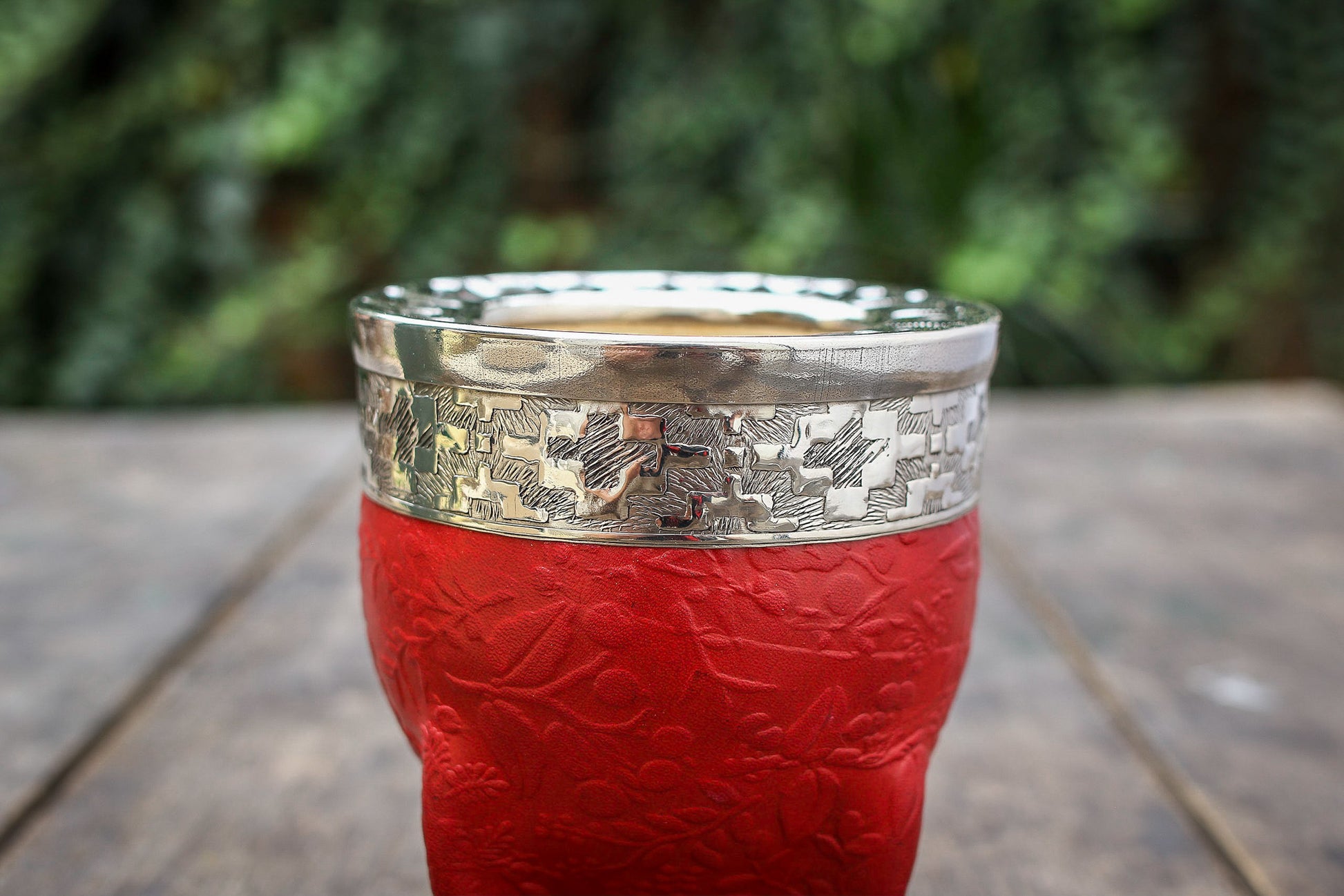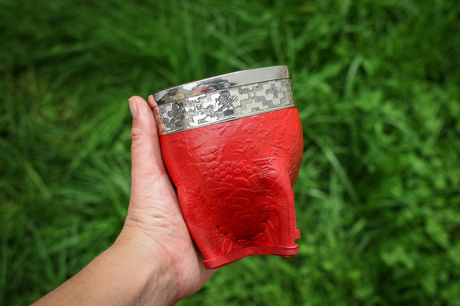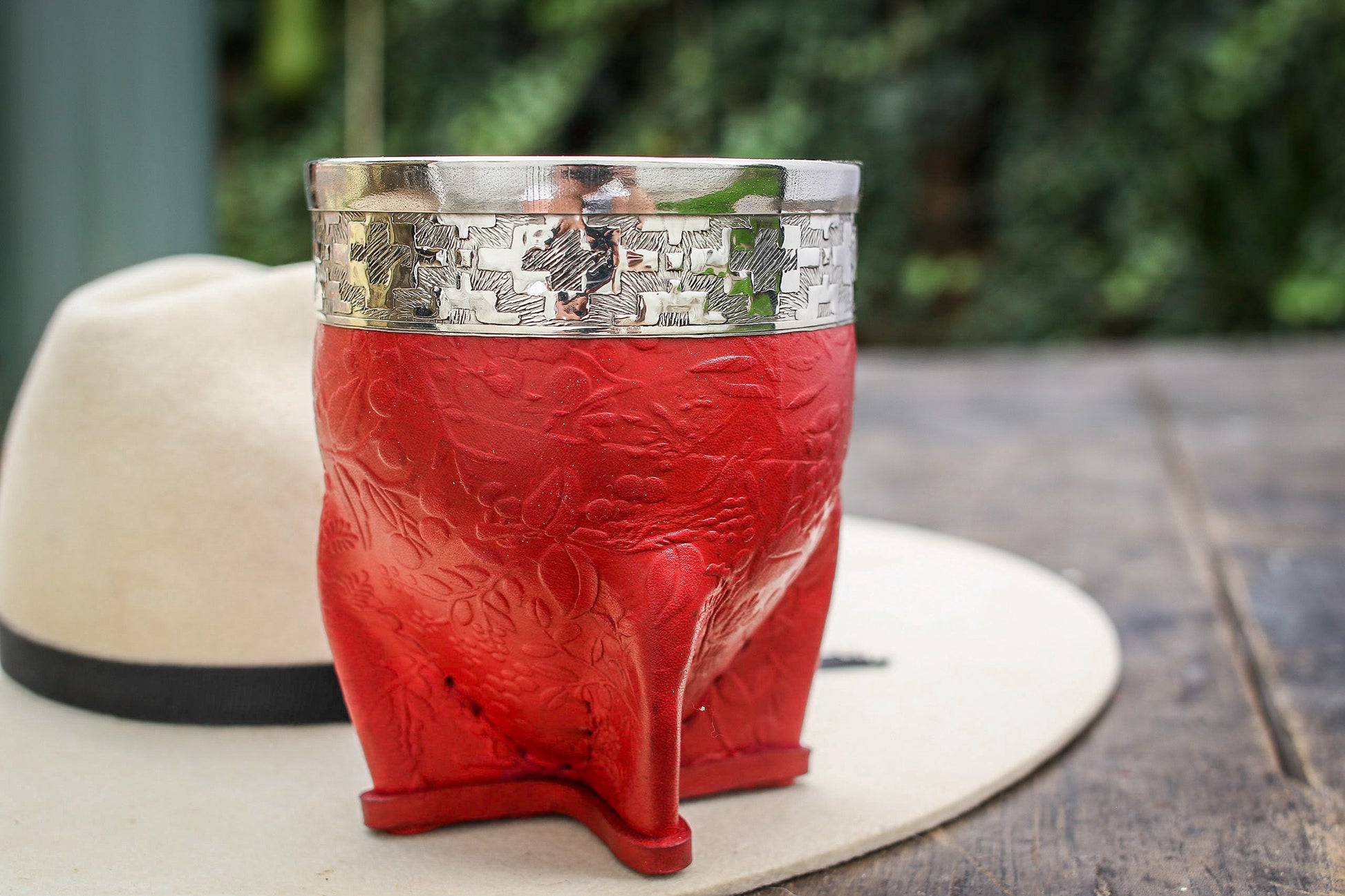 Mate imperial de porongo forrado artesanalmente en cuero natural repujado a mano con diseño de olivos