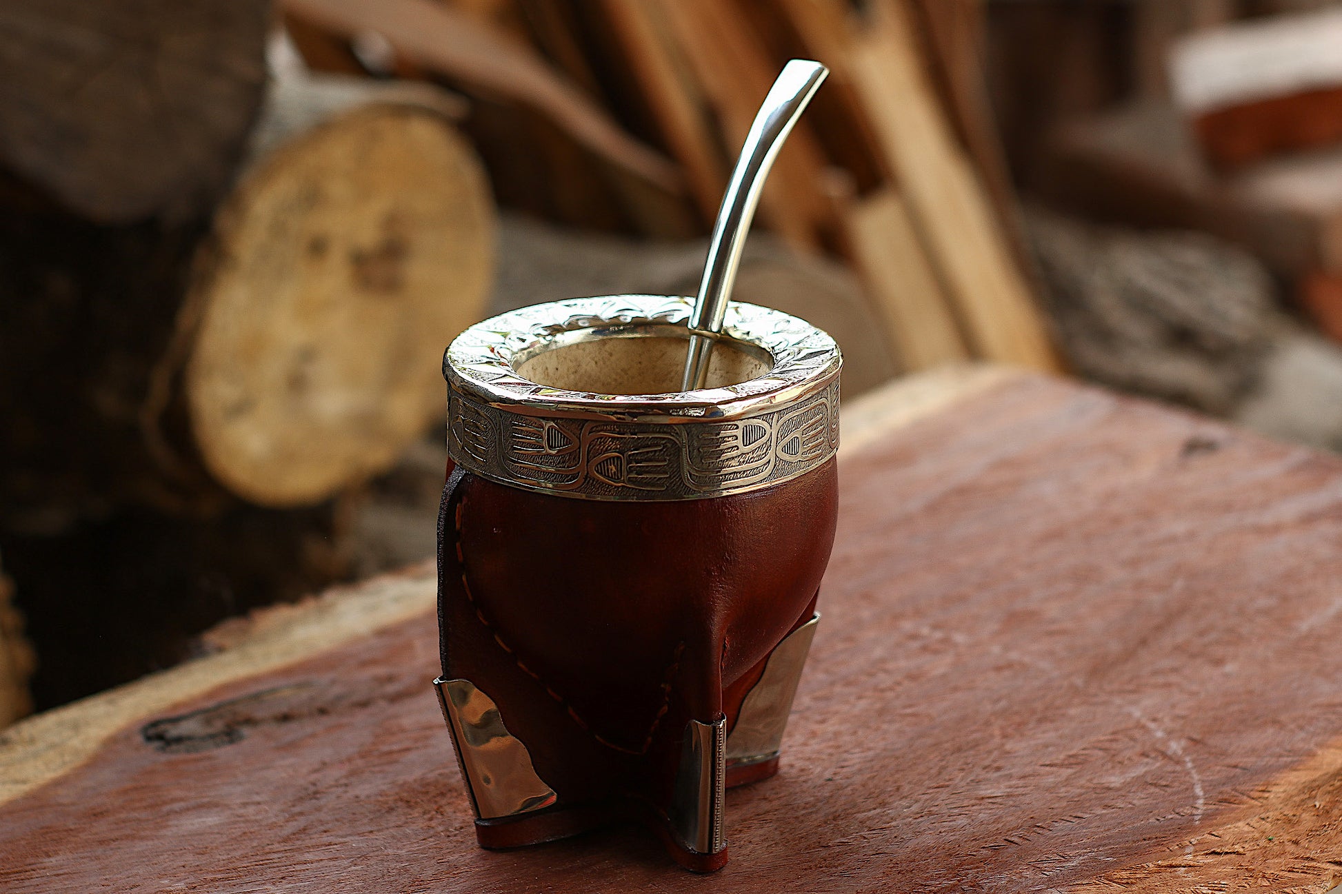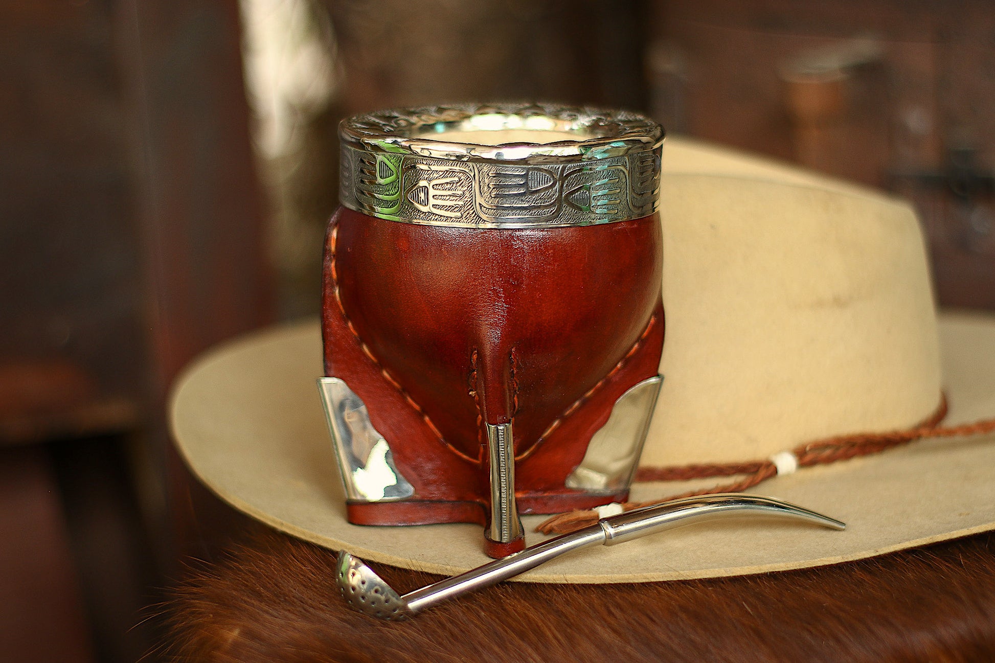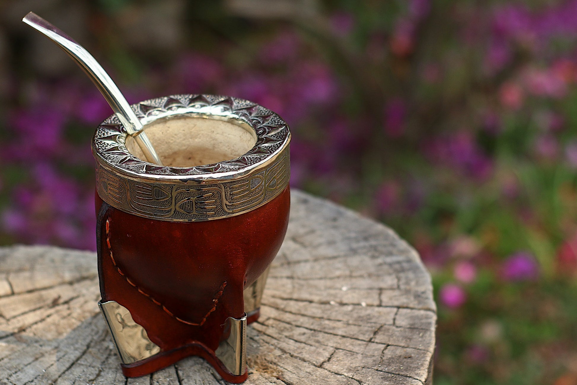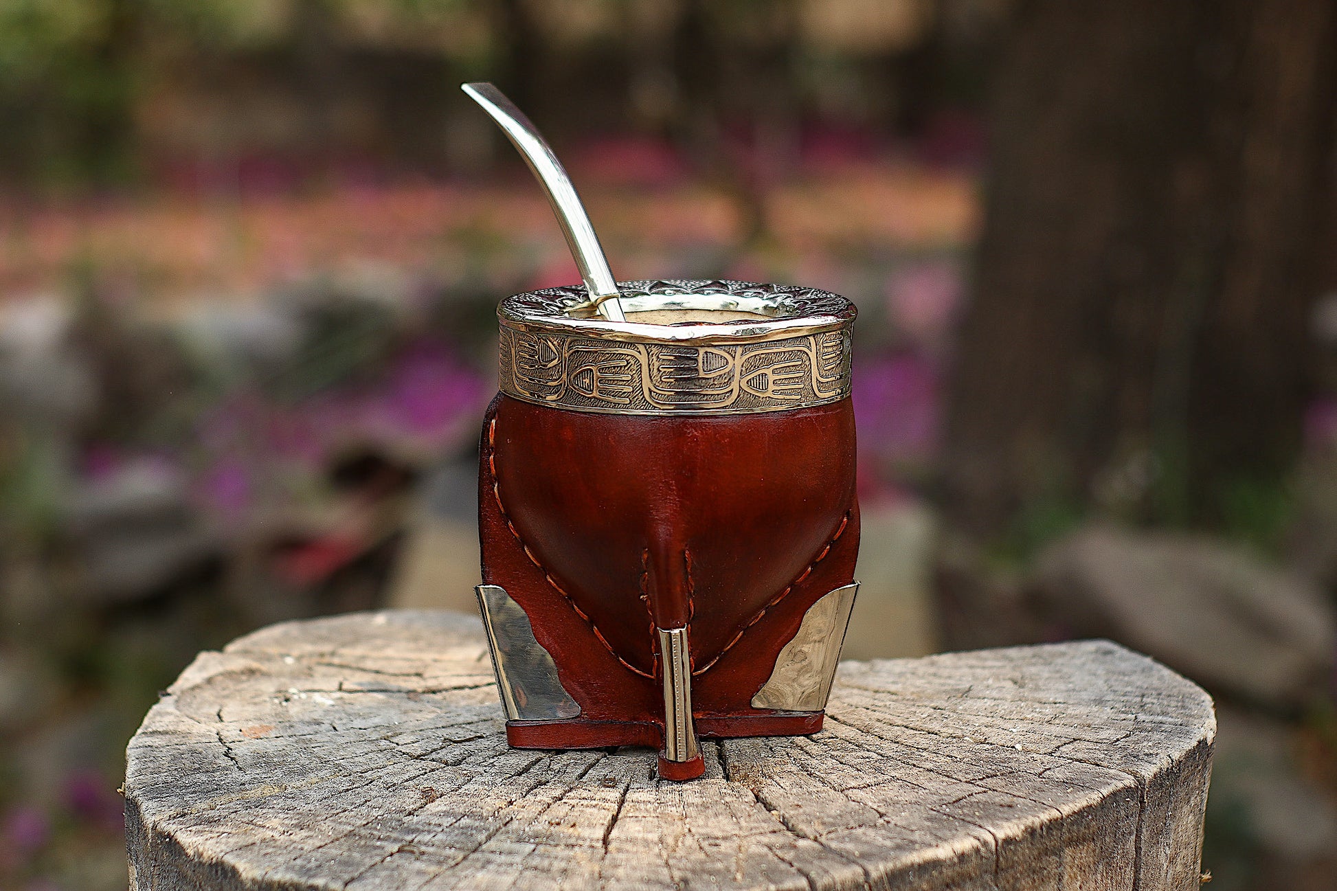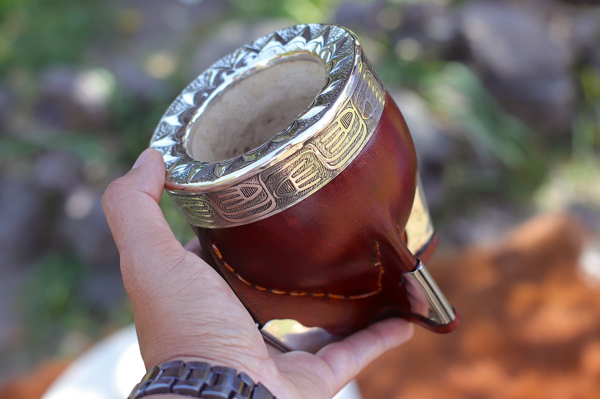 Mate imperial de porongo forrado artesanalmente en cuero natural.