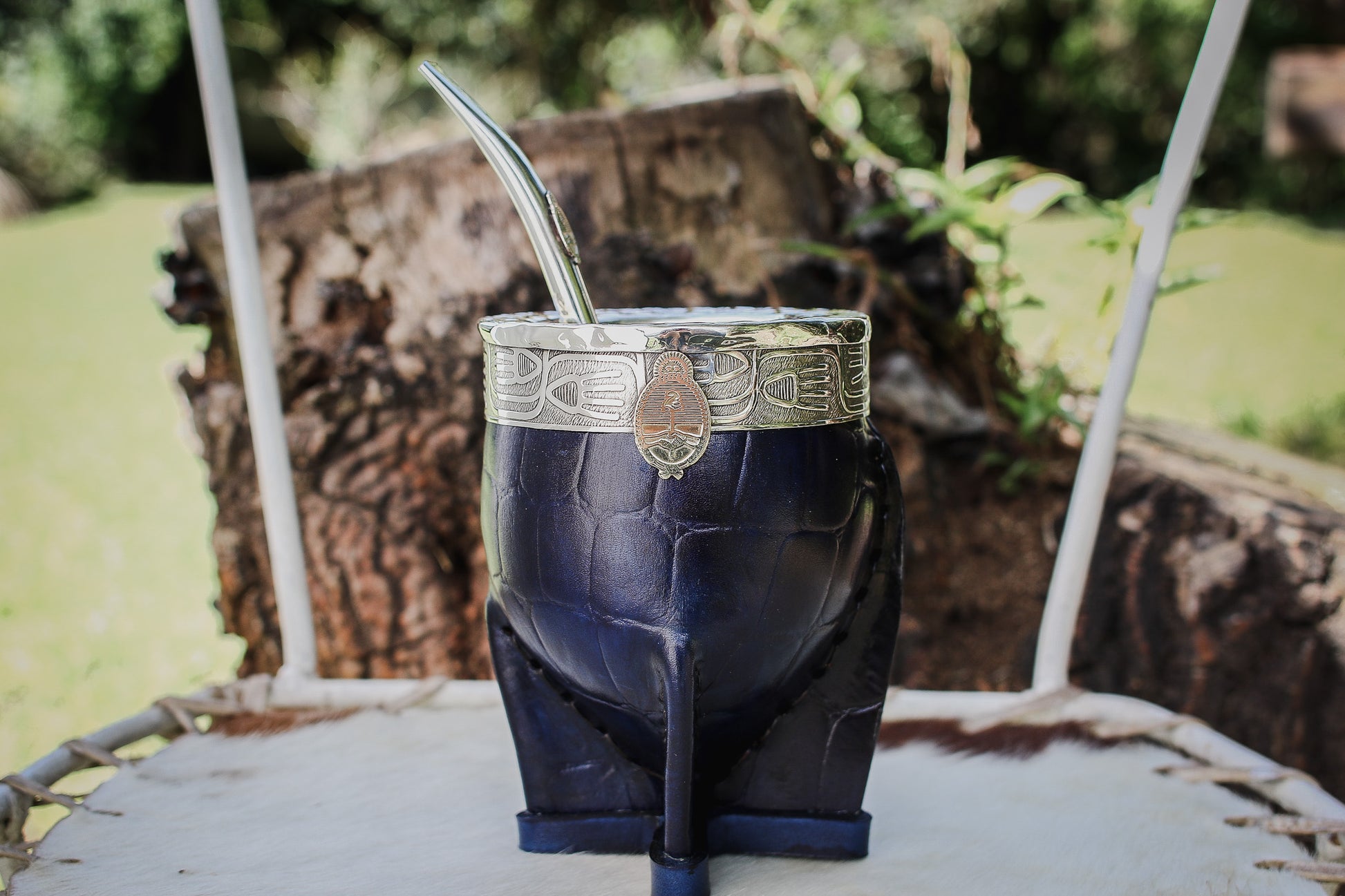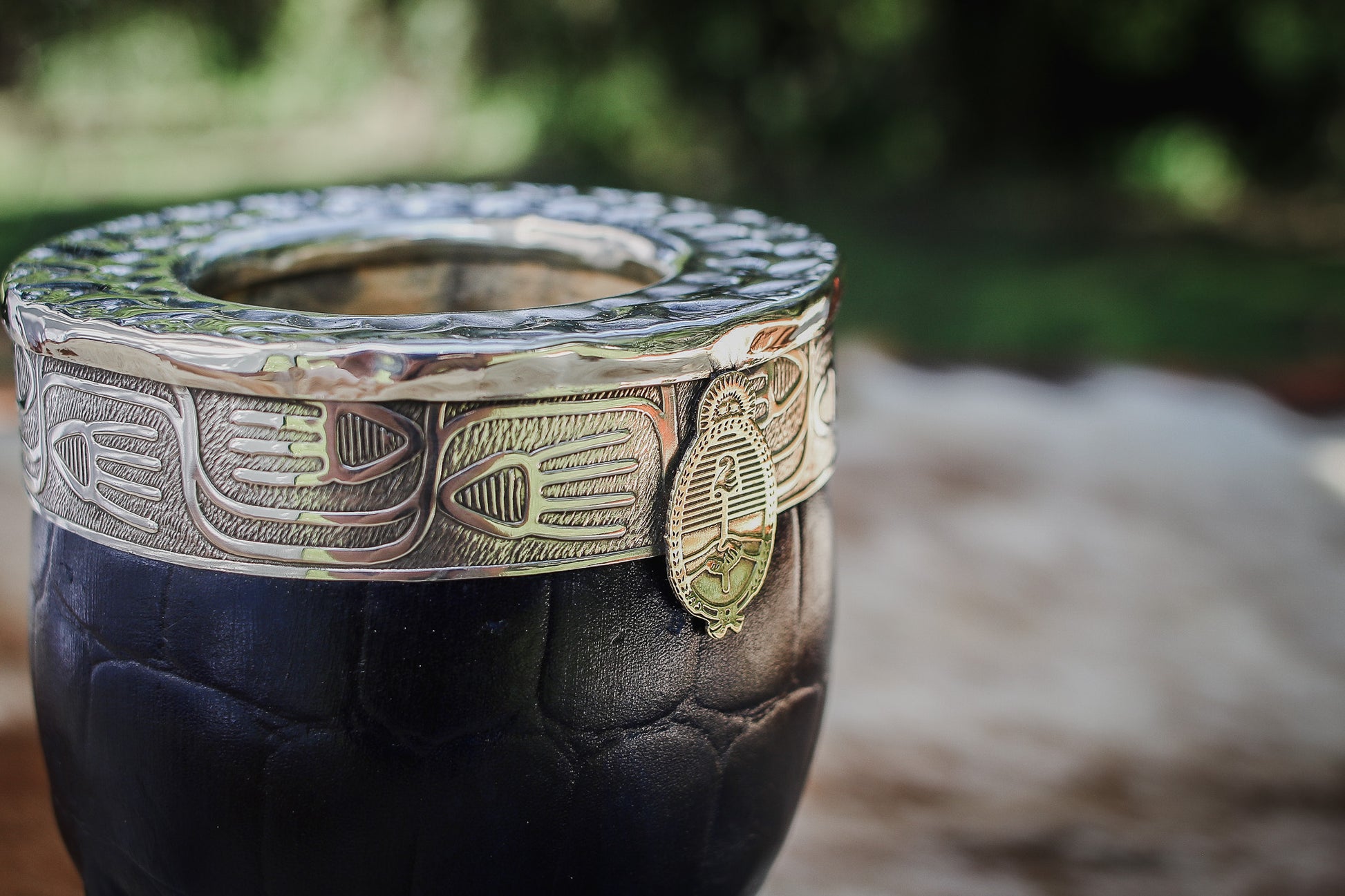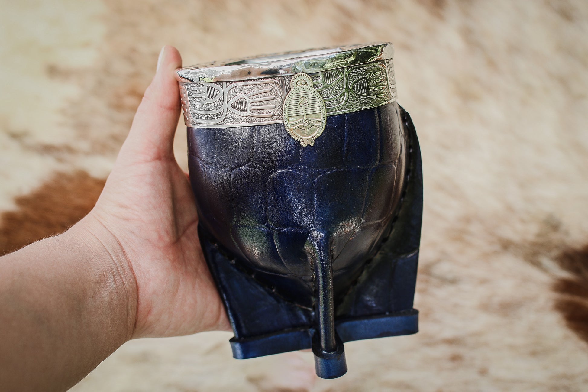 Mate imperial de porongo forrado artesanalmente en cuero natural y relieve hecho a mano.