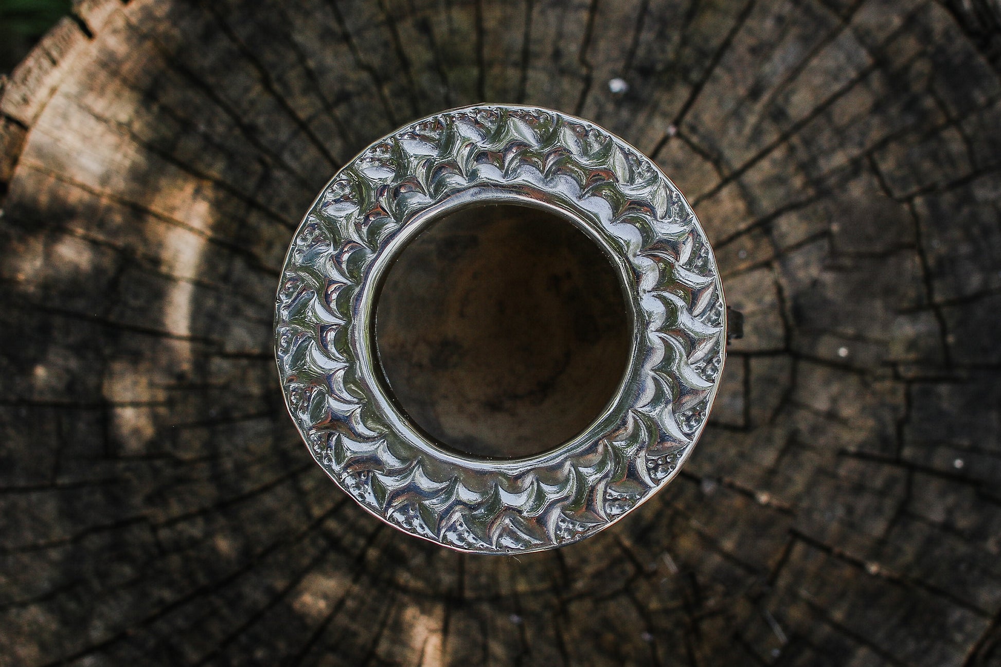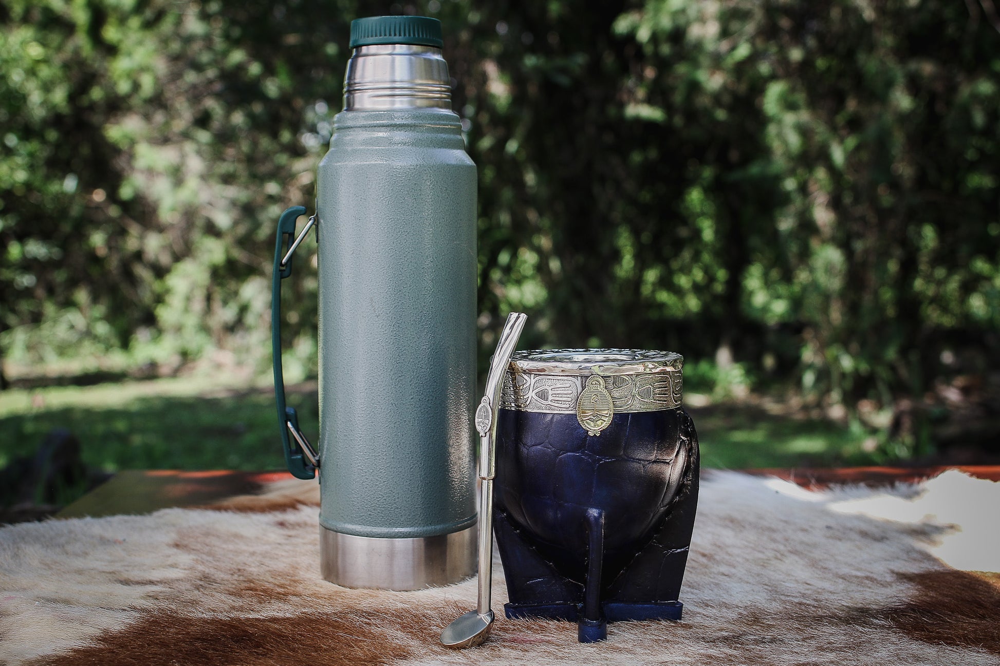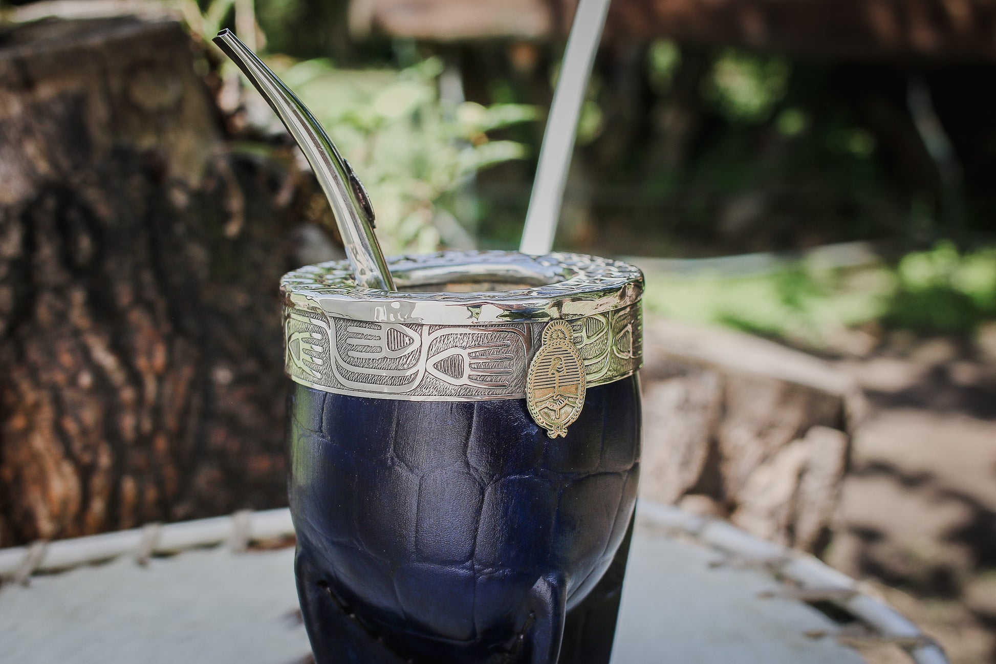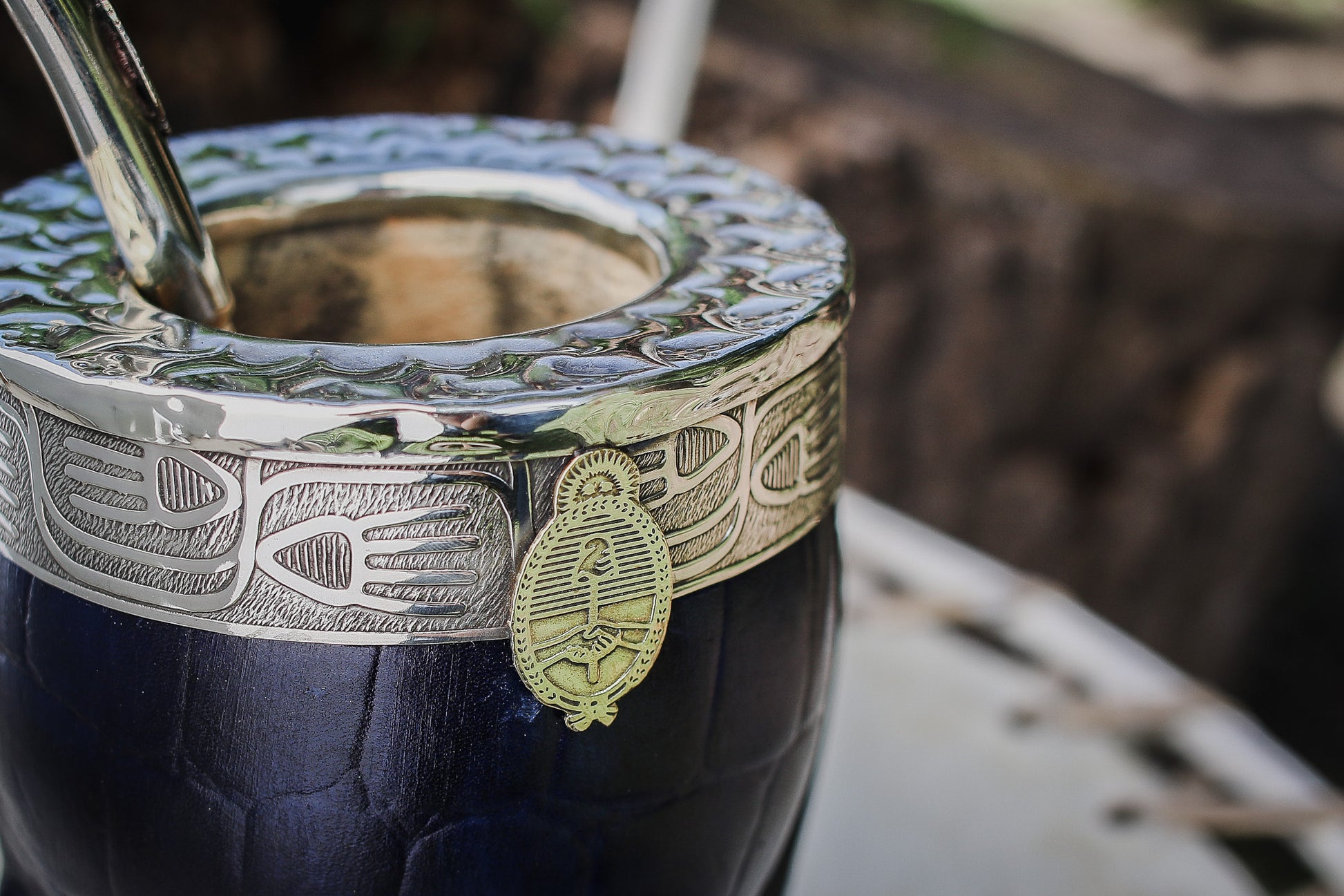 Mate imperial de porongo forrado artesanalmente en cuero natural y relieve hecho a mano.