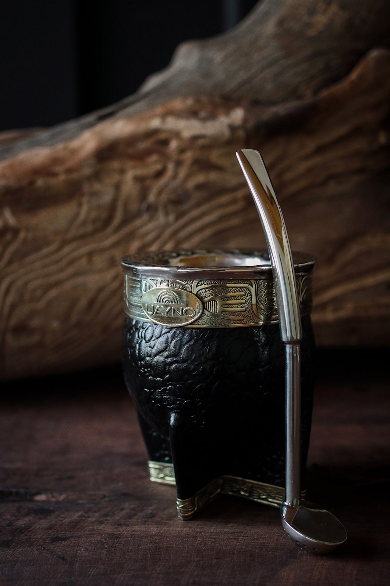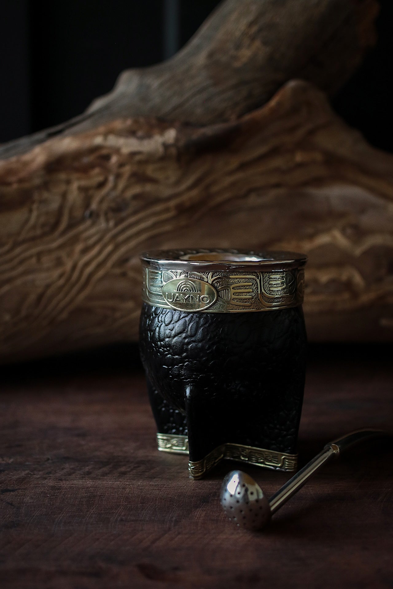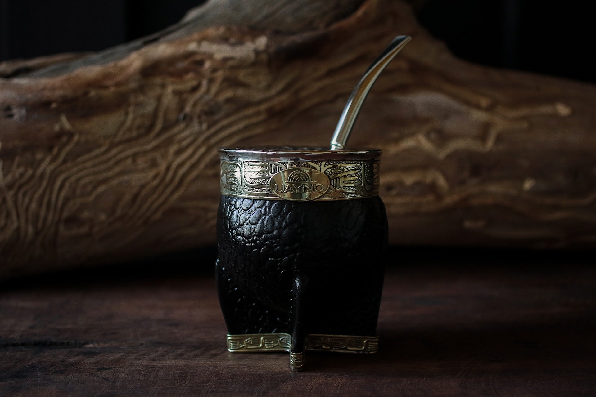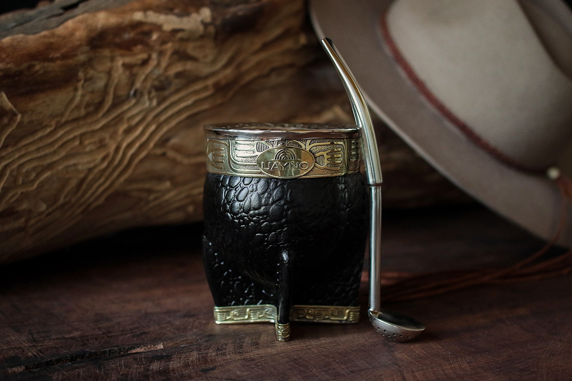 Mate imperial de porongo forrado artesanalmente en cuero natural, repujado artesanalmente