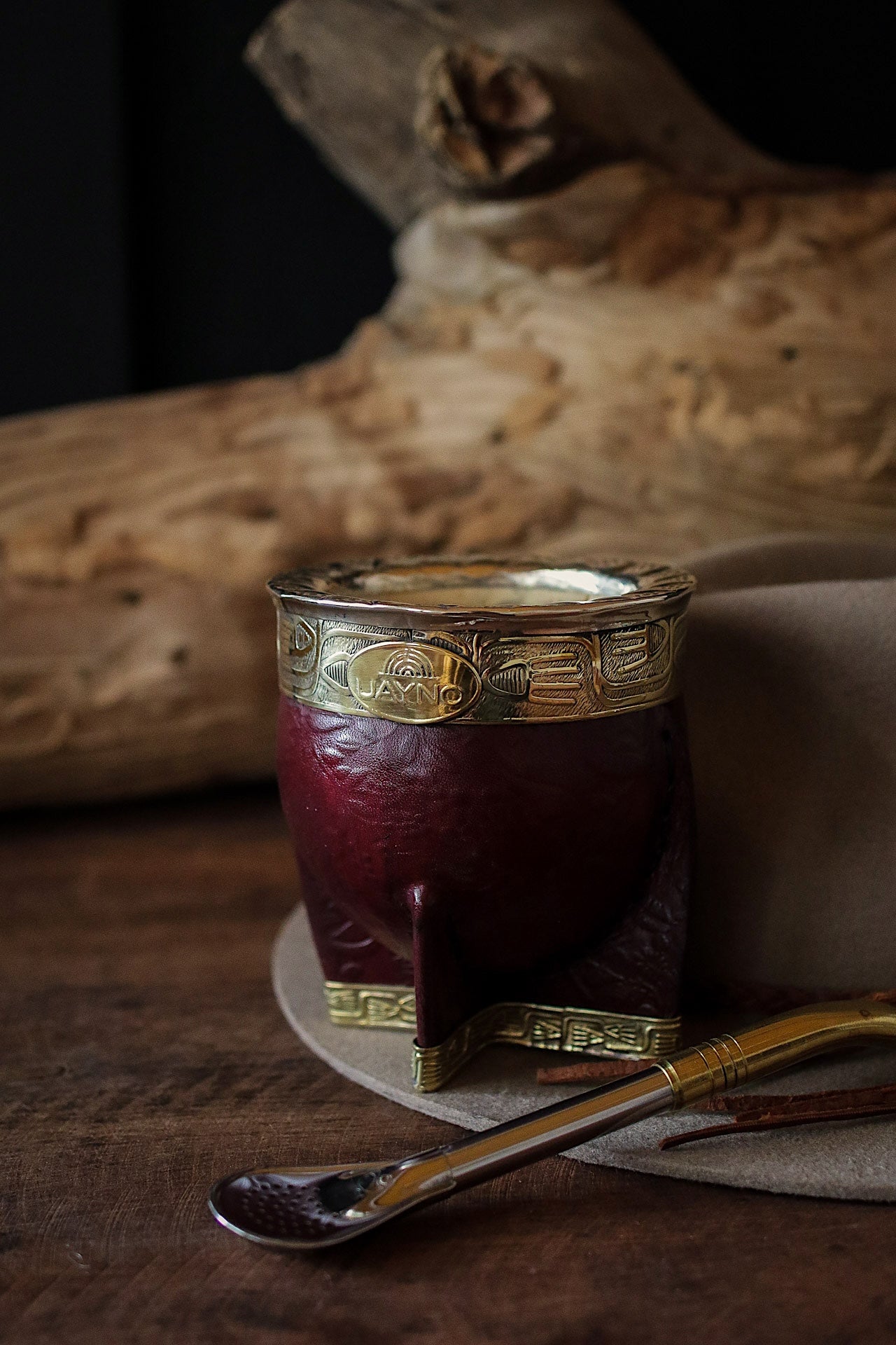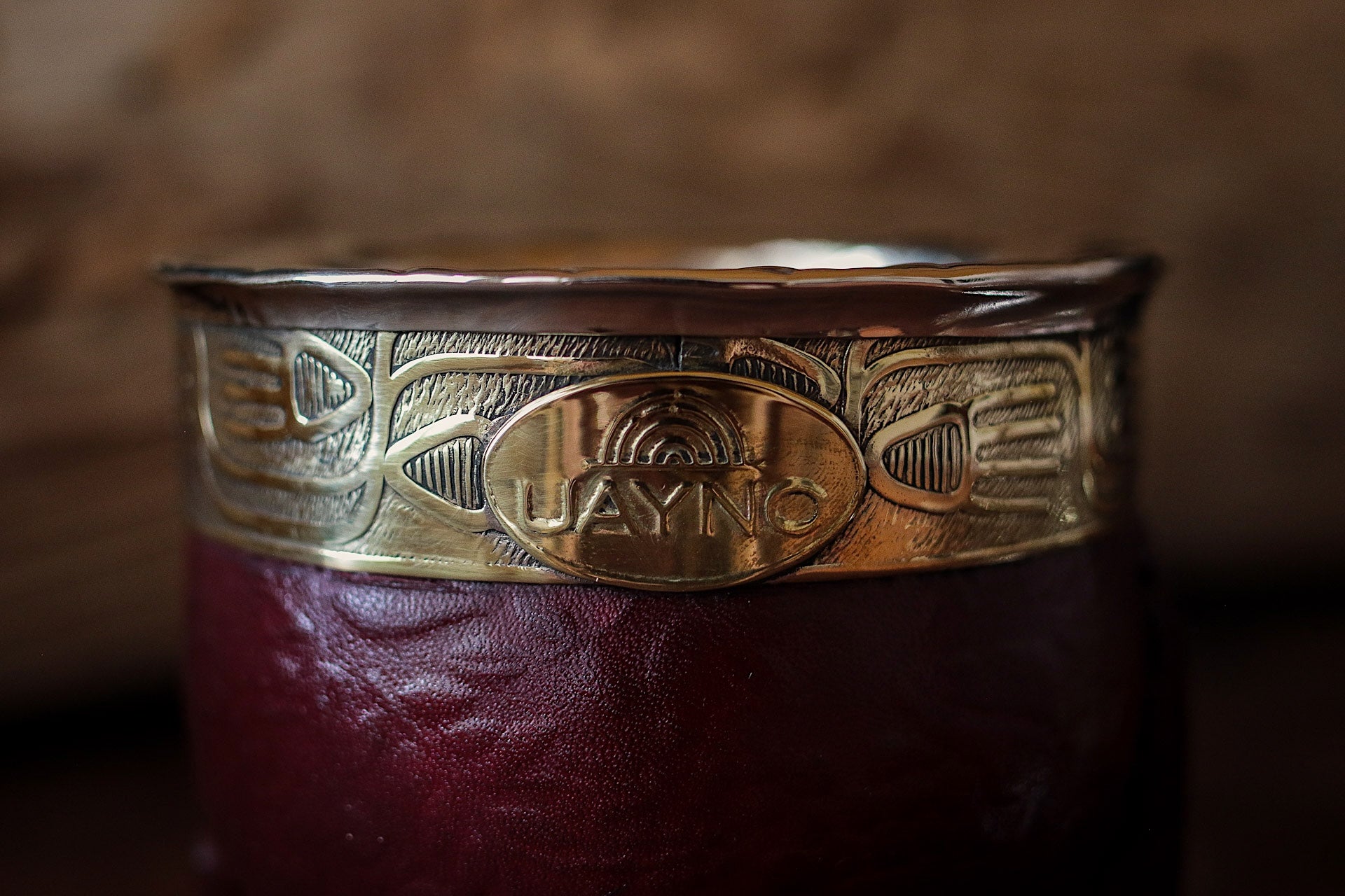 Mate imperial de porongo forrado artesanalmente en cuero natural repujado artesanalmente