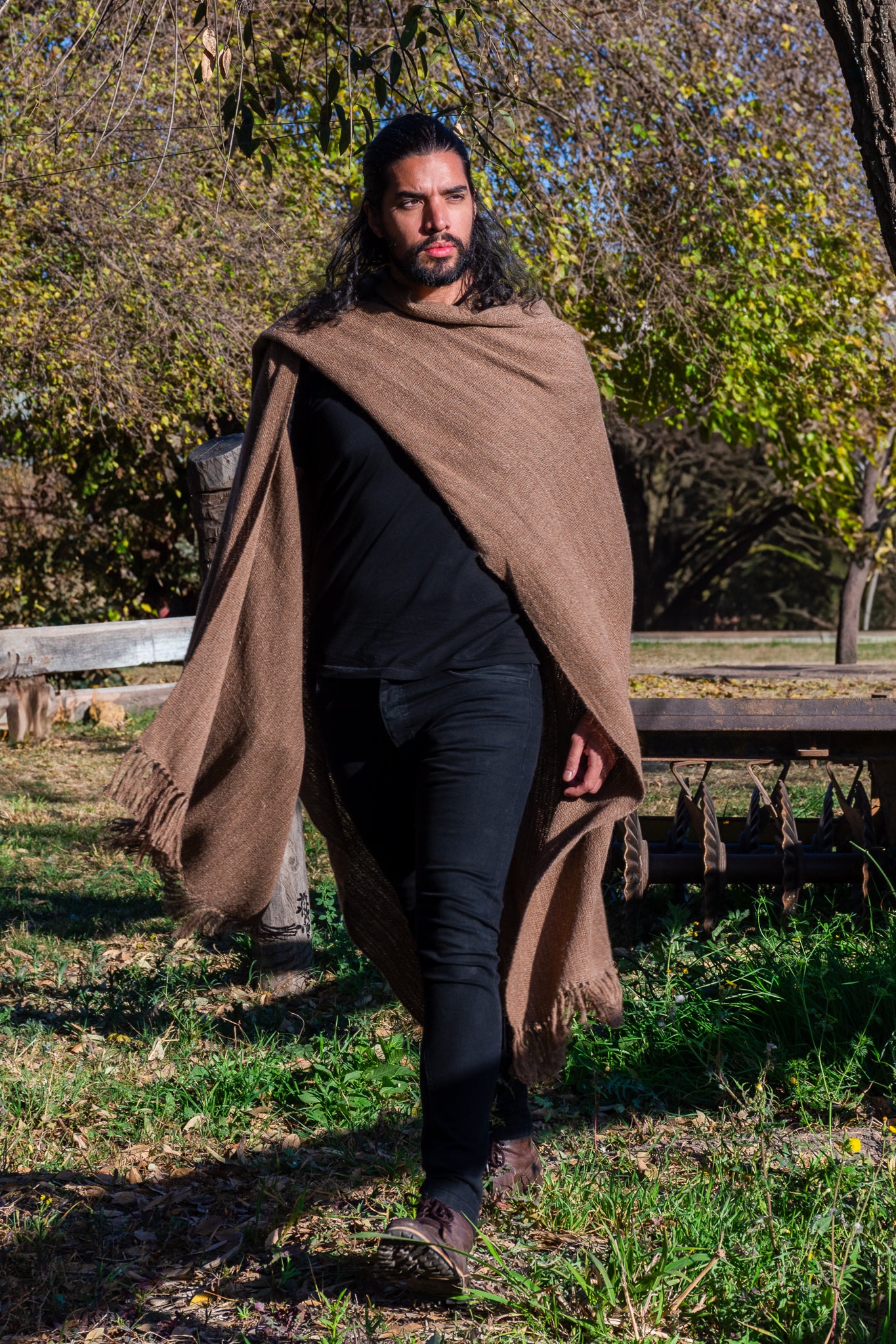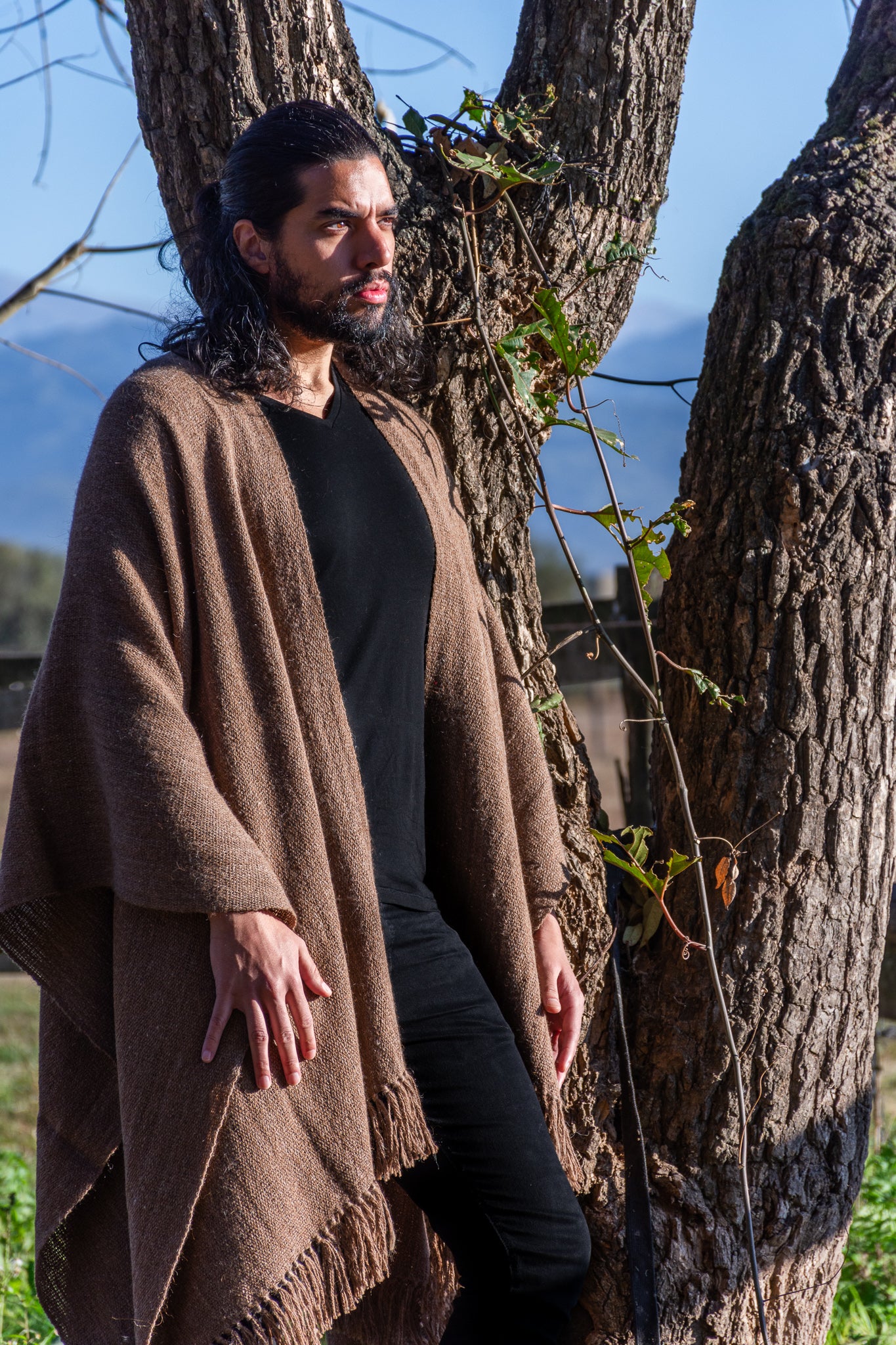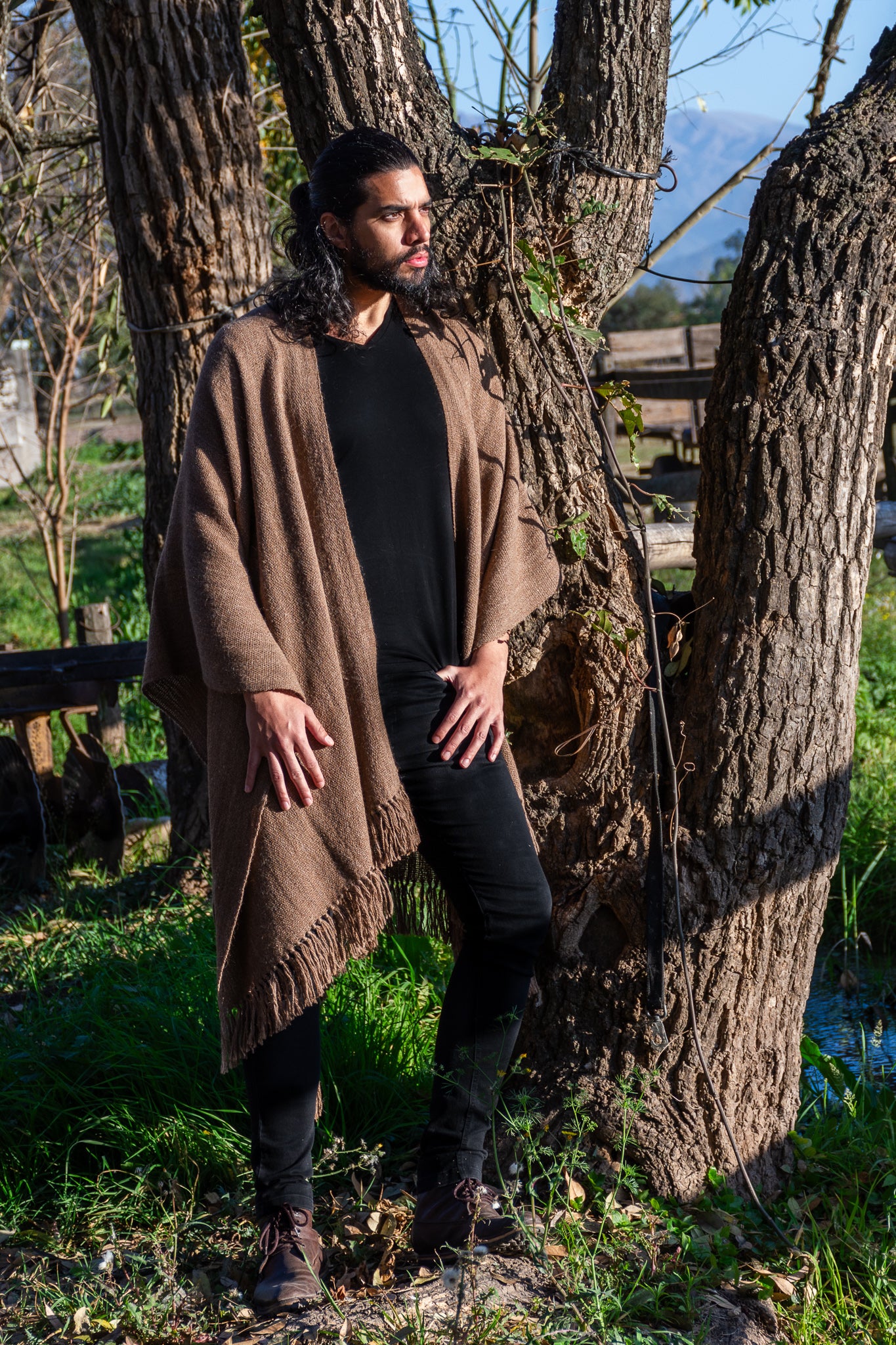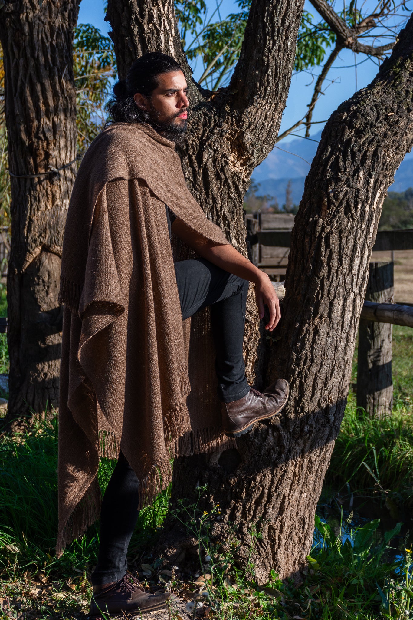 Santa Cruz es parte de la Colección "Runa" es un poncho abierto o ruana hombre de hilos de llama color natural camel.