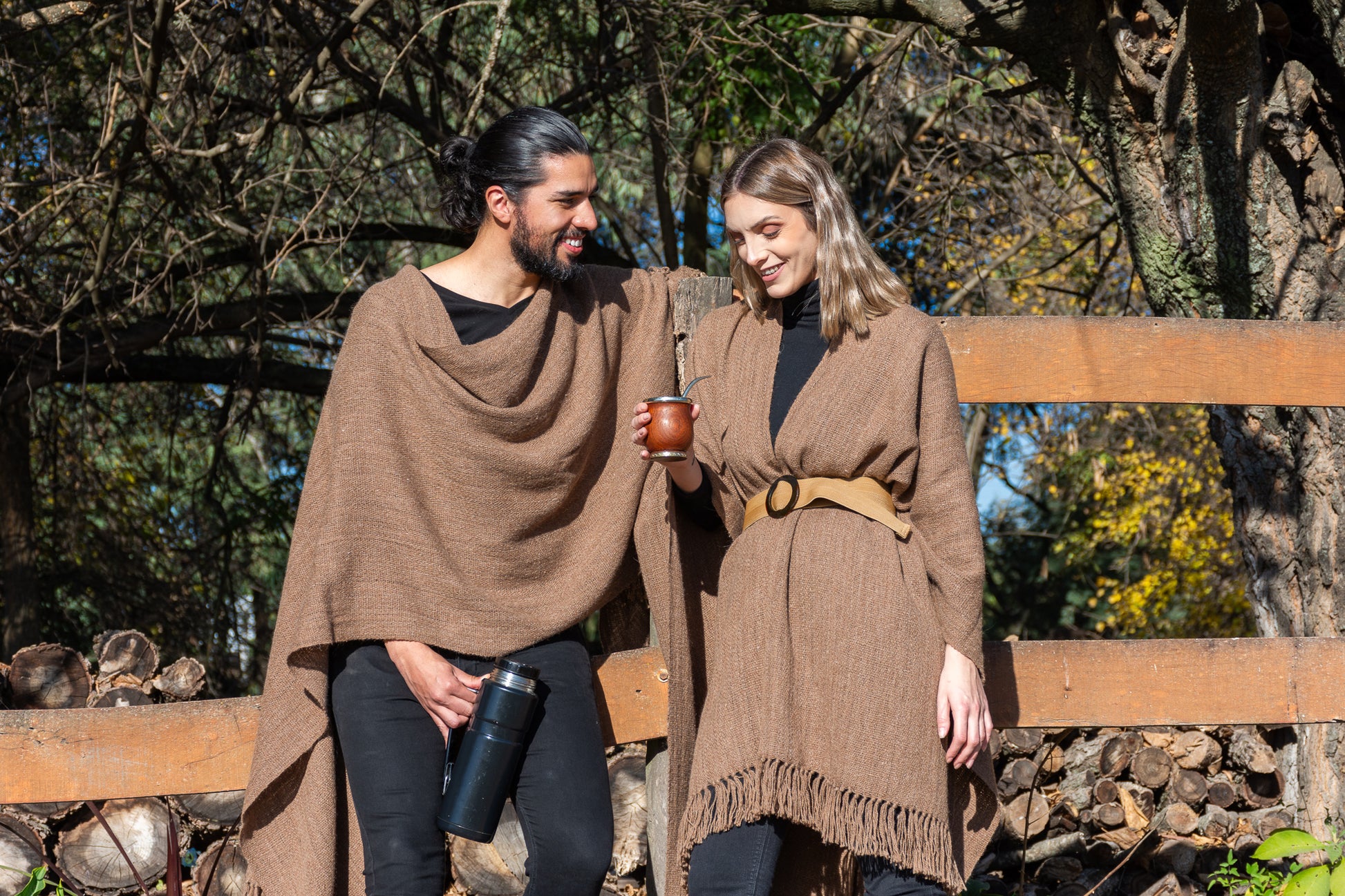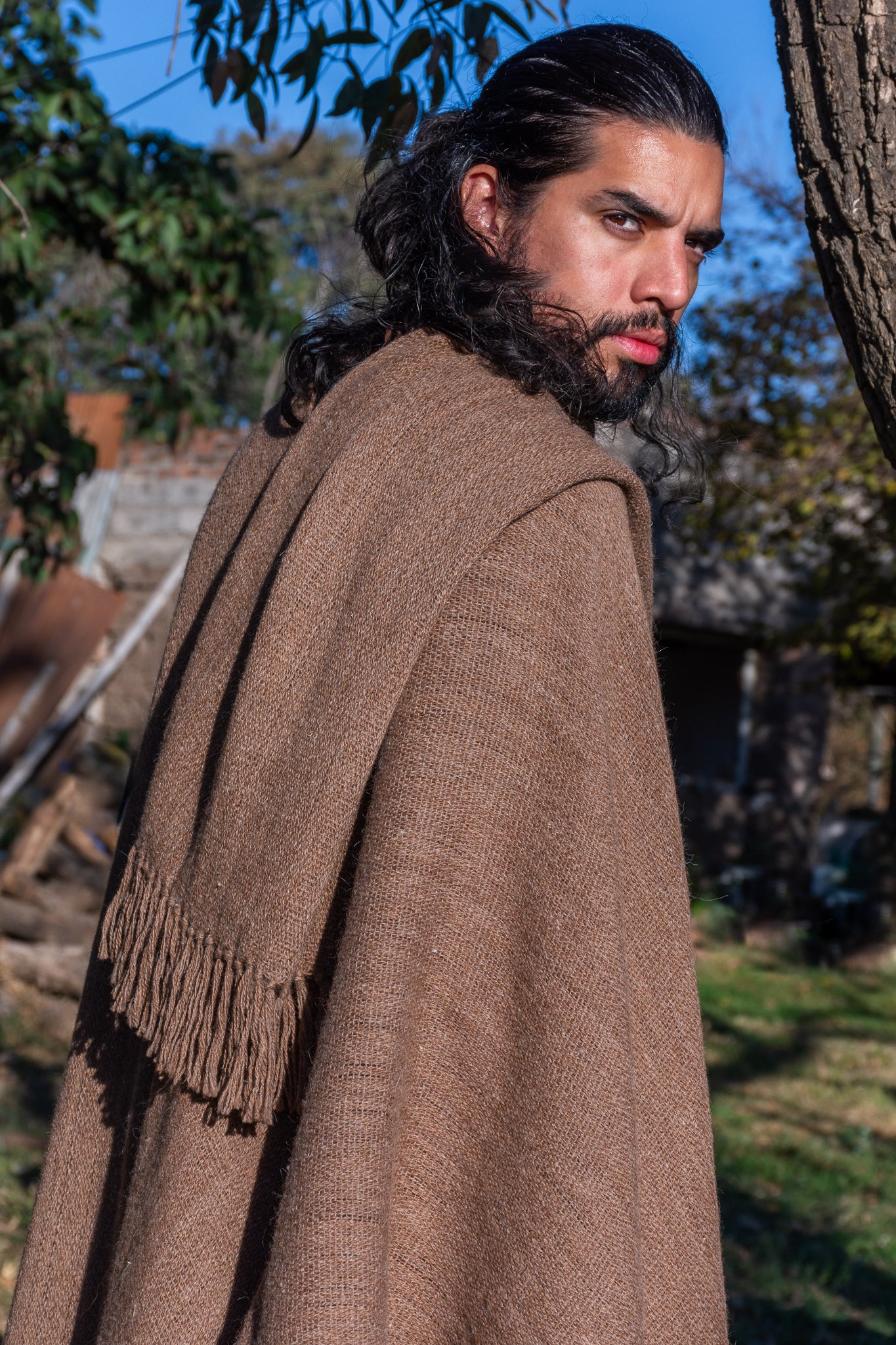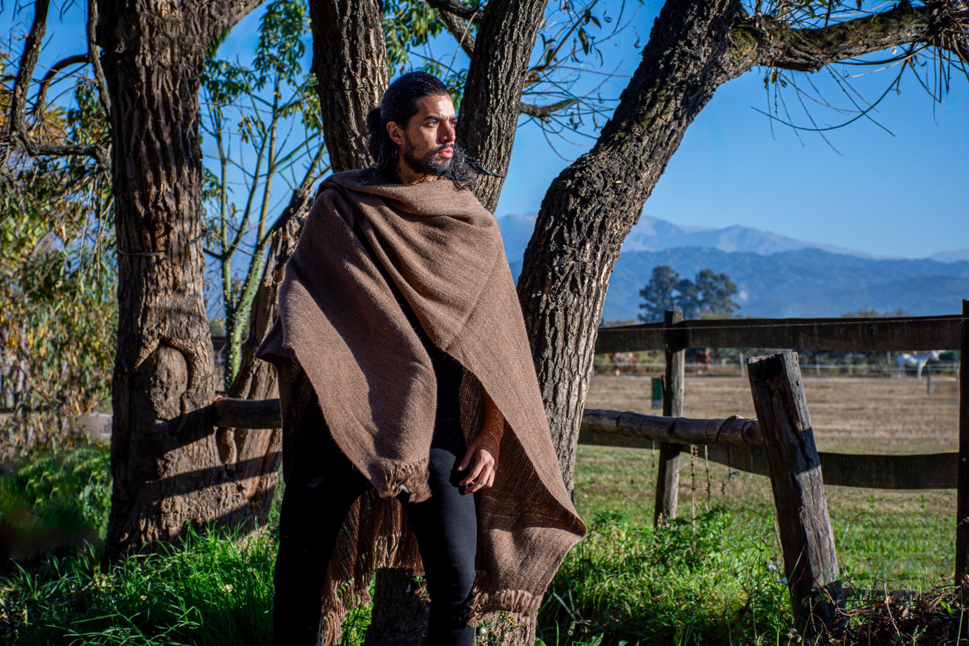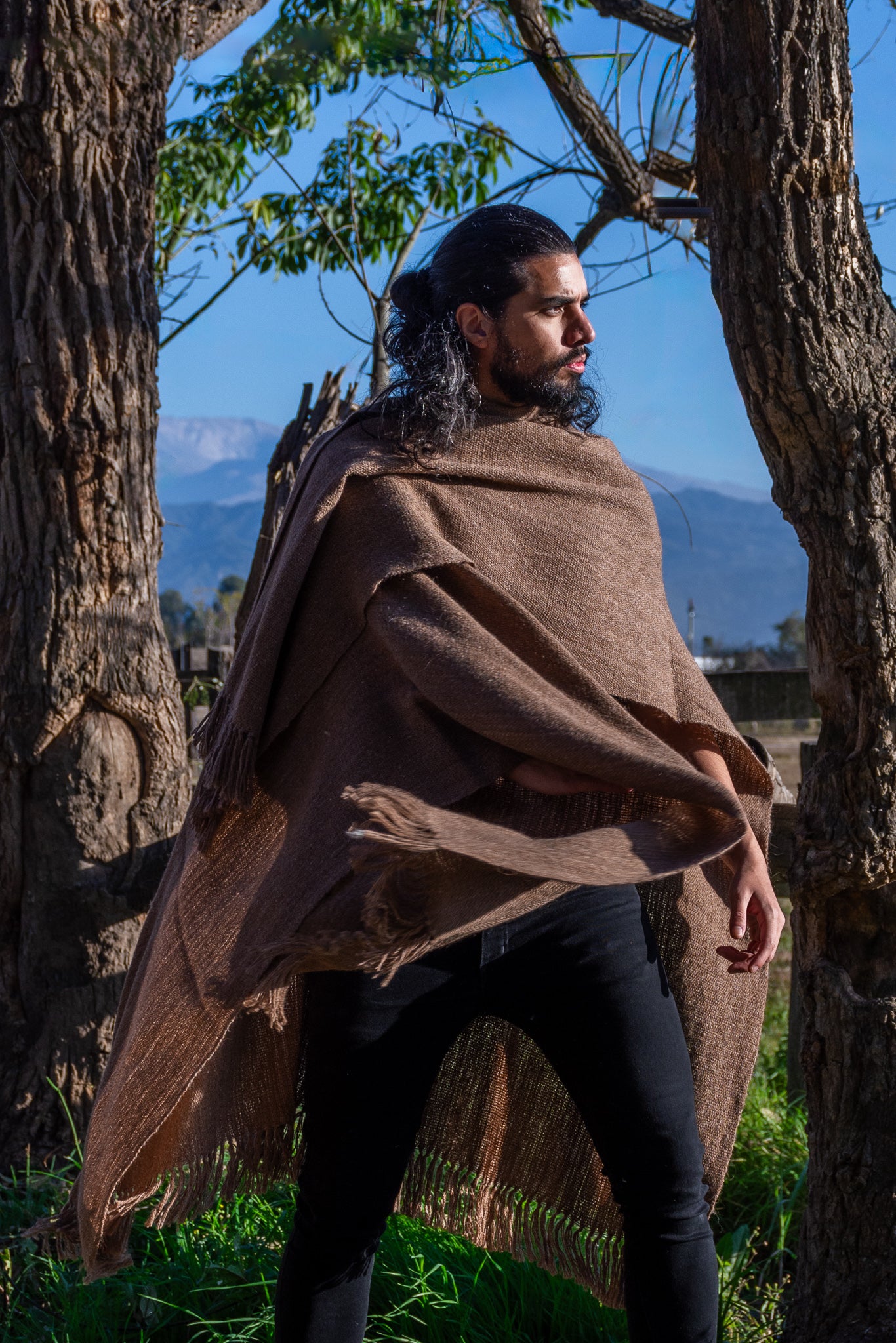 Santa Cruz es parte de la Colección "Runa" es un poncho abierto o ruana hombre de hilos de llama color natural camel.