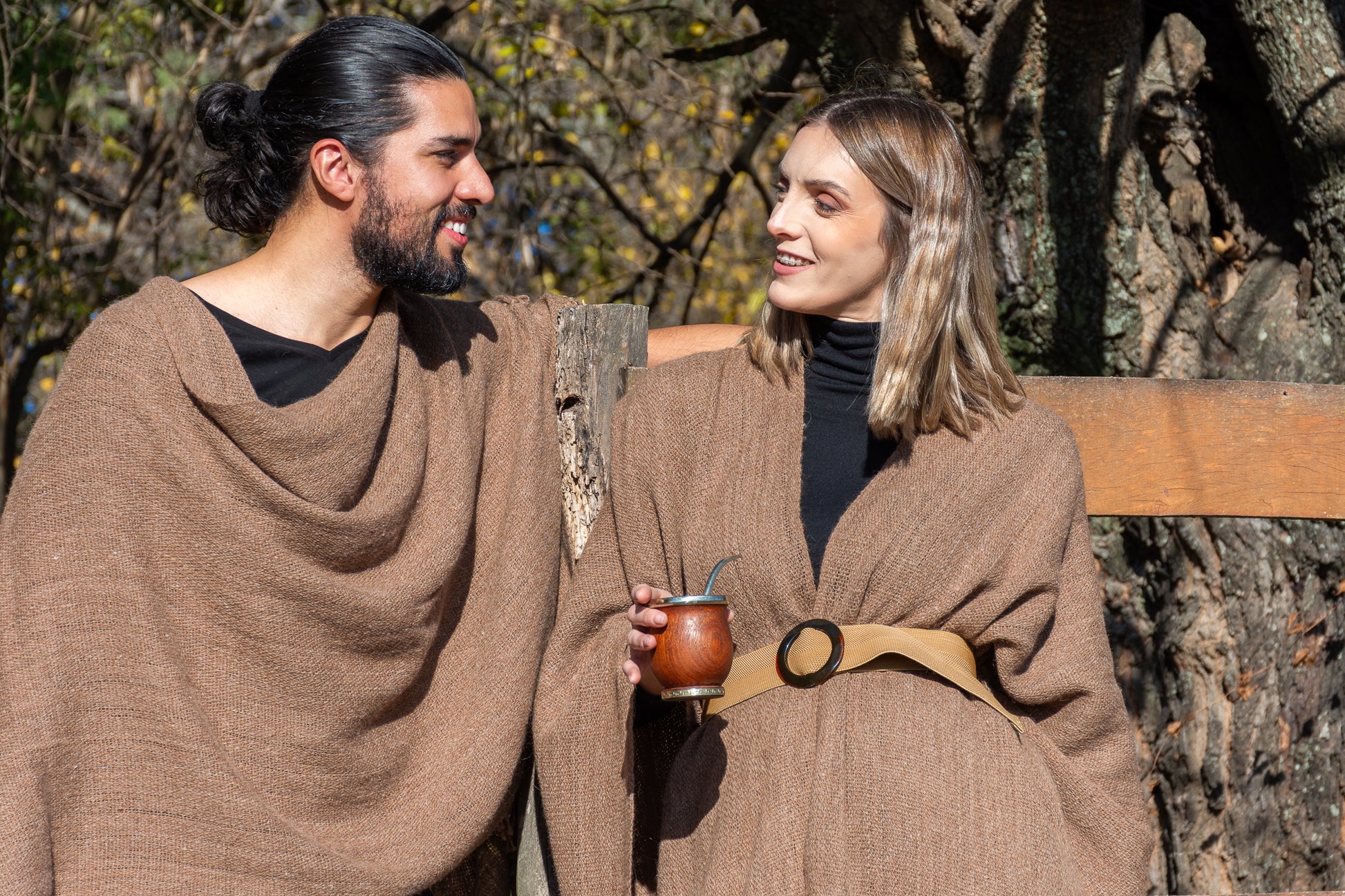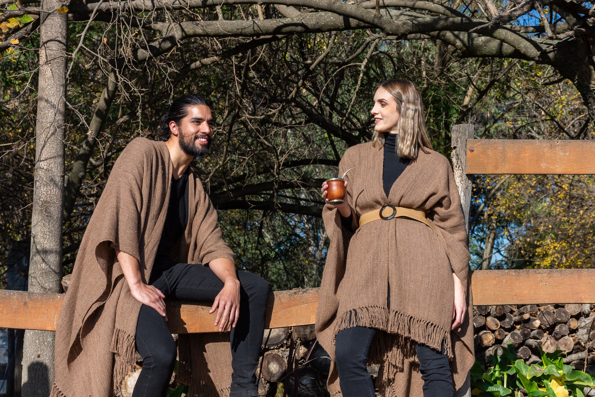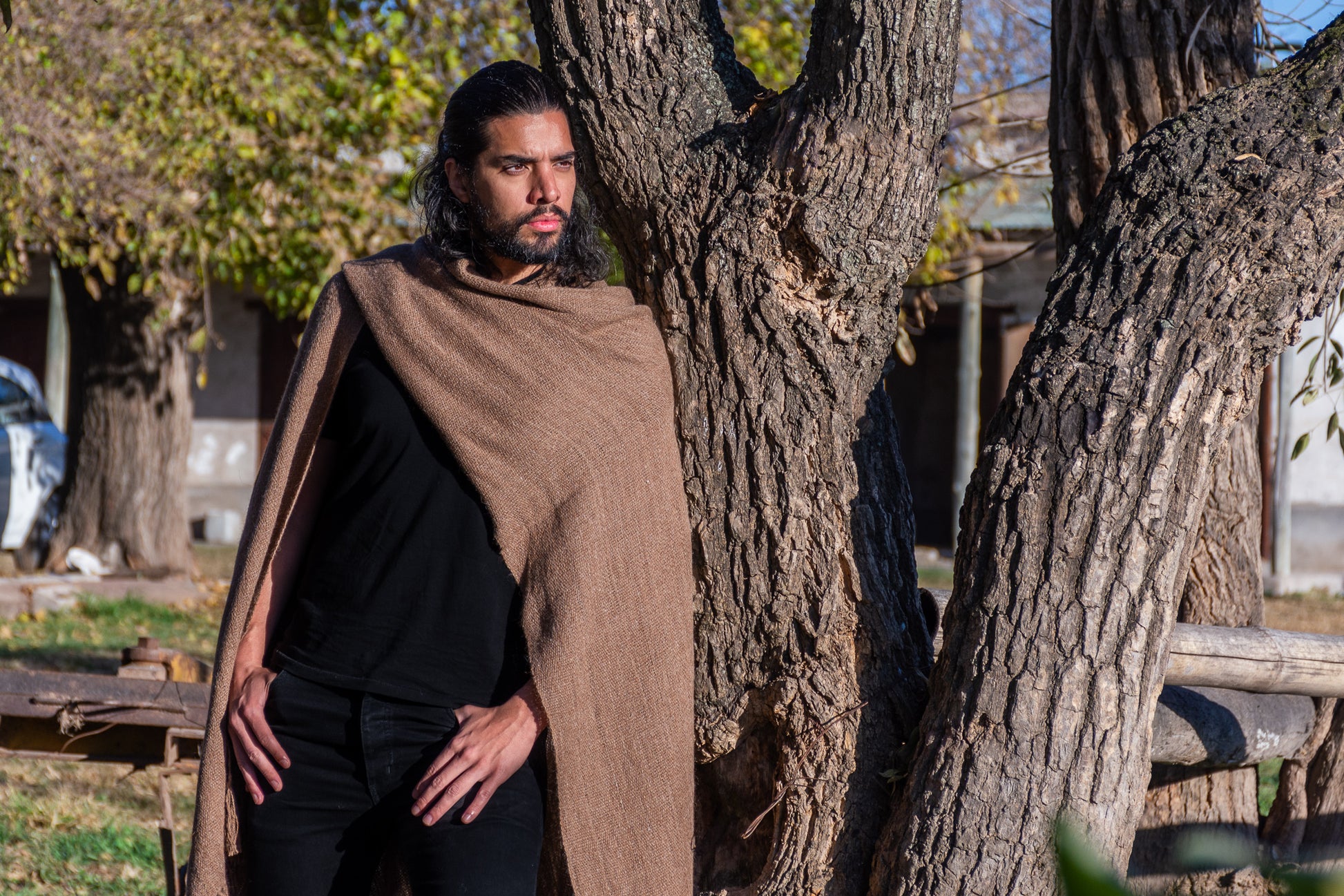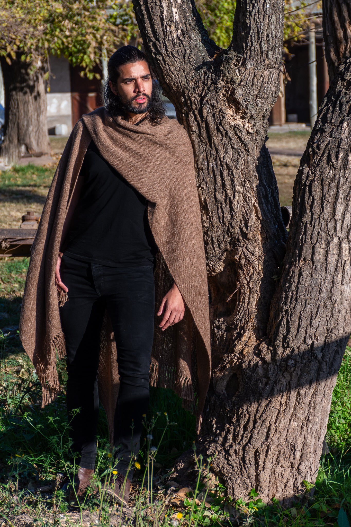 Santa Cruz es parte de la Colección "Runa" es un poncho abierto o ruana hombre de hilos de llama color natural camel.
