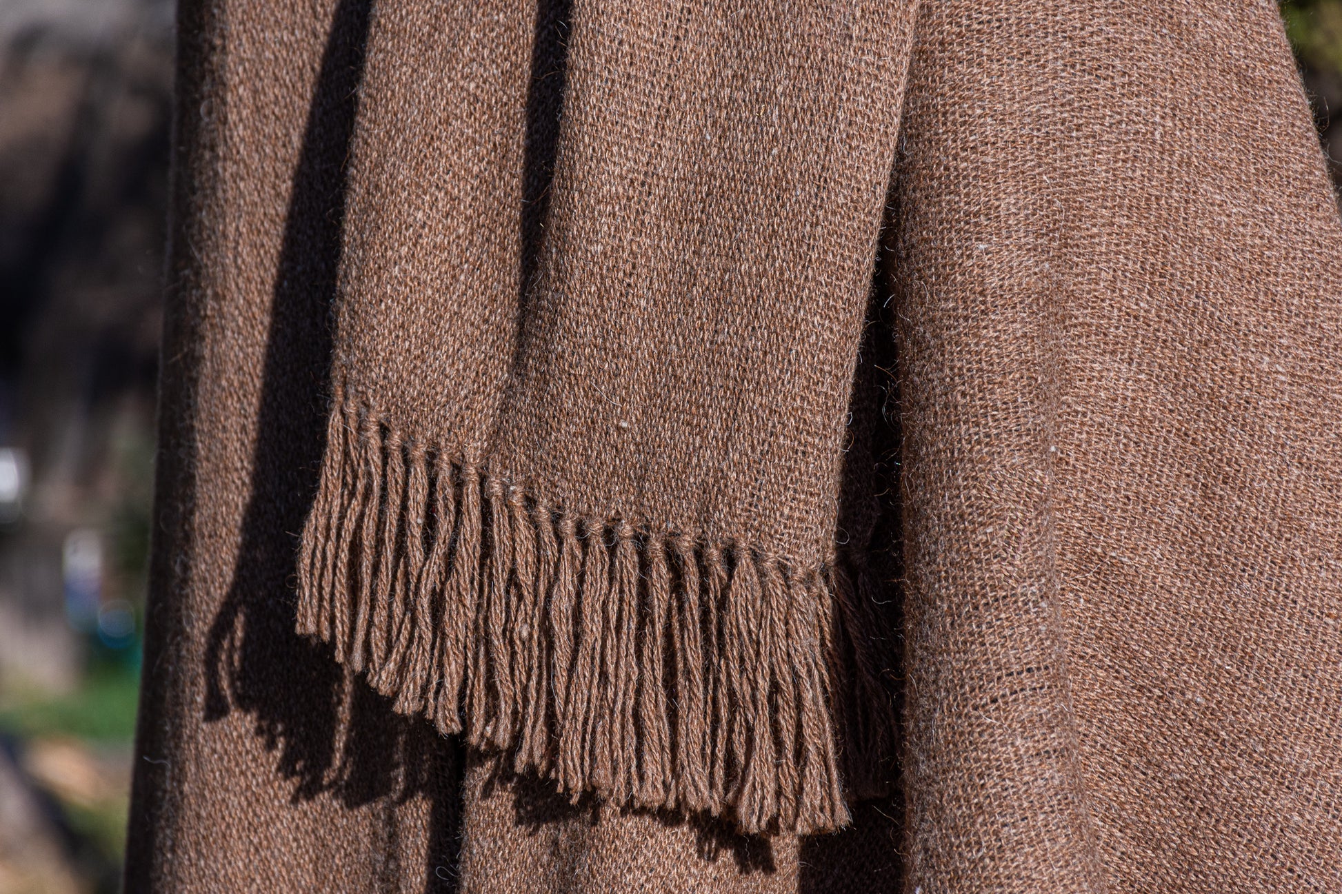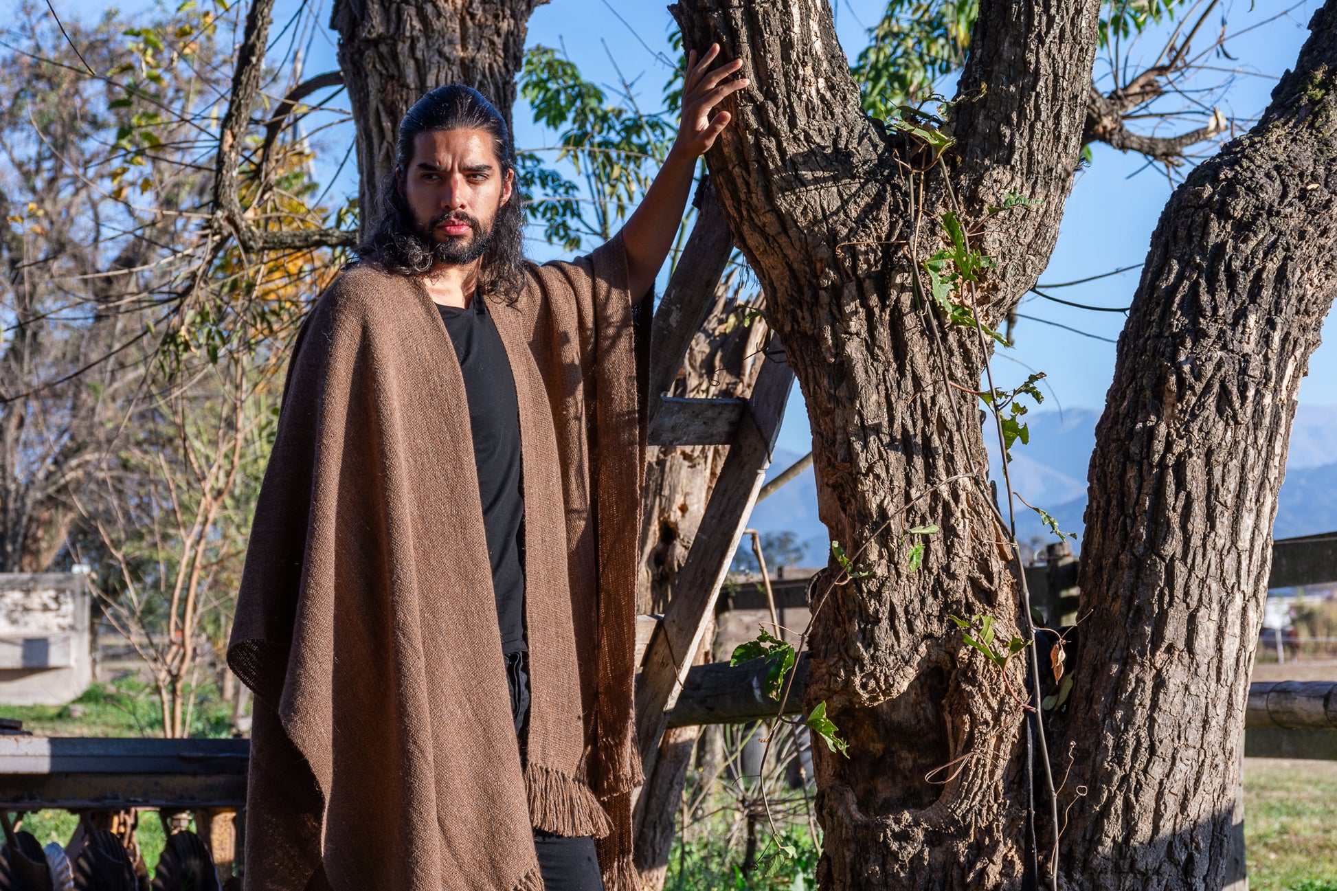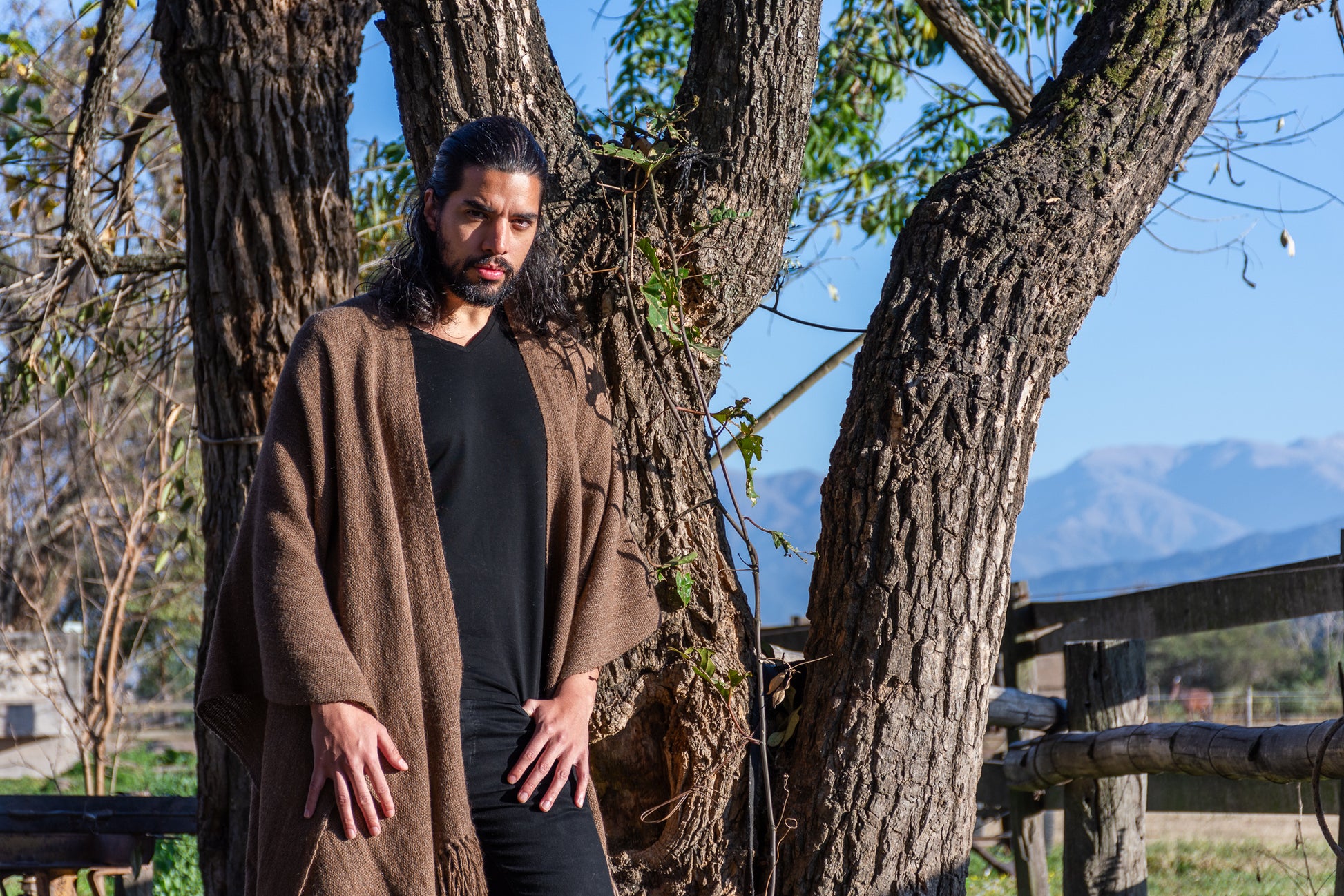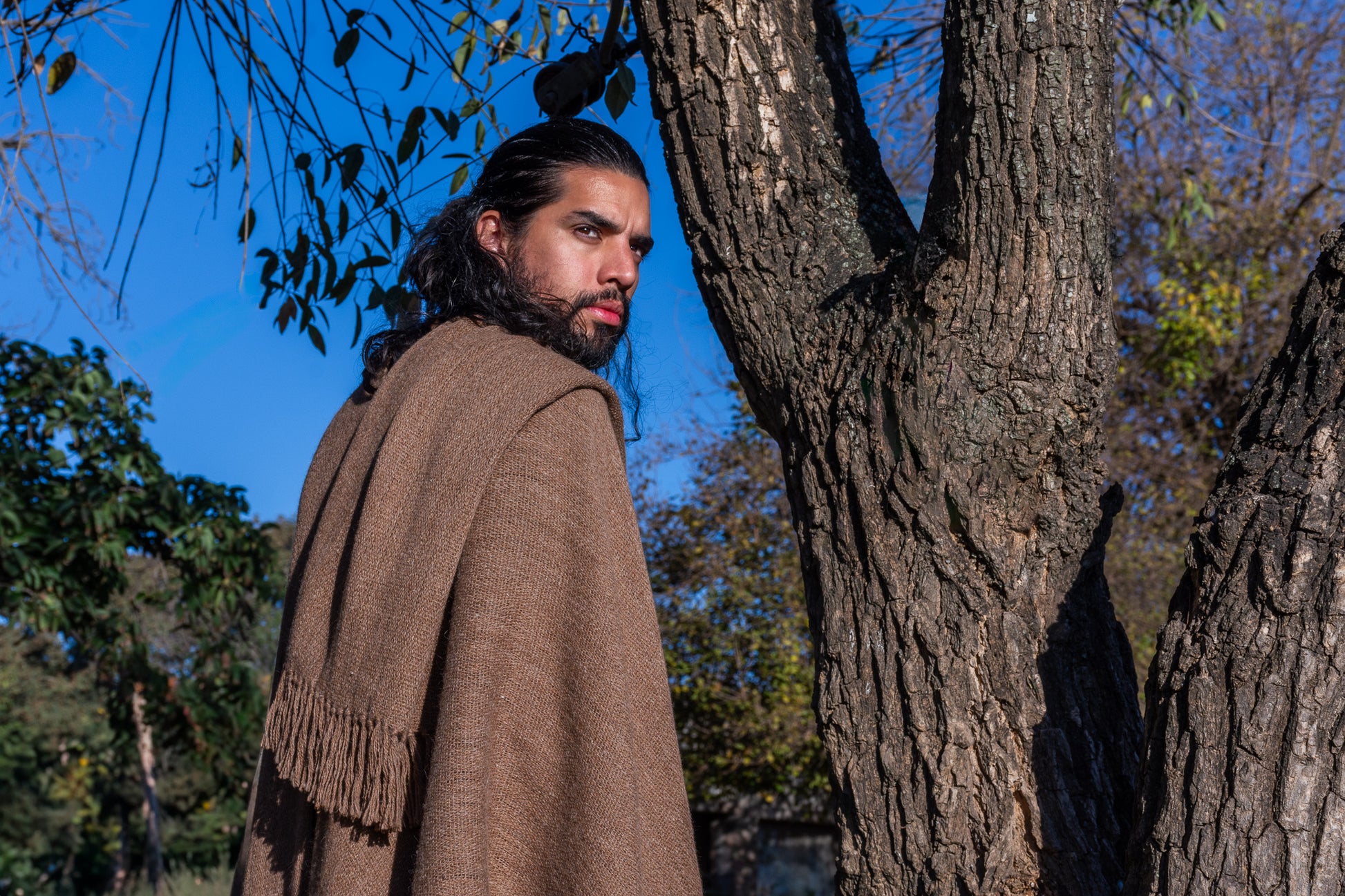 Santa Cruz es parte de la Colección "Runa" es un poncho abierto o ruana hombre de hilos de llama color natural camel.