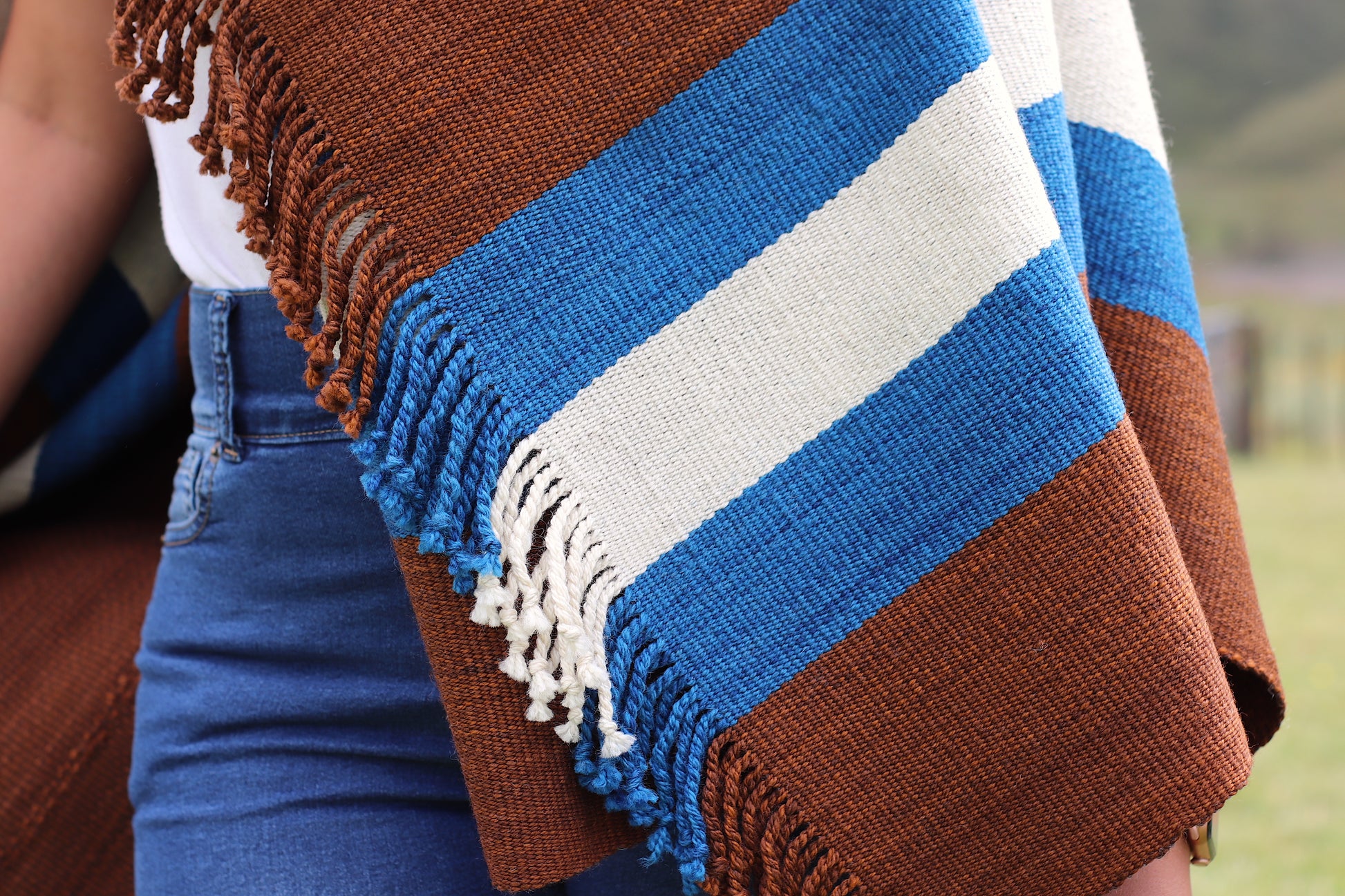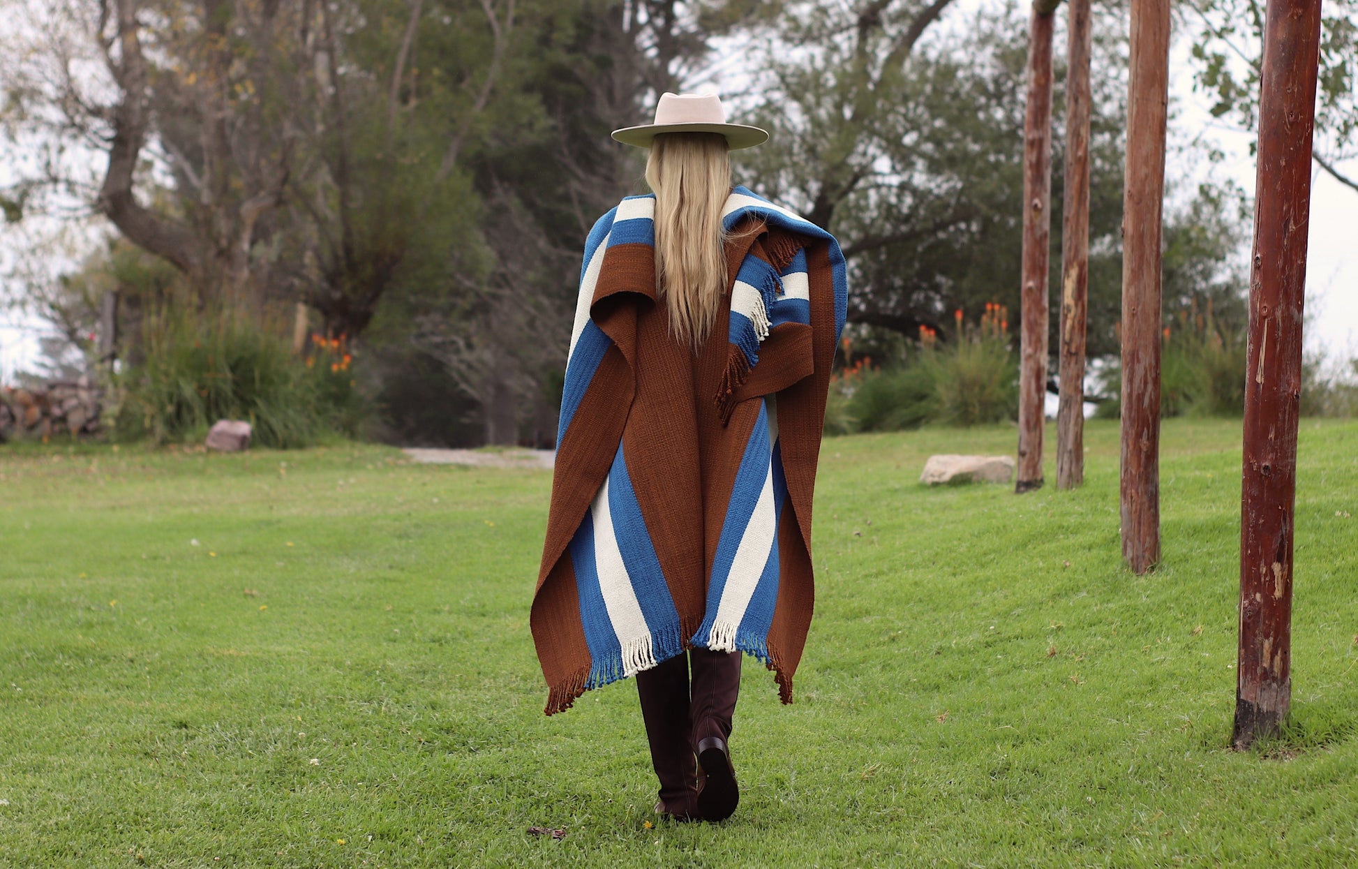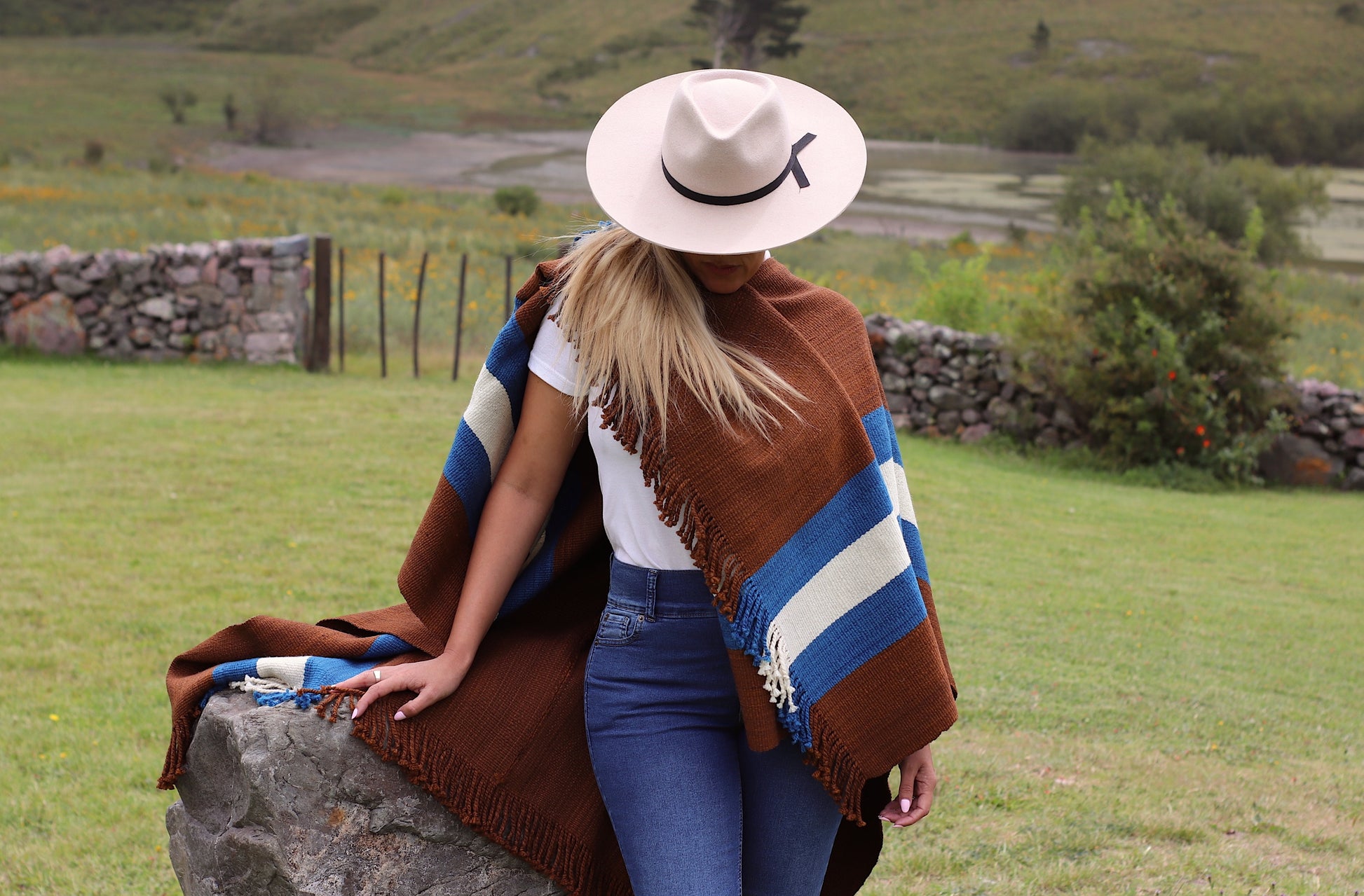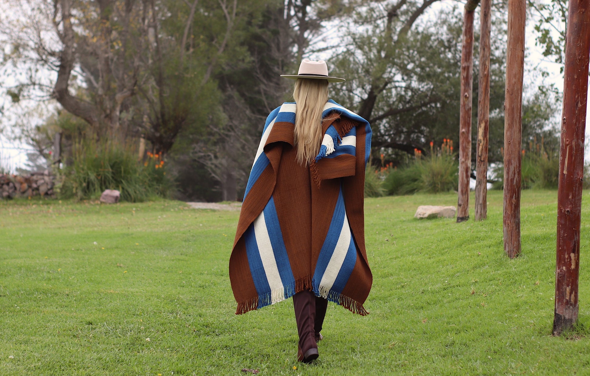 El poncho es una pieza única tejido artesanalmente en telar criollo, de alta densidad de trama cerrada y liviana en dos paños color Tabaco natural