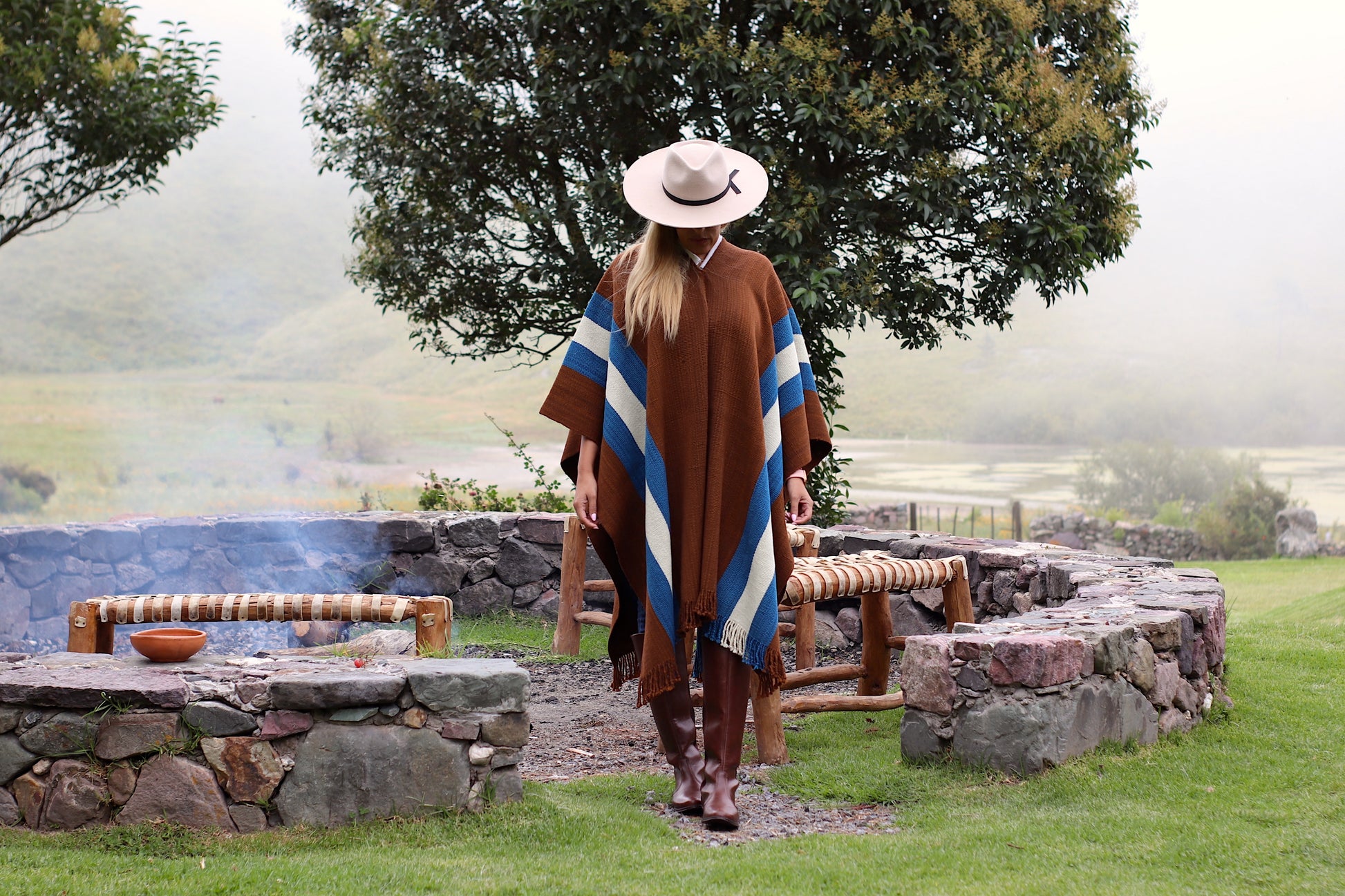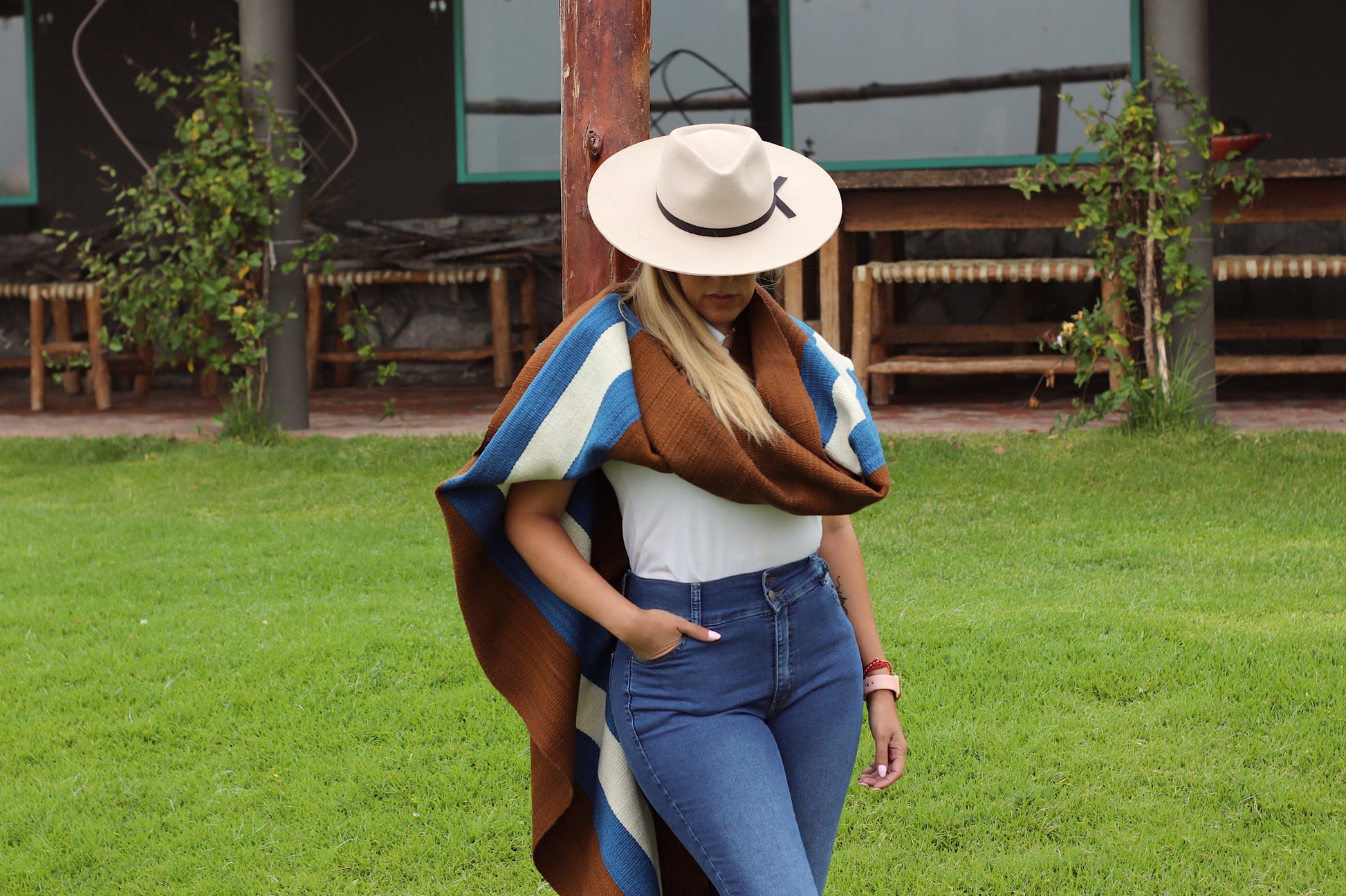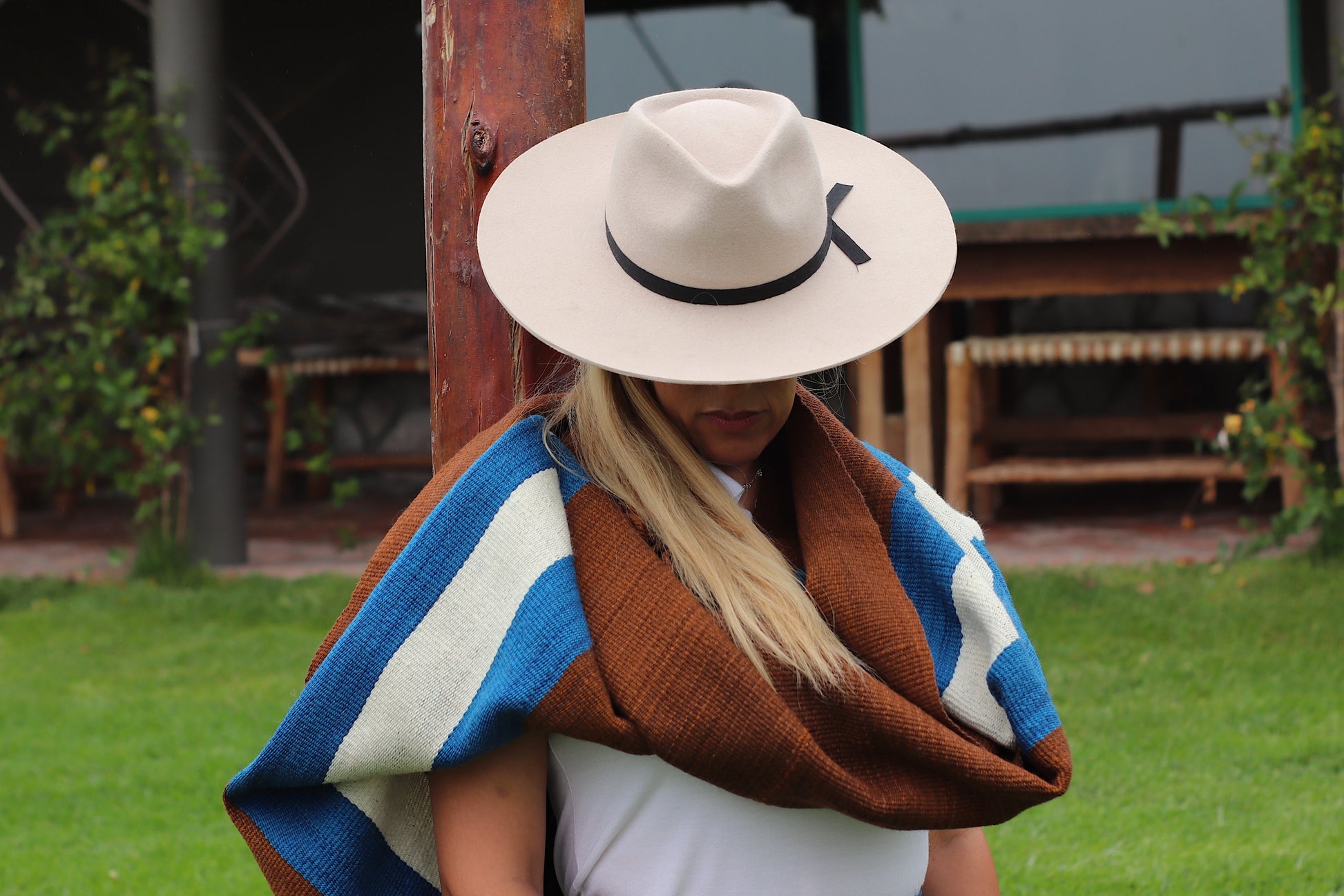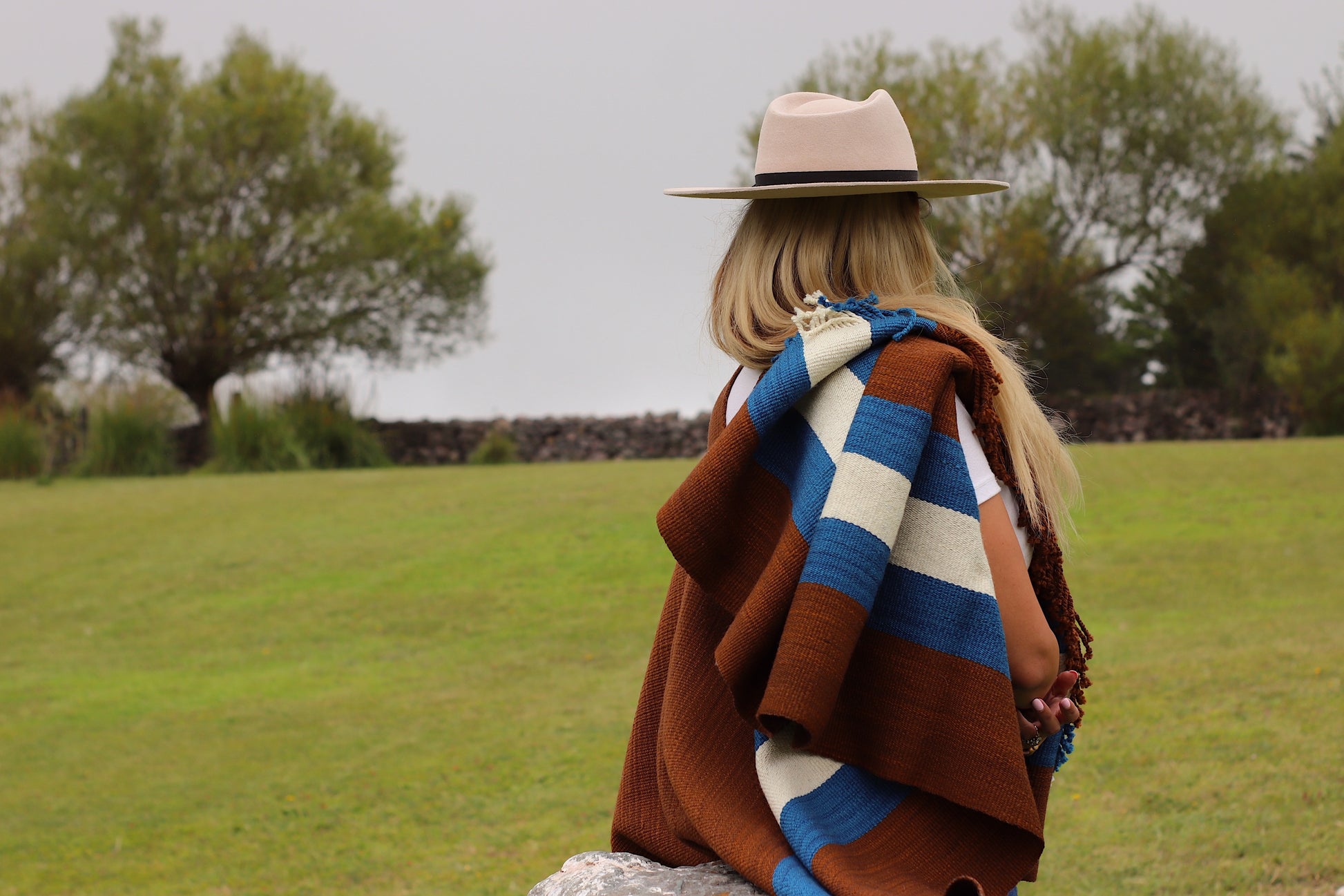 El poncho es una pieza única tejido artesanalmente en telar criollo, de alta densidad de trama cerrada y liviana en dos paños color Tabaco natural