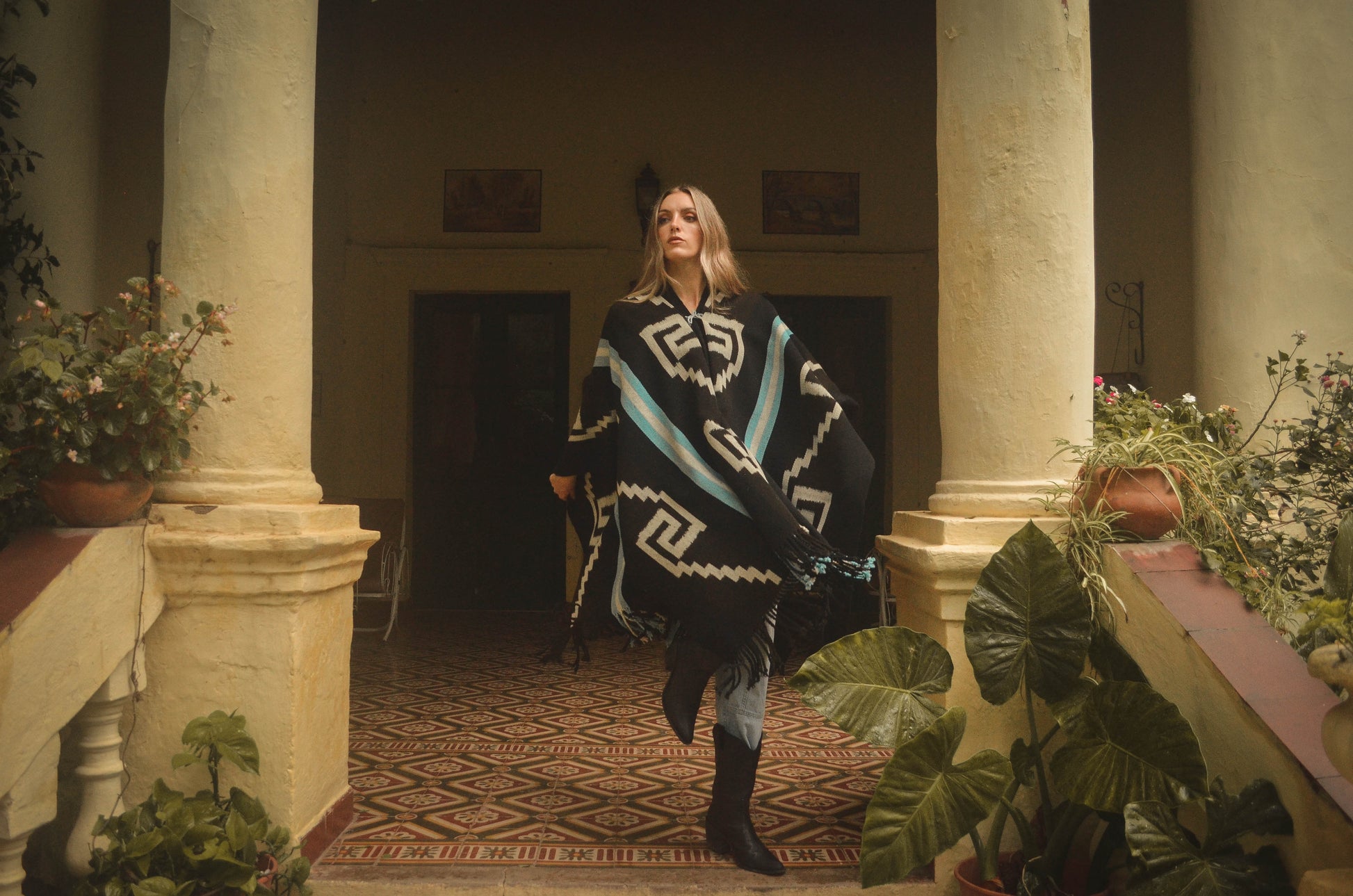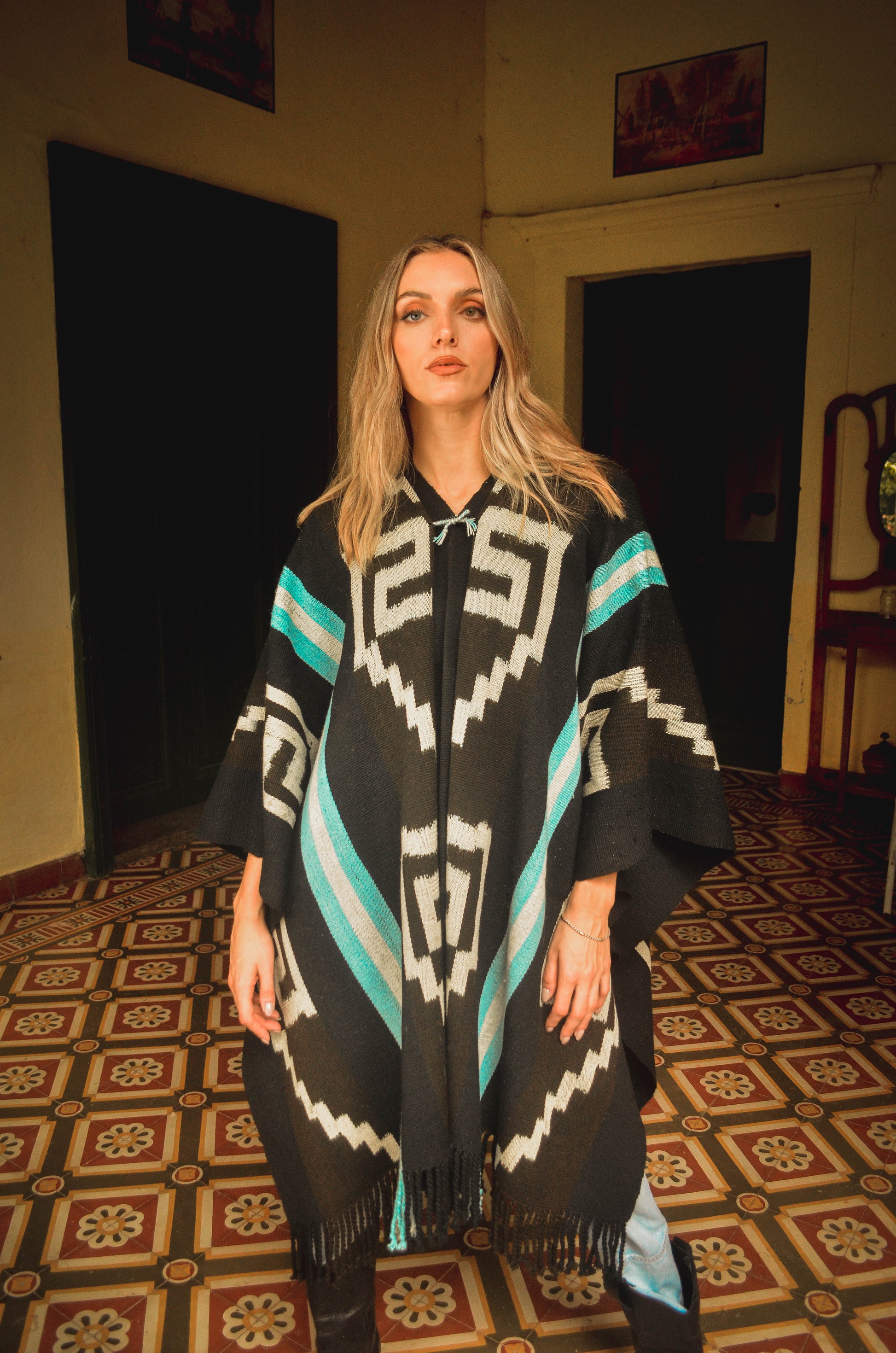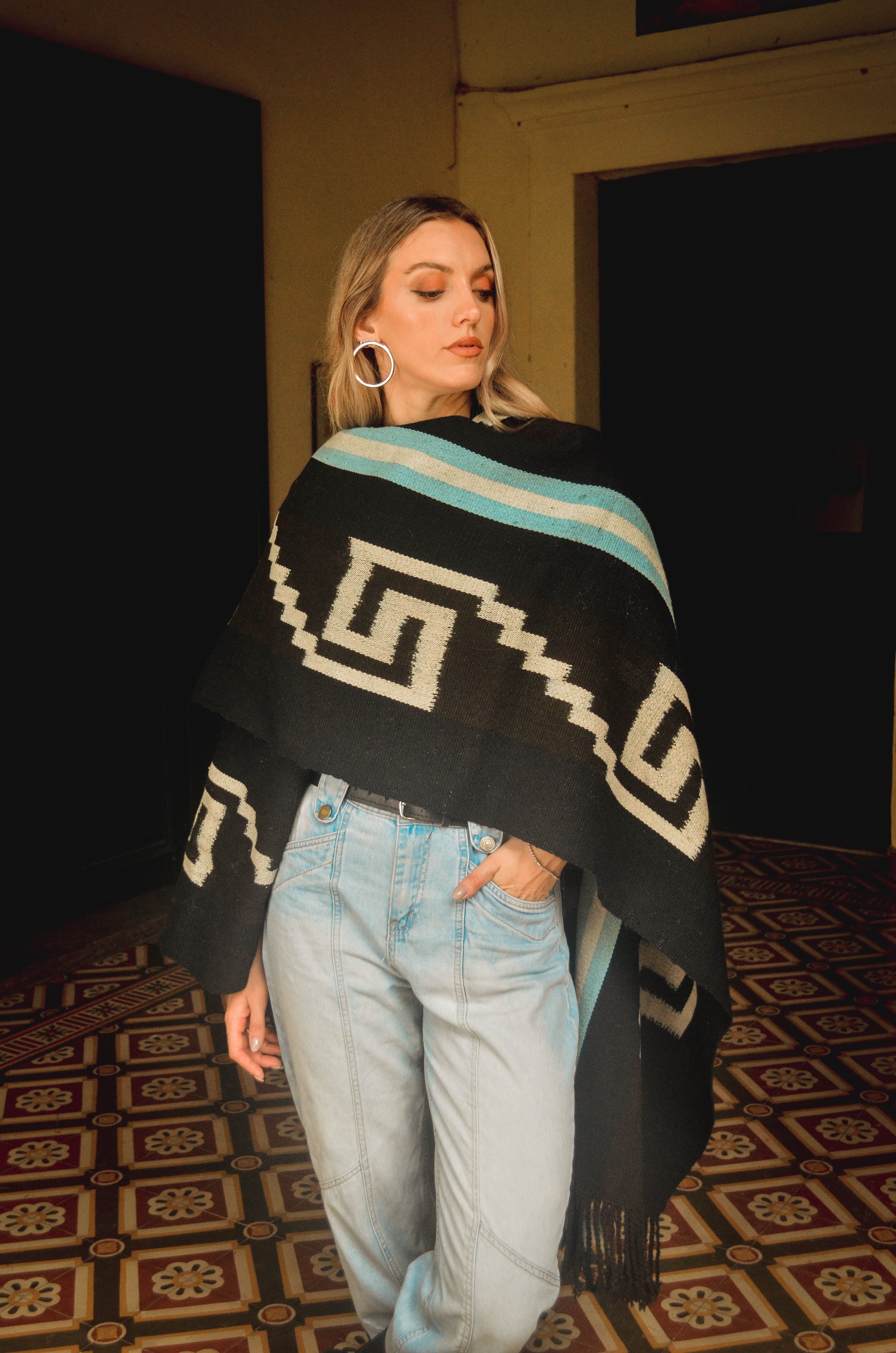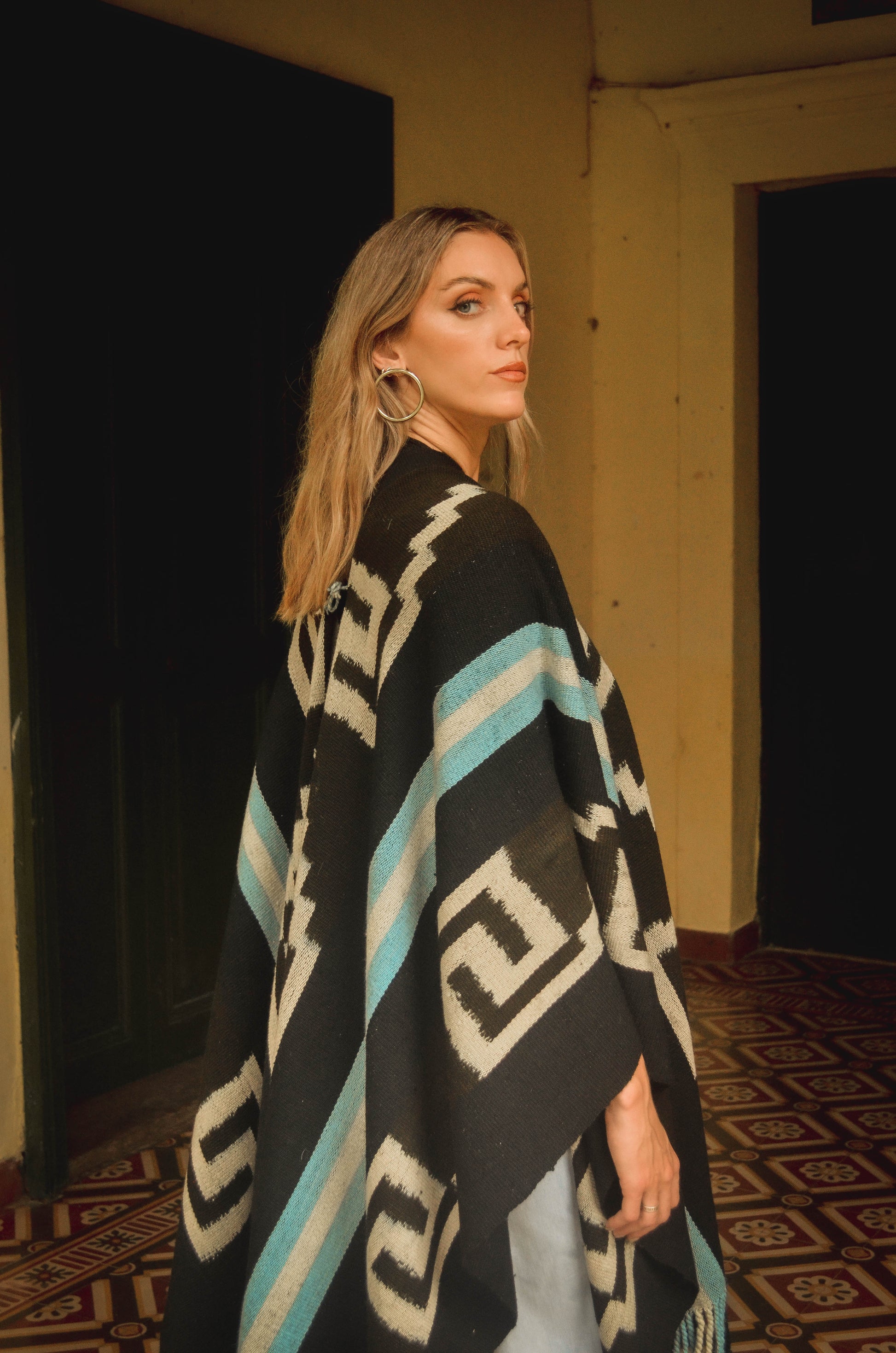 Poncho "Azurduy" es un poncho Guarda Atada y es parte de la Colección "Federal" de 23 obras textiles Uayno, es una pieza única tejida artesanalmente con hilos de lana de oveja en telar criollo.