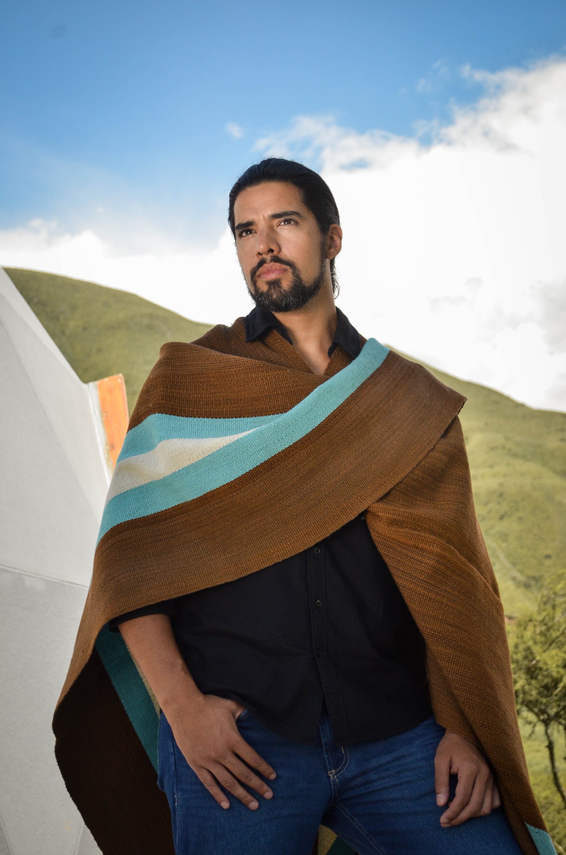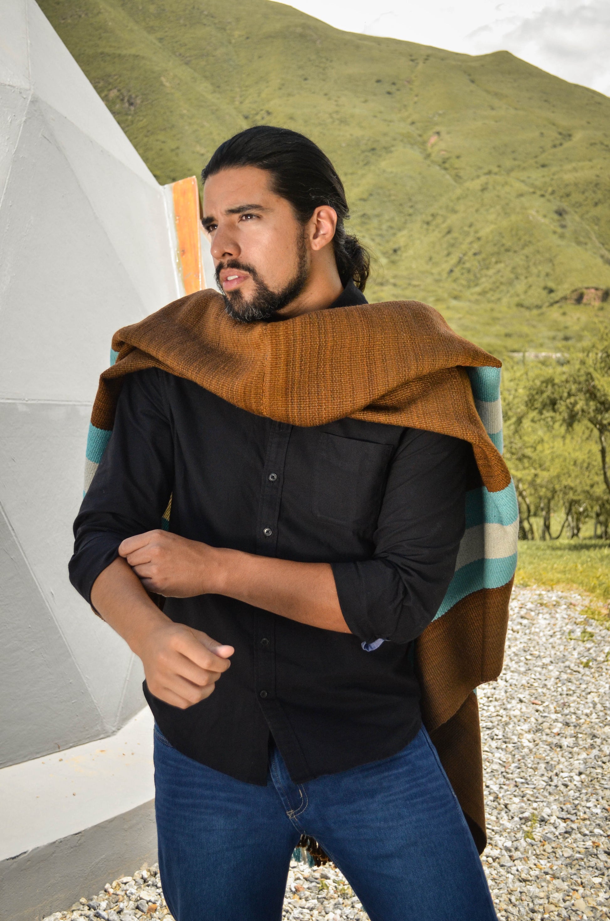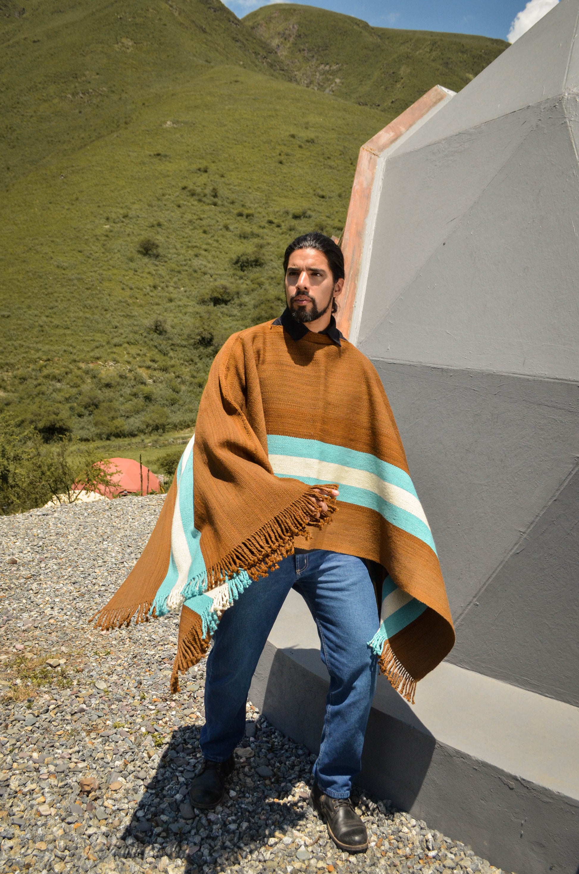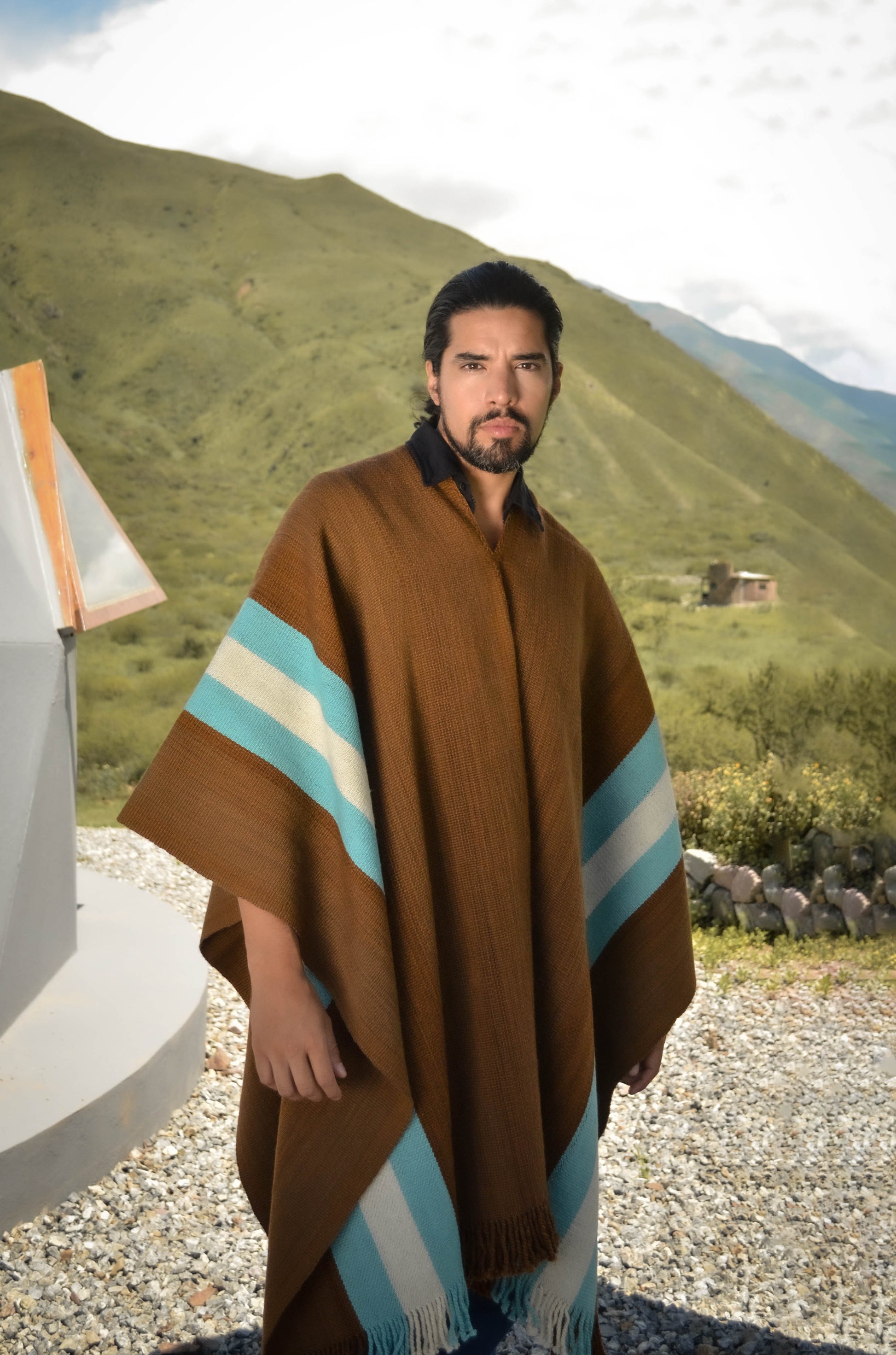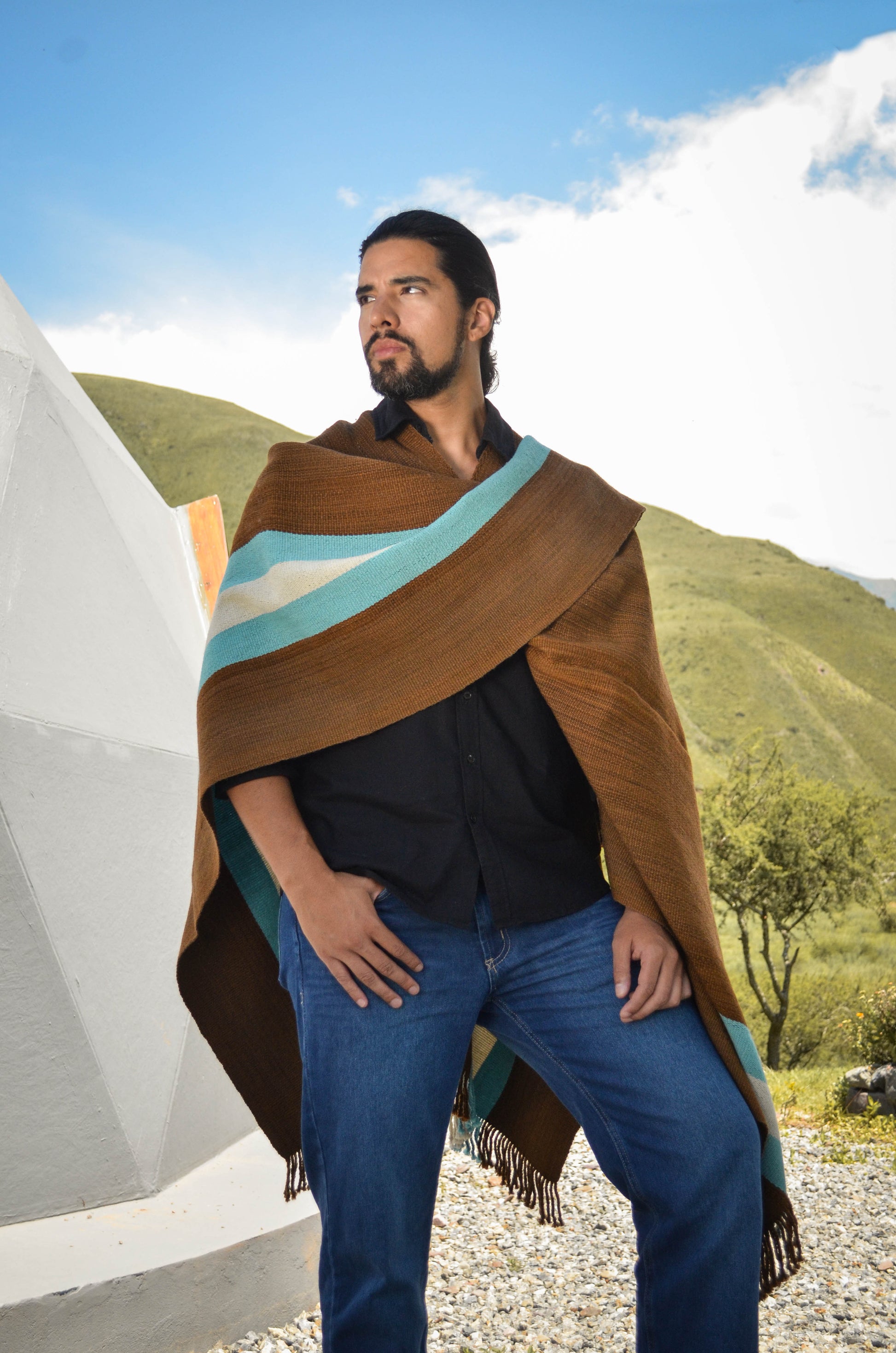 El poncho es una pieza única tejido artesanalmente en telar criollo, de alta densidad de trama cerrada y liviana en dos paños color Chocolate natural