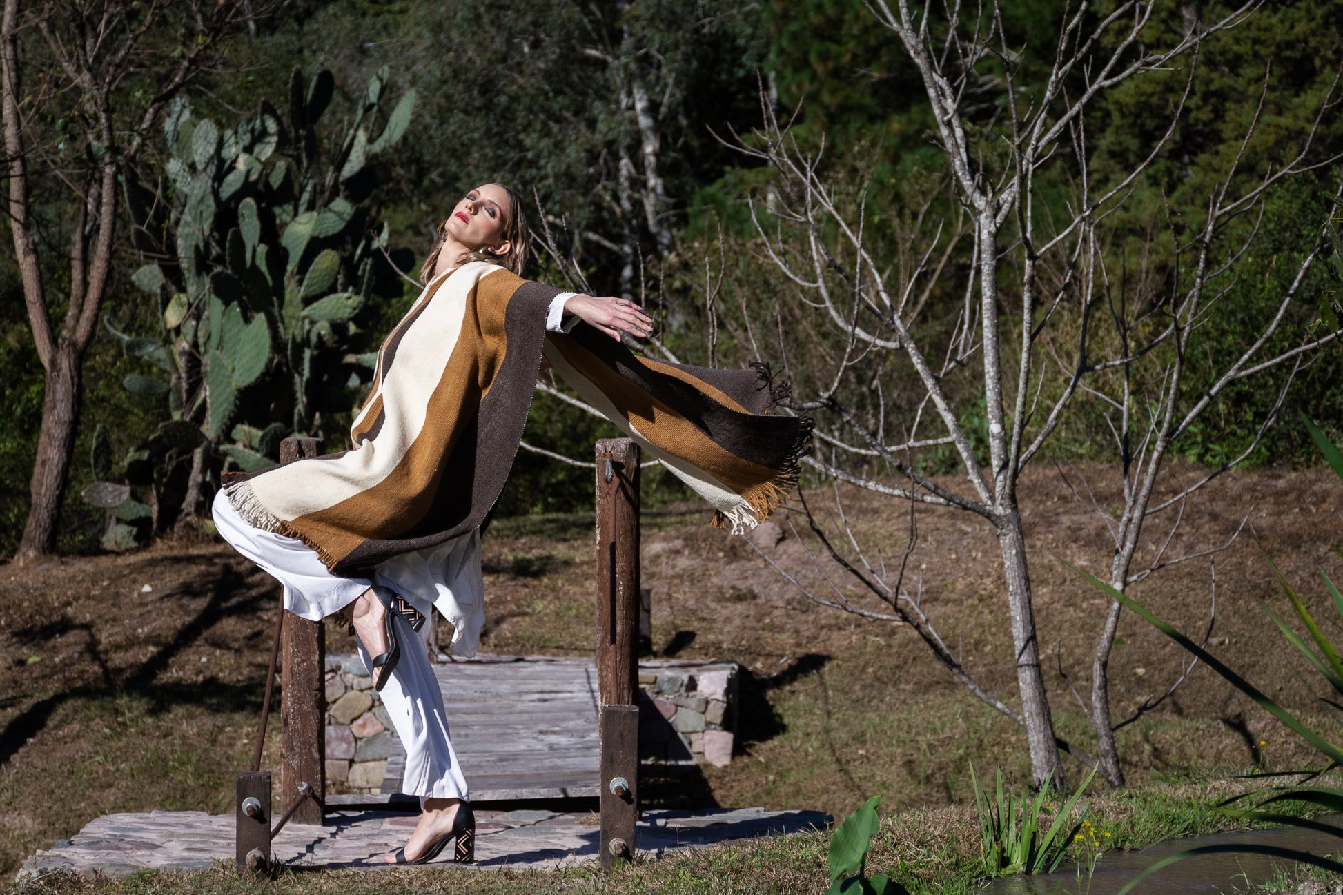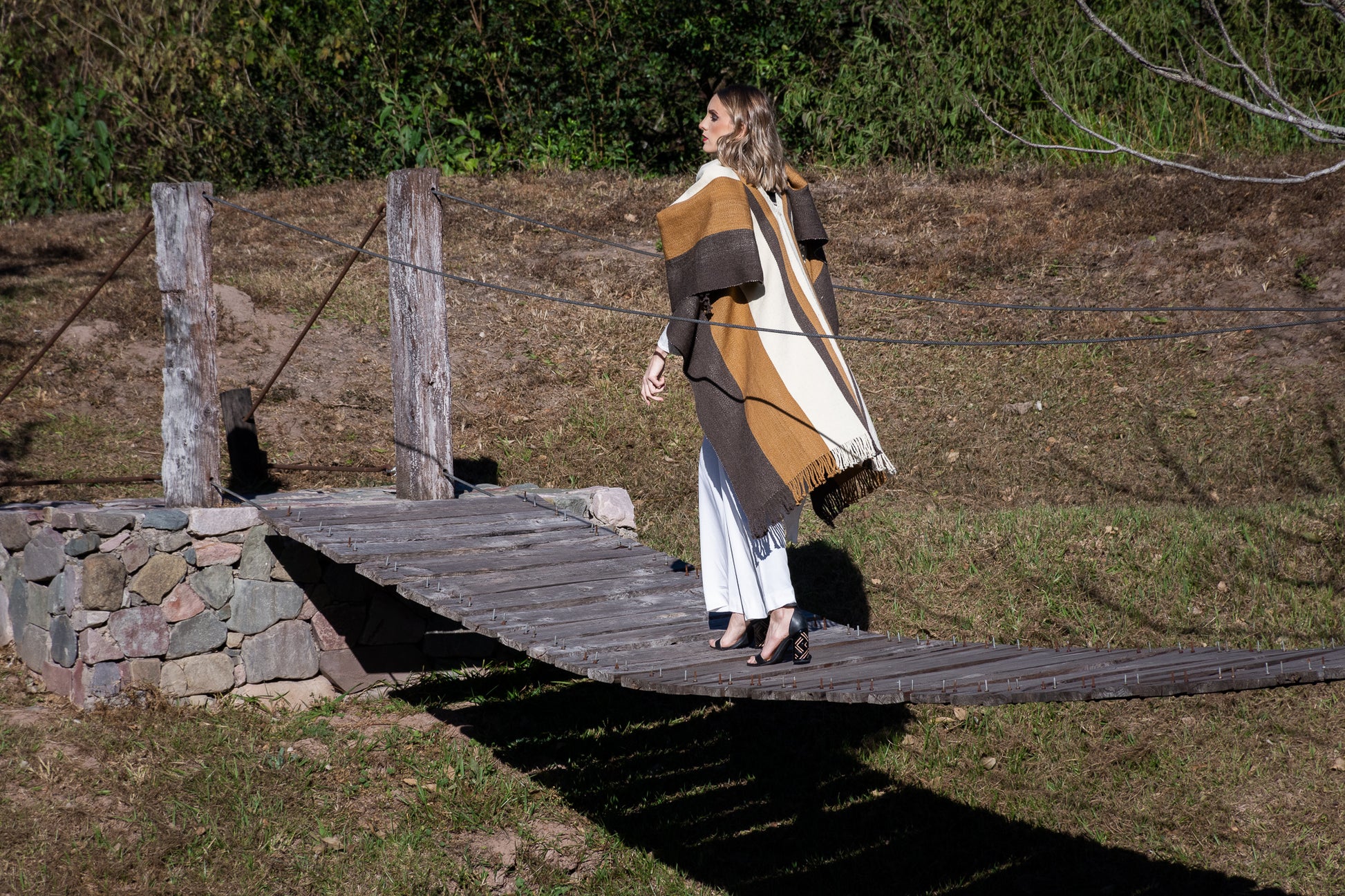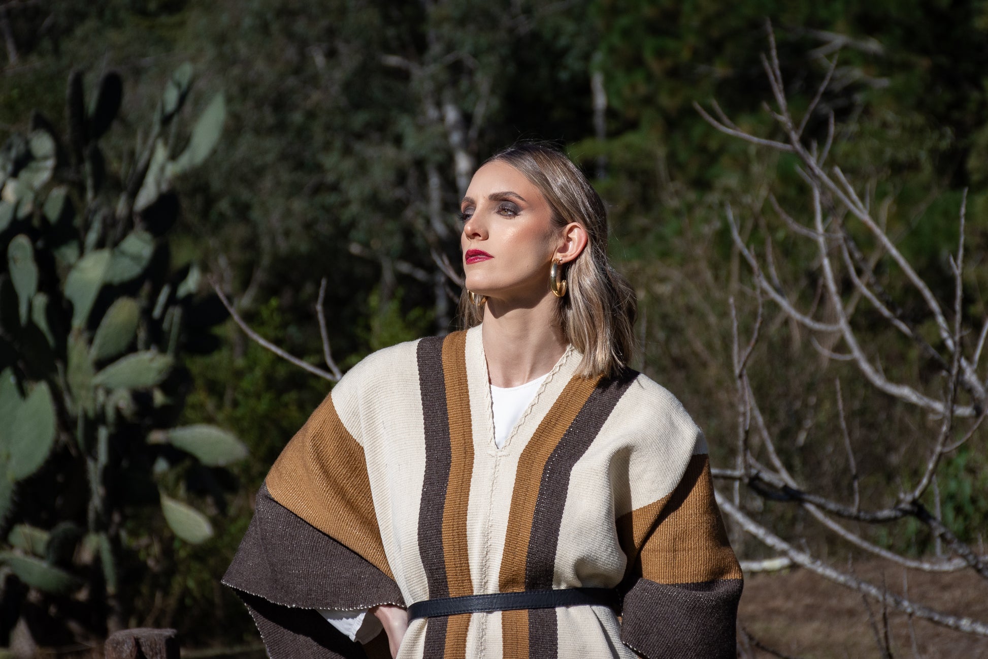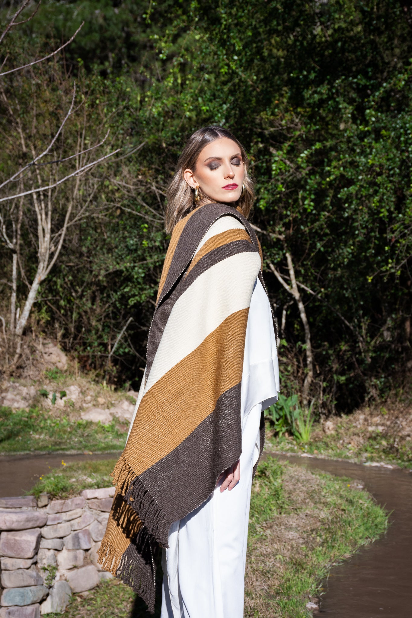 Poncho "Bernarda" es parte de la Colección Federal de 23 obras textiles Uayno, es una pieza única tejida artesanalmente con hilos de lana de oveja en telar criollo.