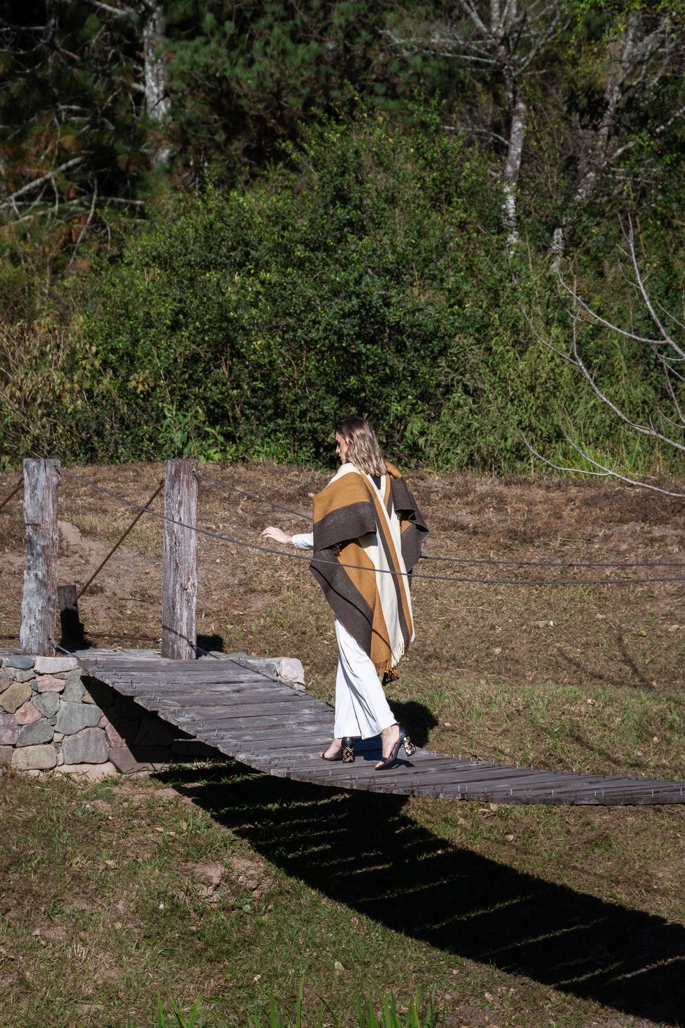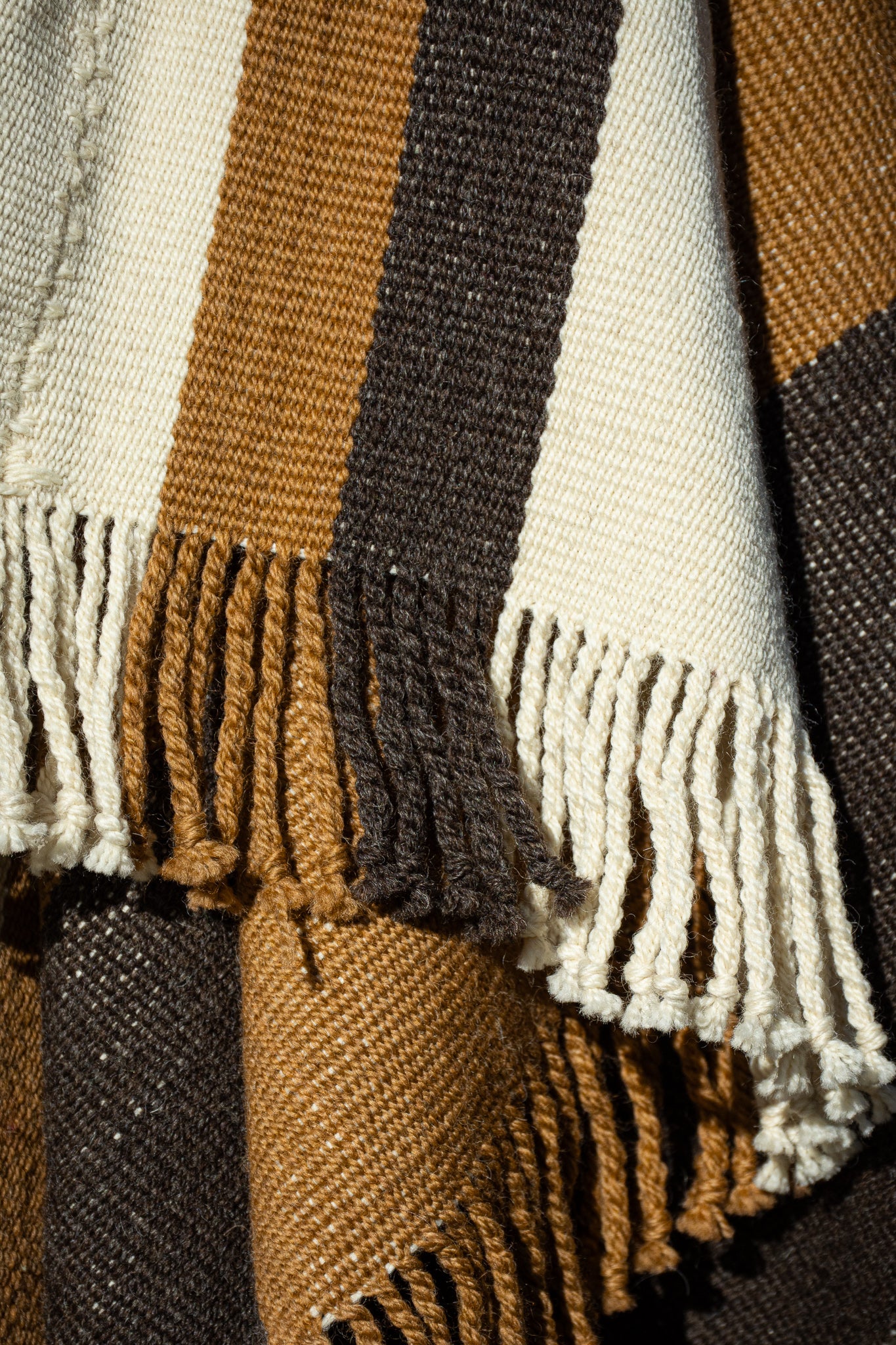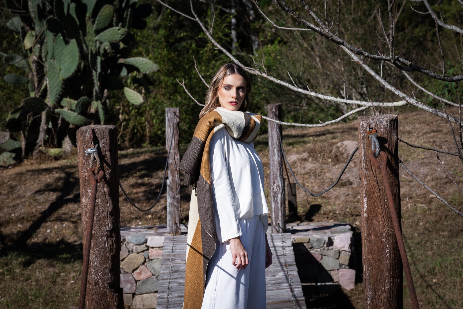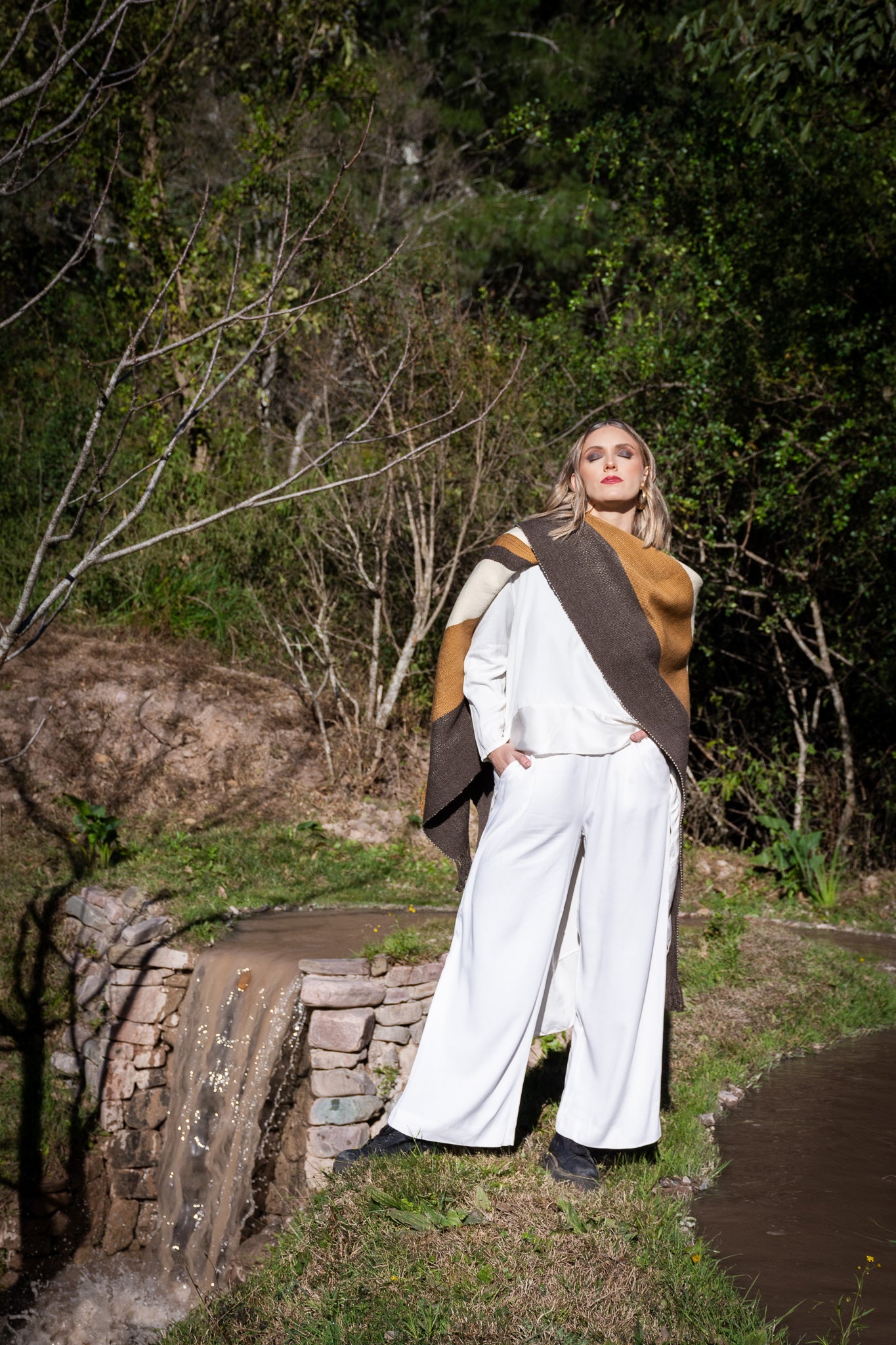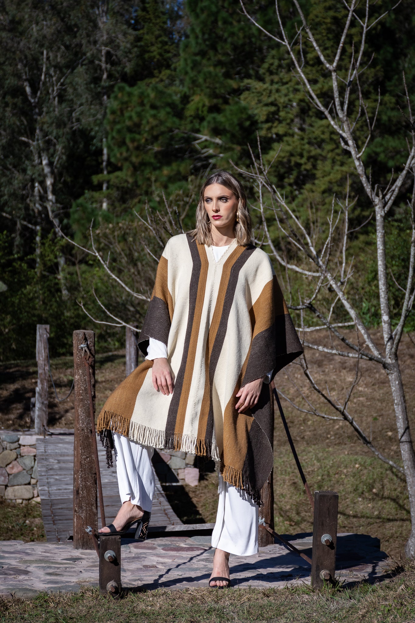 Poncho "Bernarda" es parte de la Colección Federal de 23 obras textiles Uayno, es una pieza única tejida artesanalmente con hilos de lana de oveja en telar criollo.