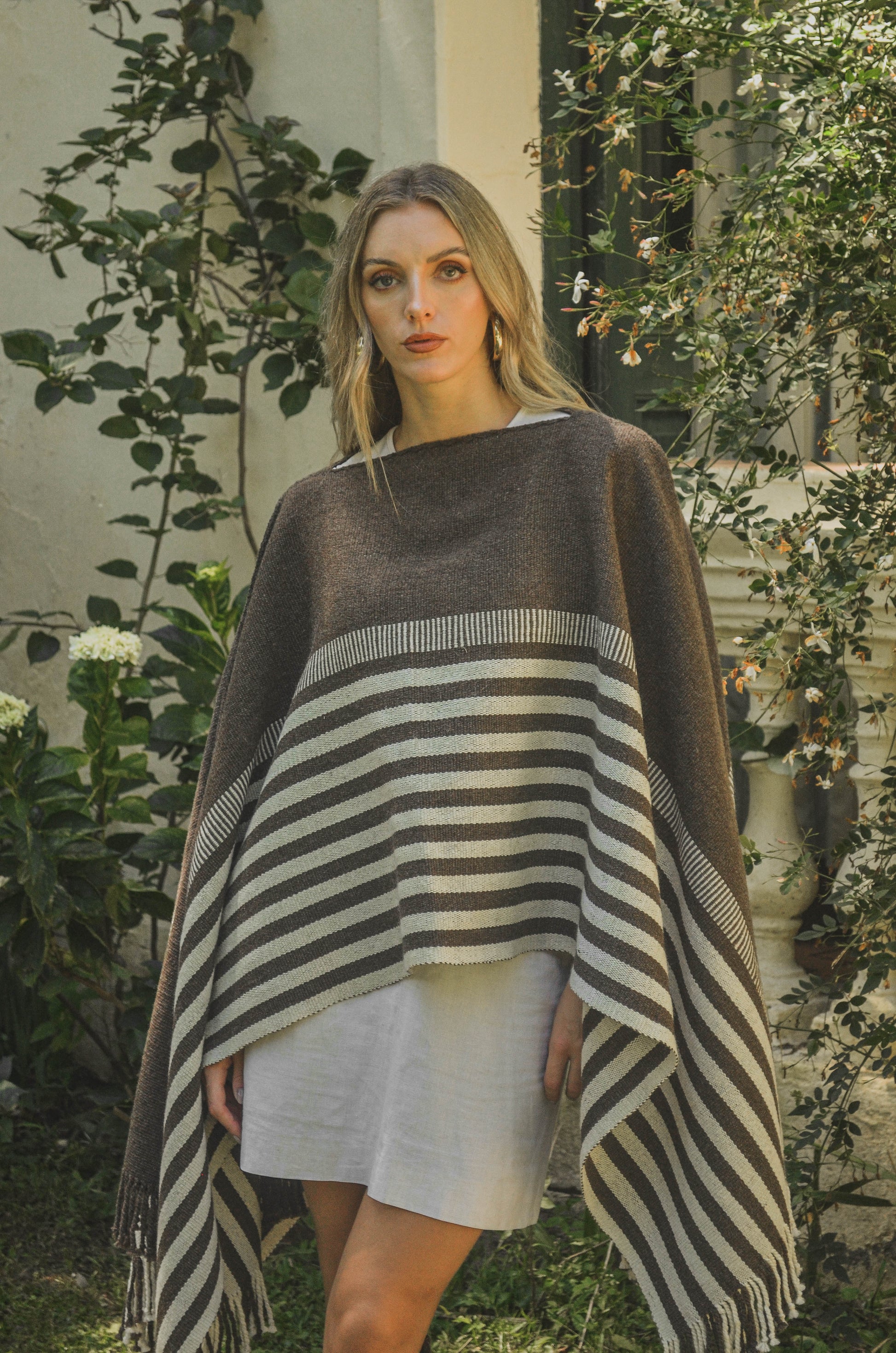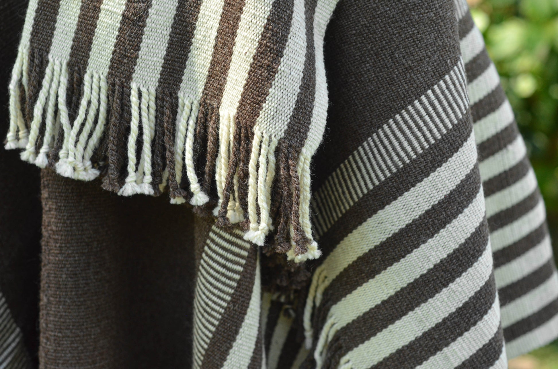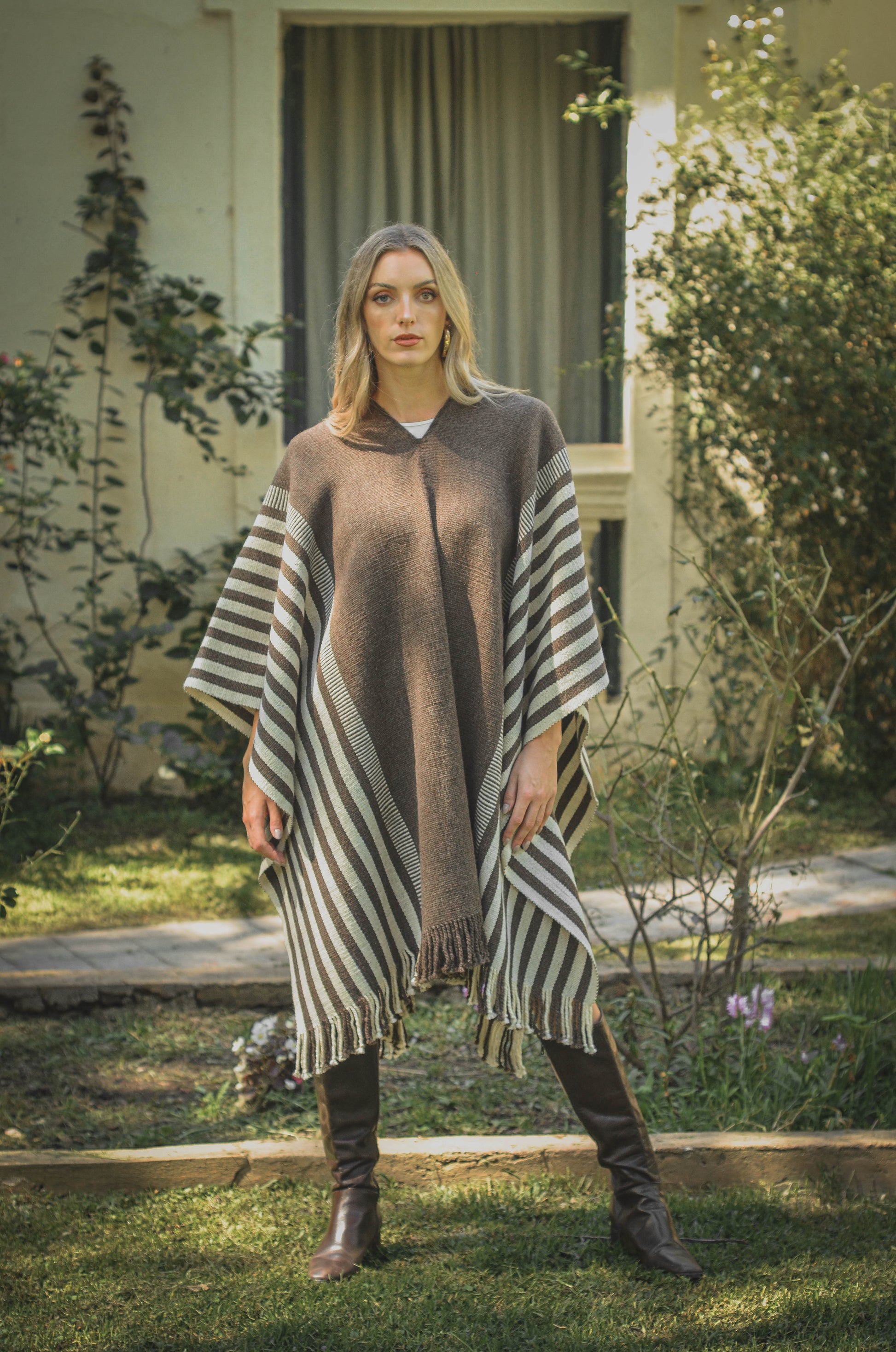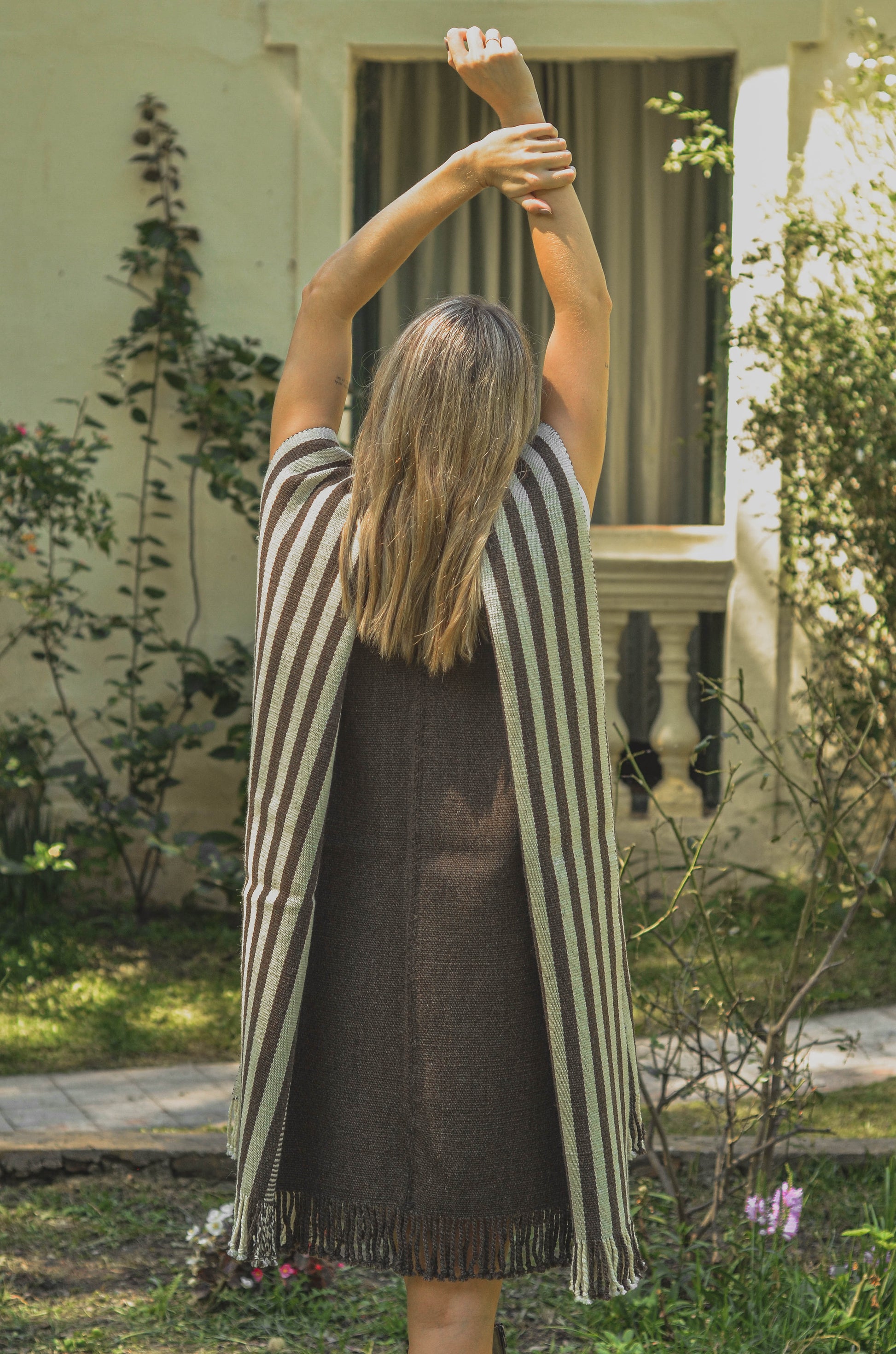 El poncho es una pieza única tejido artesanalmente en telar criollo, de alta densidad de trama cerrada y liviana en dos paños color Adobe natural