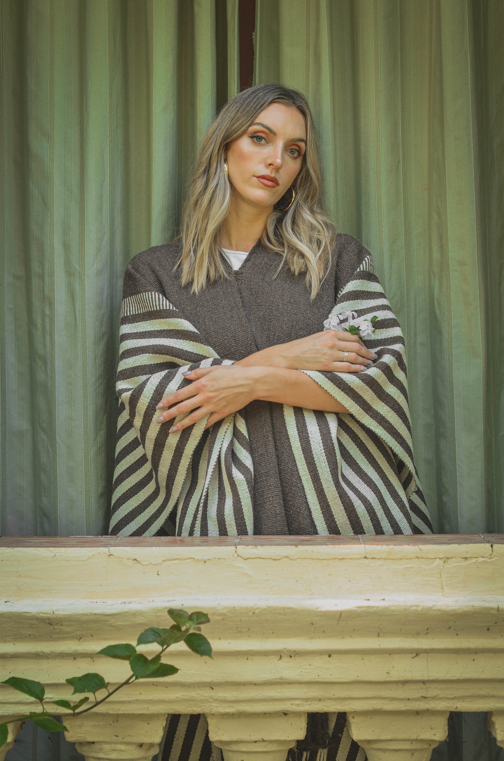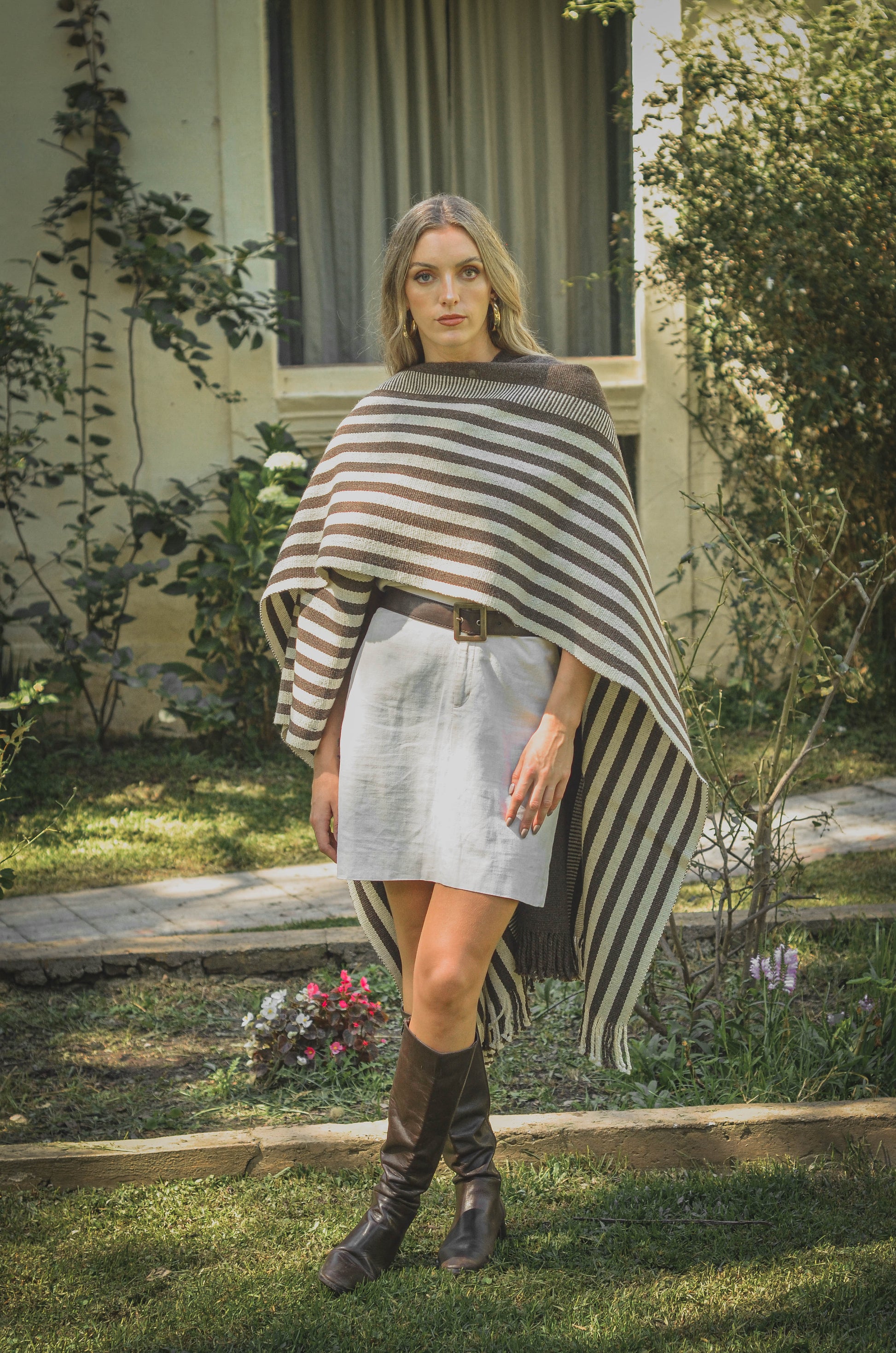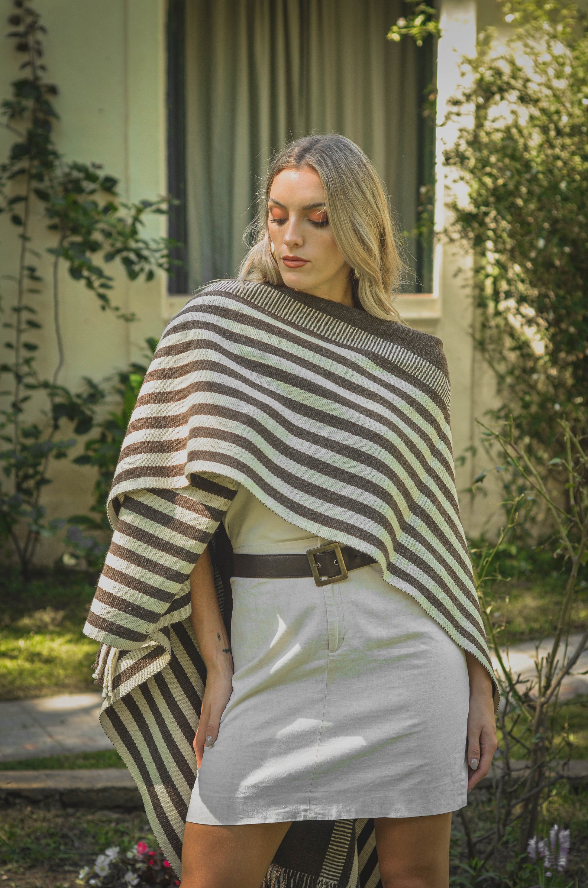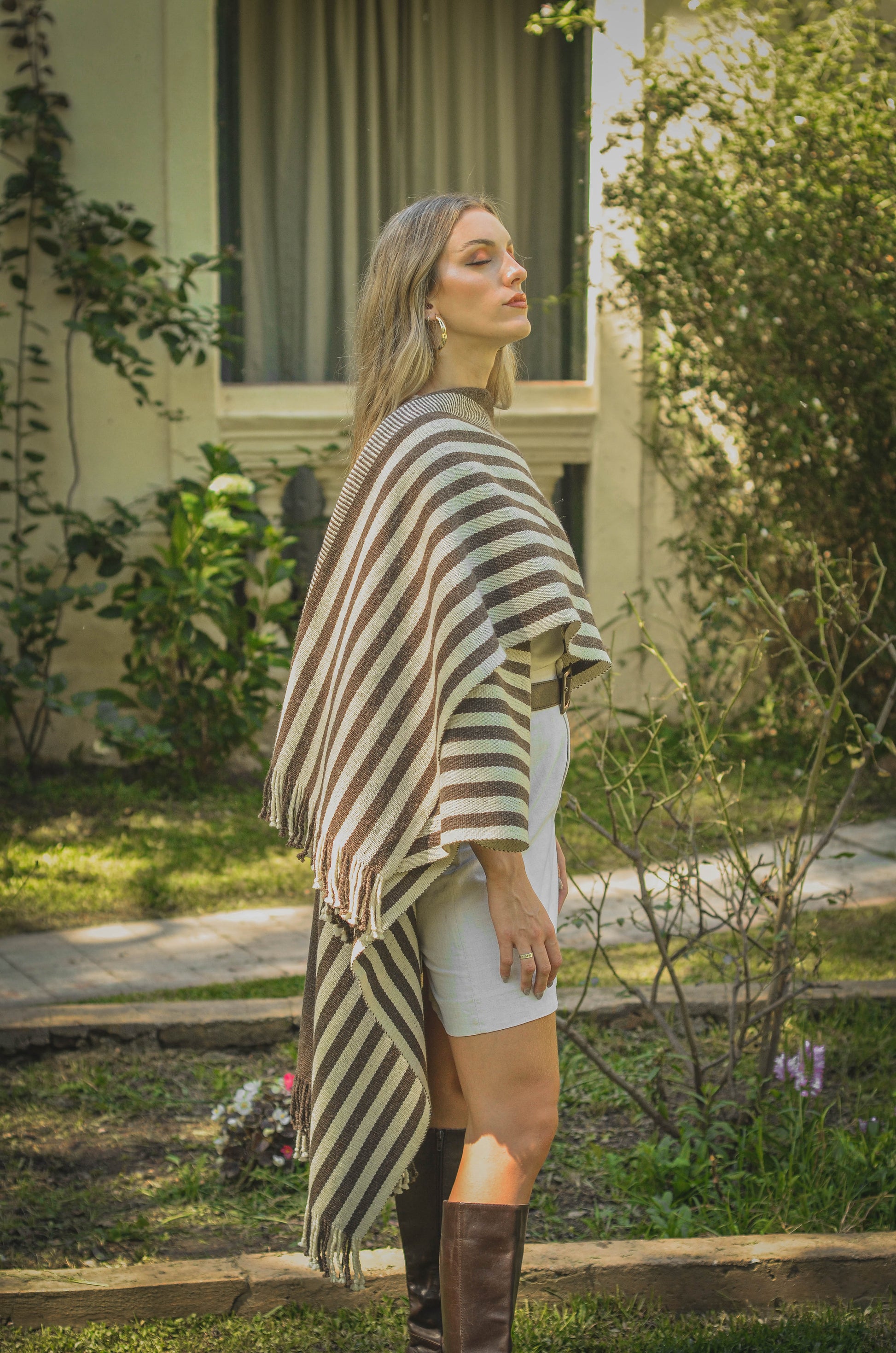 El poncho es una pieza única tejido artesanalmente en telar criollo, de alta densidad de trama cerrada y liviana en dos paños color Adobe natural
