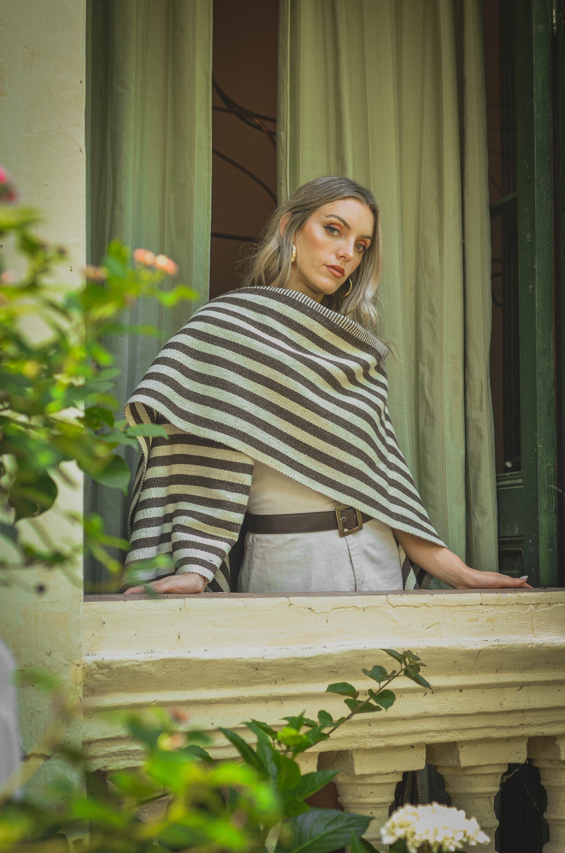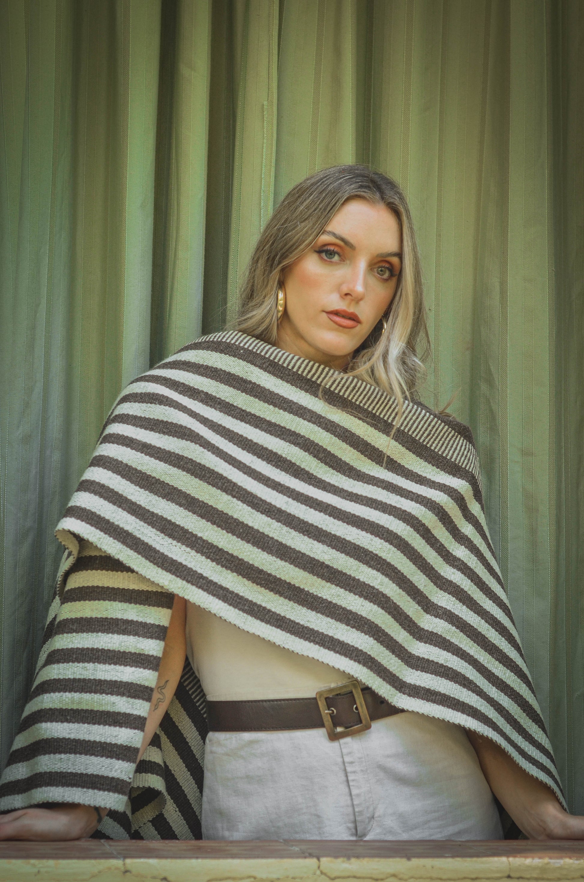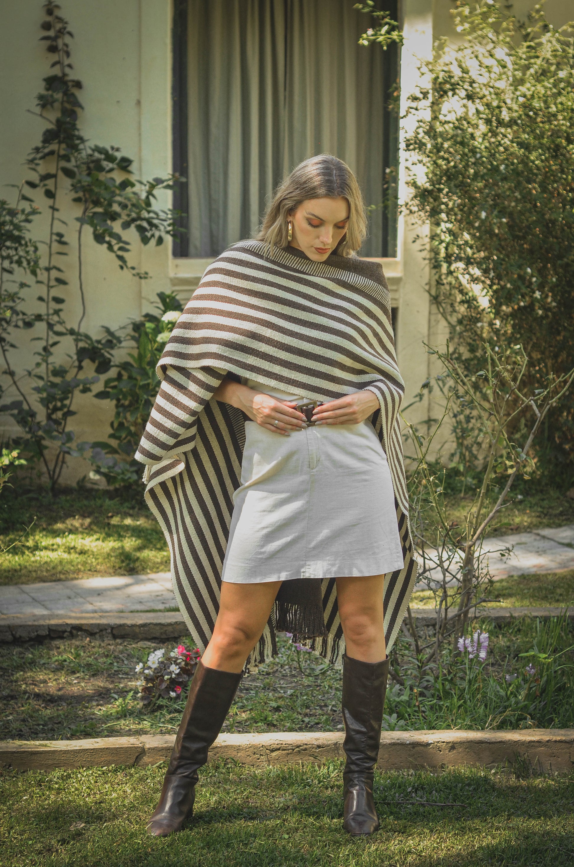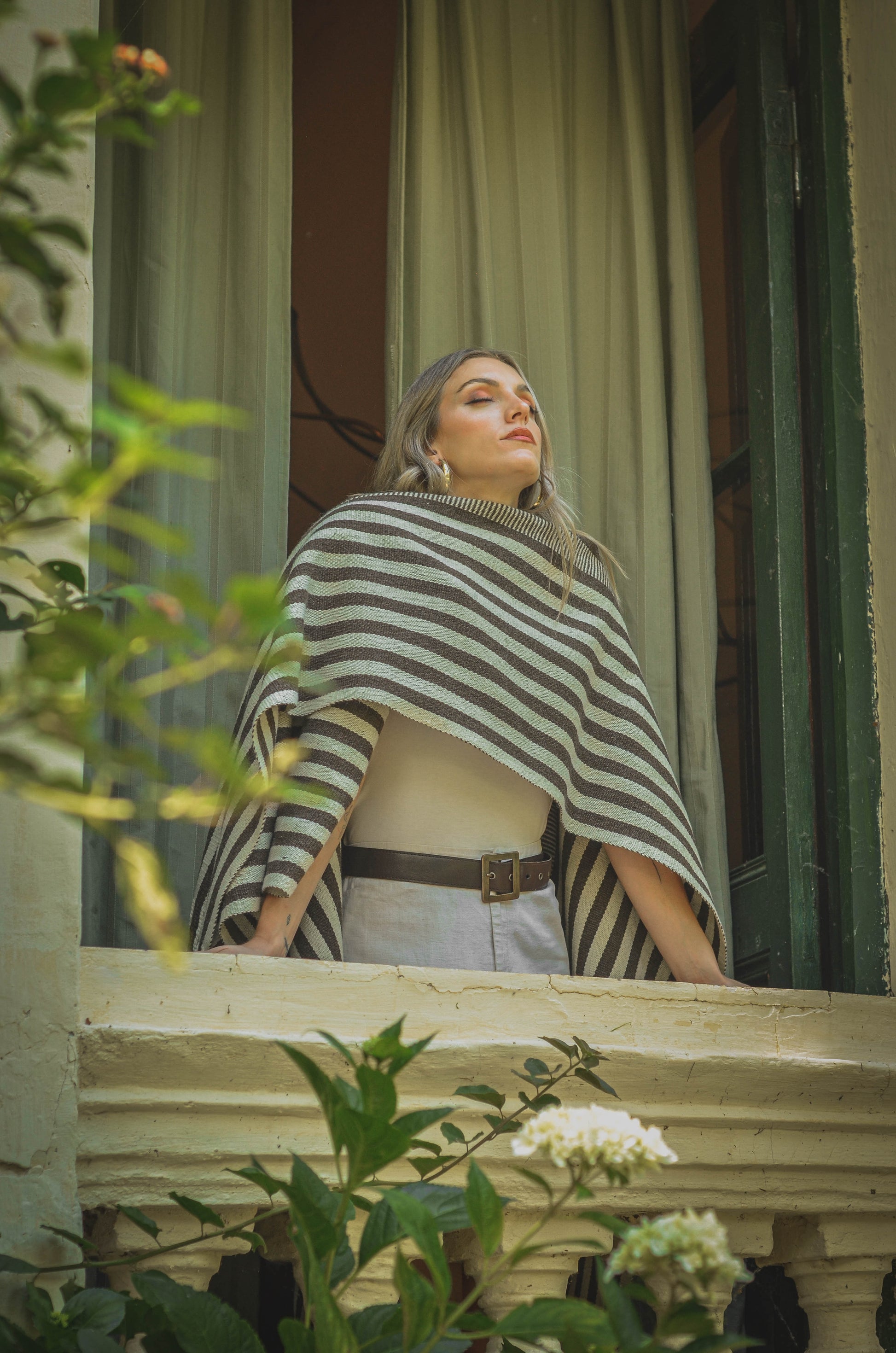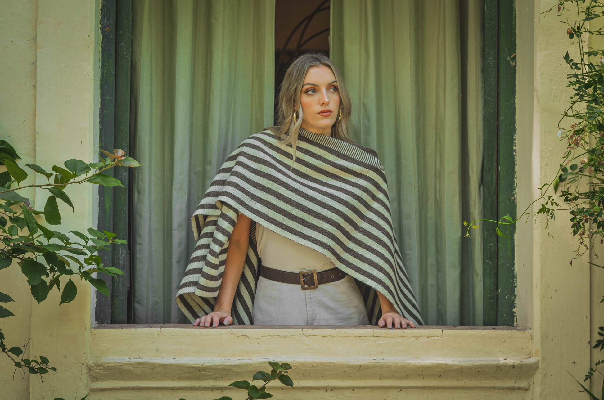 El poncho es una pieza única tejido artesanalmente en telar criollo, de alta densidad de trama cerrada y liviana en dos paños color Adobe natural