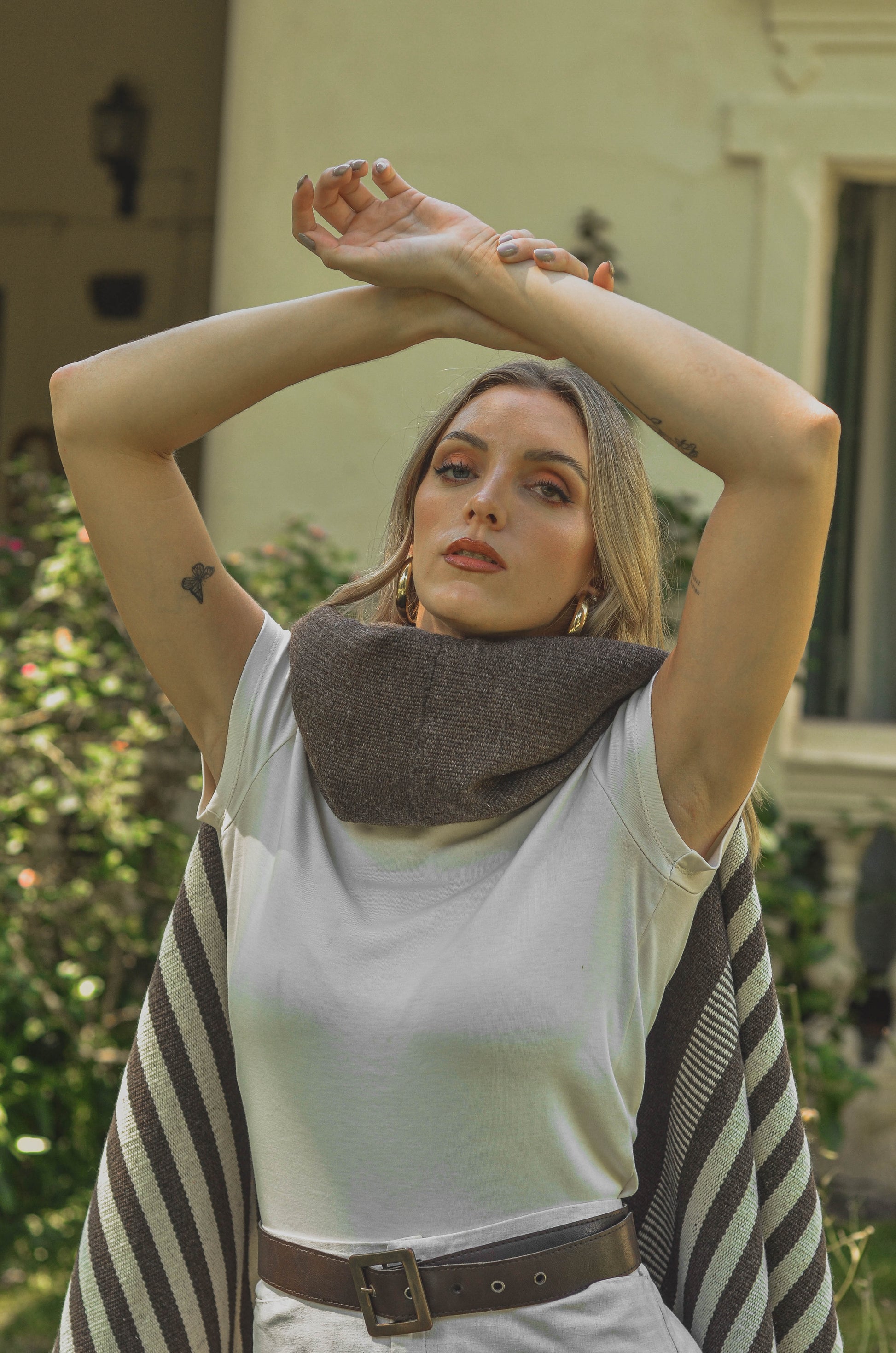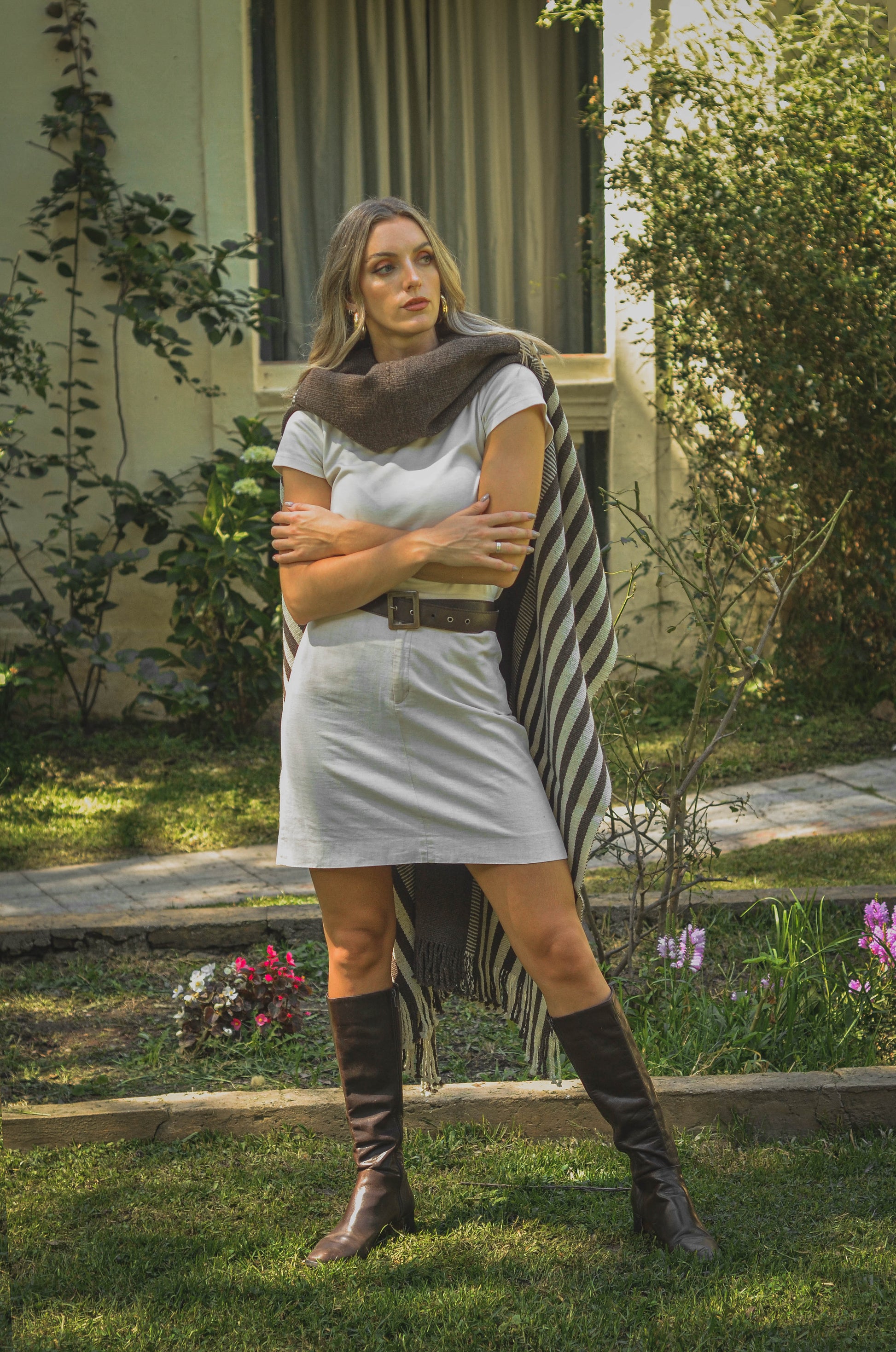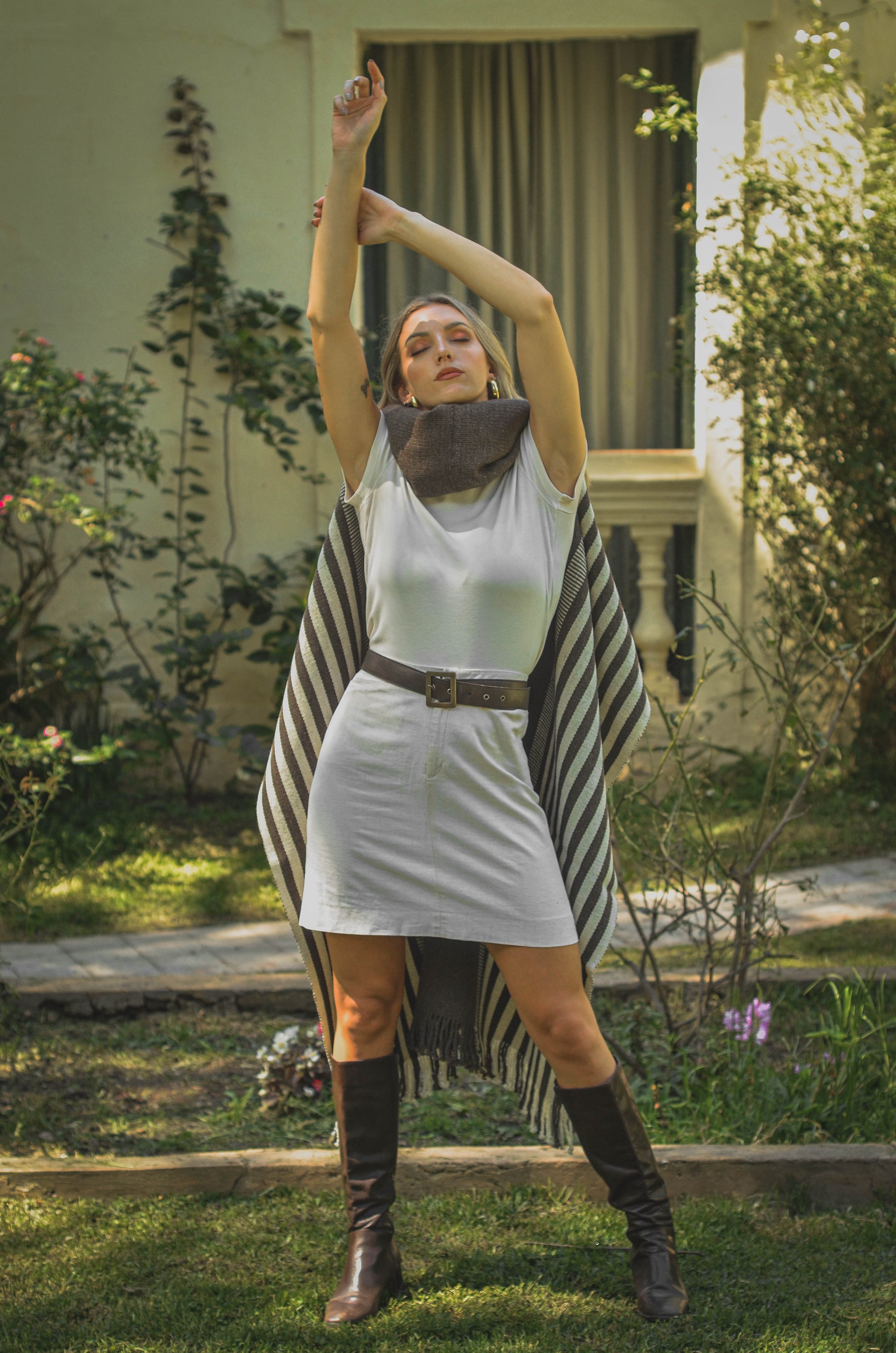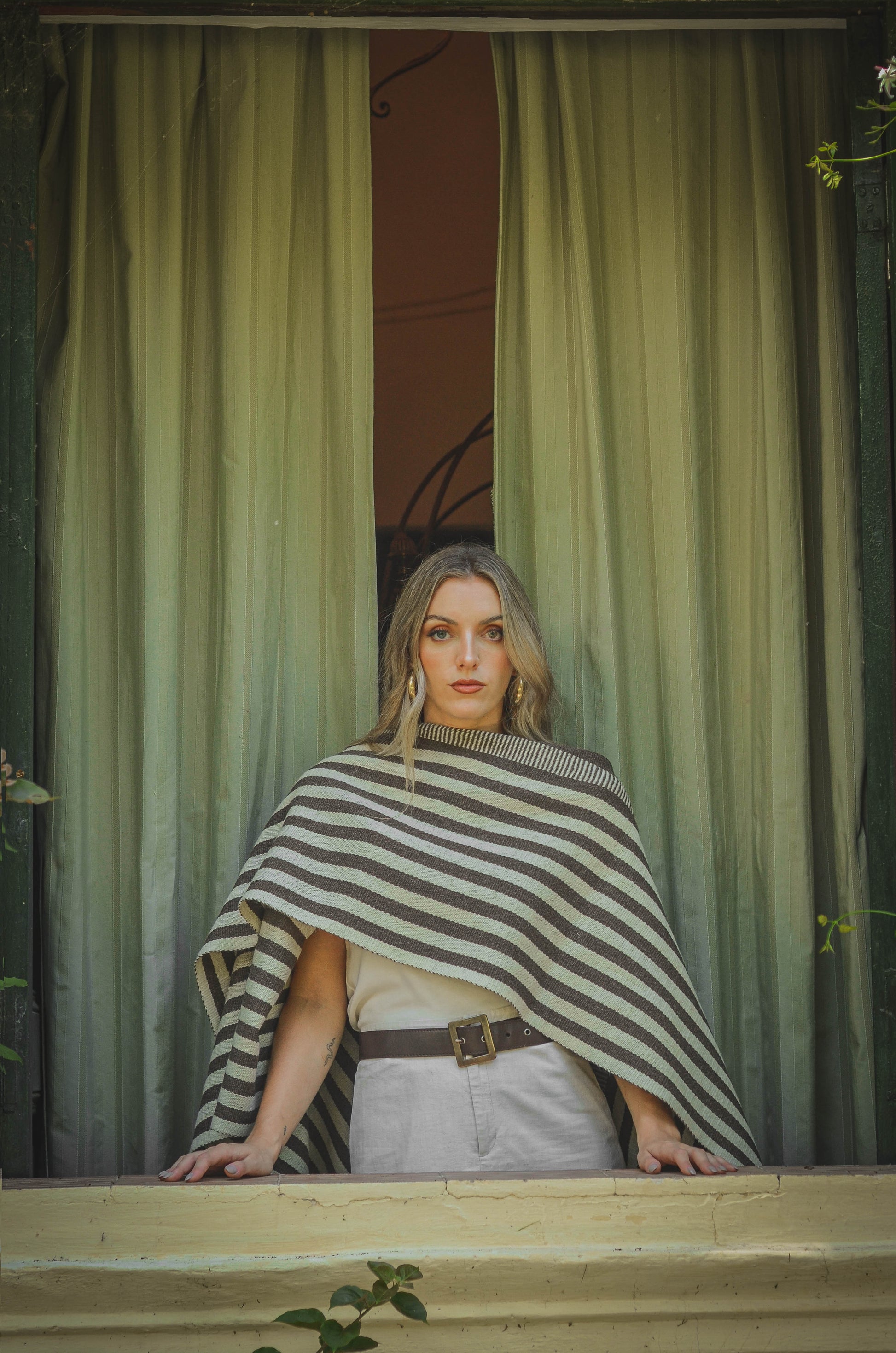 El poncho es una pieza única tejido artesanalmente en telar criollo, de alta densidad de trama cerrada y liviana en dos paños color Adobe natural