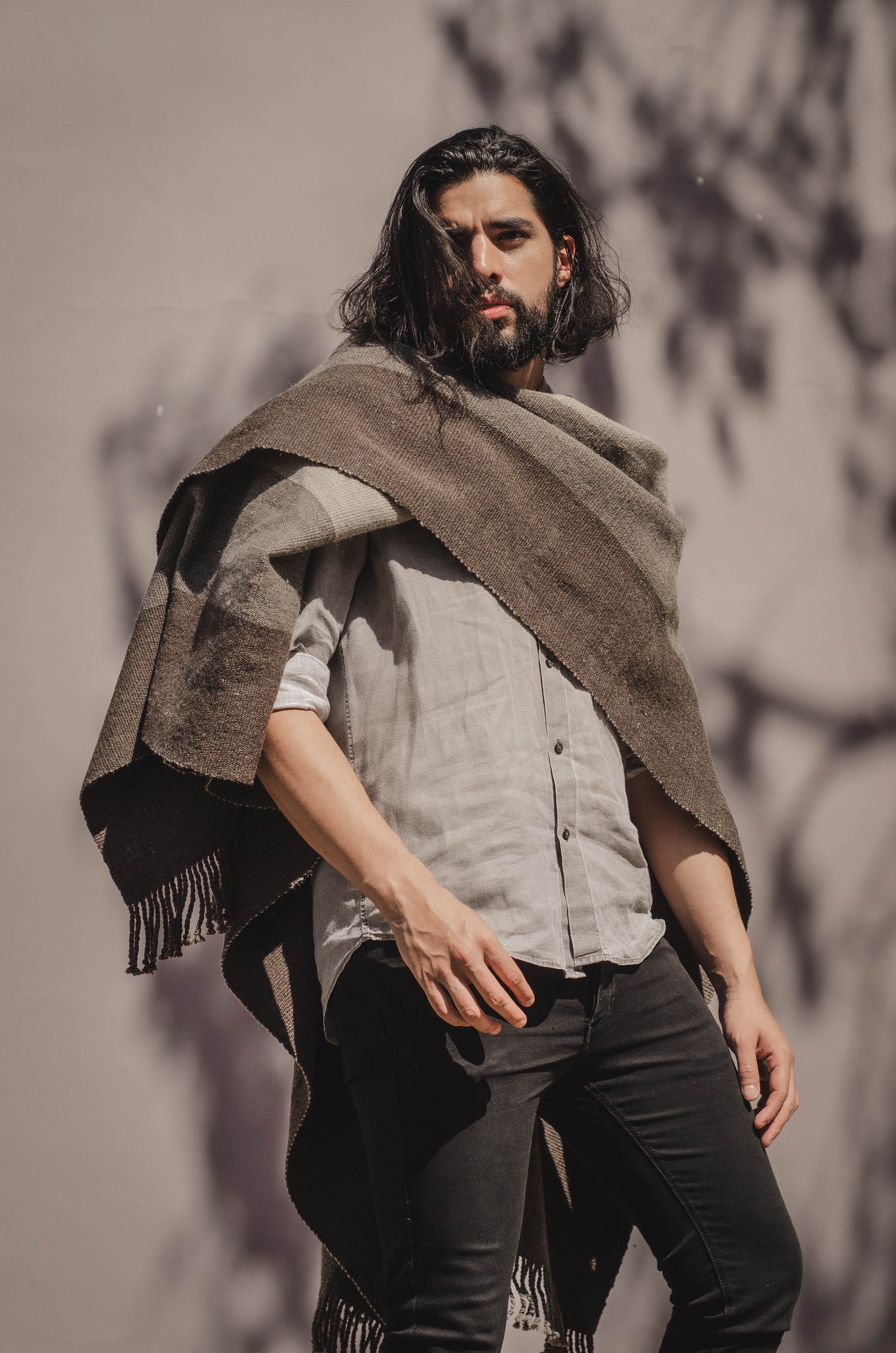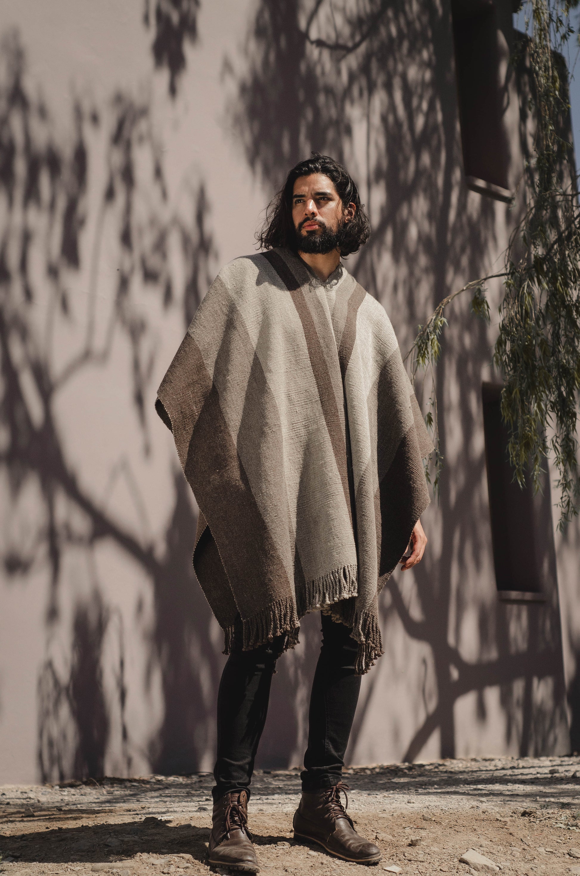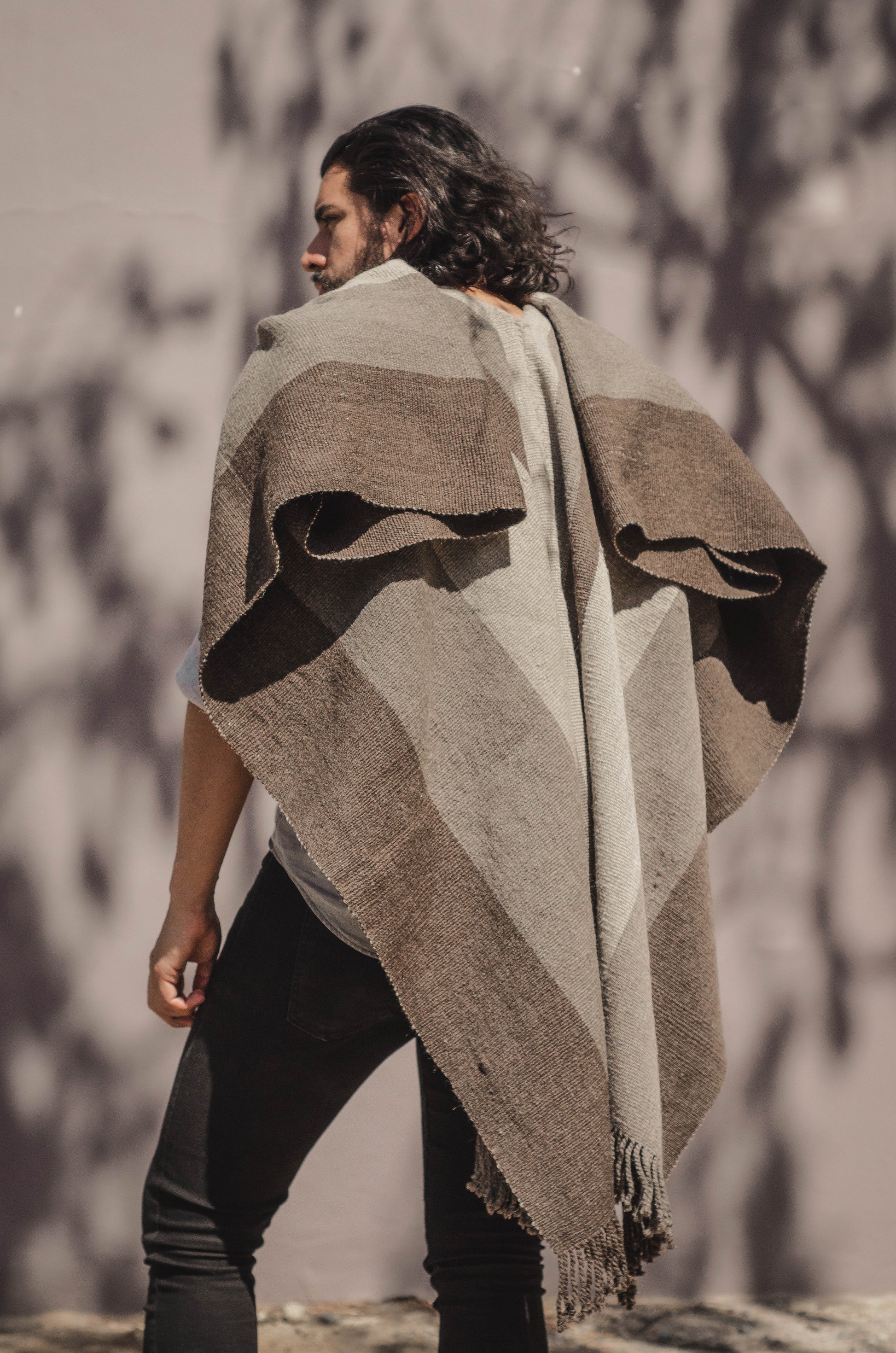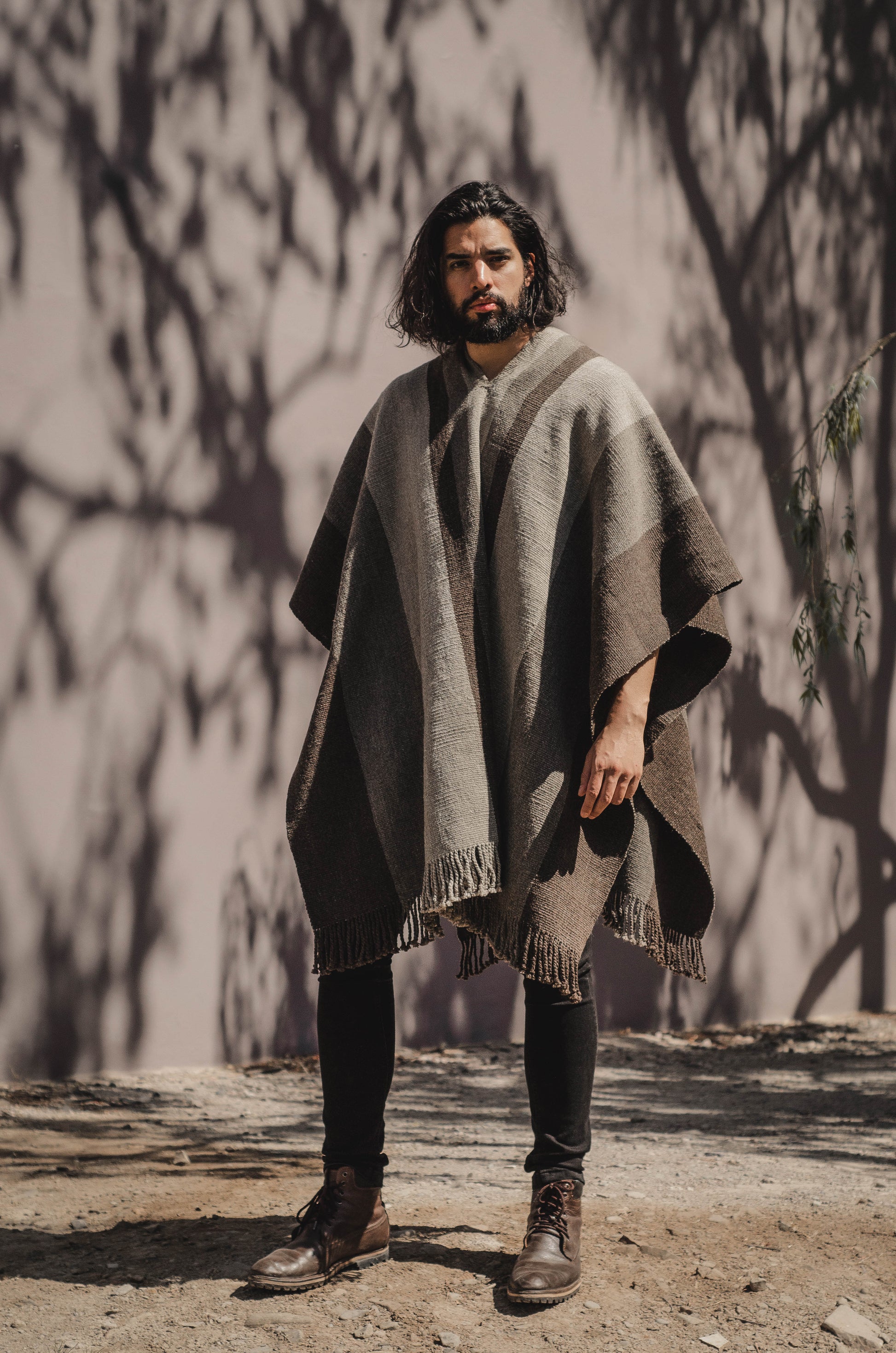 El poncho es una pieza única tejido artesanalmente en telar criollo, de alta densidad de trama cerrada y liviana en dos paños en tonos Grices