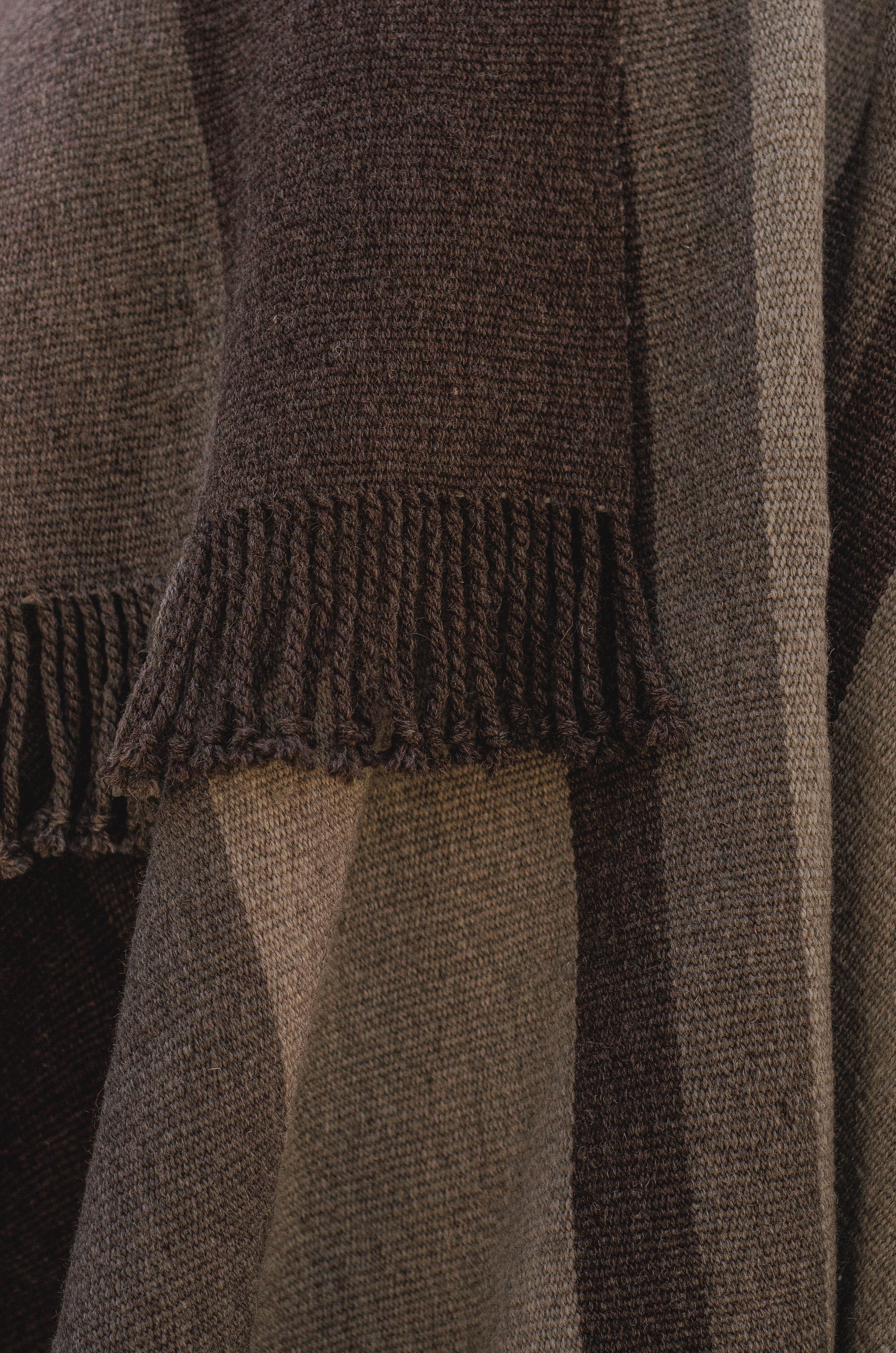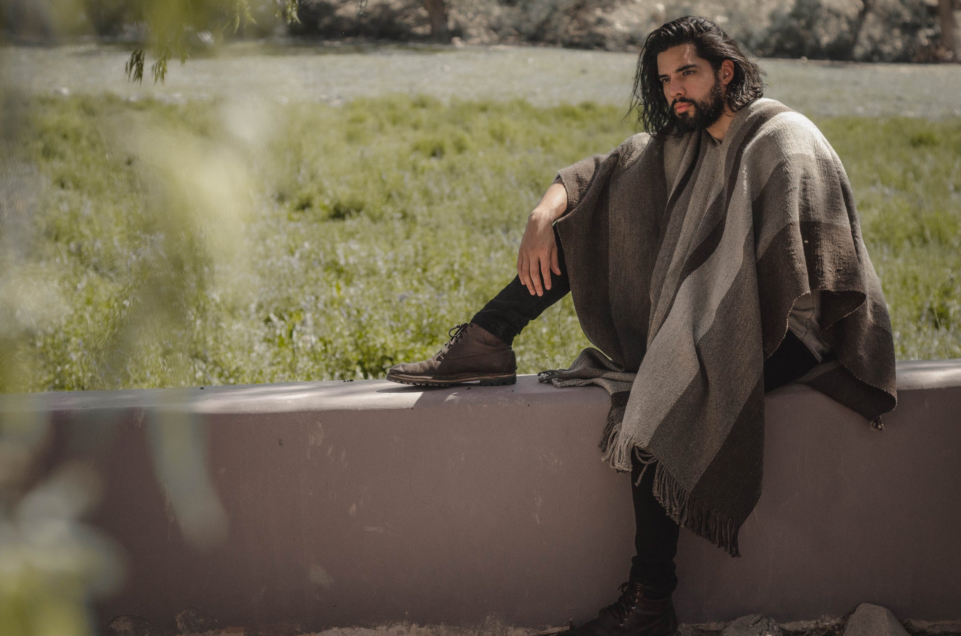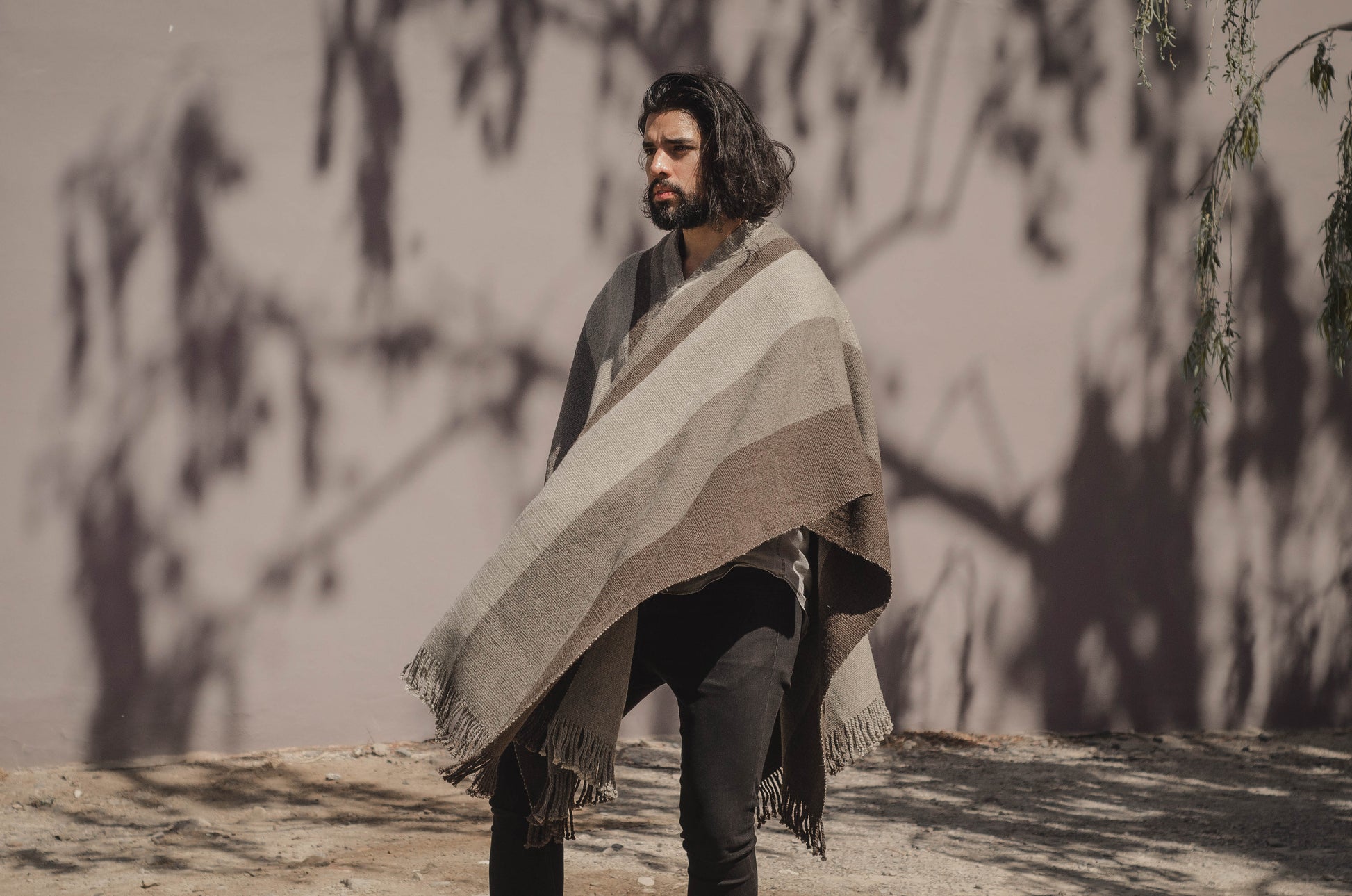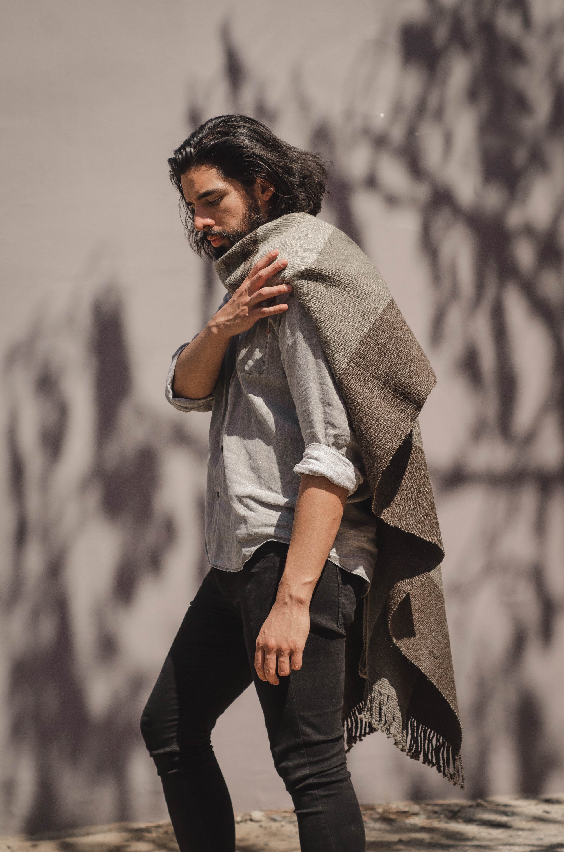 El poncho es una pieza única tejido artesanalmente en telar criollo, de alta densidad de trama cerrada y liviana en dos paños en tonos Grices