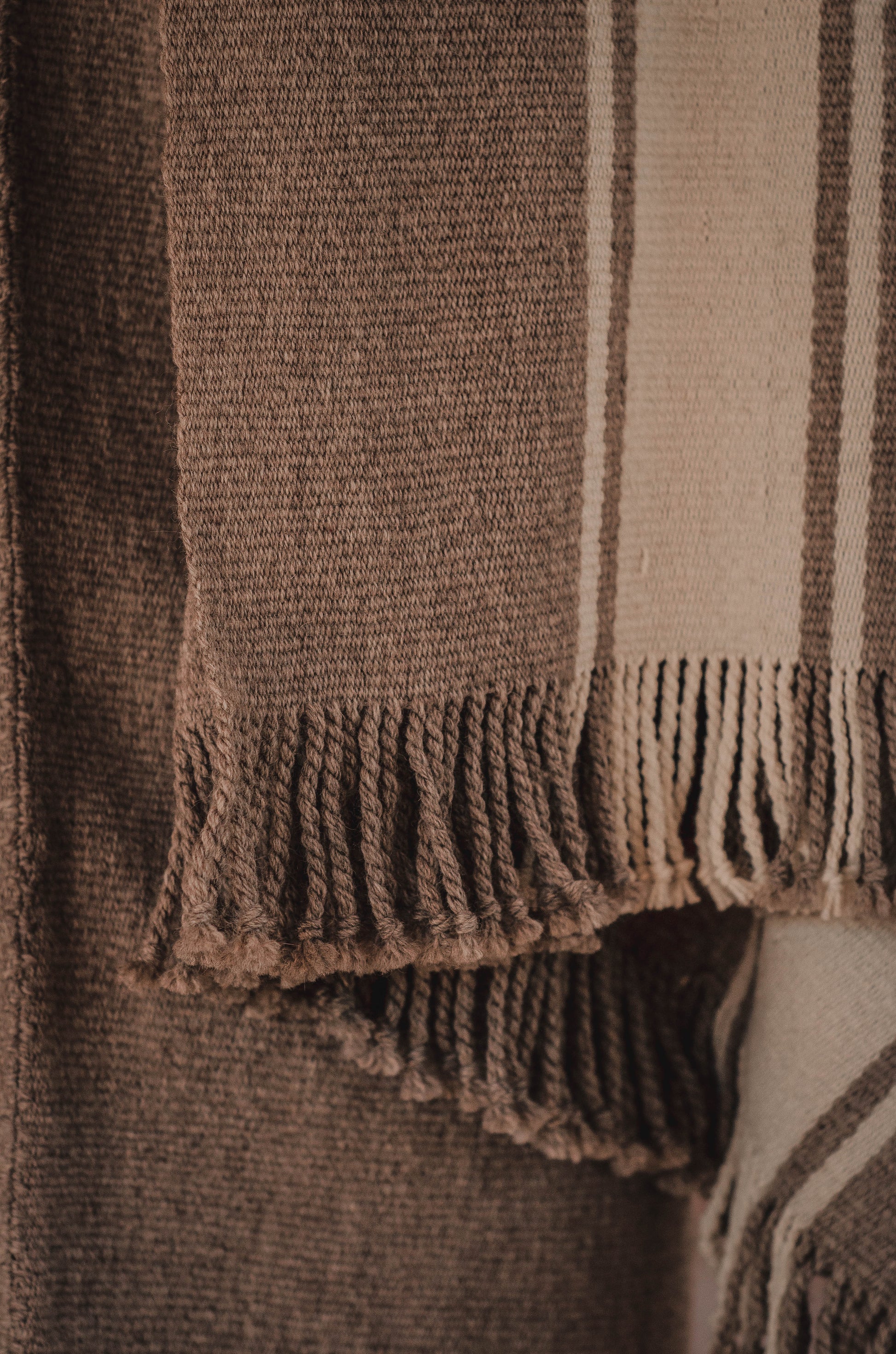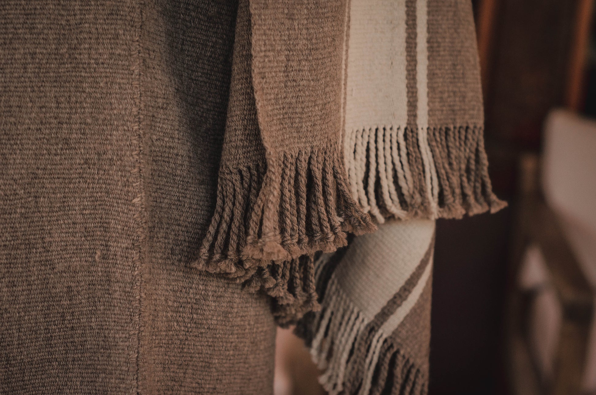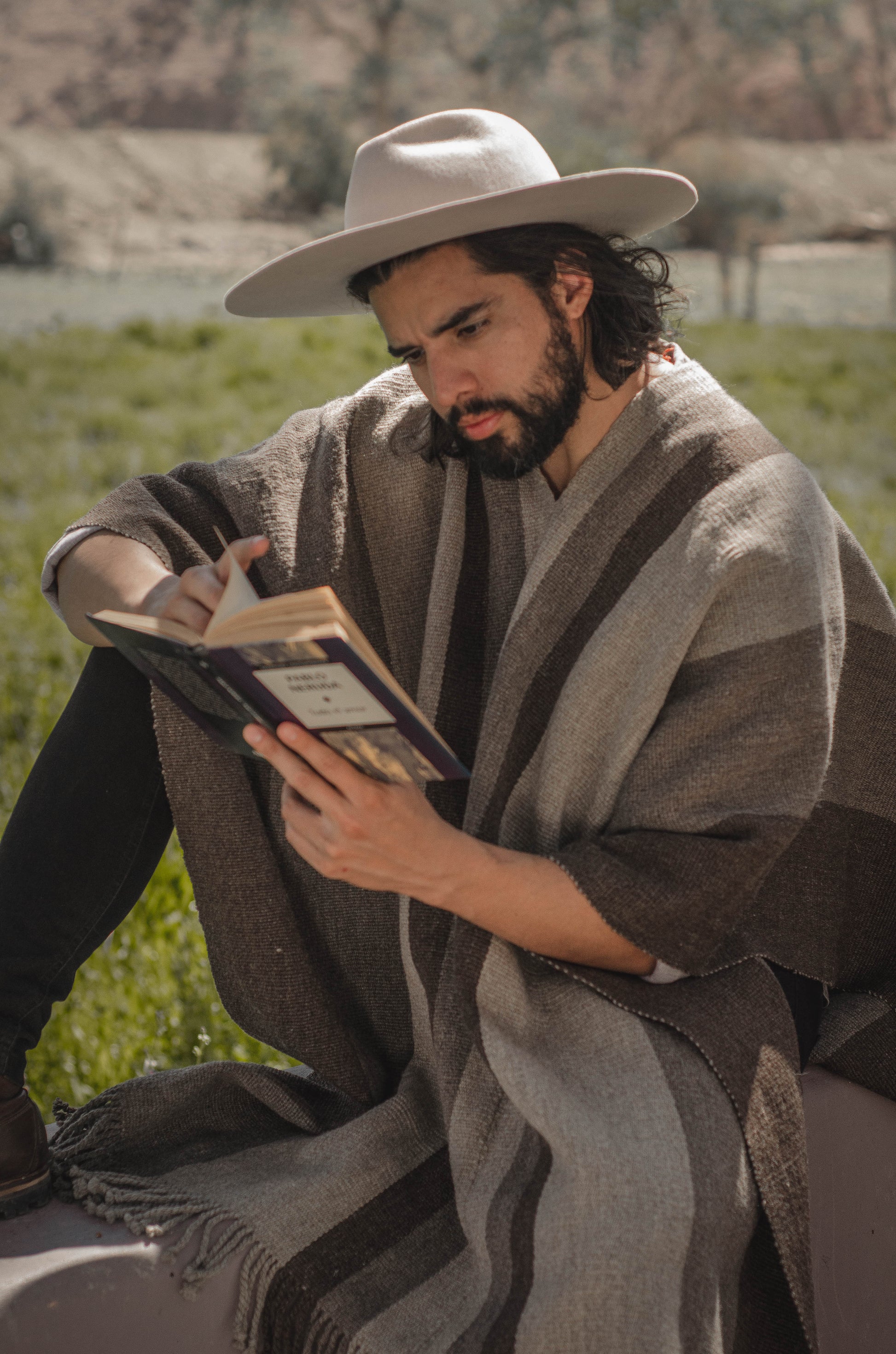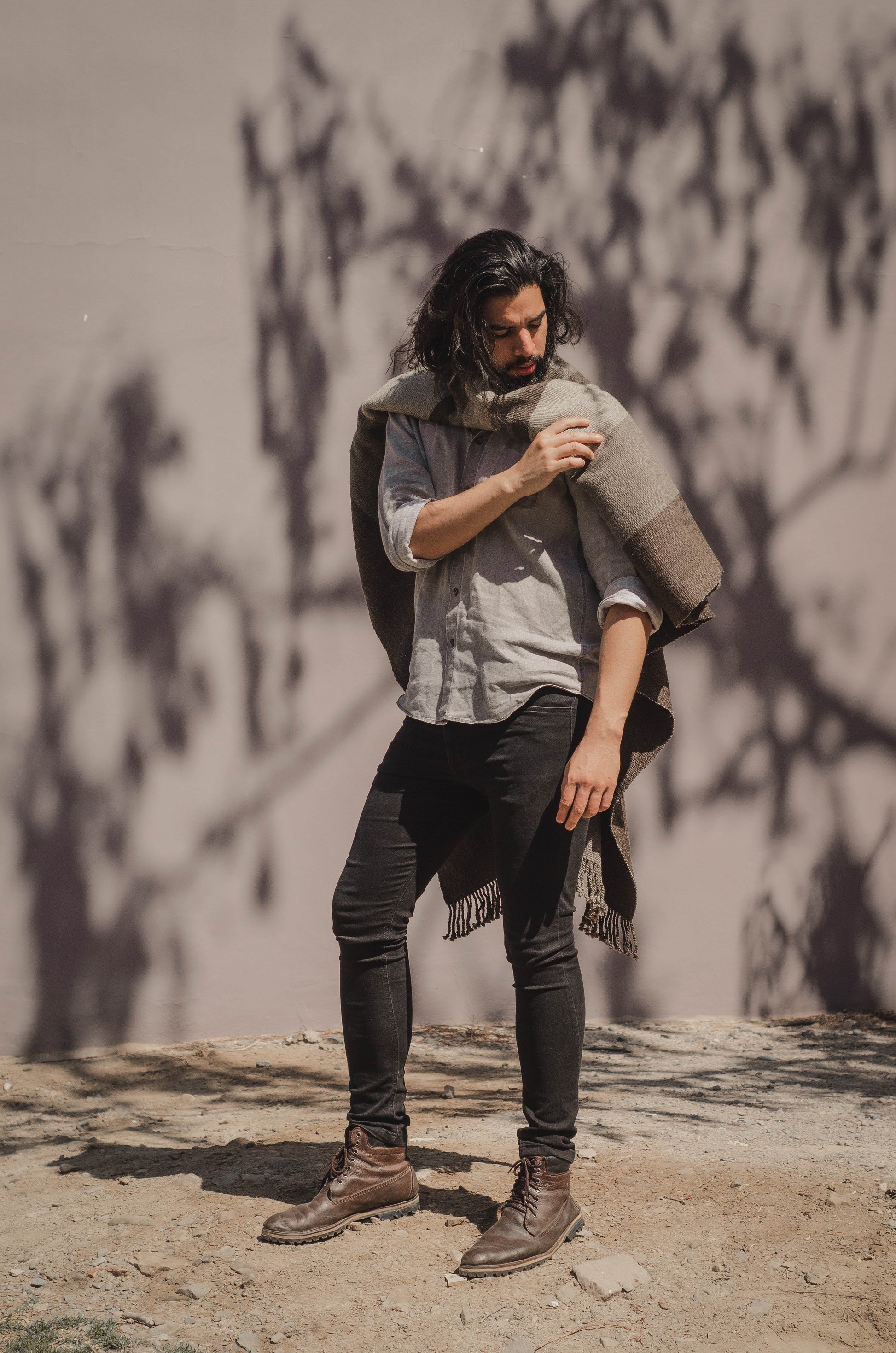 El poncho es una pieza única tejido artesanalmente en telar criollo, de alta densidad de trama cerrada y liviana en dos paños en tonos Grices