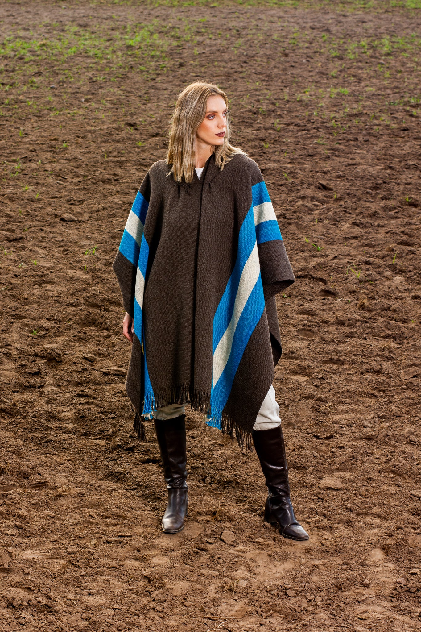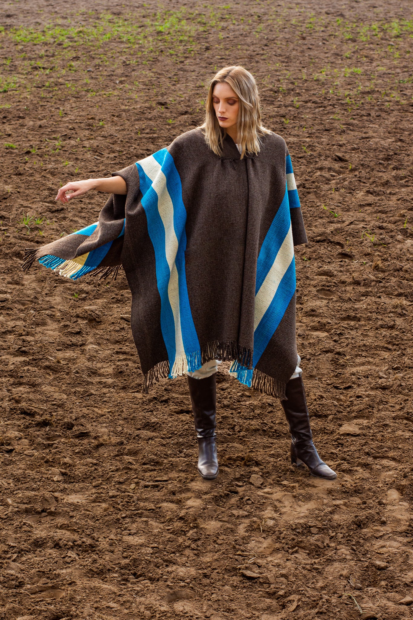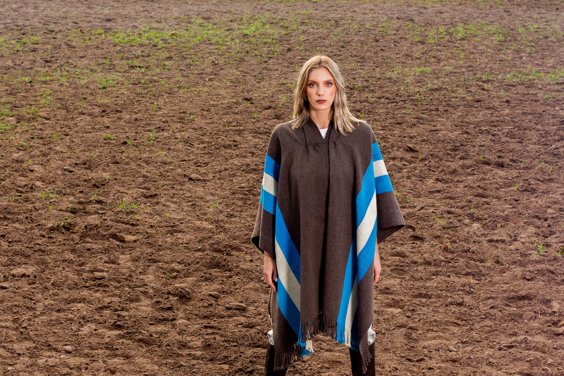 El poncho es una pieza única tejido artesanalmente en telar criollo, de alta densidad de trama cerrada y liviana en dos paños color Gris Noche natural