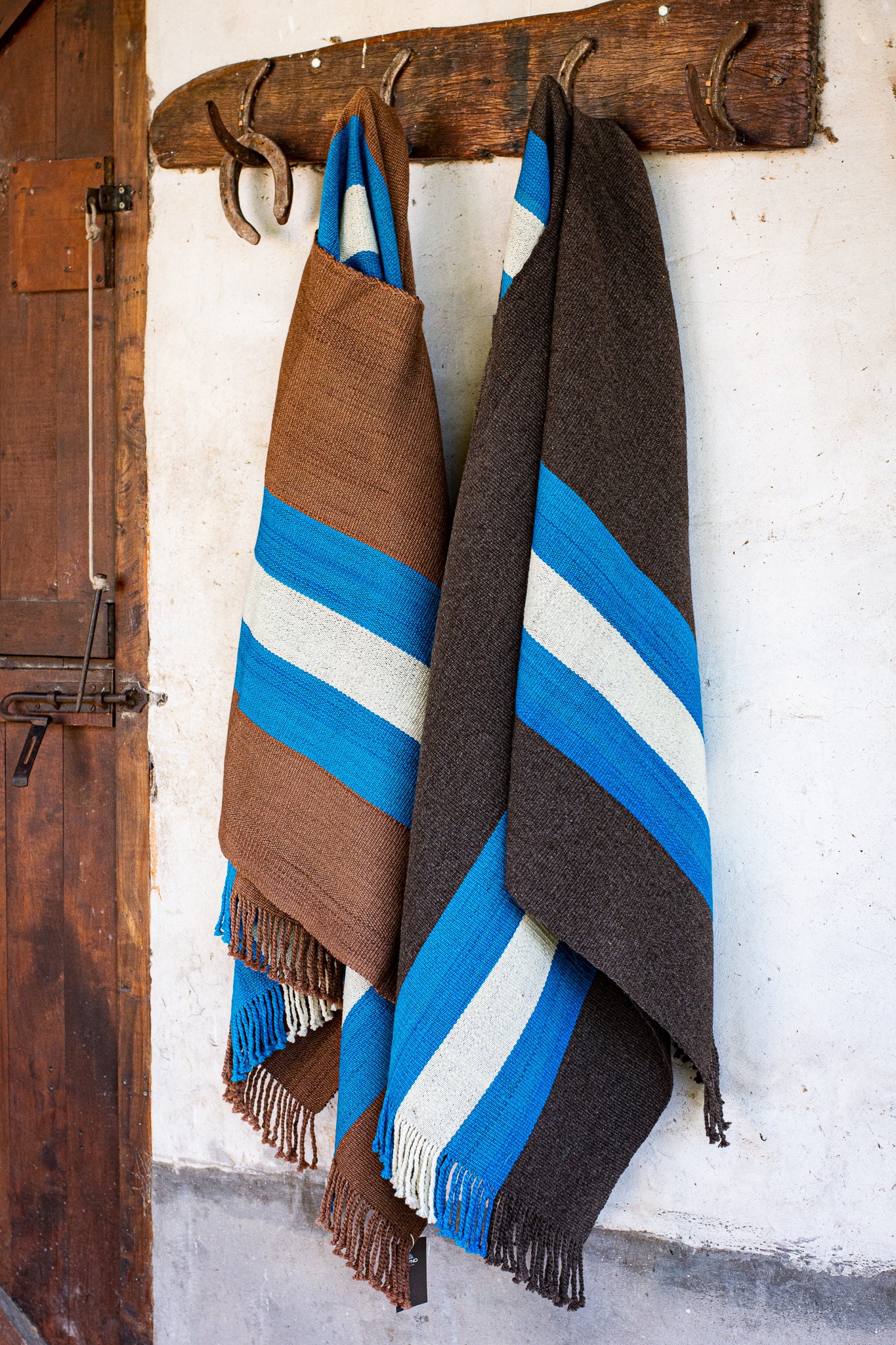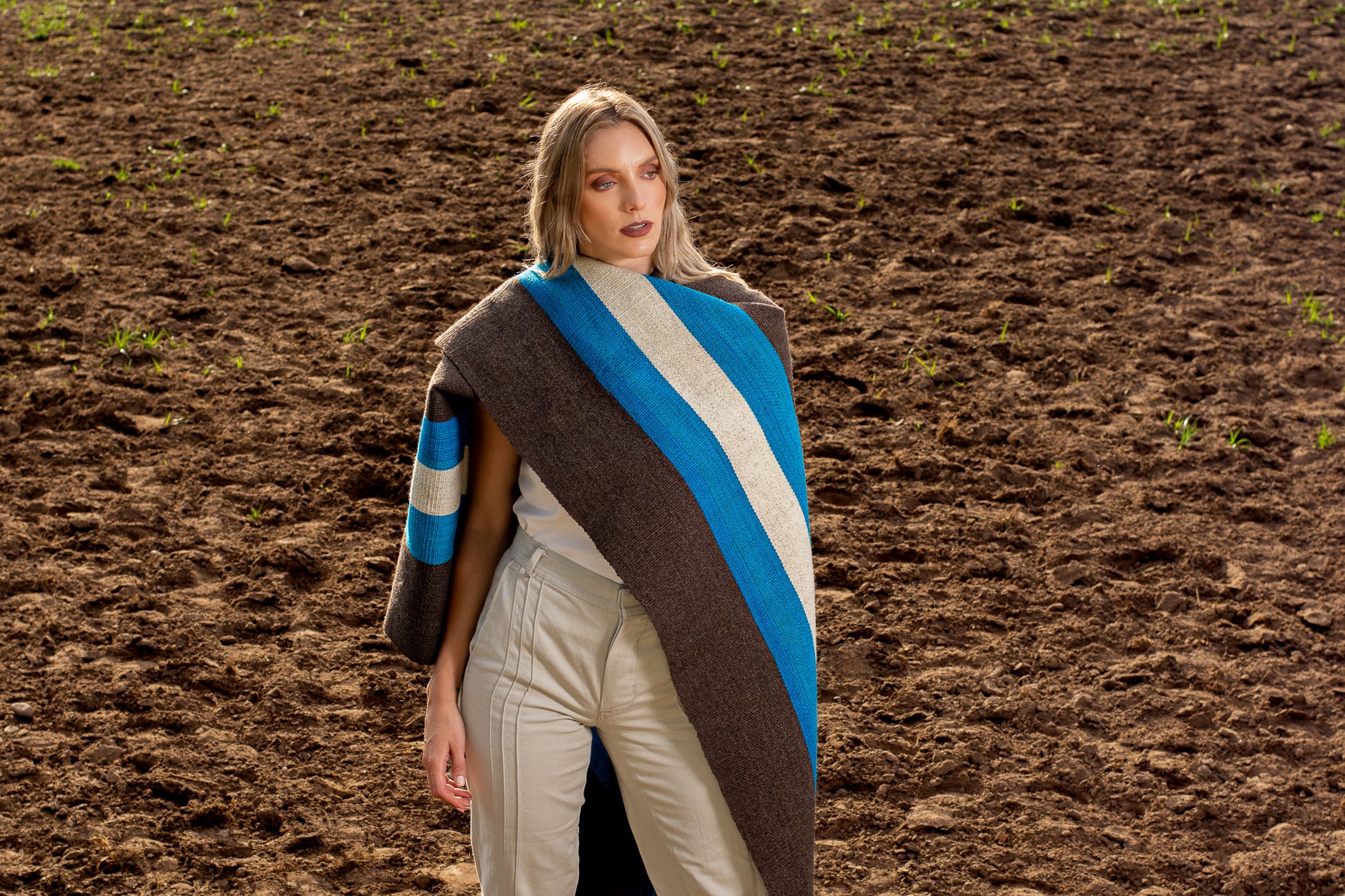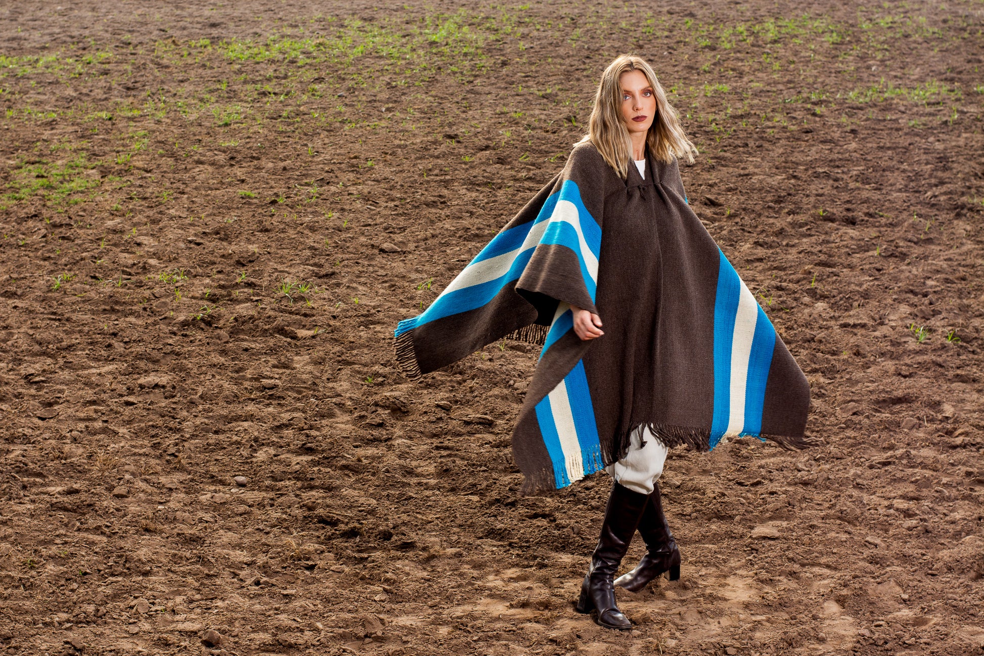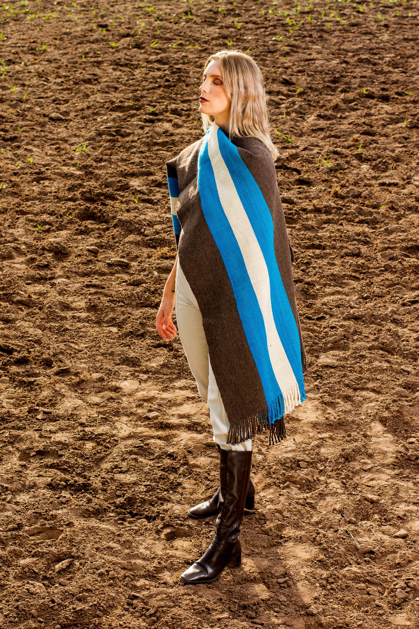 El poncho es una pieza única tejido artesanalmente en telar criollo, de alta densidad de trama cerrada y liviana en dos paños color Gris Noche natural