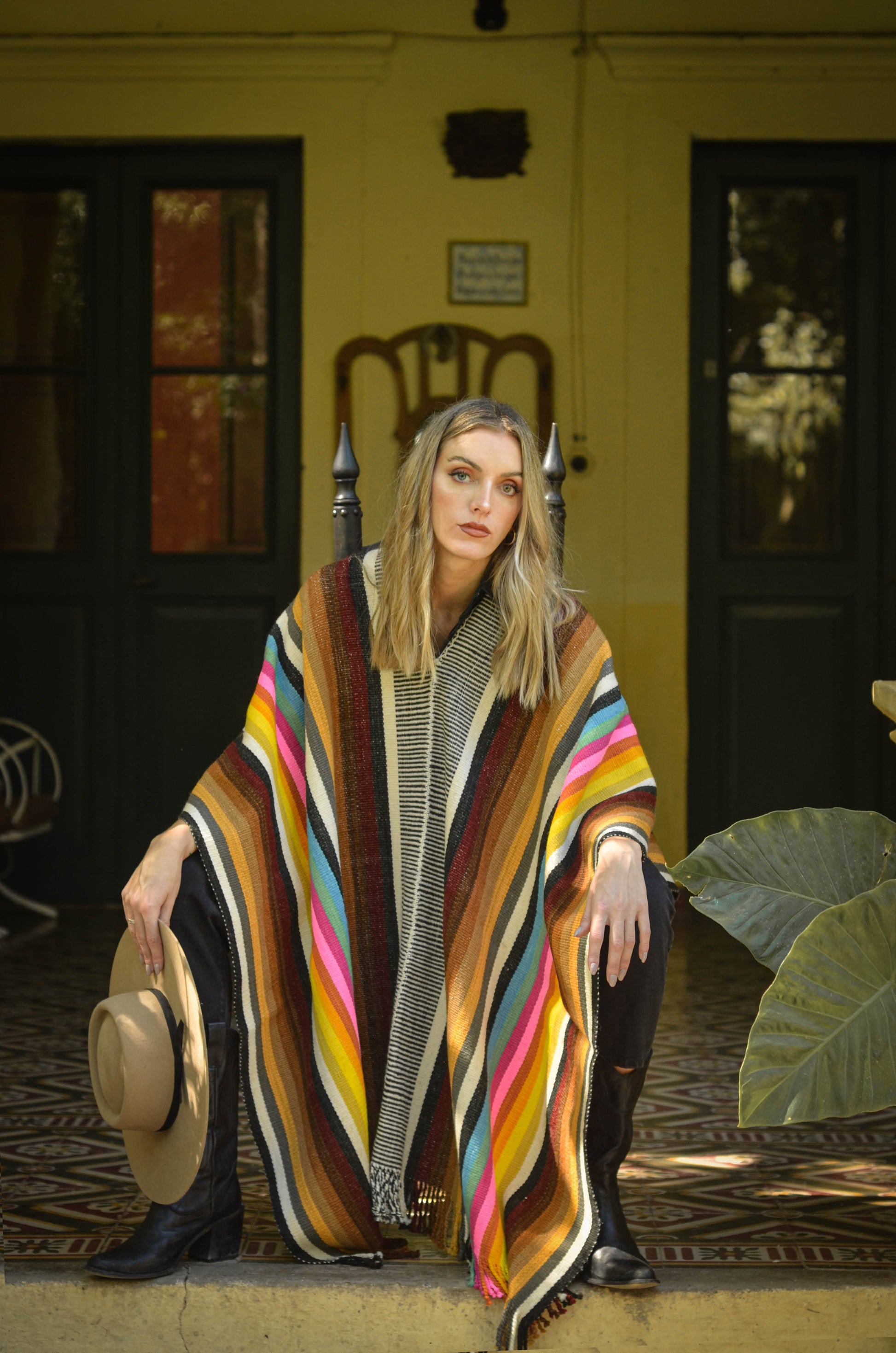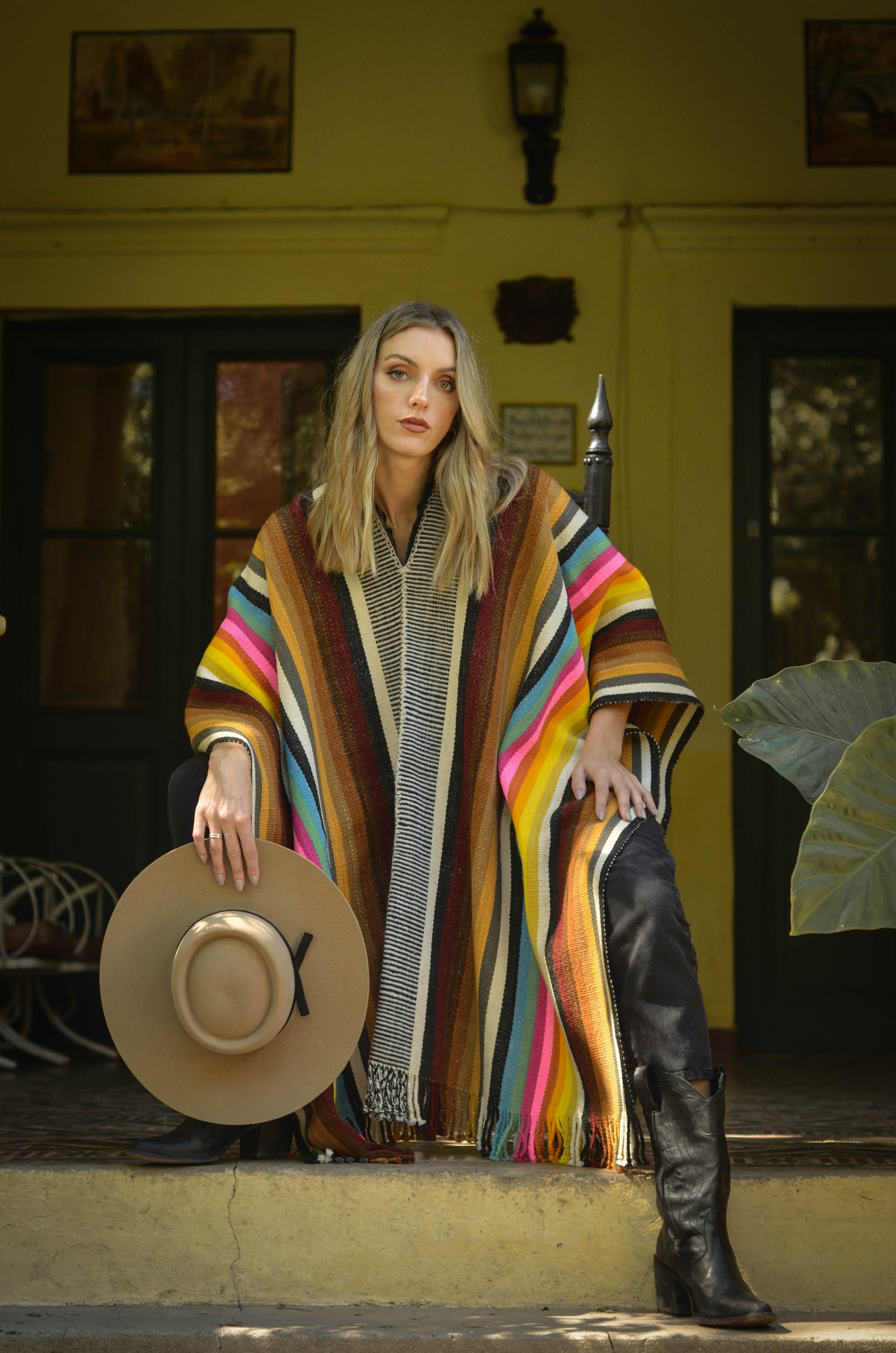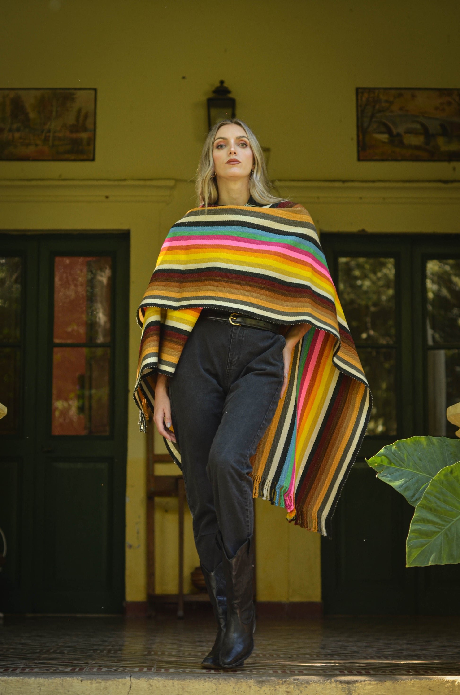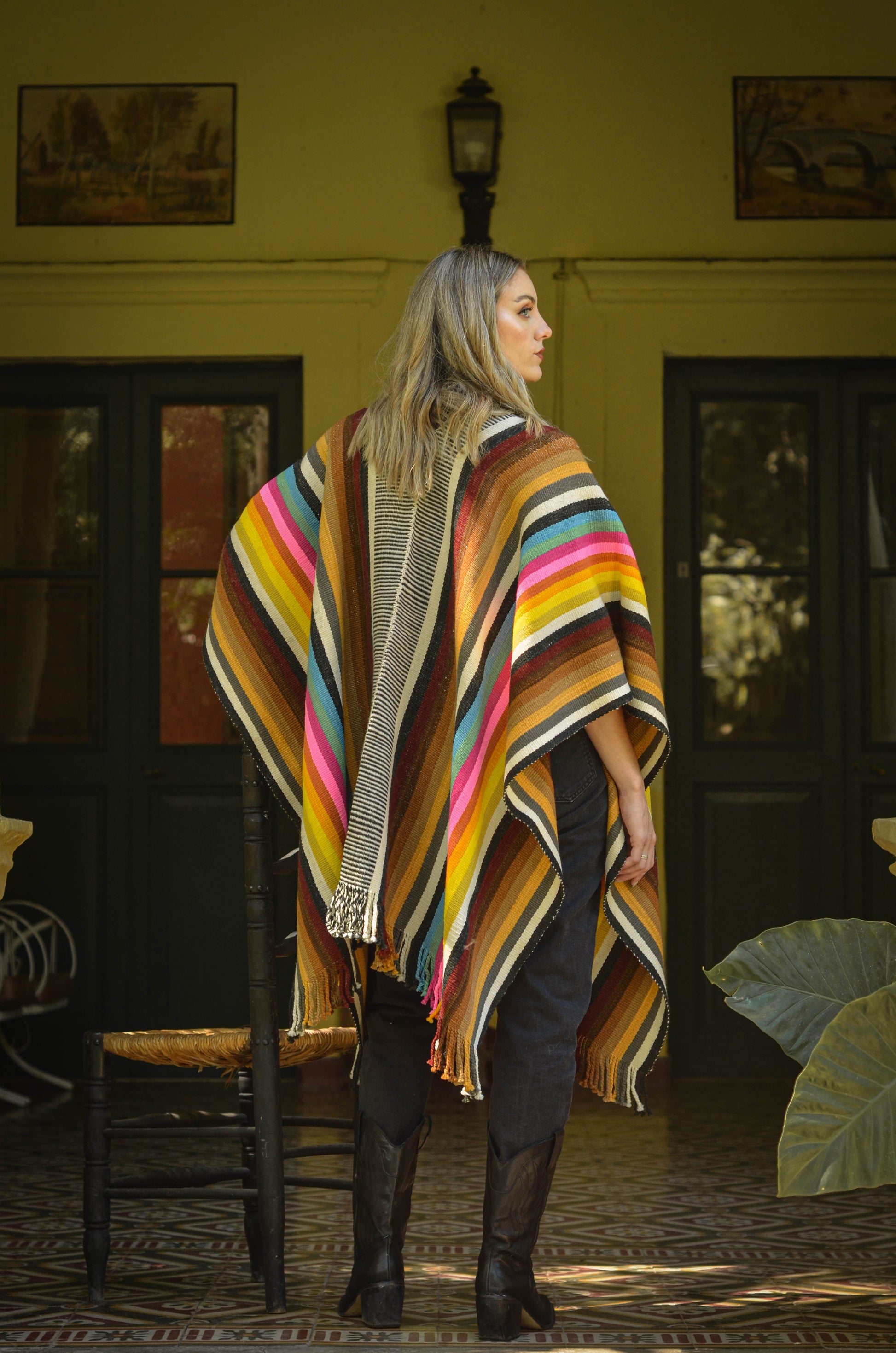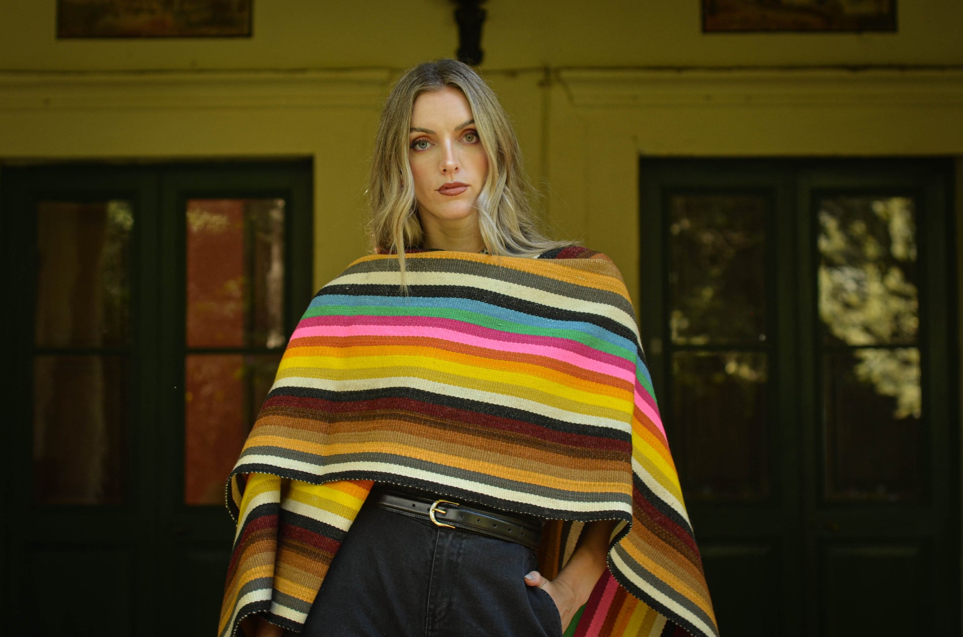 El poncho es una pieza única tejido artesanalmente en telar criollo, de alta densidad de trama cerrada y liviana en dos paños color Adobe natural