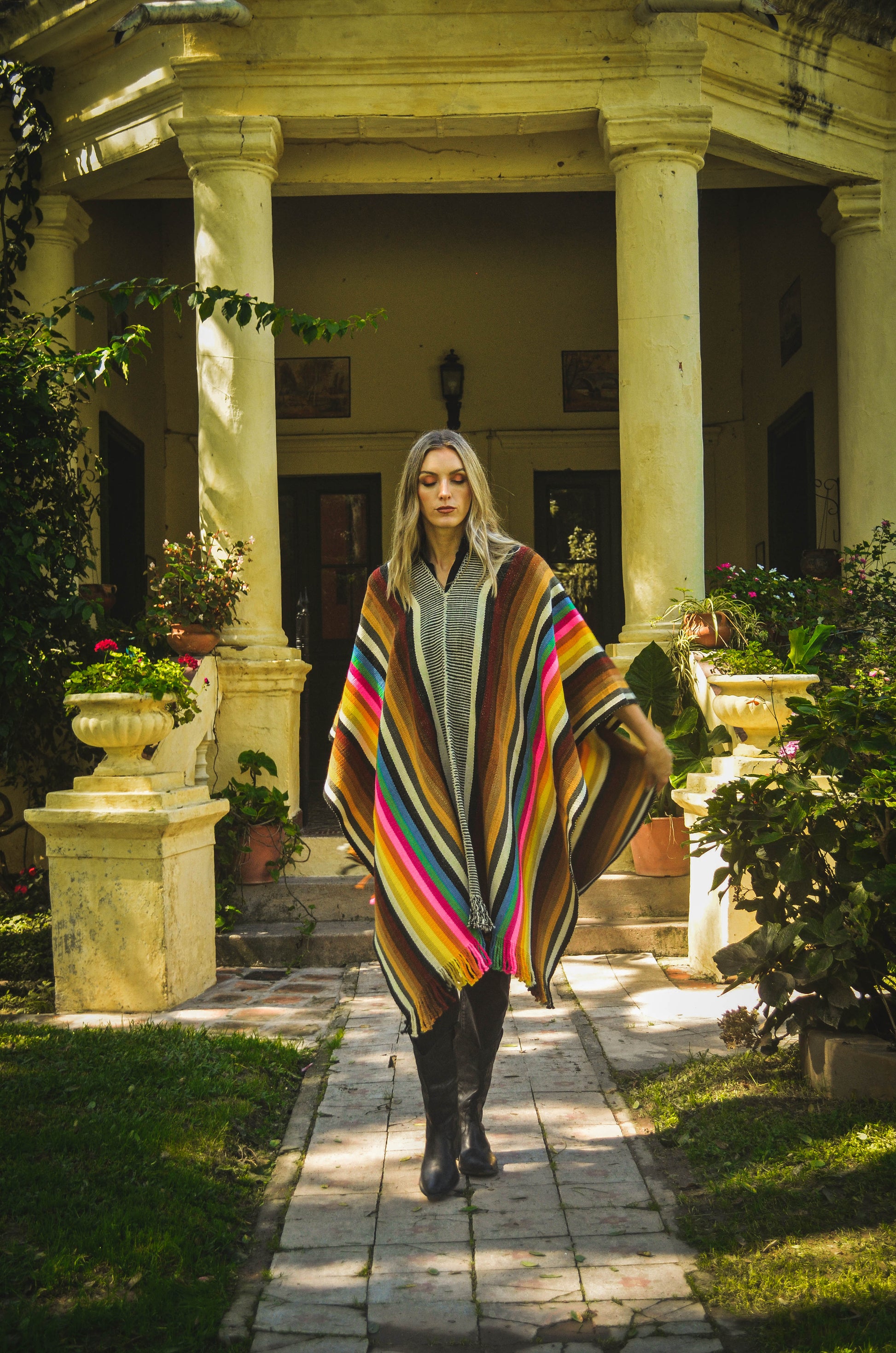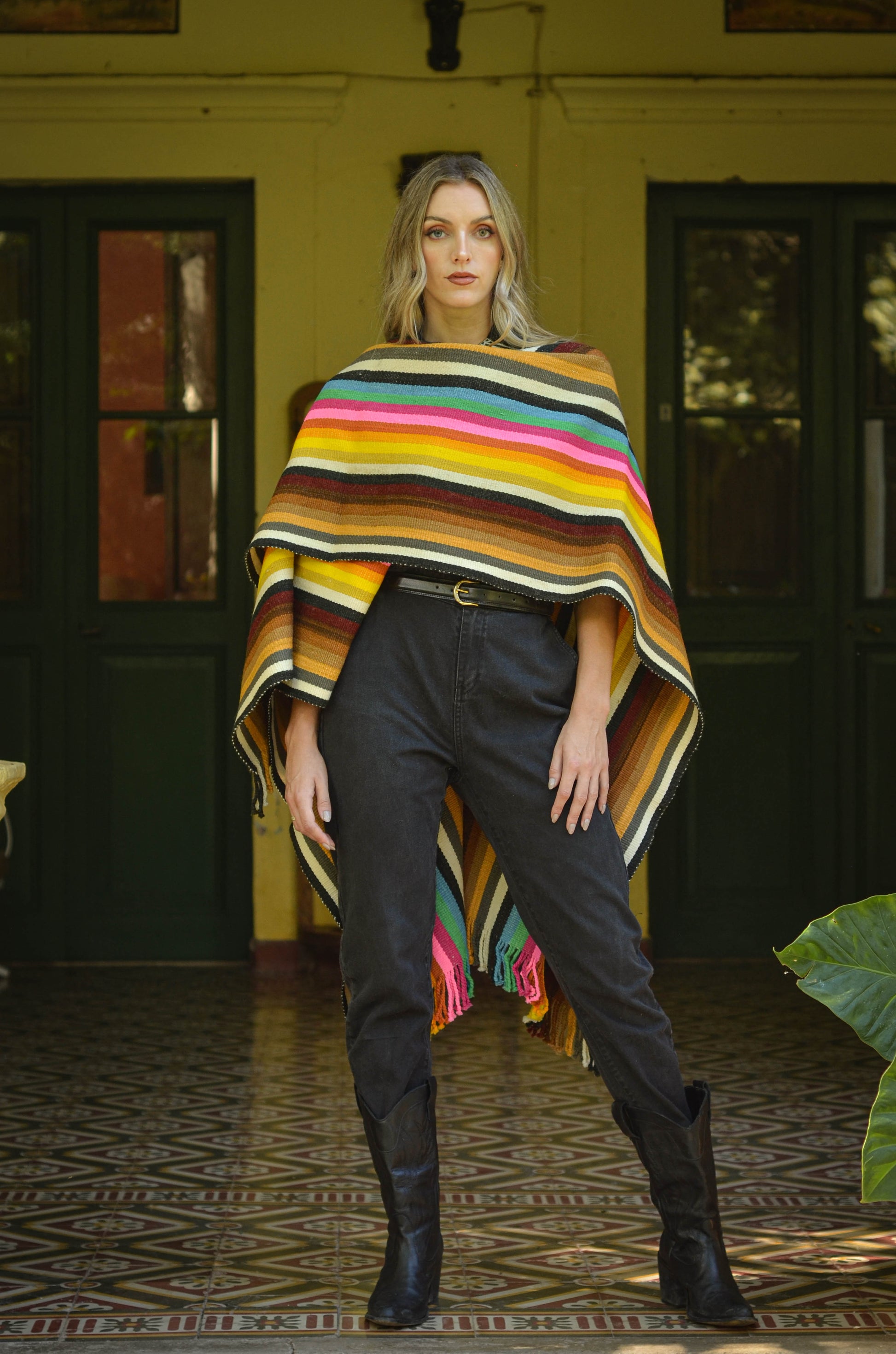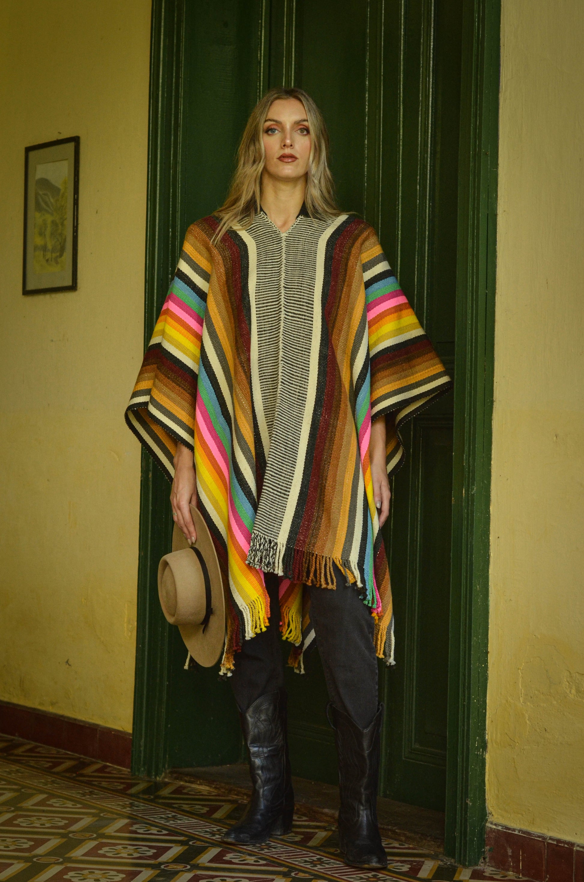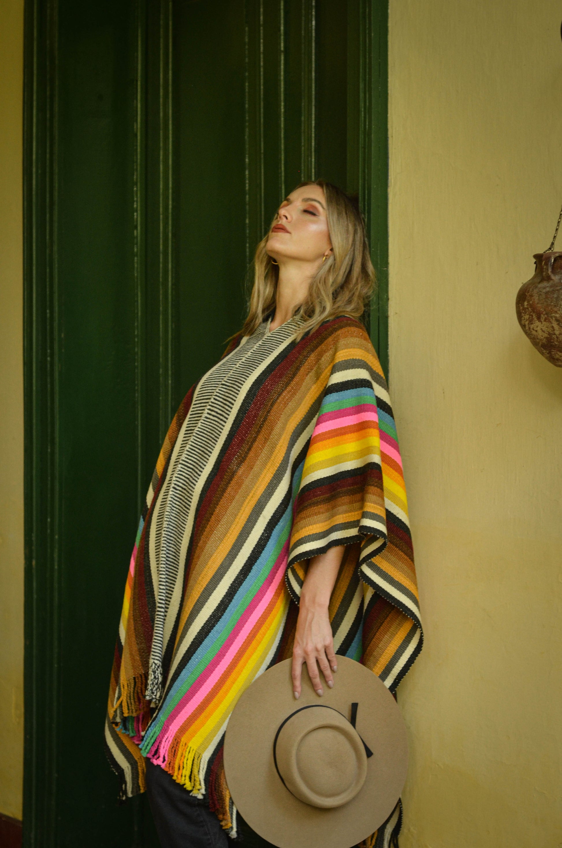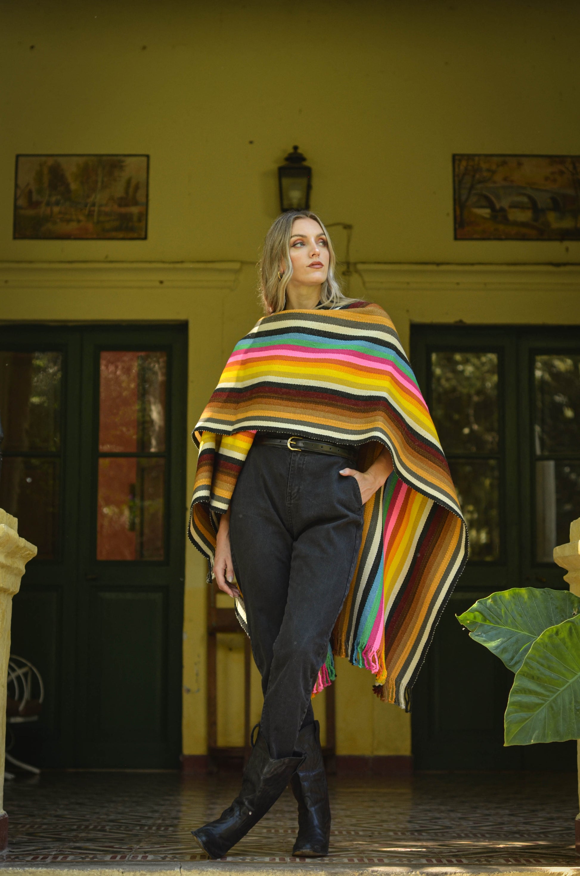 El poncho es una pieza única tejido artesanalmente en telar criollo, de alta densidad de trama cerrada y liviana en dos paños color Adobe natural