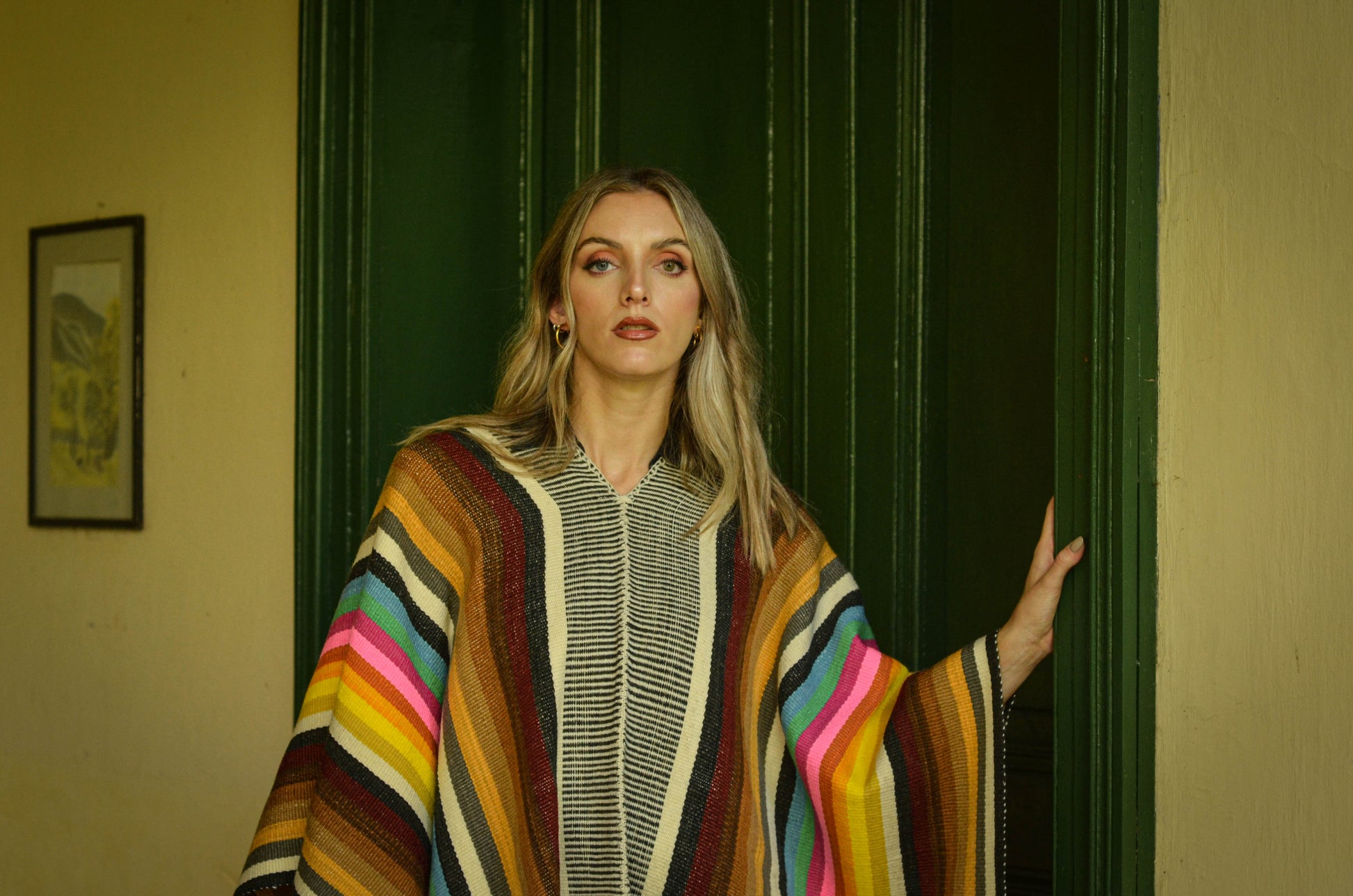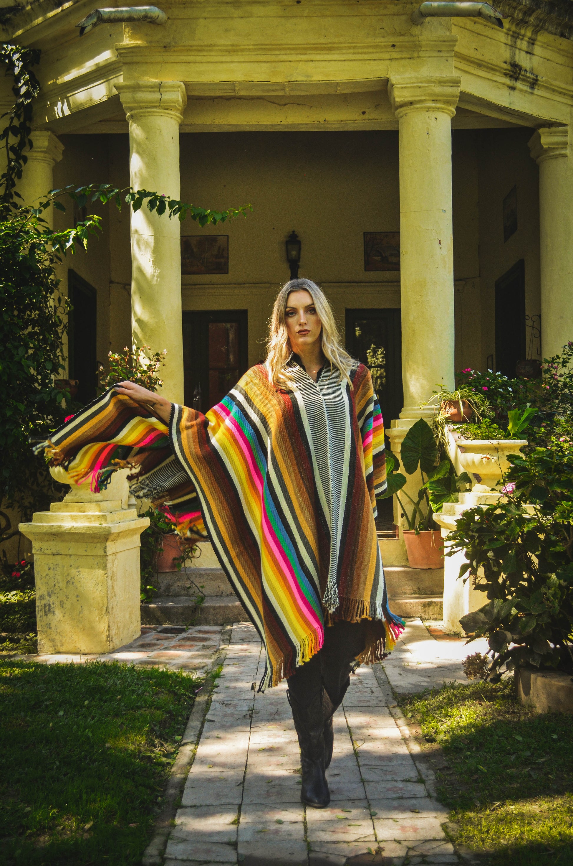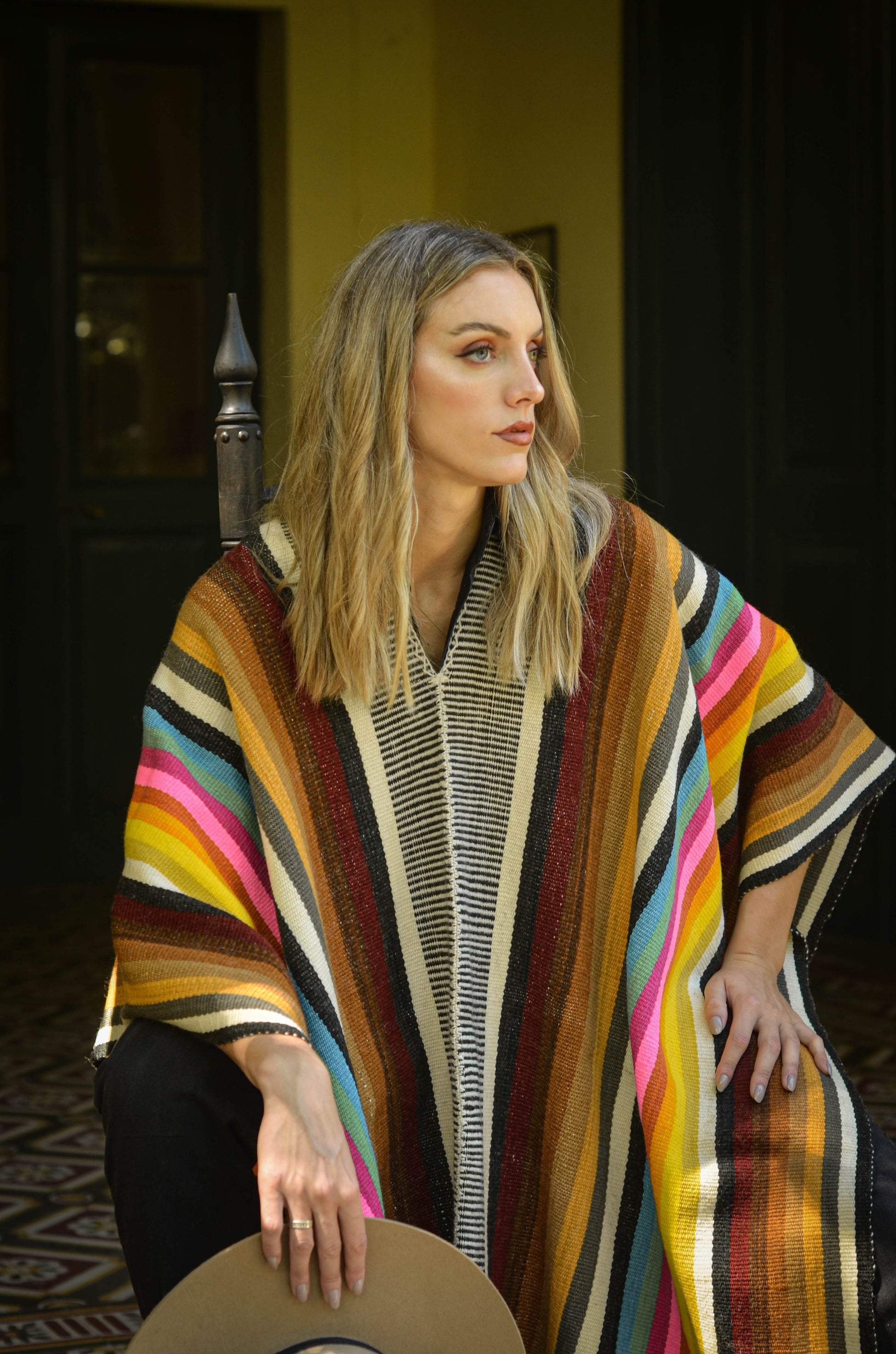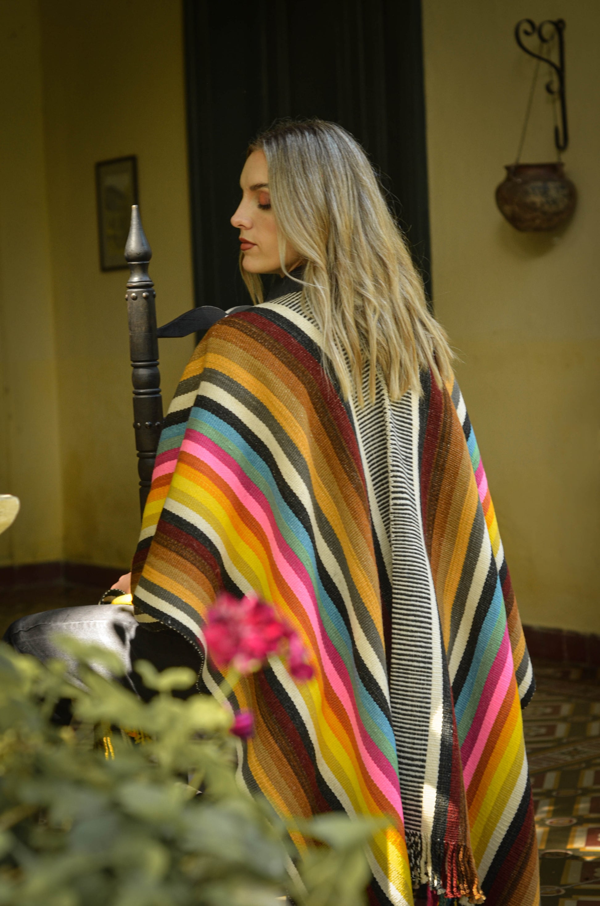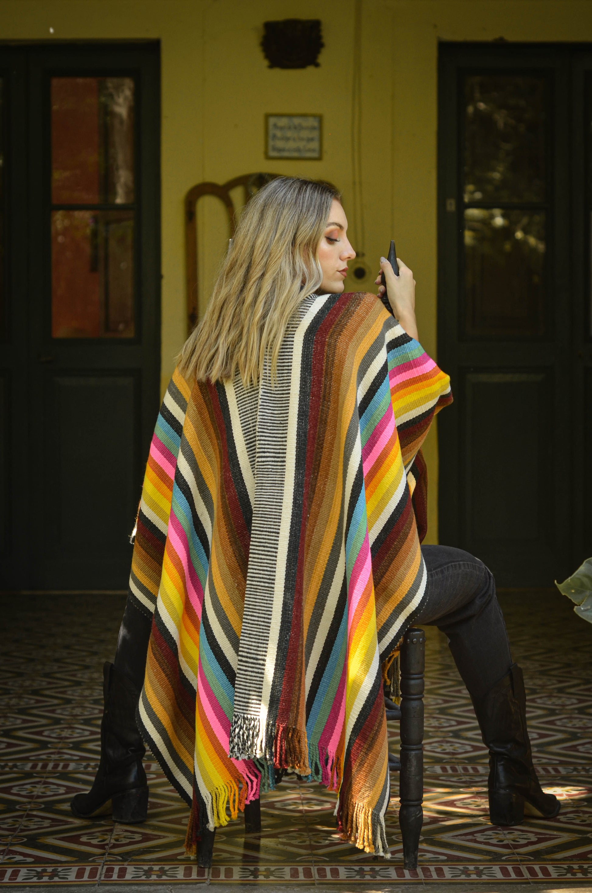 El poncho es una pieza única tejido artesanalmente en telar criollo, de alta densidad de trama cerrada y liviana en dos paños color Adobe natural