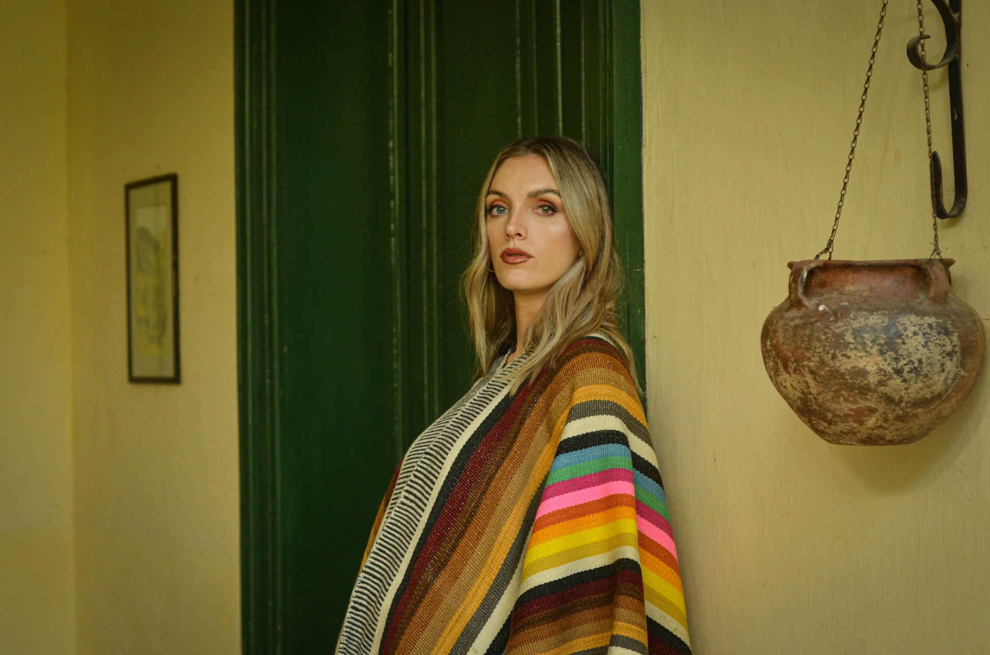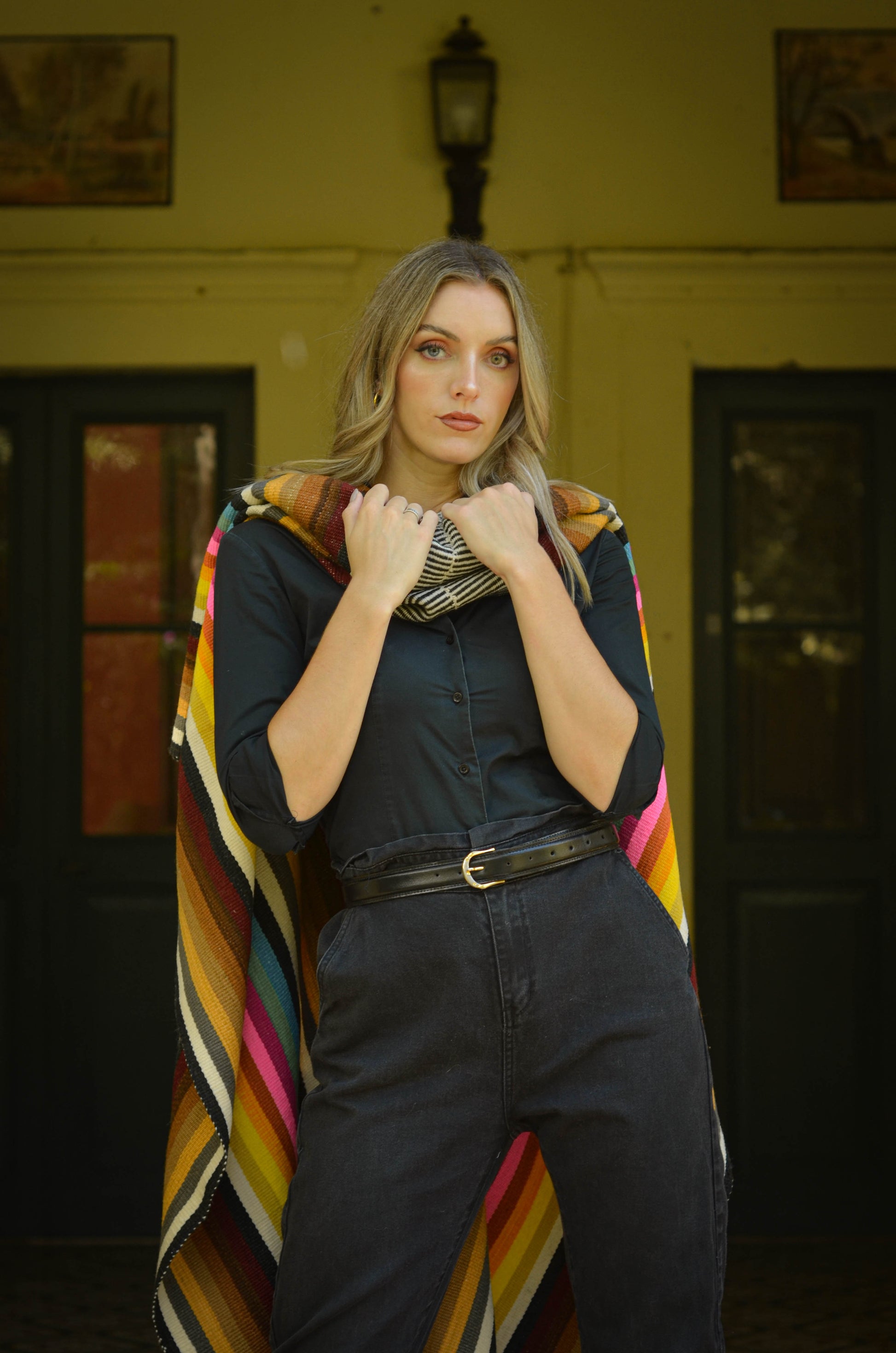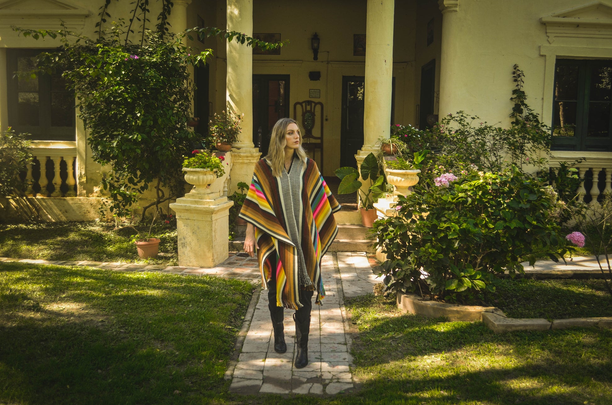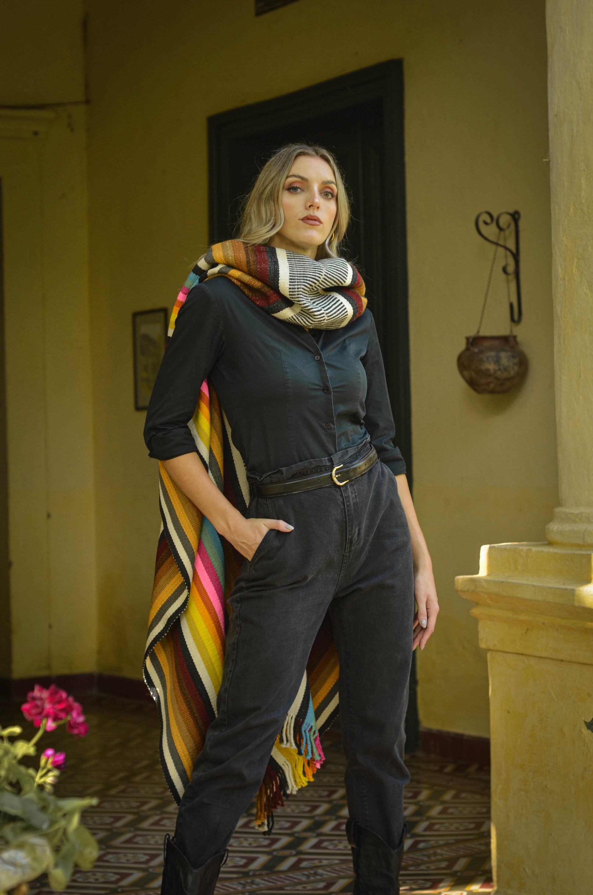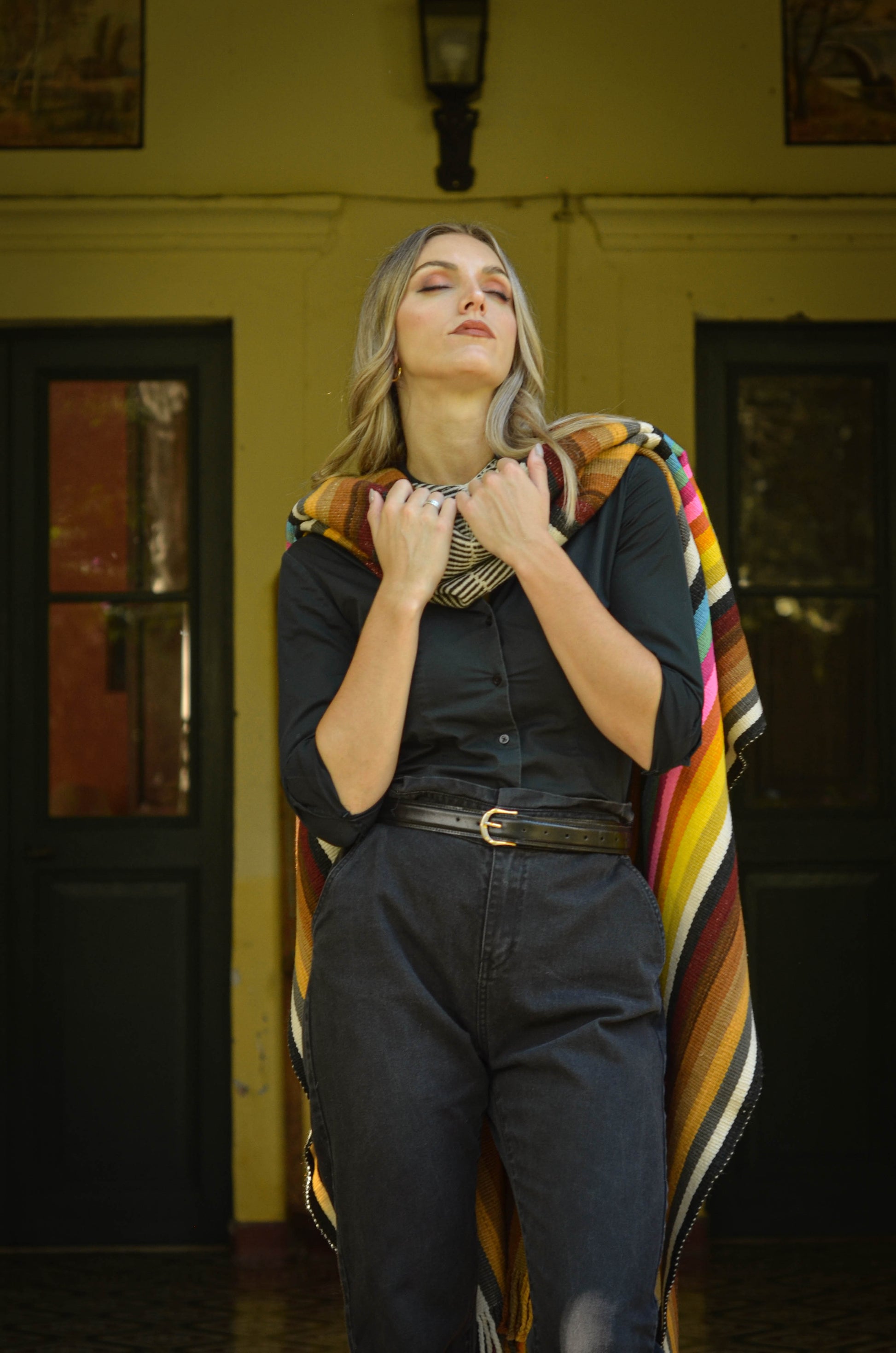 El poncho es una pieza única tejido artesanalmente en telar criollo, de alta densidad de trama cerrada y liviana en dos paños color Adobe natural