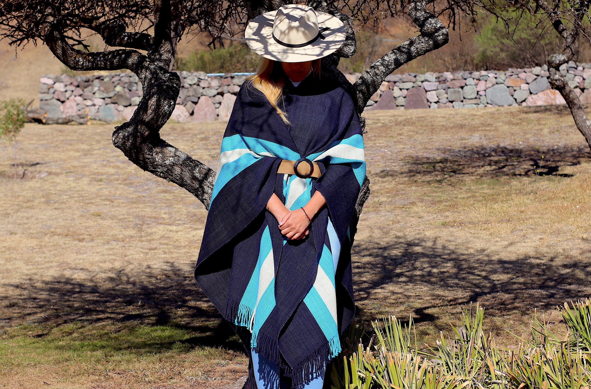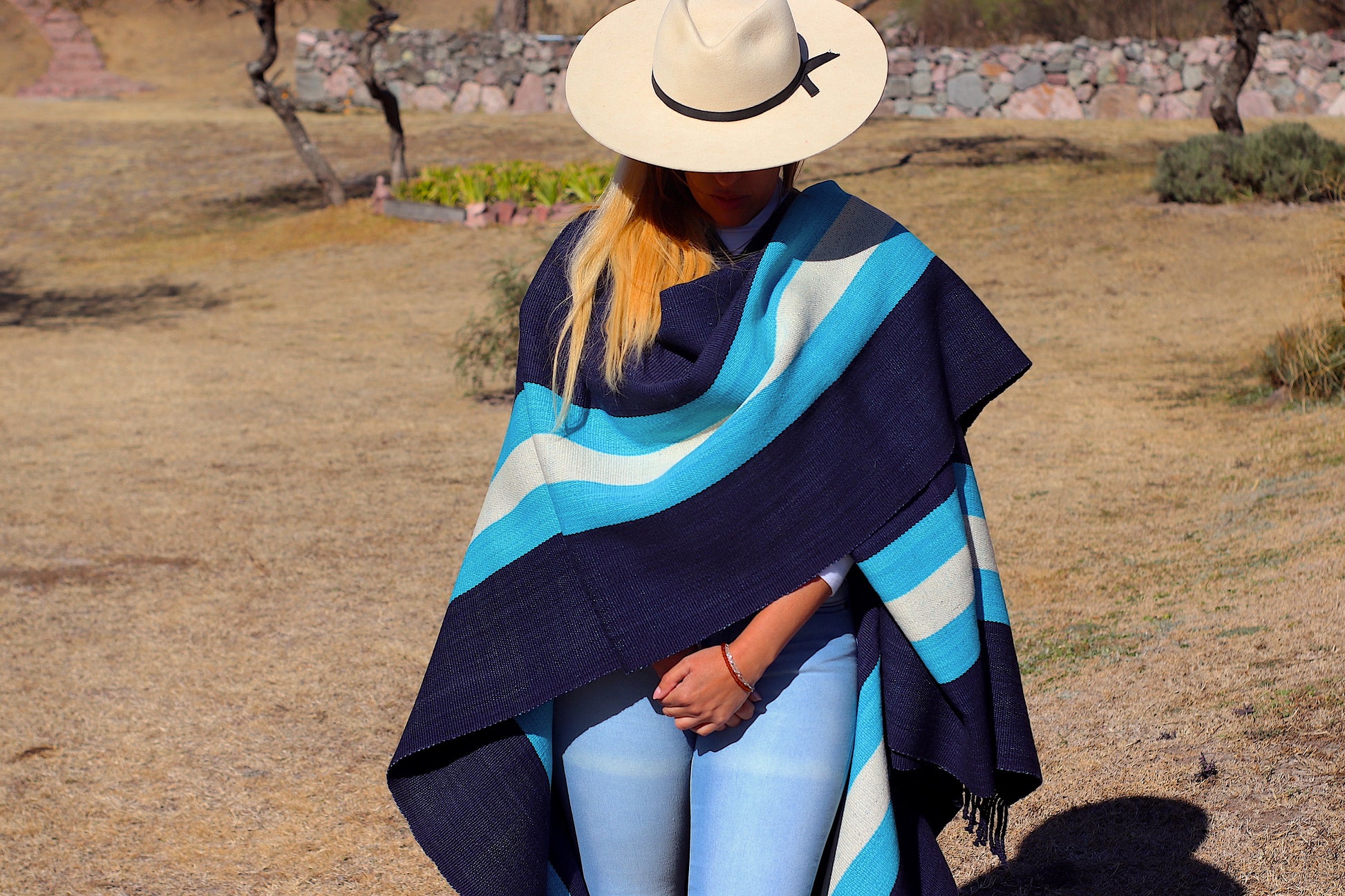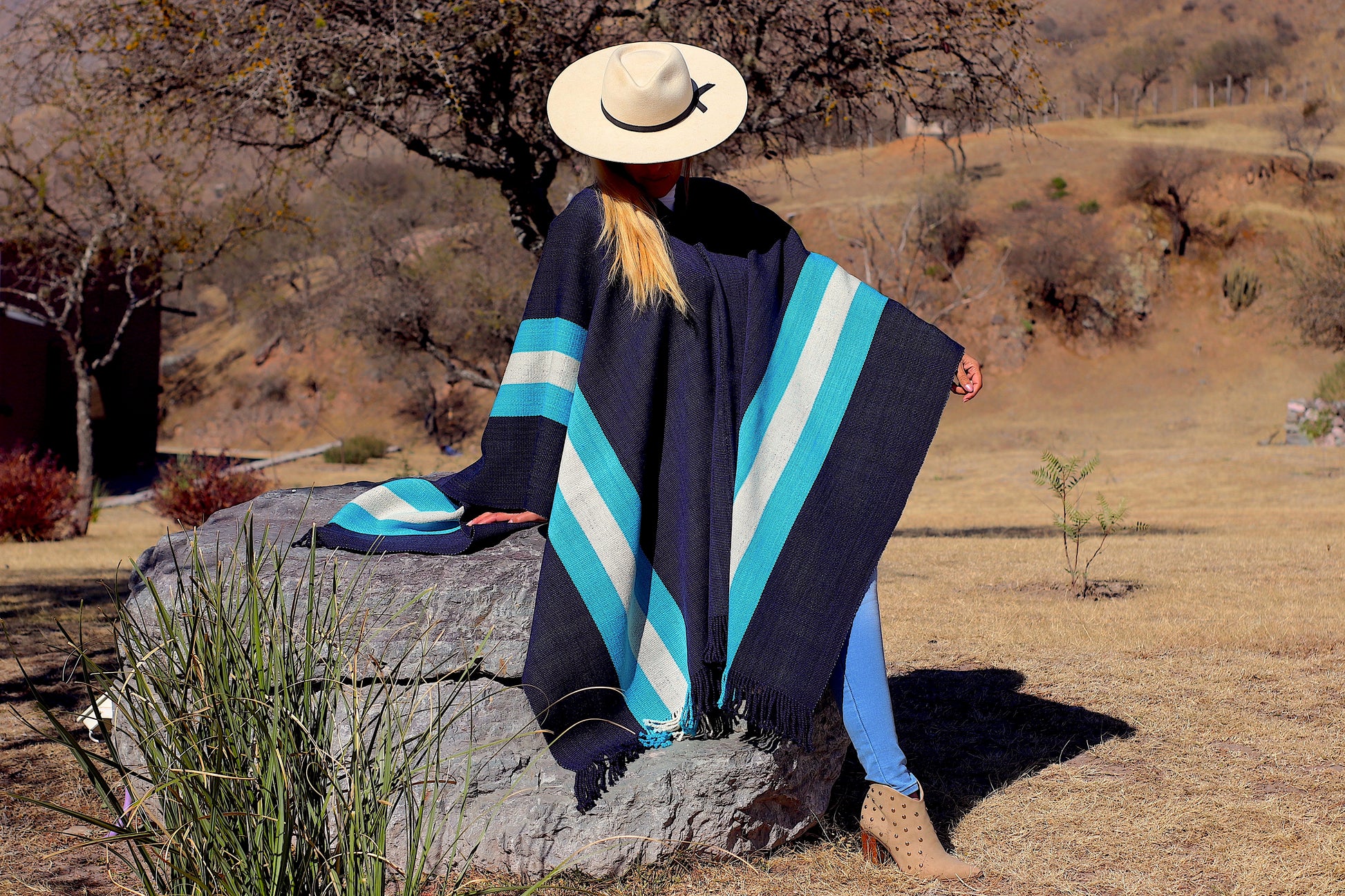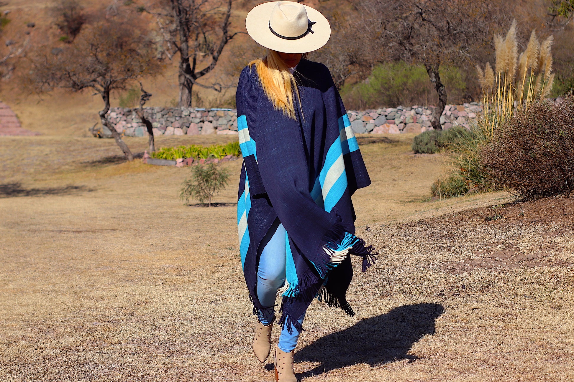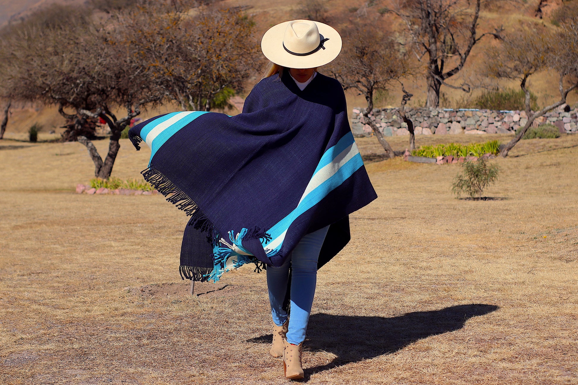 El poncho es una pieza única tejido artesanalmente en telar criollo, de alta densidad de trama cerrada y liviana en dos paños color Azul Almirante