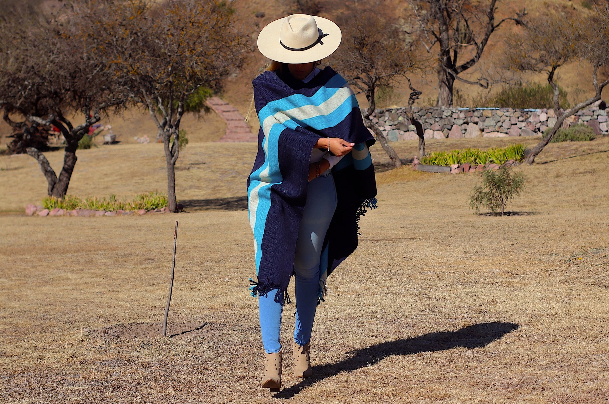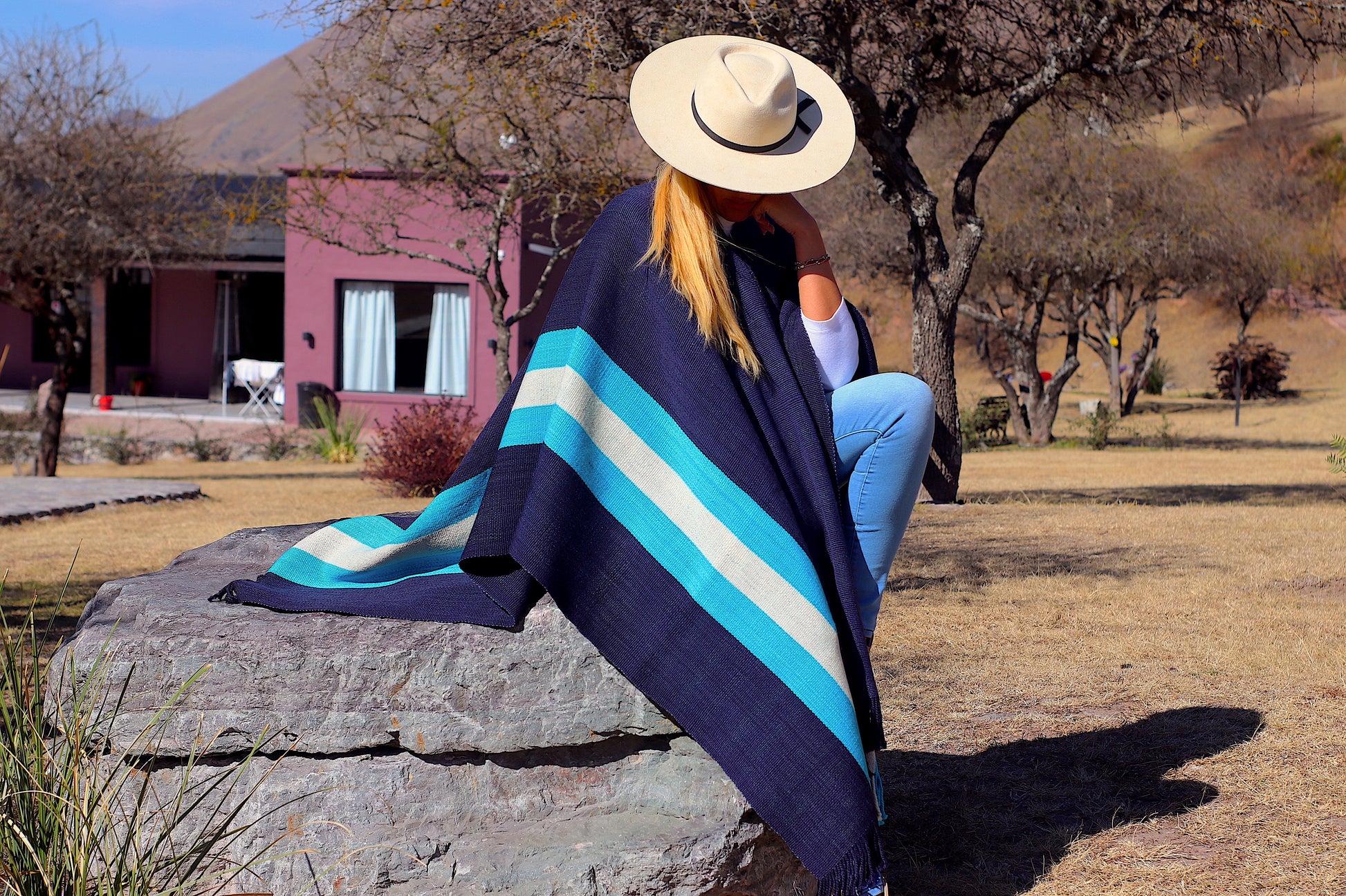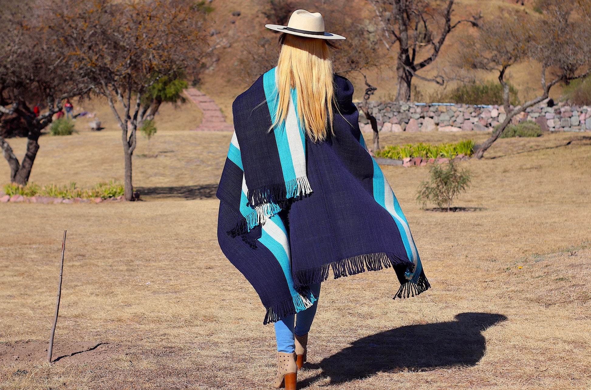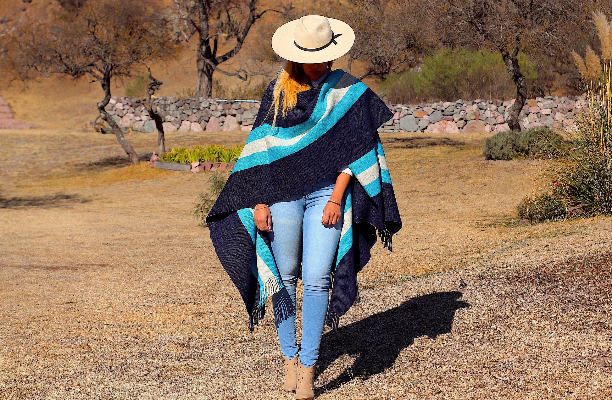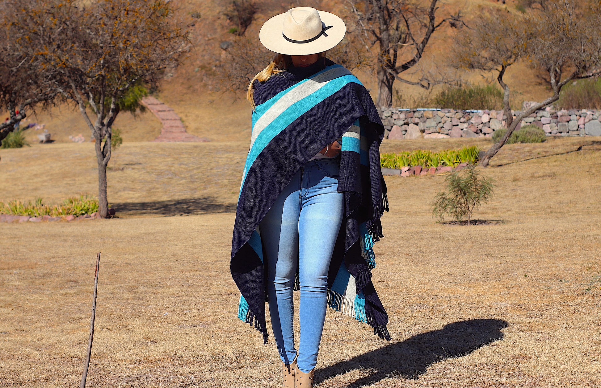El poncho es una pieza única tejido artesanalmente en telar criollo, de alta densidad de trama cerrada y liviana en dos paños color Azul Almirante