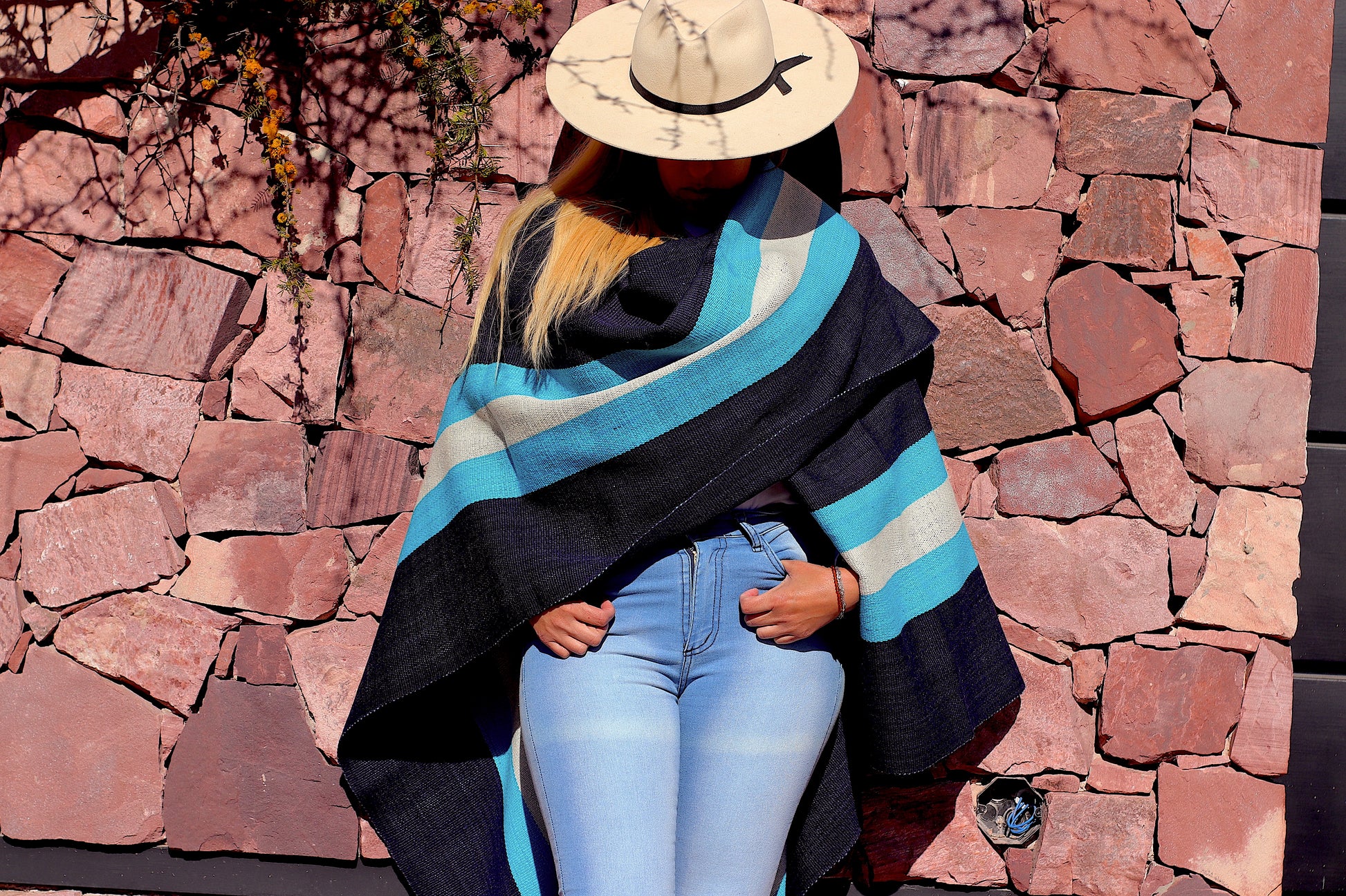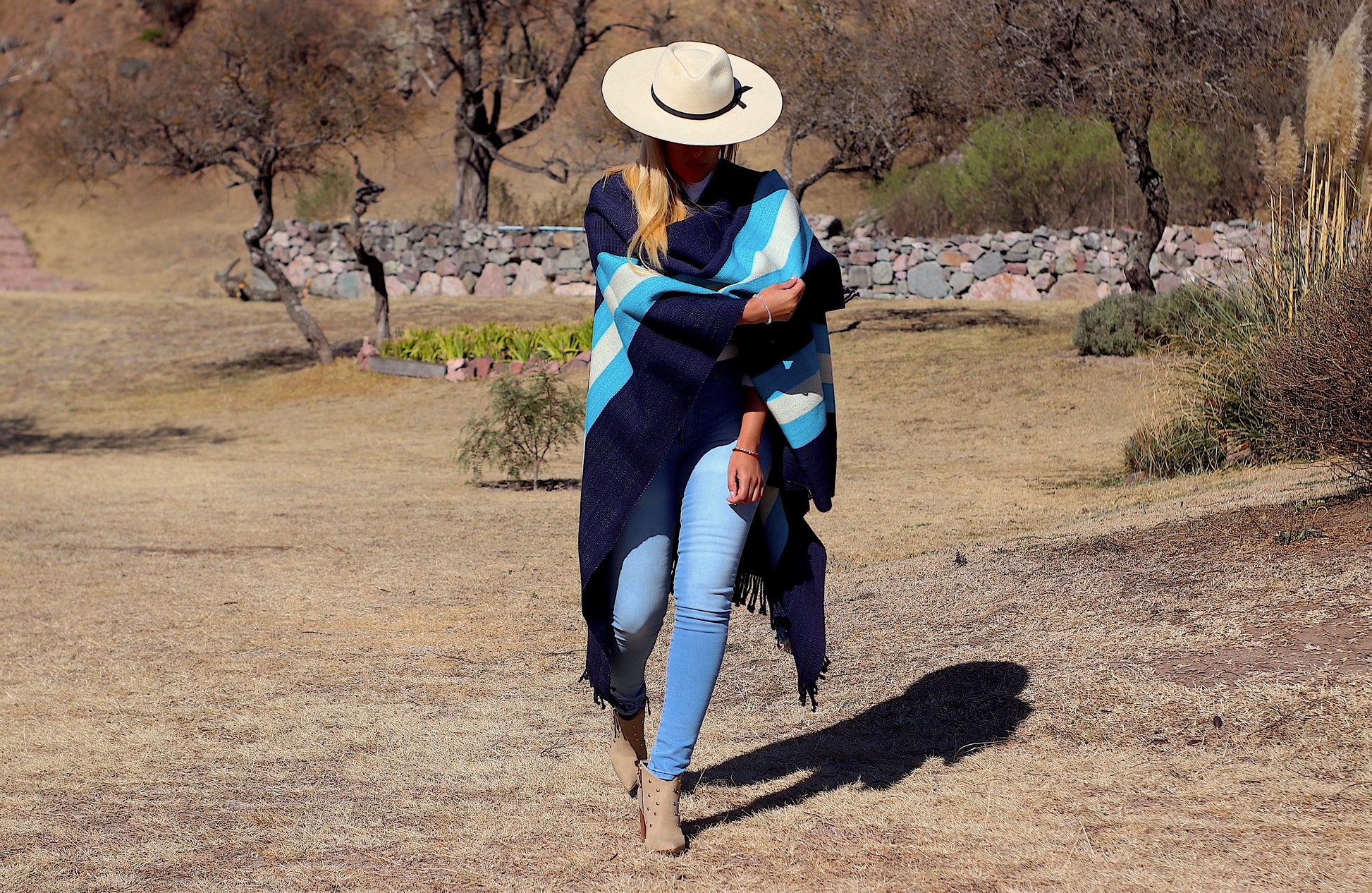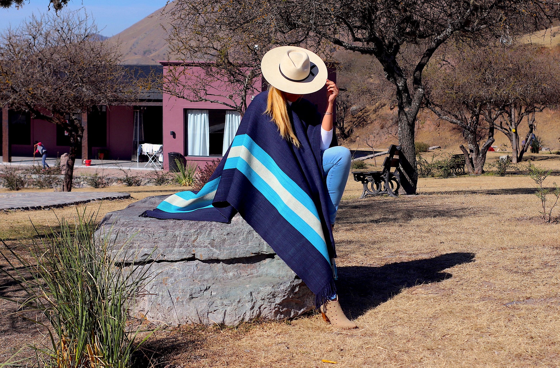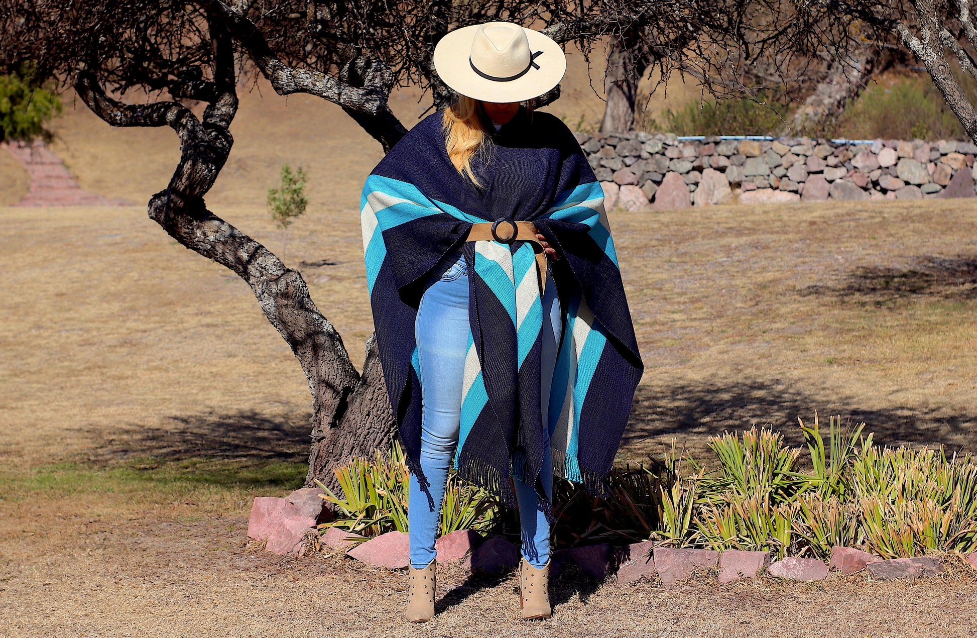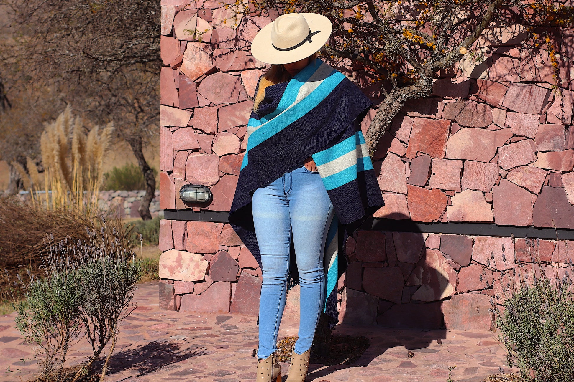 El poncho es una pieza única tejido artesanalmente en telar criollo, de alta densidad de trama cerrada y liviana en dos paños color Azul Almirante