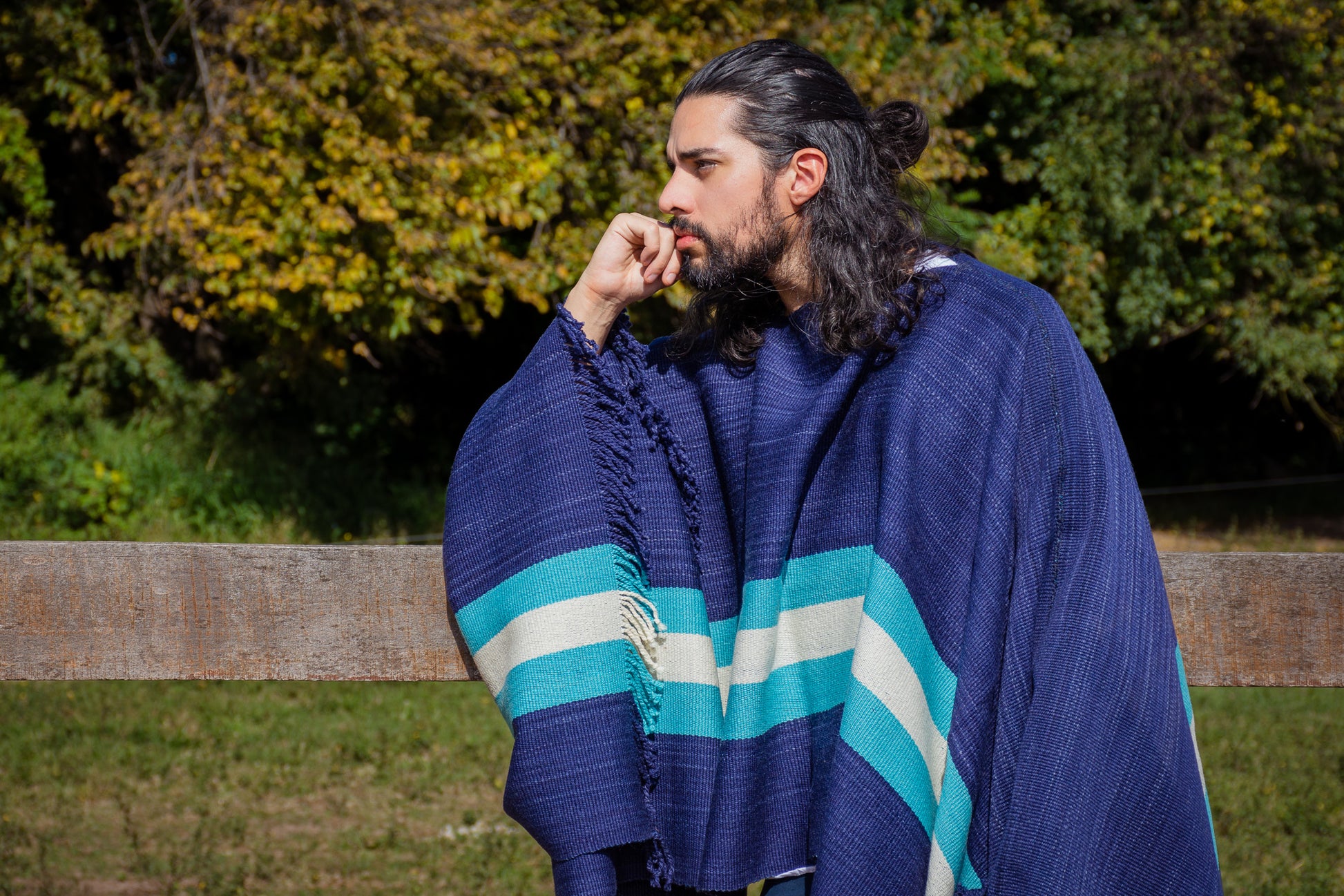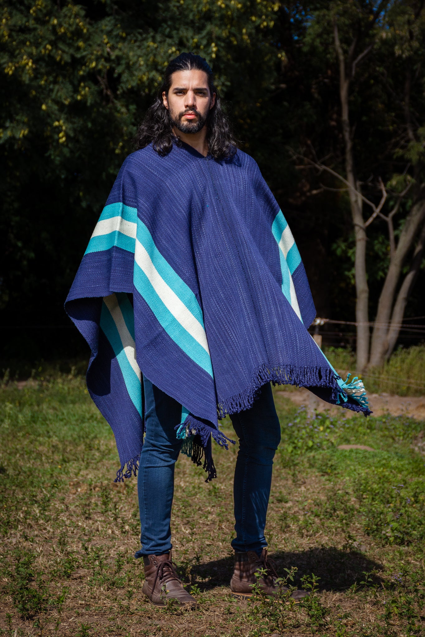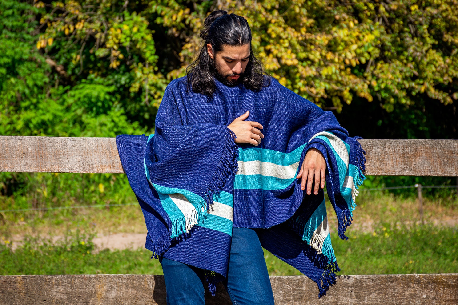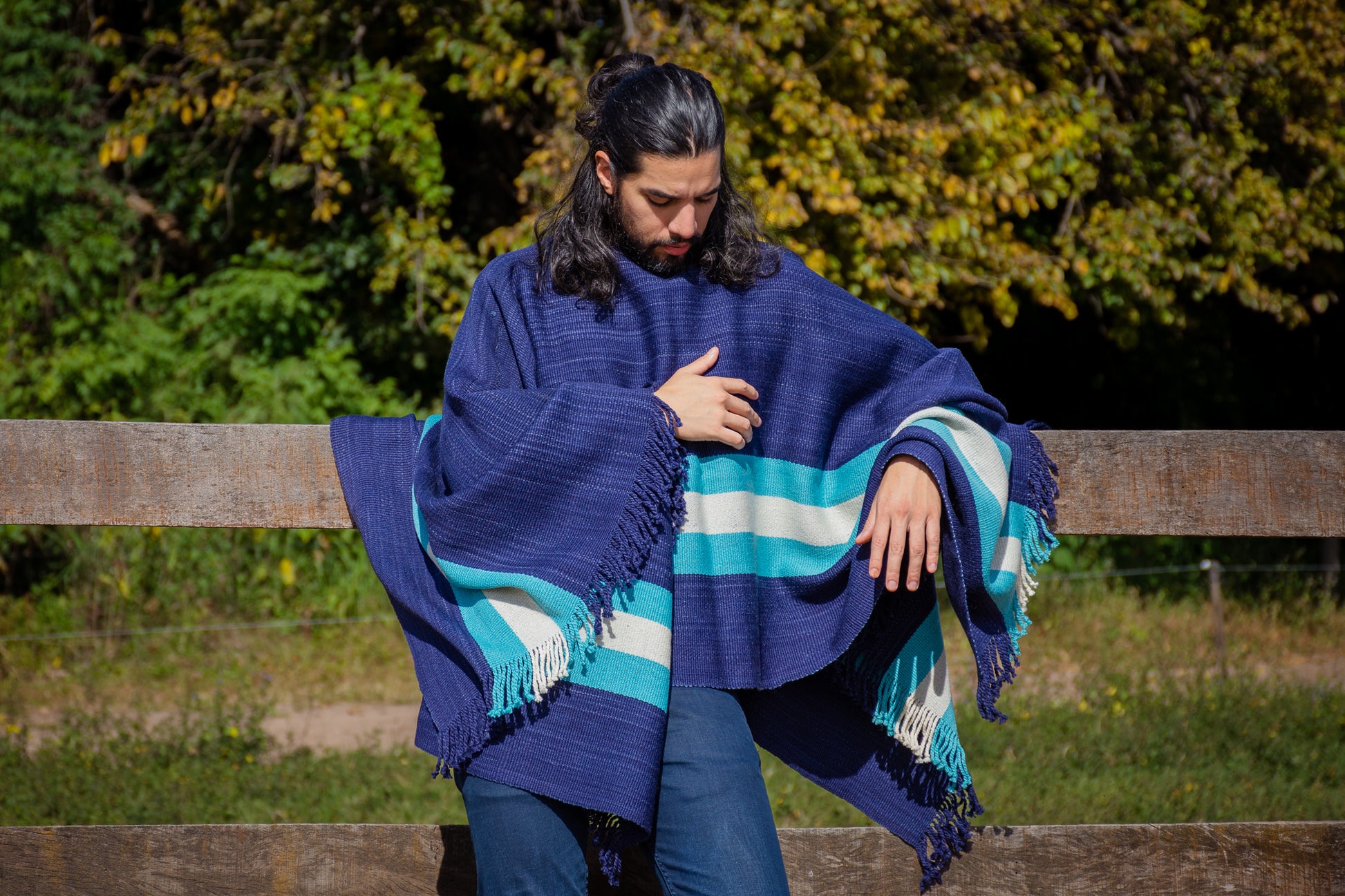 El poncho es una pieza única tejido artesanalmente en telar criollo, de alta densidad de trama cerrada y liviana en dos paños color Azul Almirante