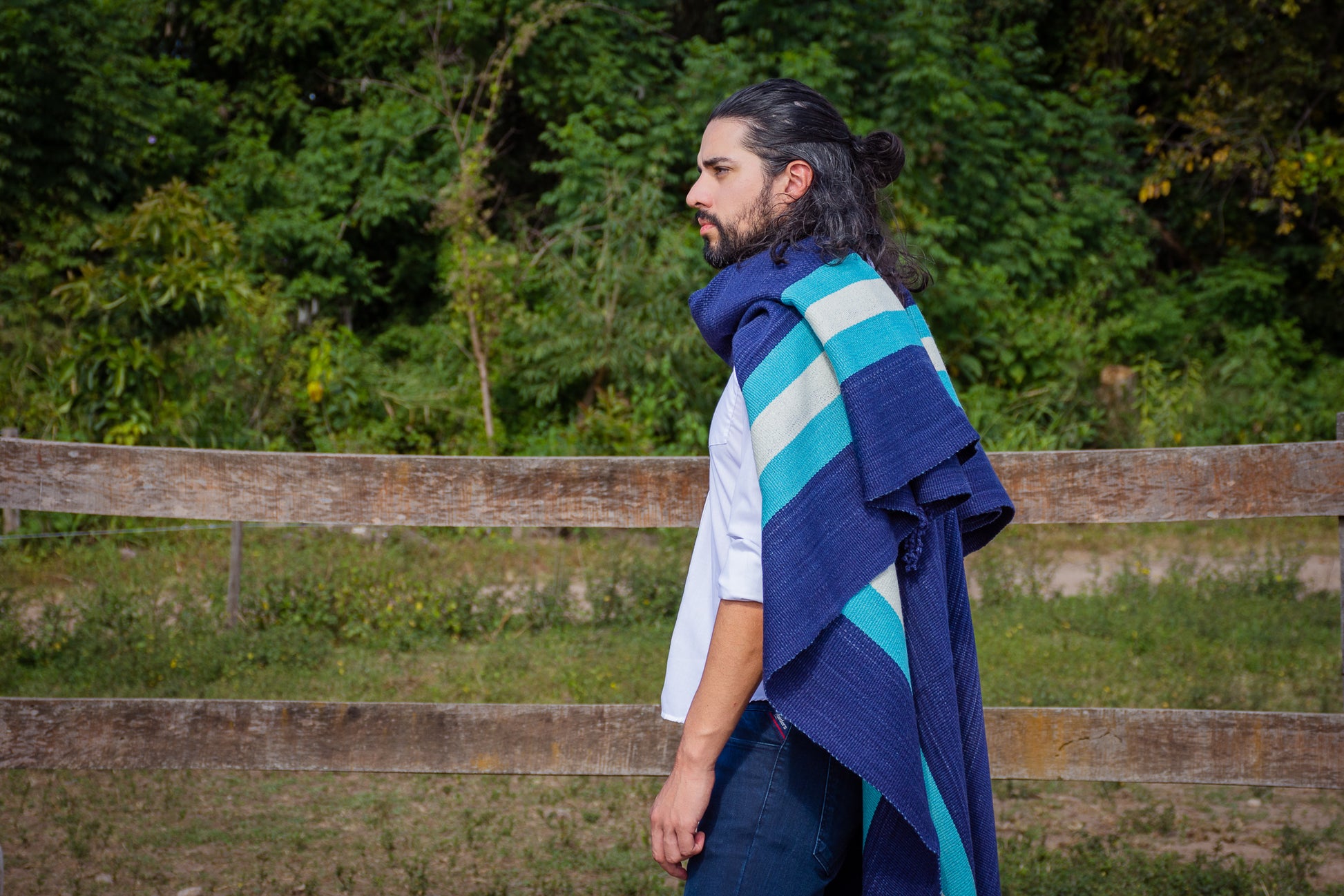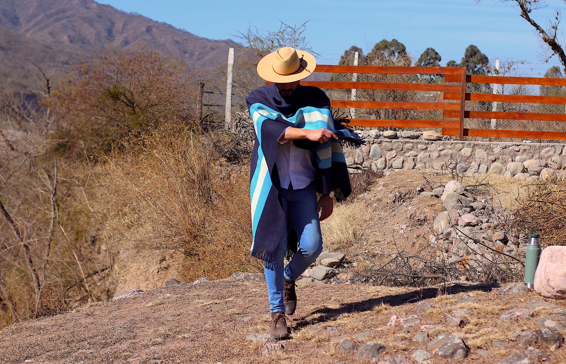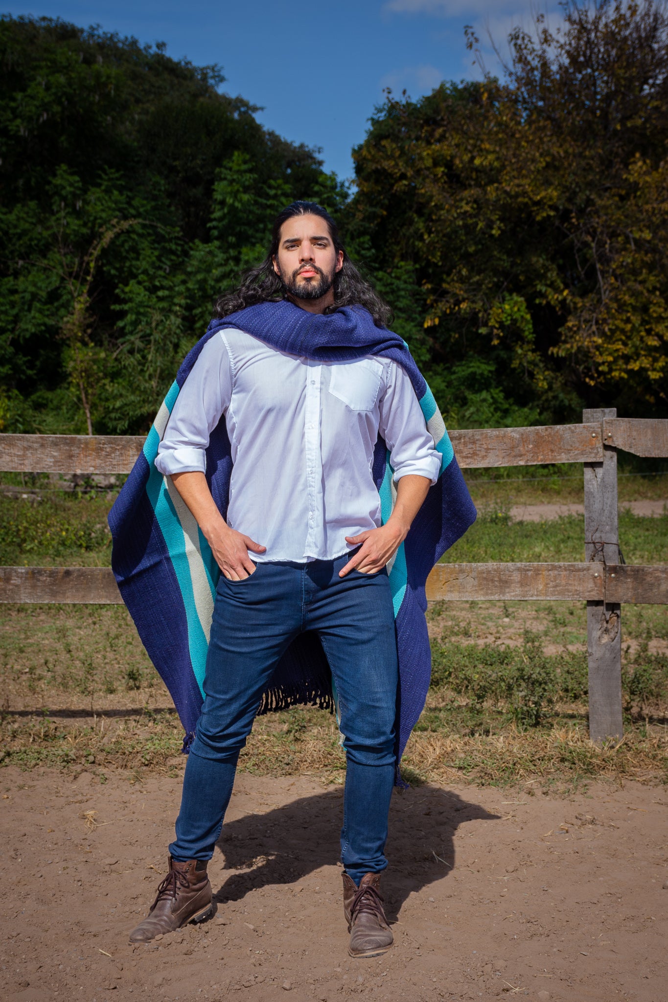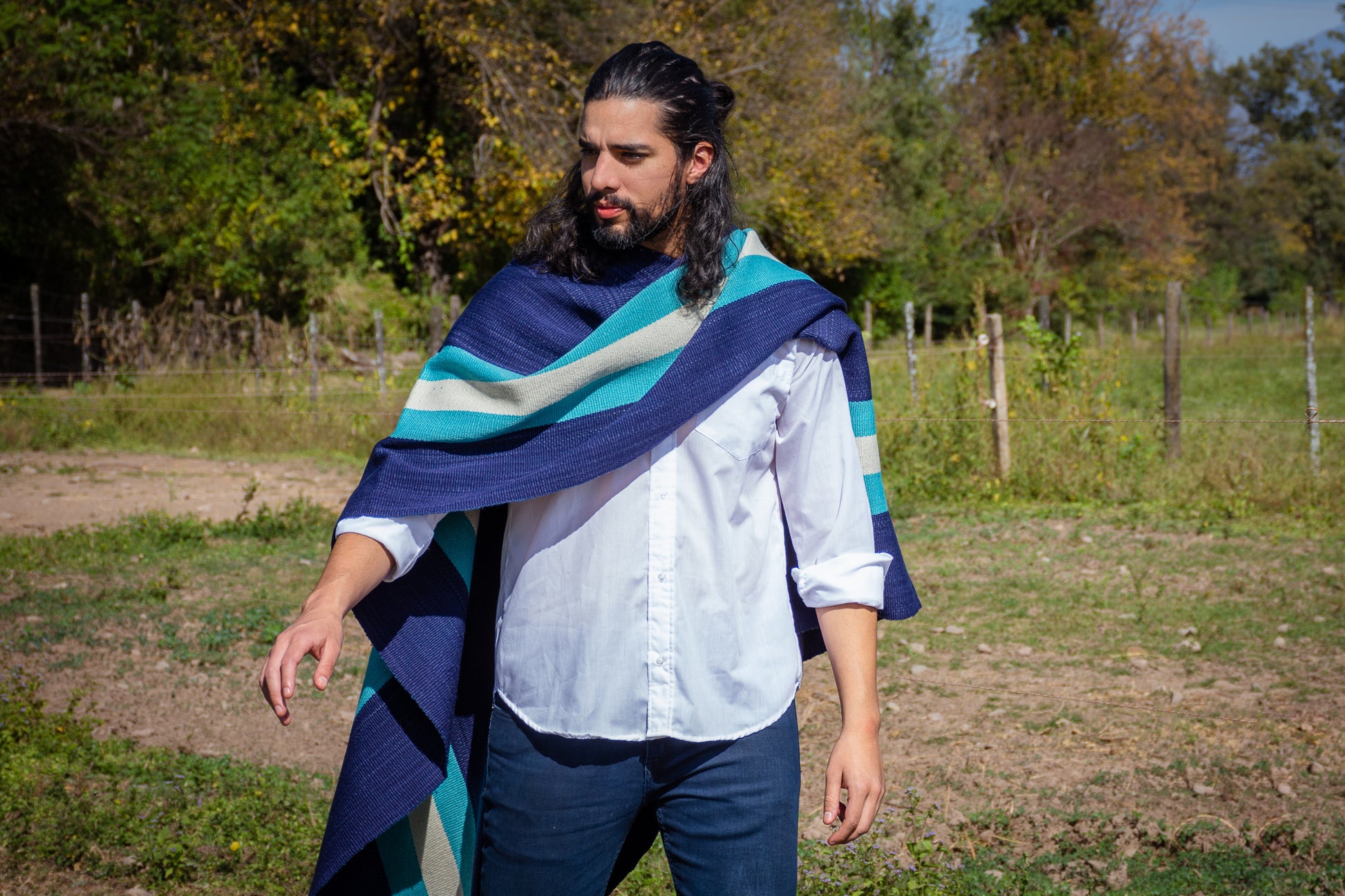 El poncho es una pieza única tejido artesanalmente en telar criollo, de alta densidad de trama cerrada y liviana en dos paños color Azul Almirante