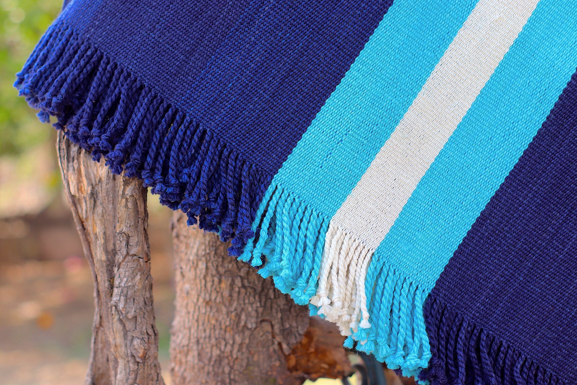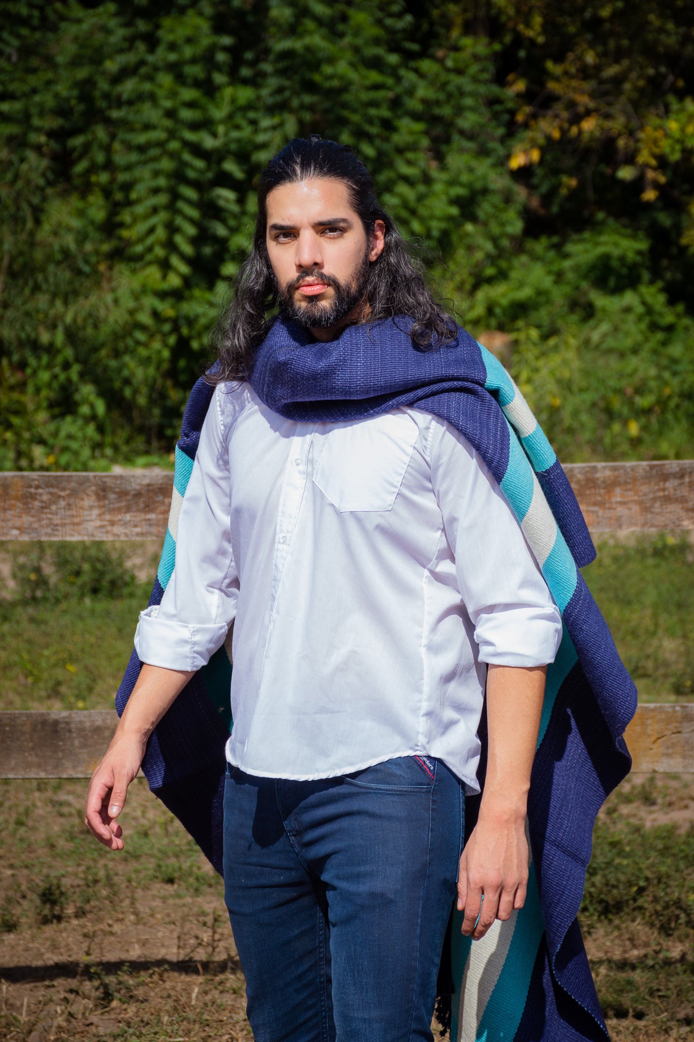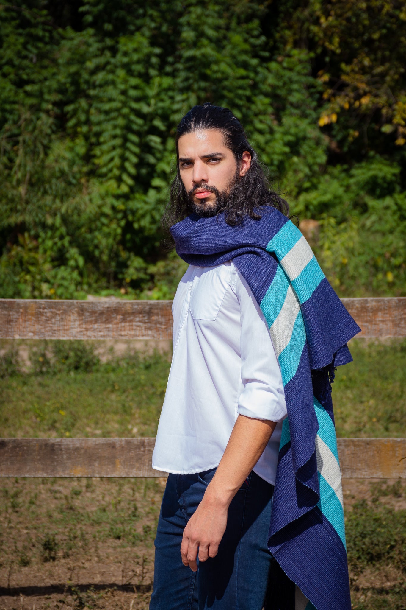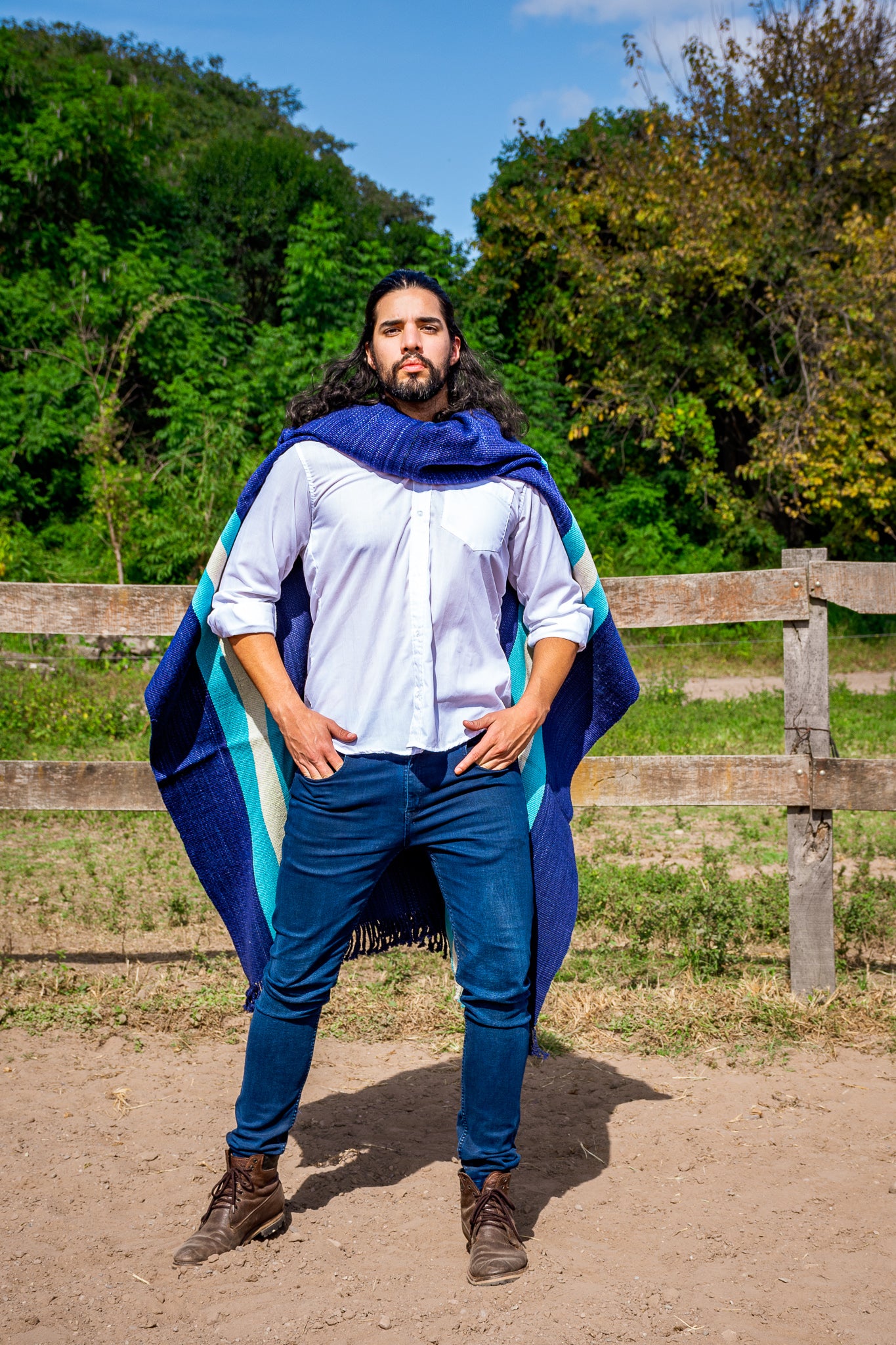 El poncho es una pieza única tejido artesanalmente en telar criollo, de alta densidad de trama cerrada y liviana en dos paños color Azul Almirante