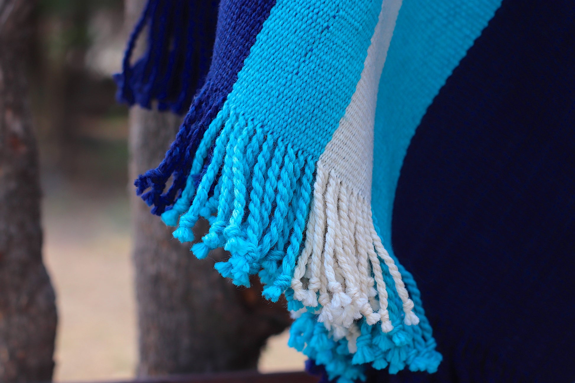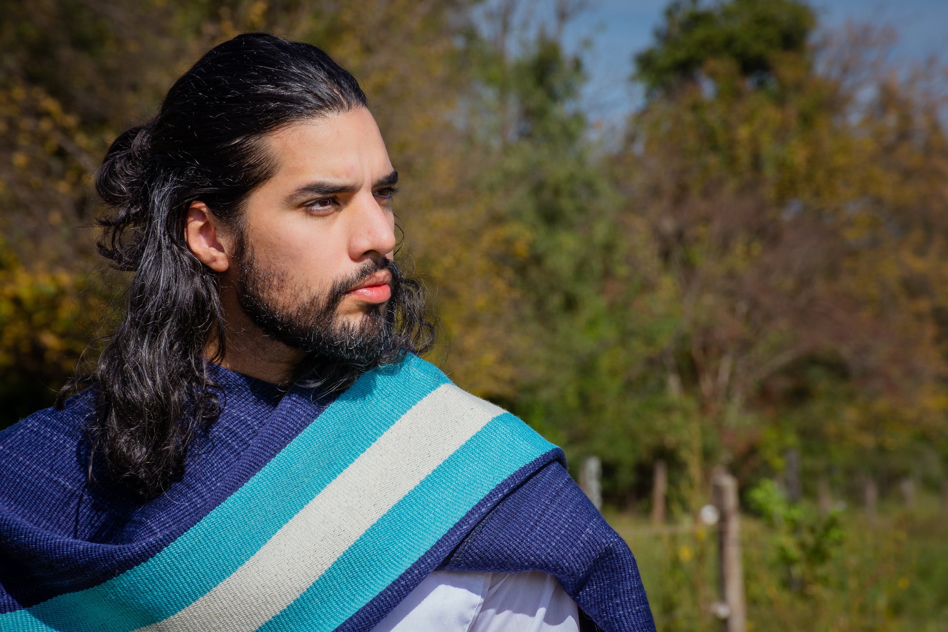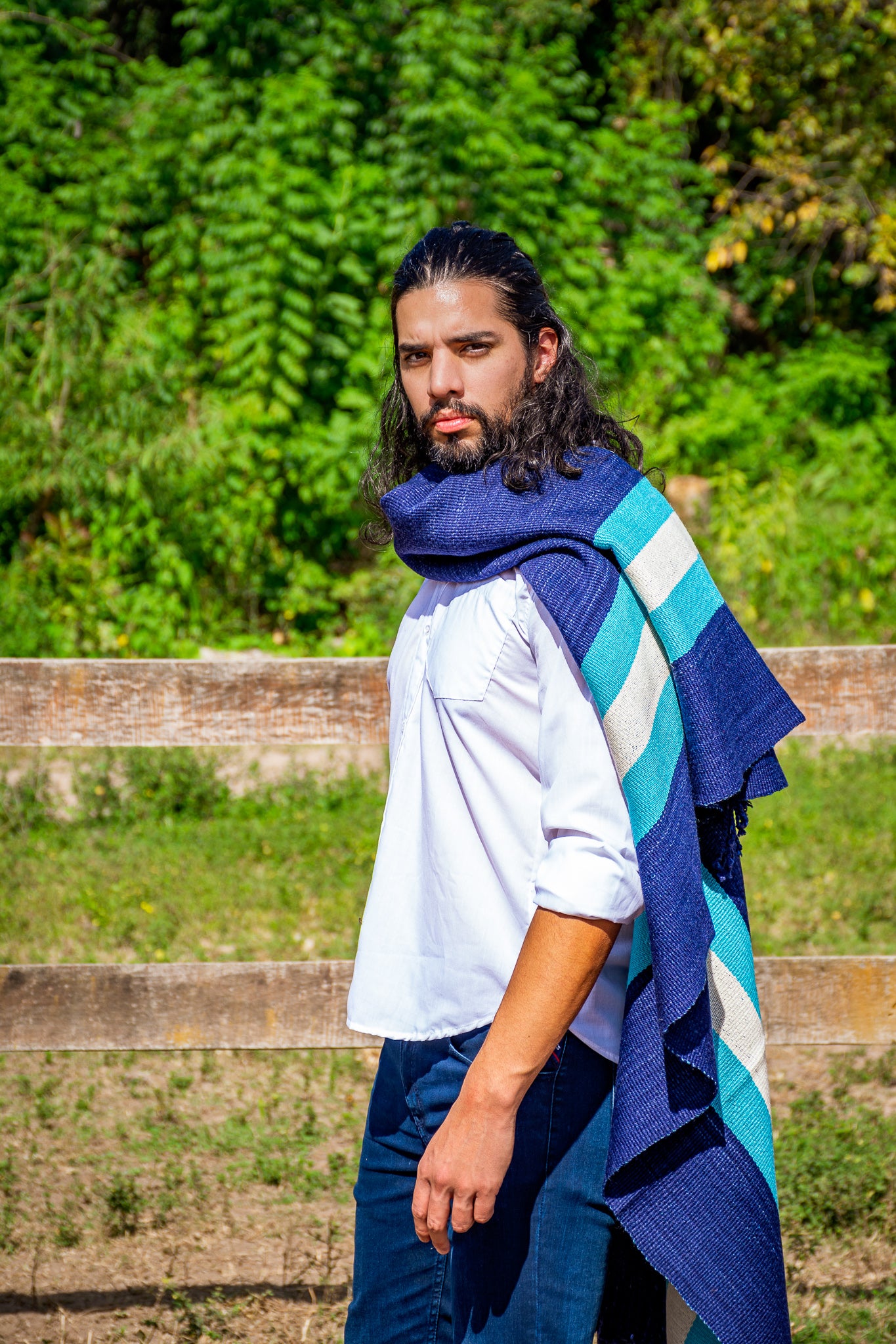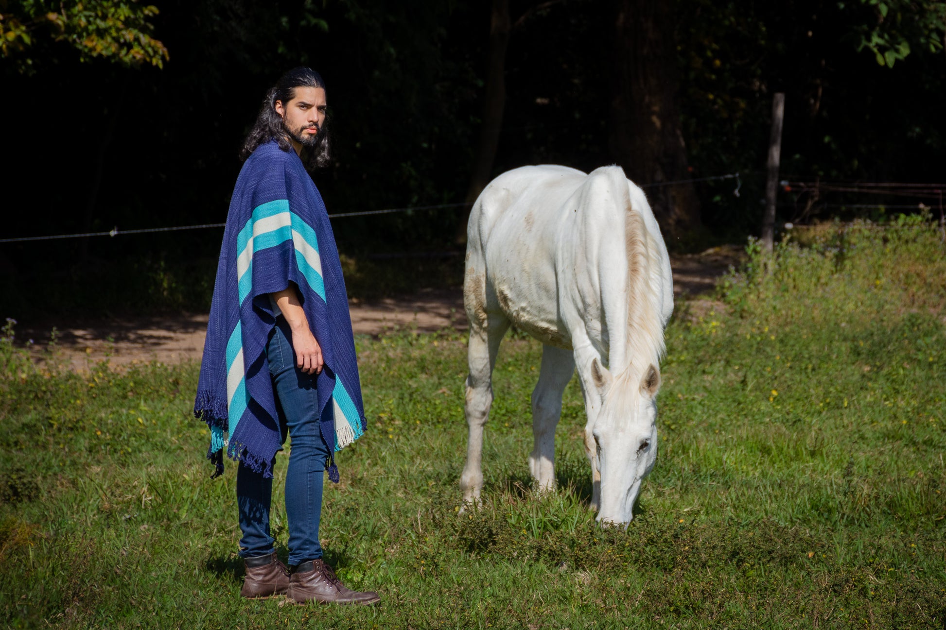 El poncho es una pieza única tejido artesanalmente en telar criollo, de alta densidad de trama cerrada y liviana en dos paños color Azul Almirante