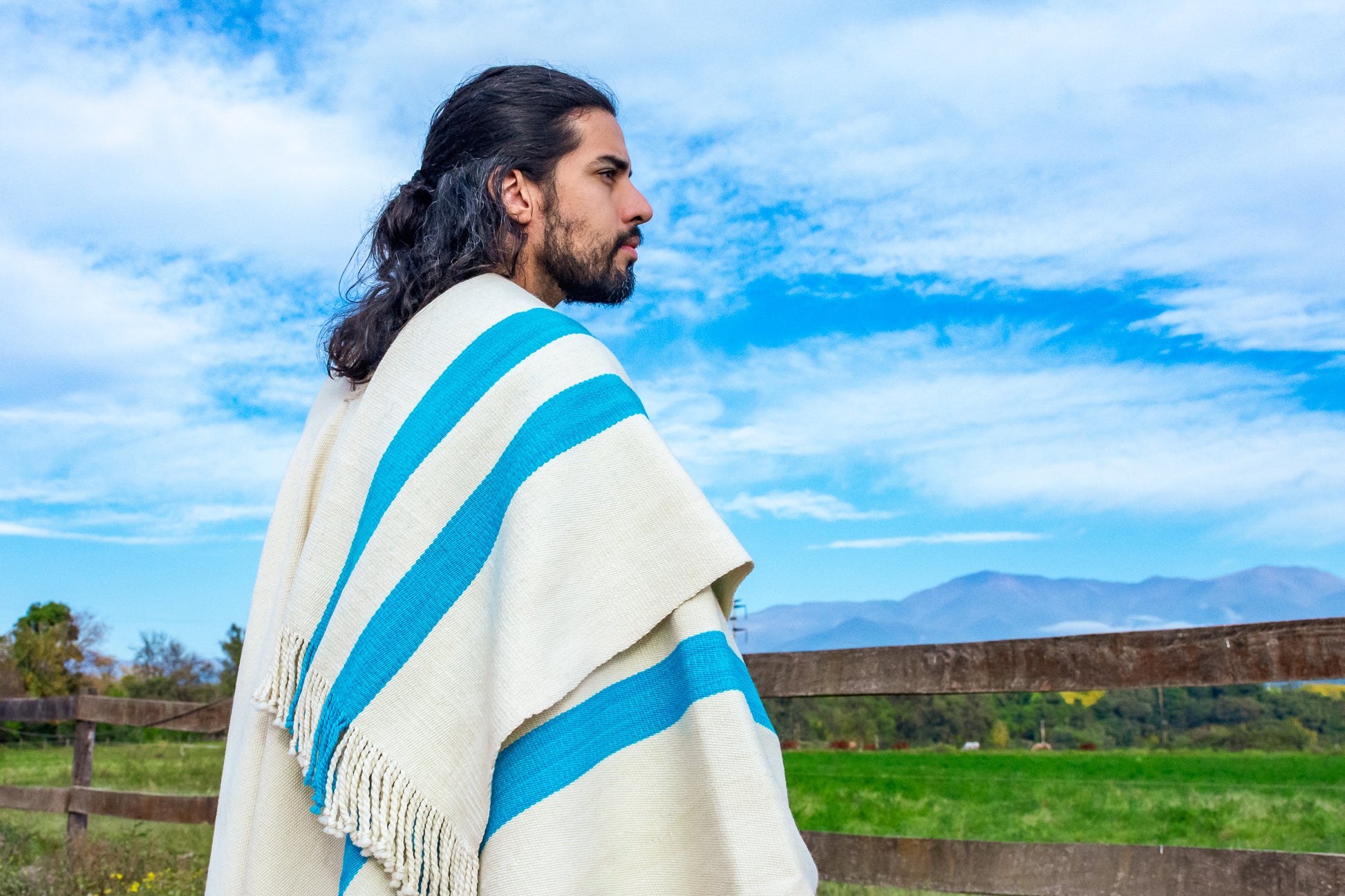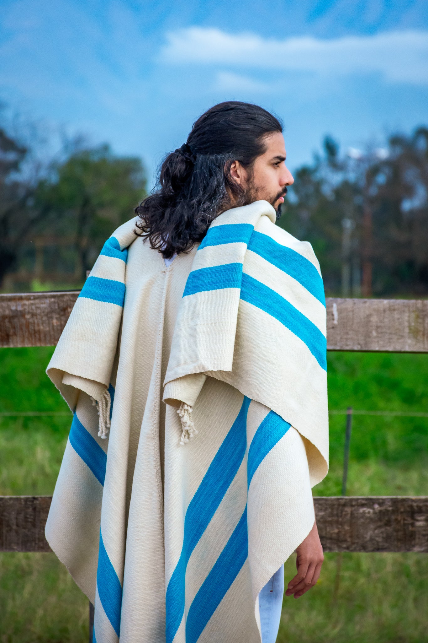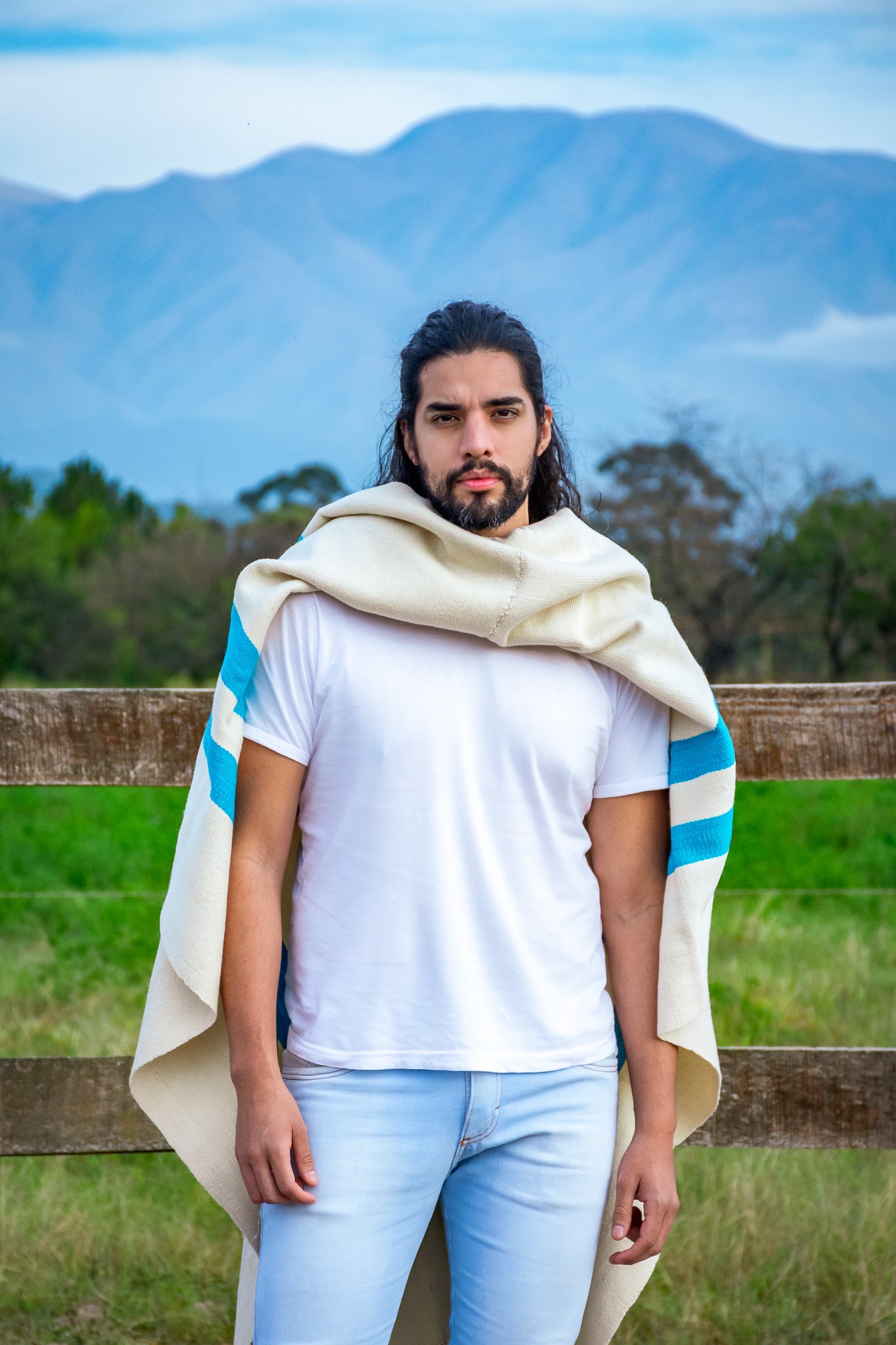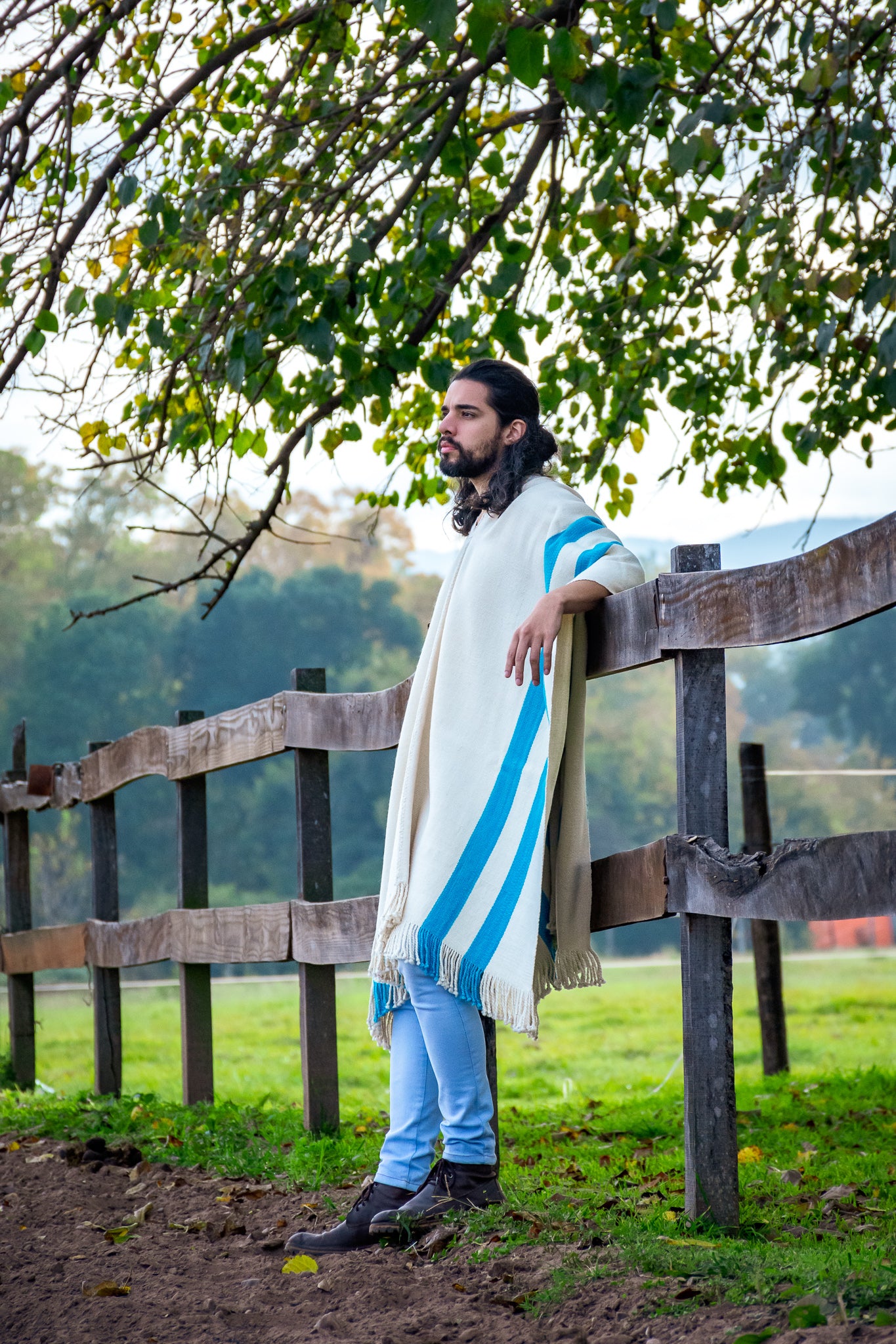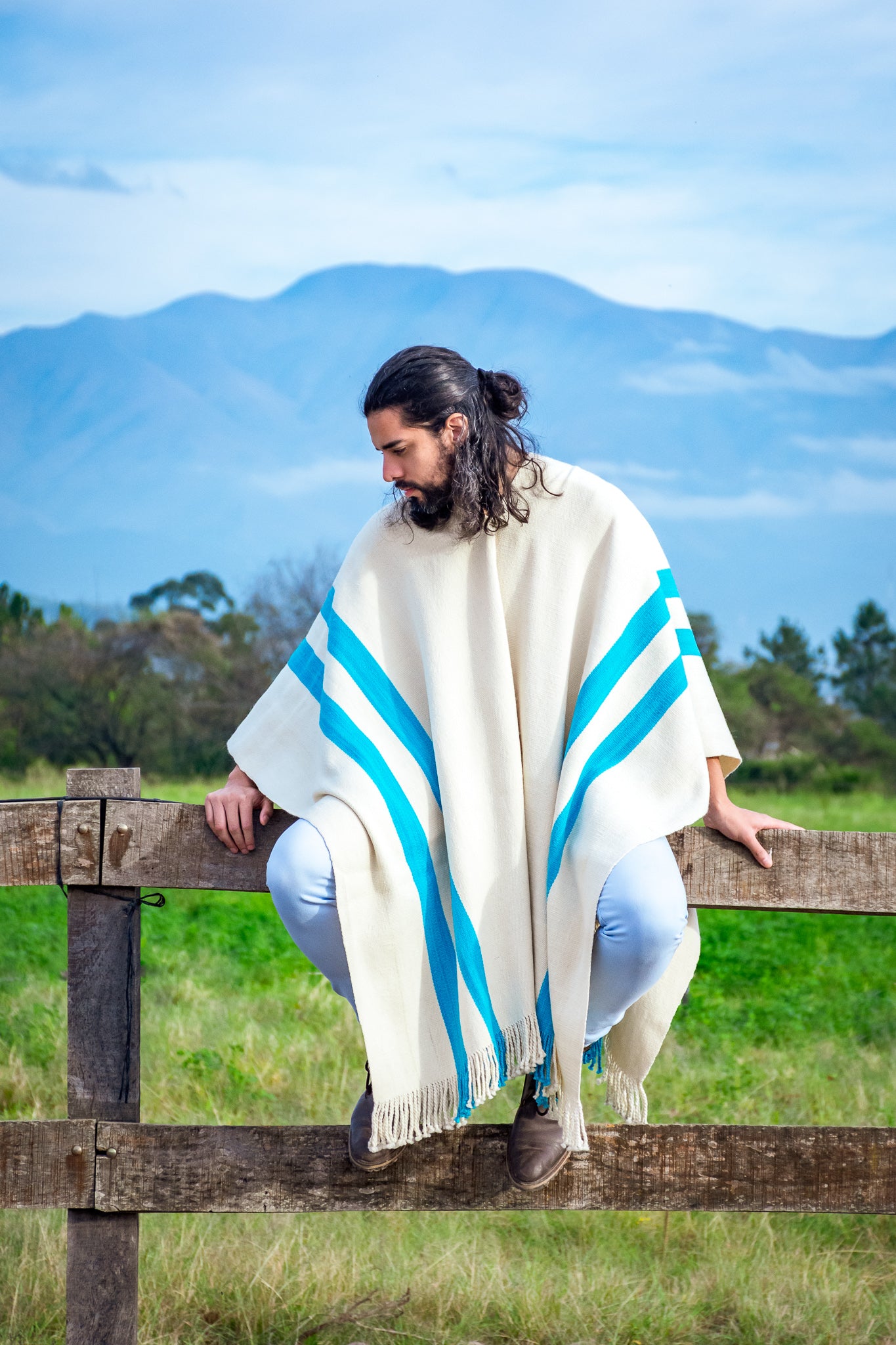 El poncho es una pieza única tejido artesanalmente en telar criollo, de alta densidad de trama cerrada y liviana en dos paños color blanco natural