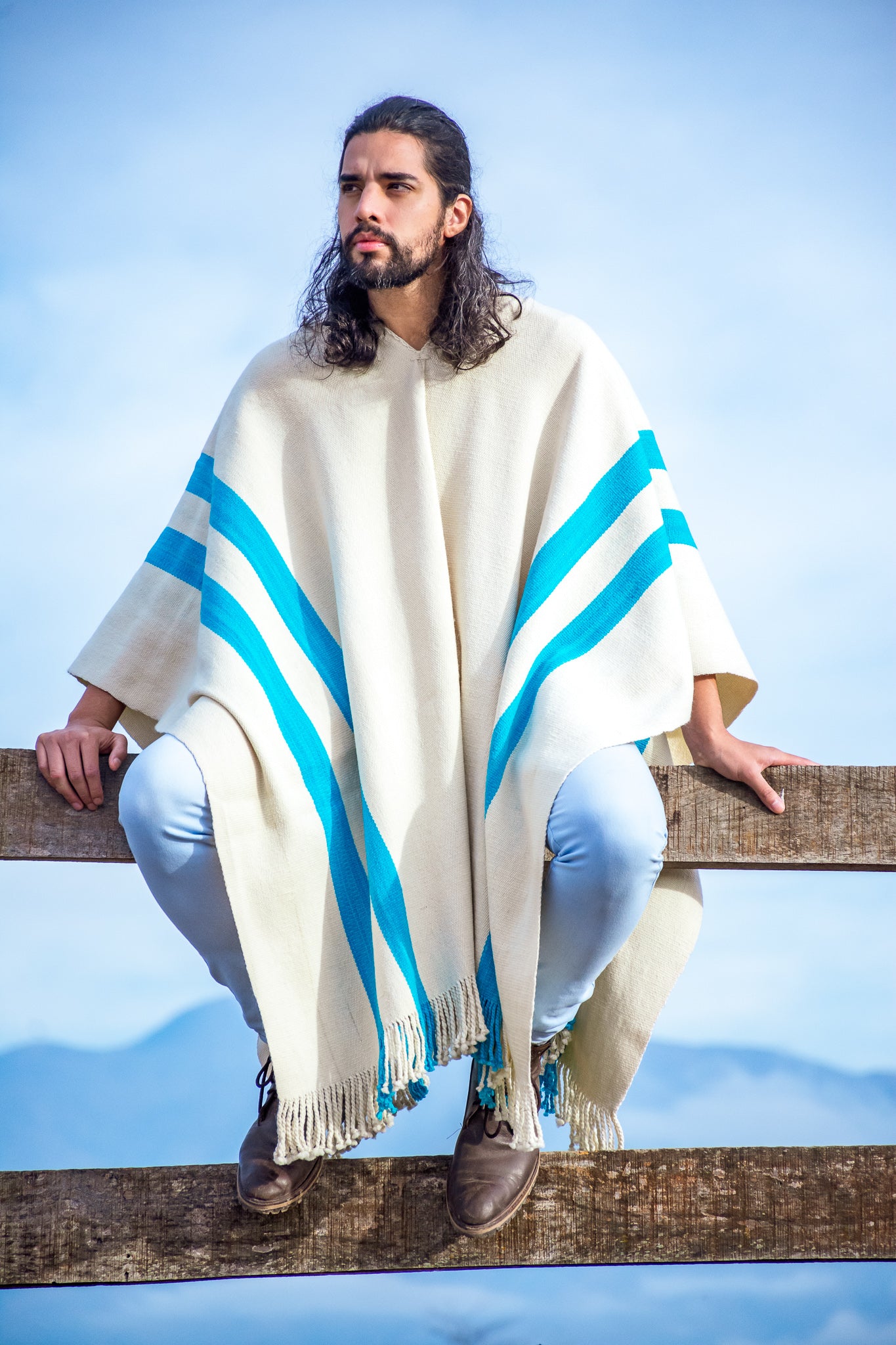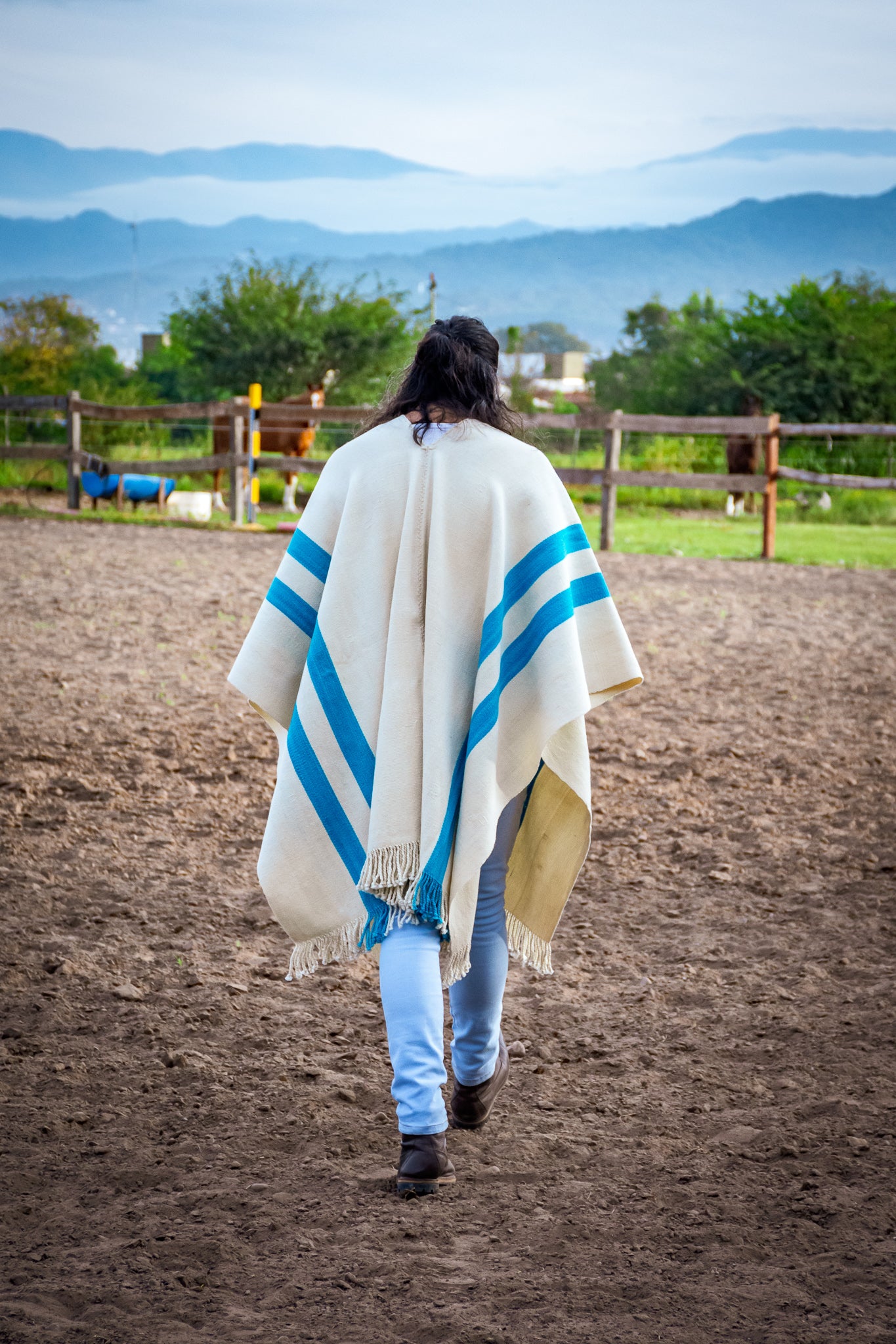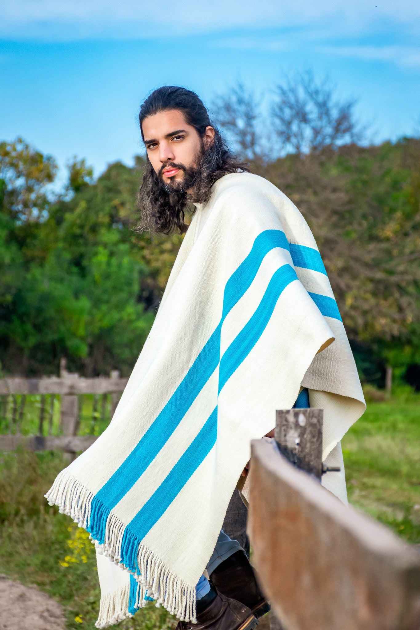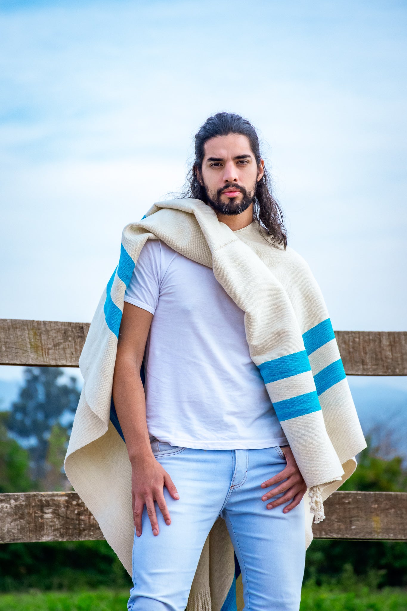 El poncho es una pieza única tejido artesanalmente en telar criollo, de alta densidad de trama cerrada y liviana en dos paños color blanco natural