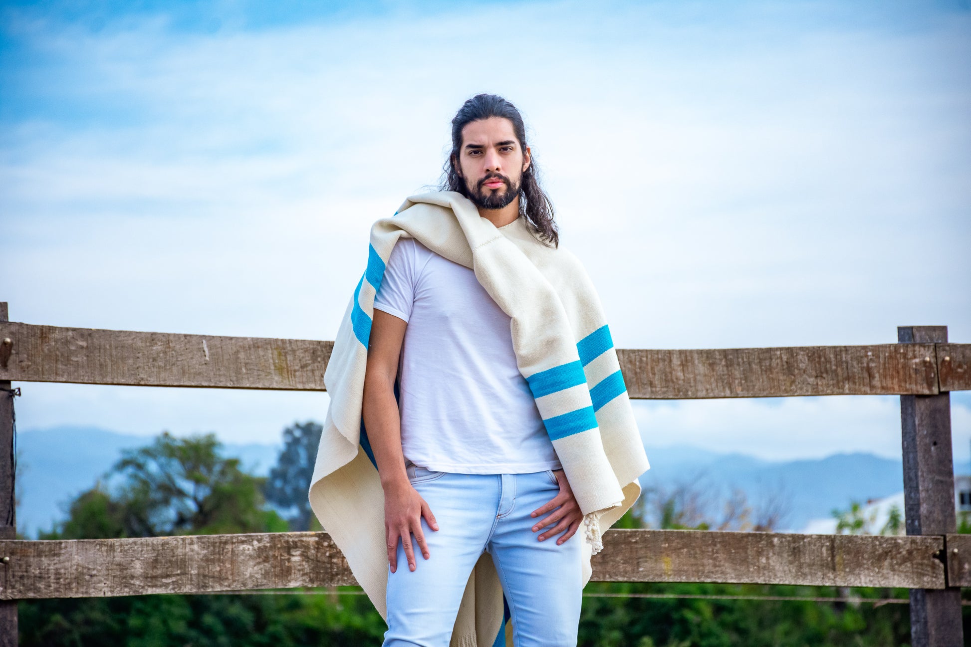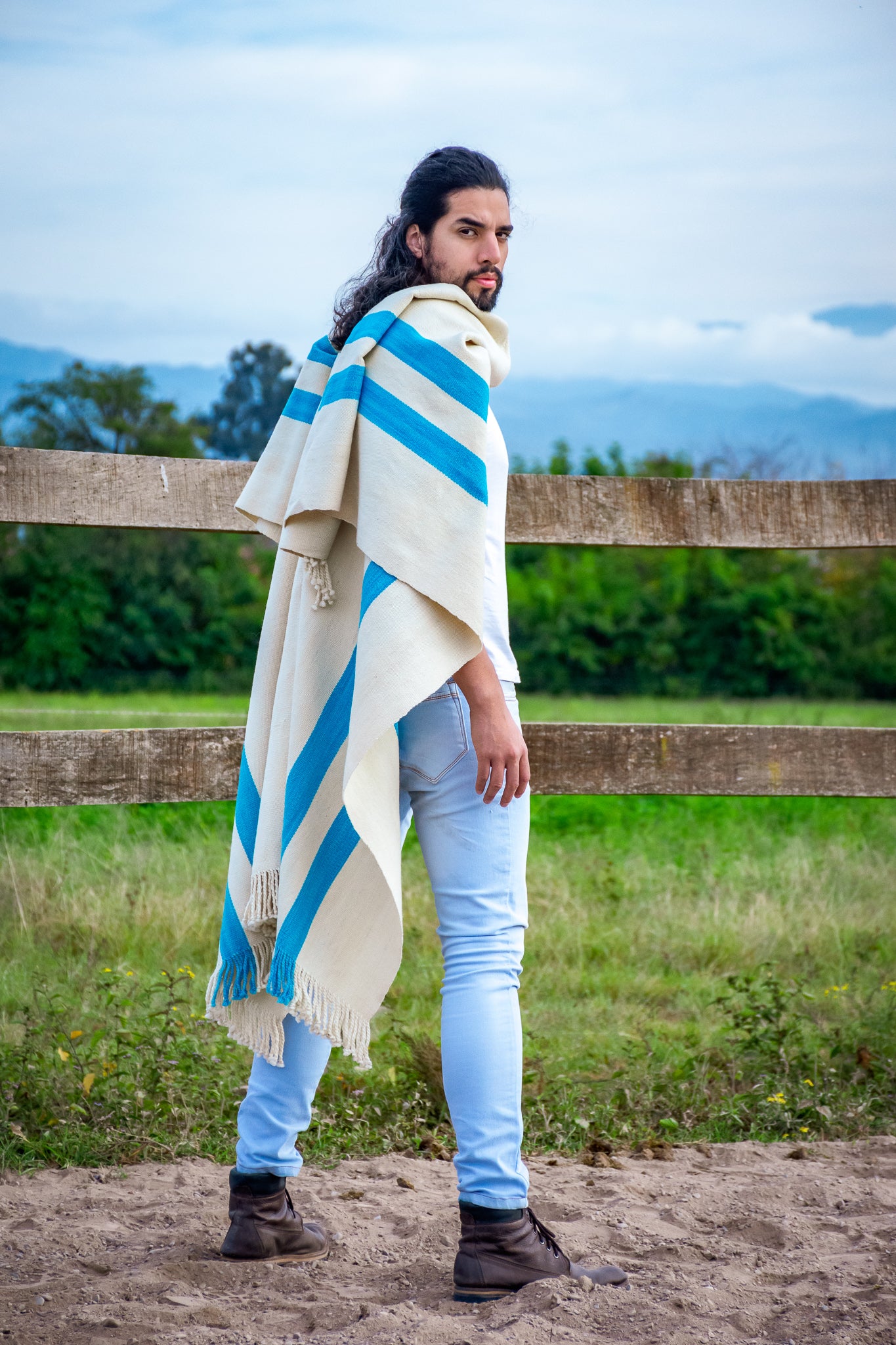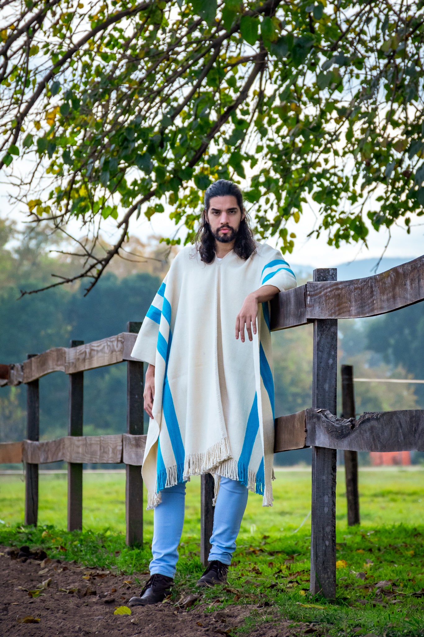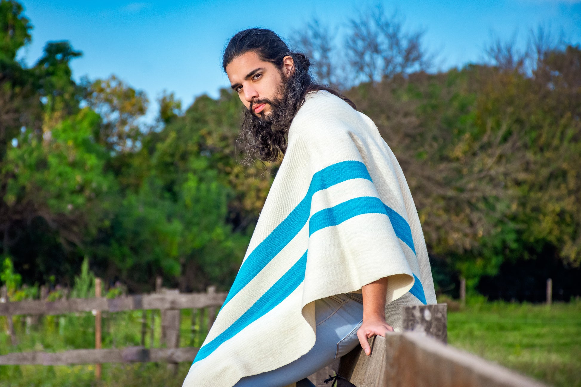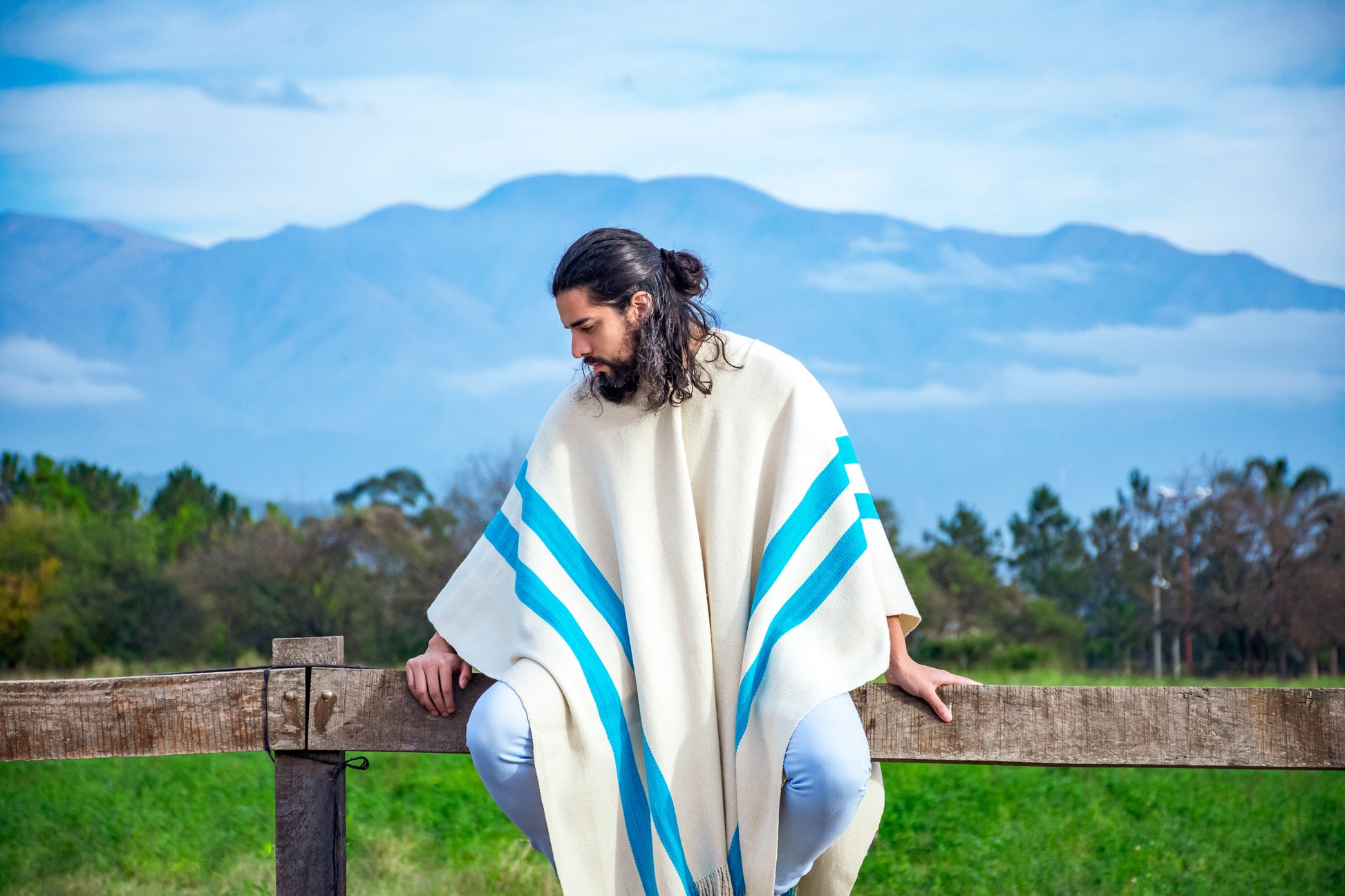 El poncho es una pieza única tejido artesanalmente en telar criollo, de alta densidad de trama cerrada y liviana en dos paños color blanco natural