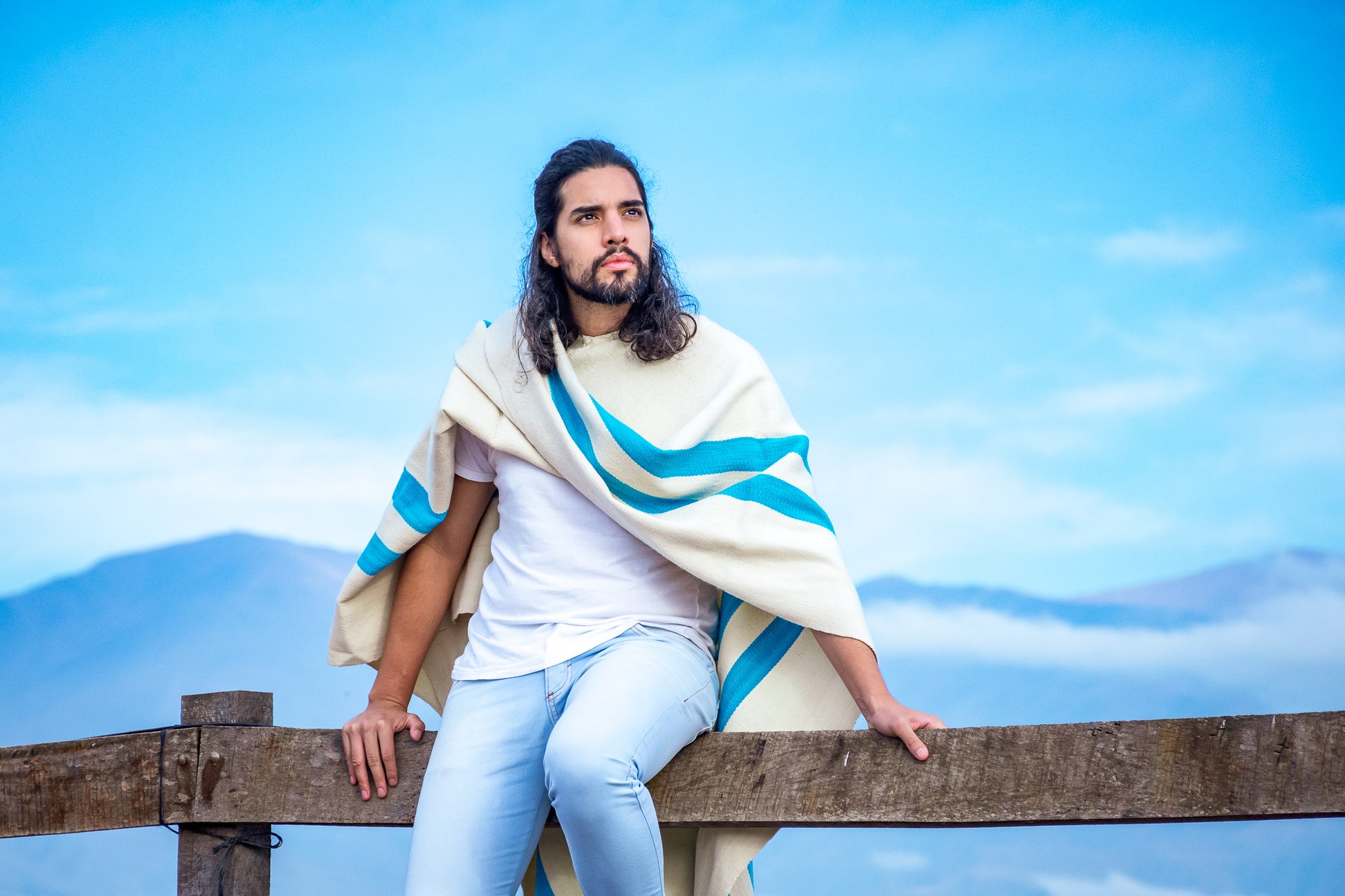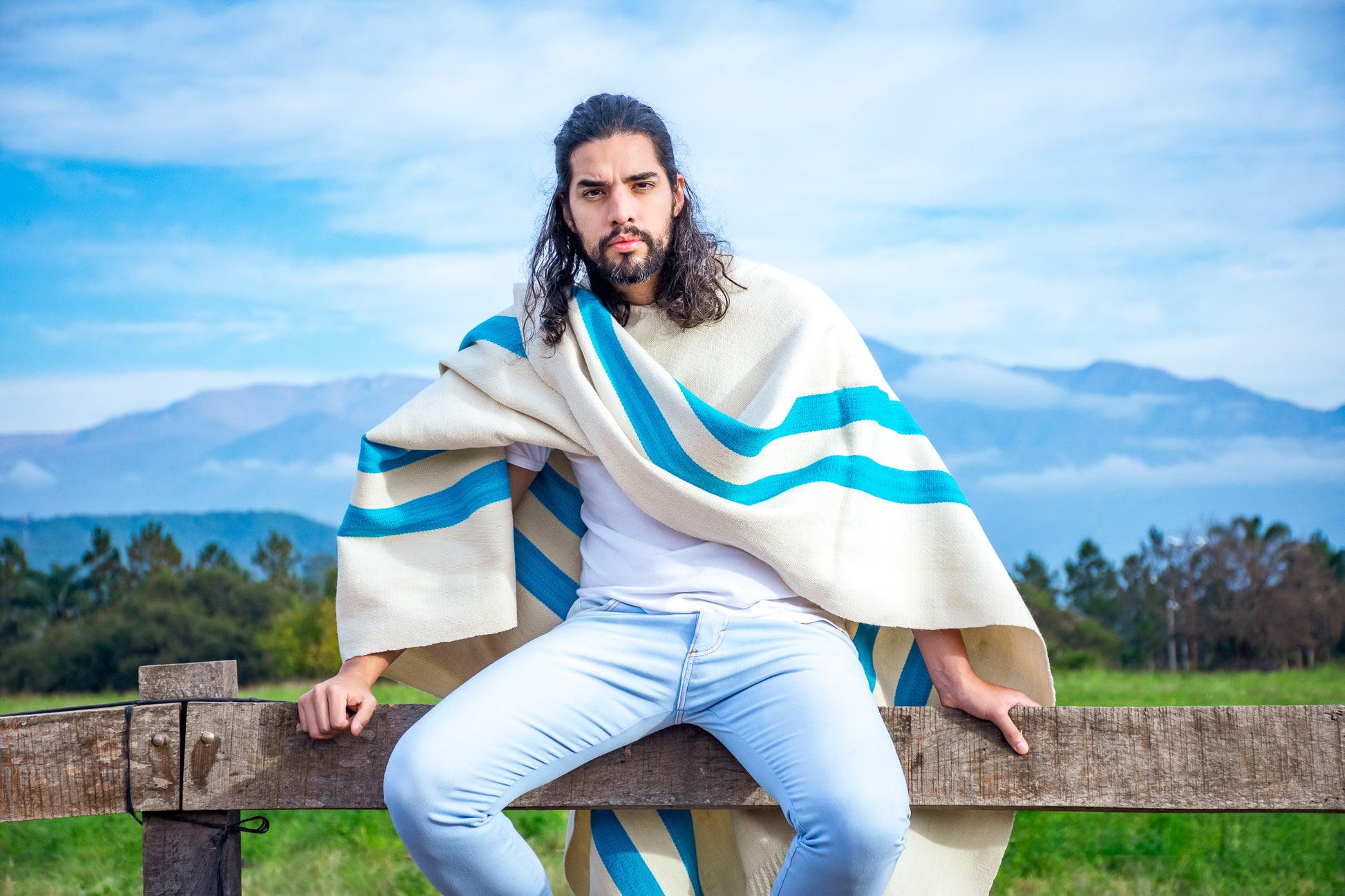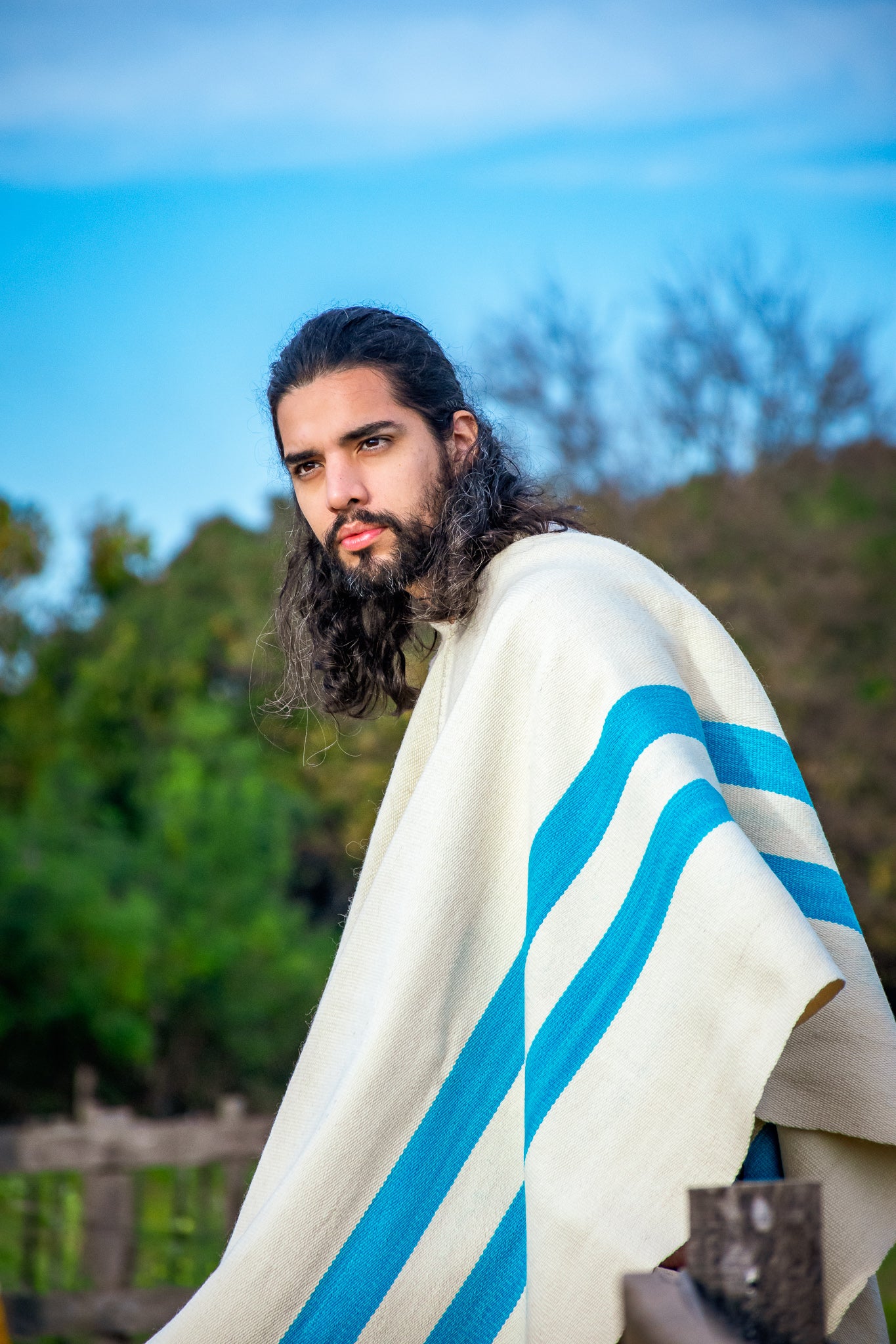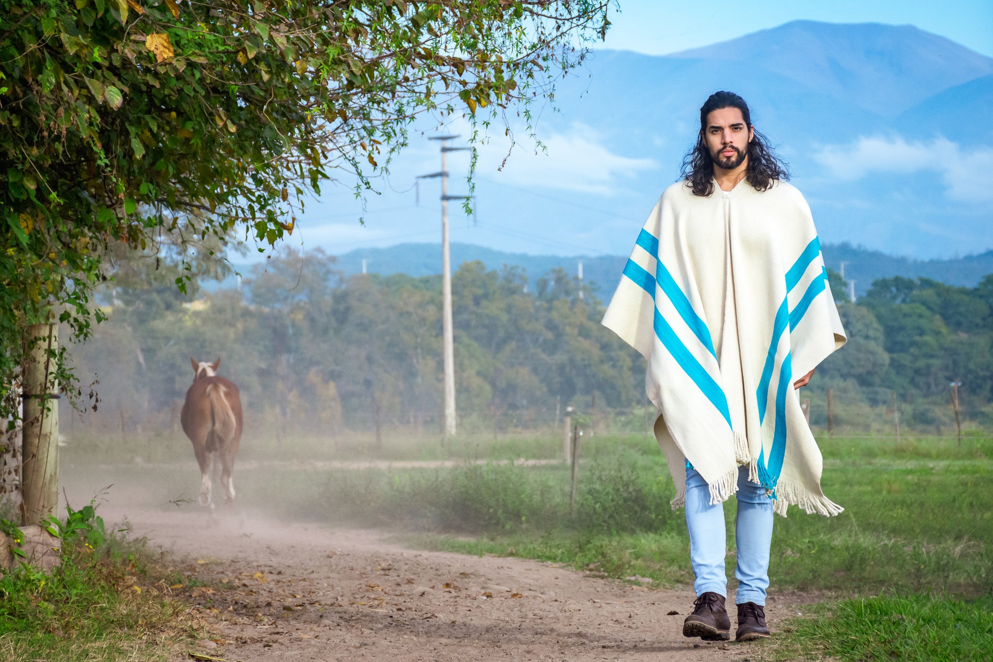El poncho es una pieza única tejido artesanalmente en telar criollo, de alta densidad de trama cerrada y liviana en dos paños color blanco natural