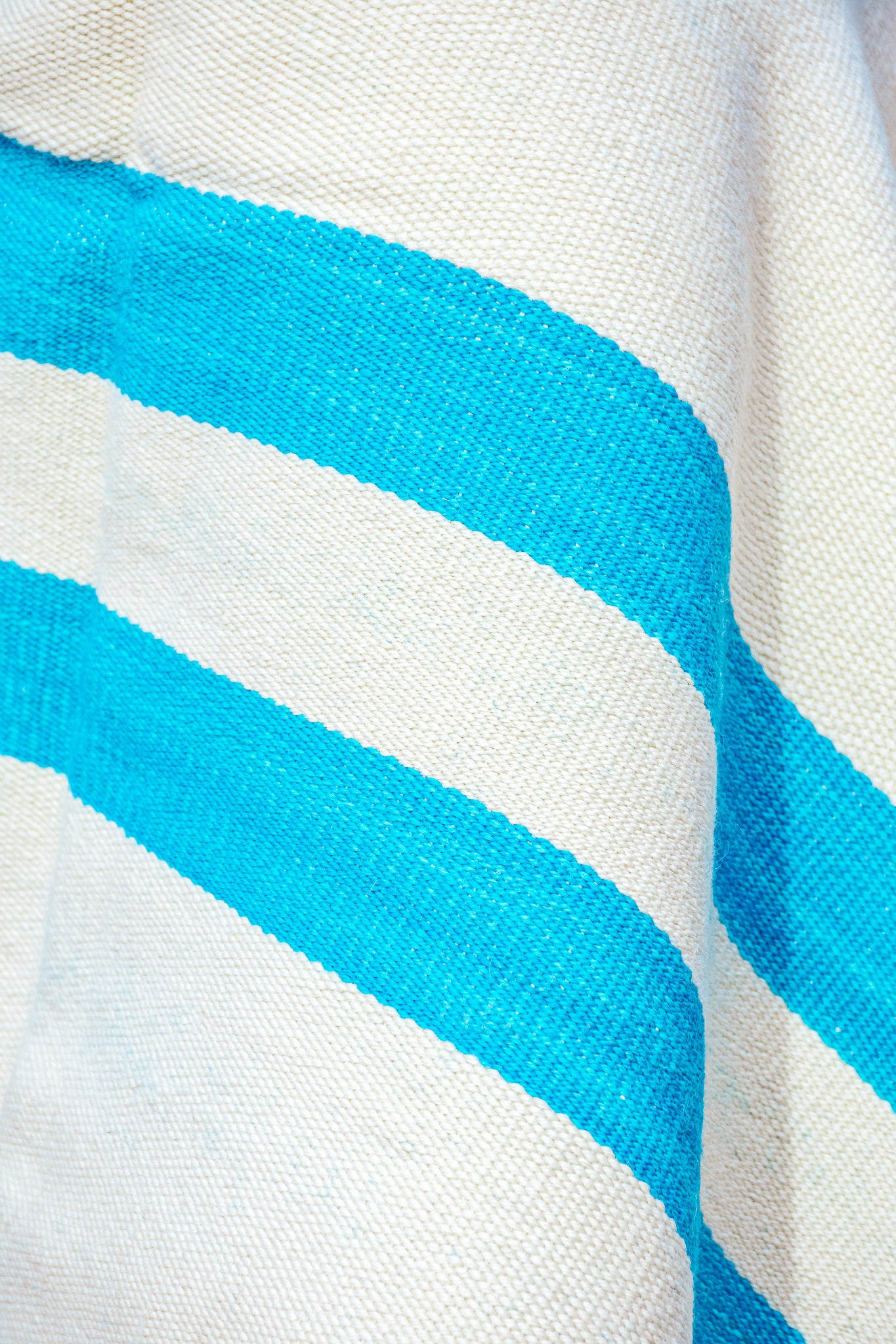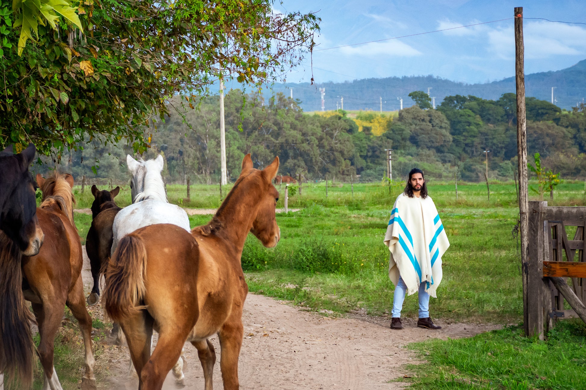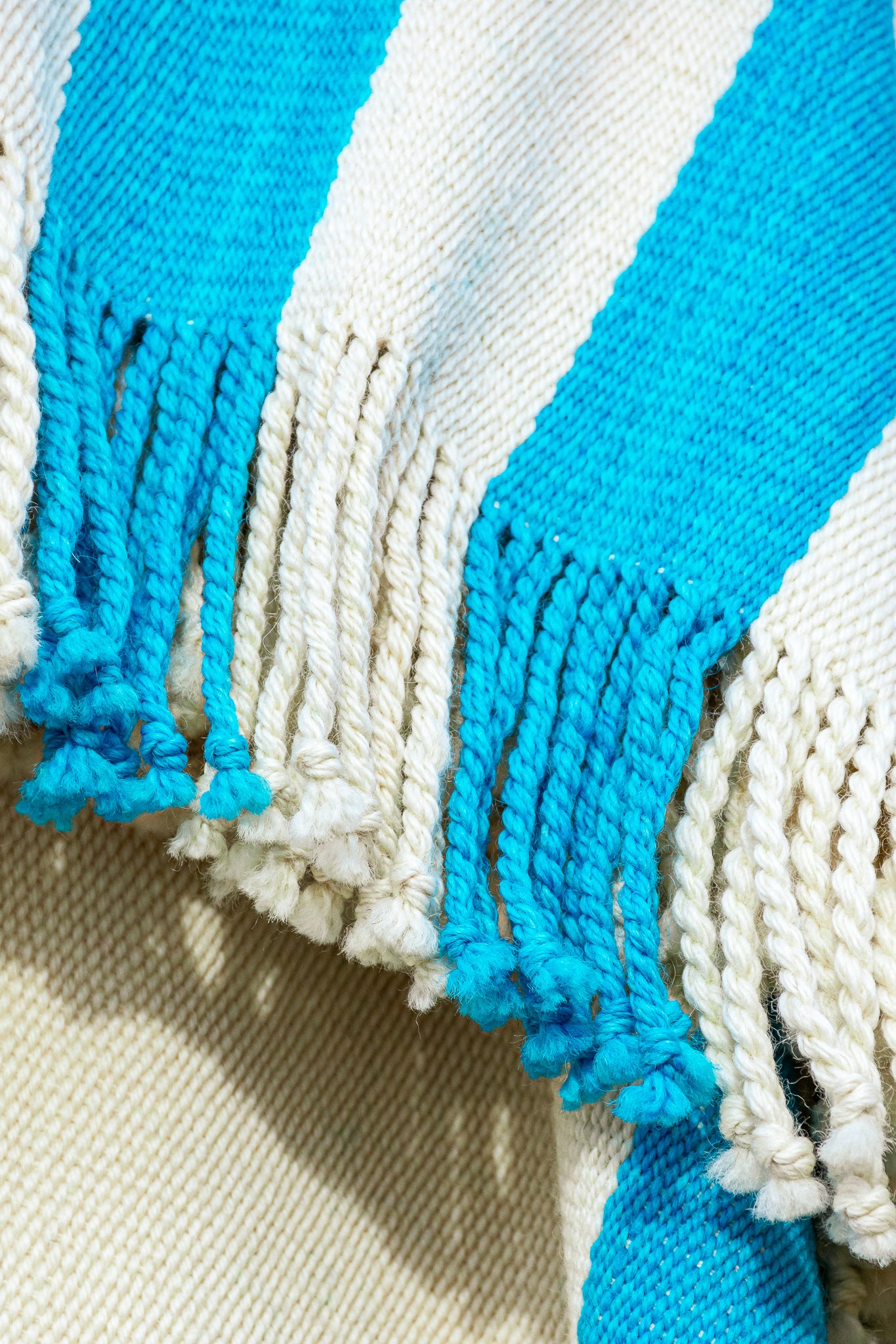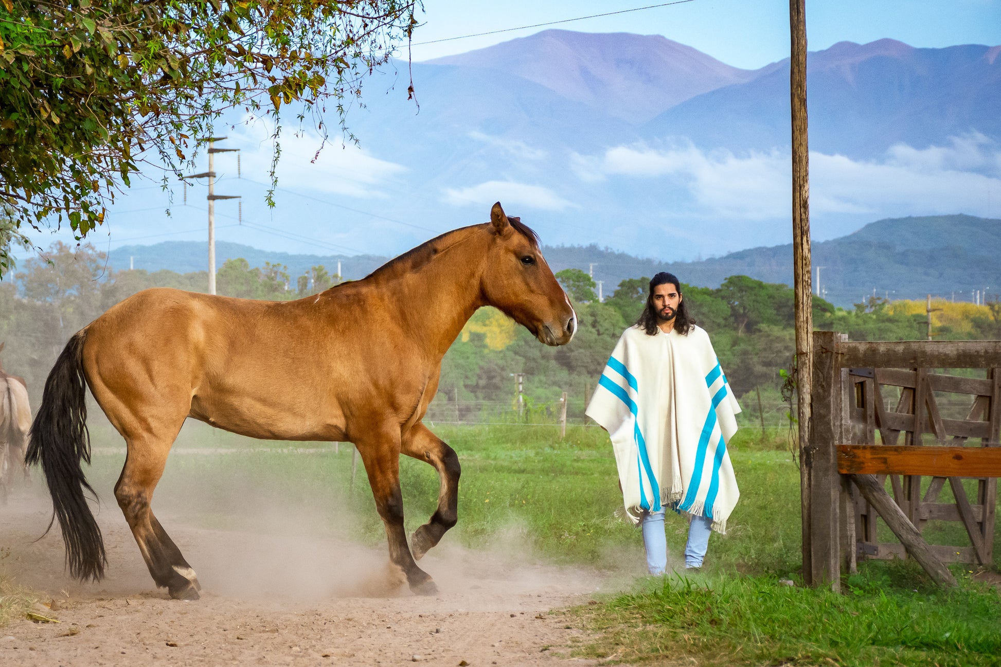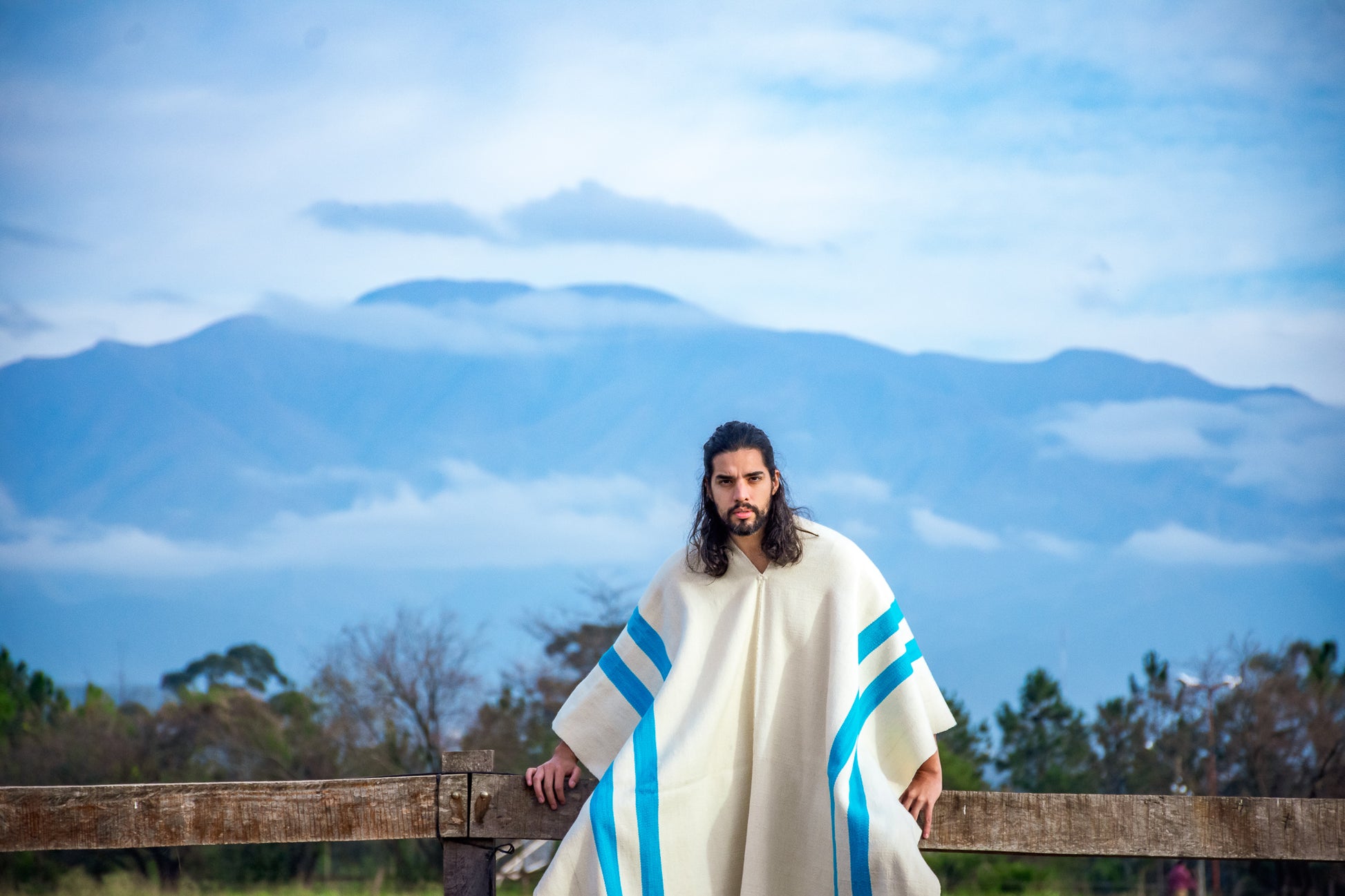 El poncho es una pieza única tejido artesanalmente en telar criollo, de alta densidad de trama cerrada y liviana en dos paños color blanco natural