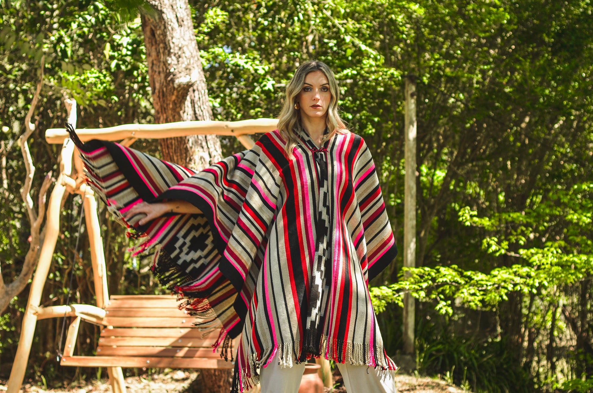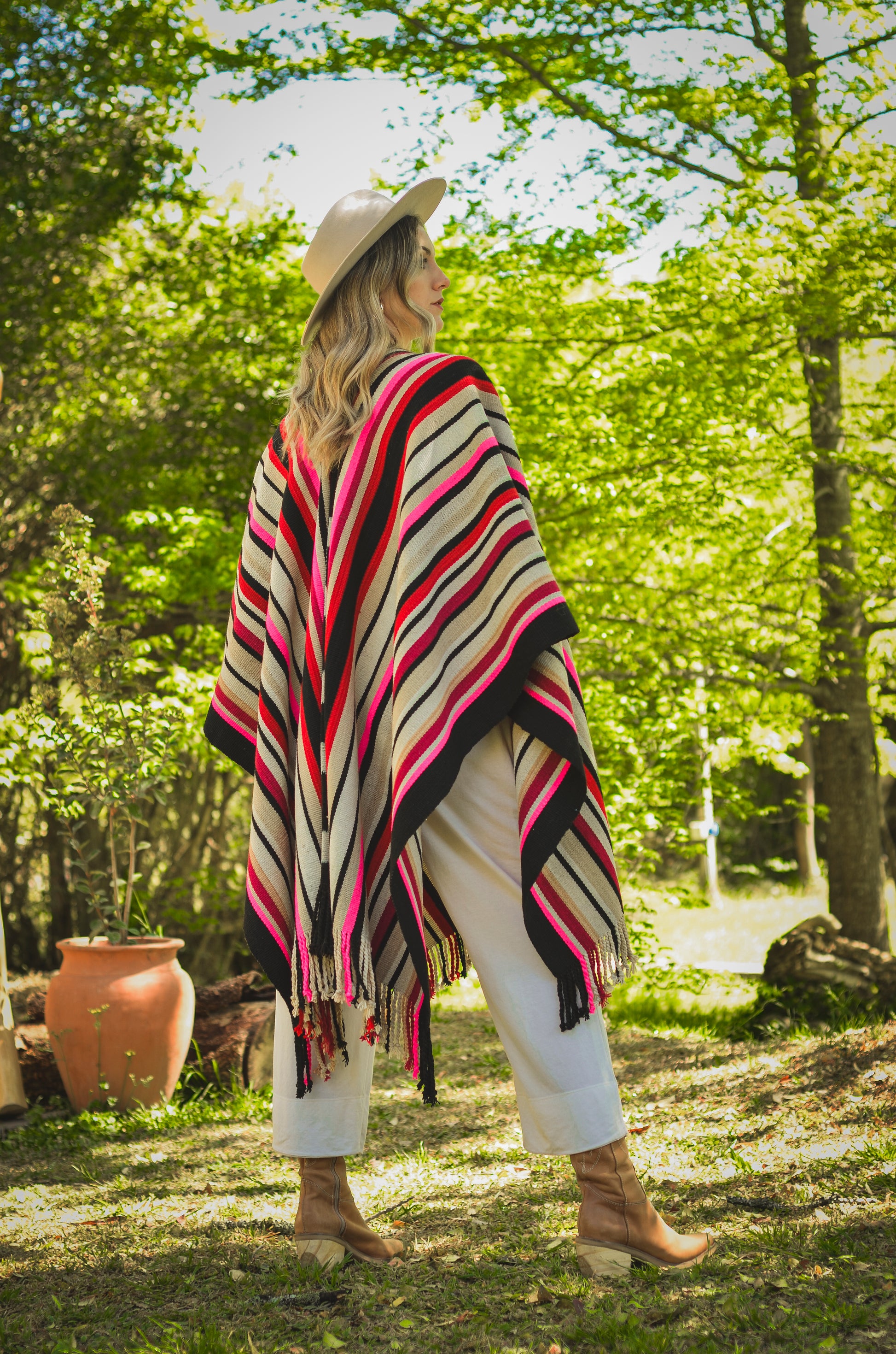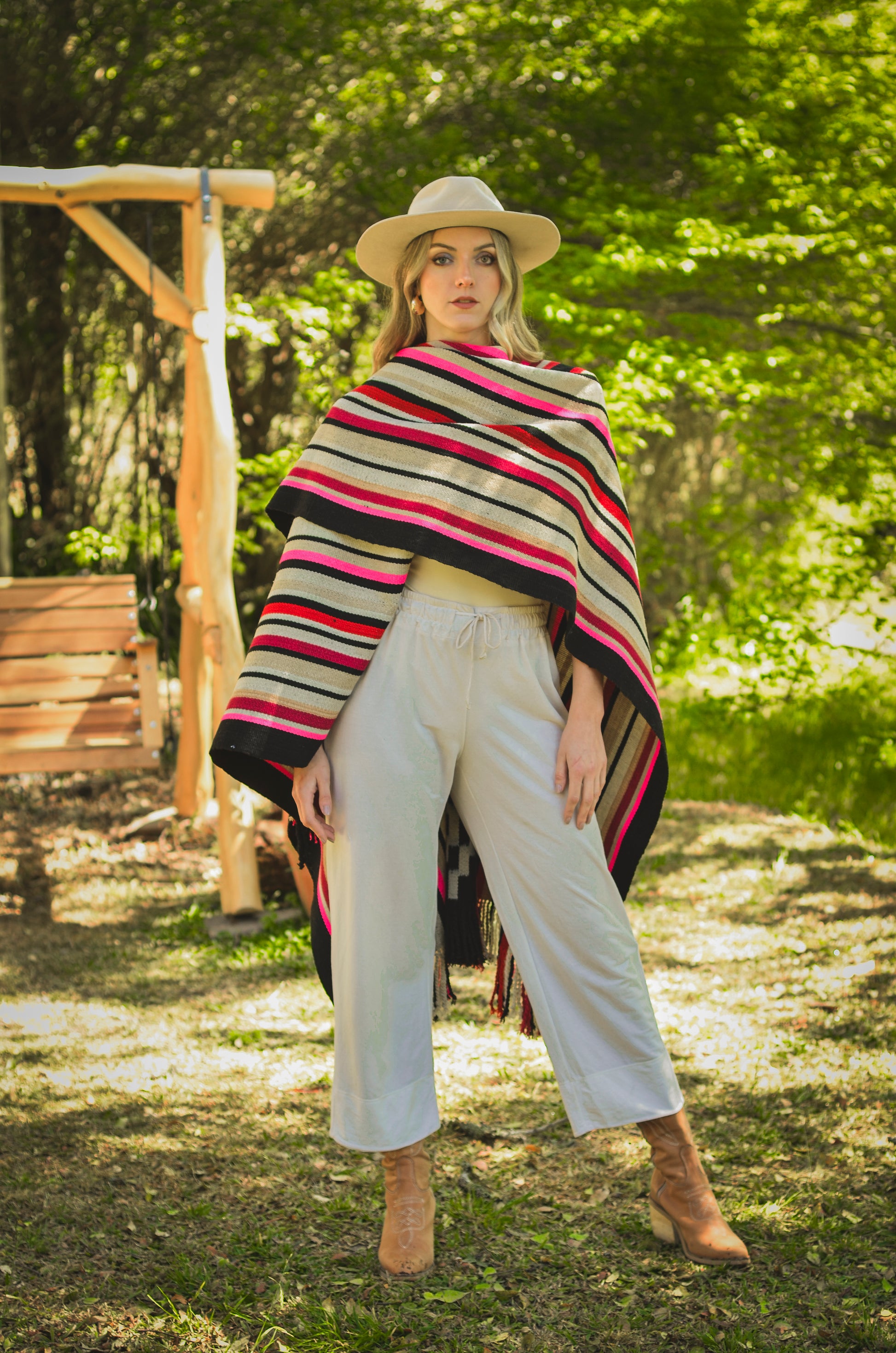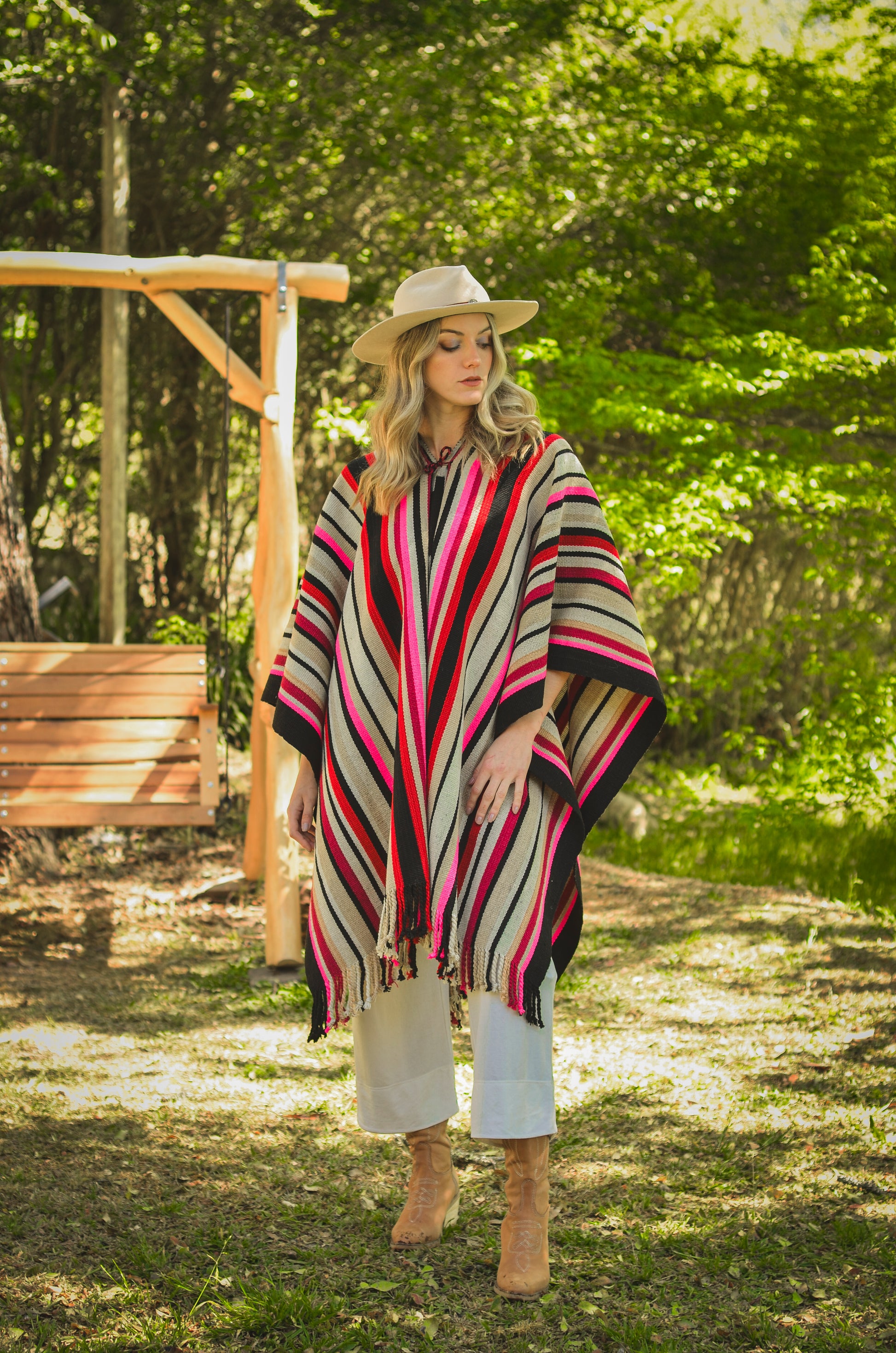 El poncho es una pieza única tejido artesanalmente en telar criollo, de alta densidad de trama cerrada y liviana en dos paños