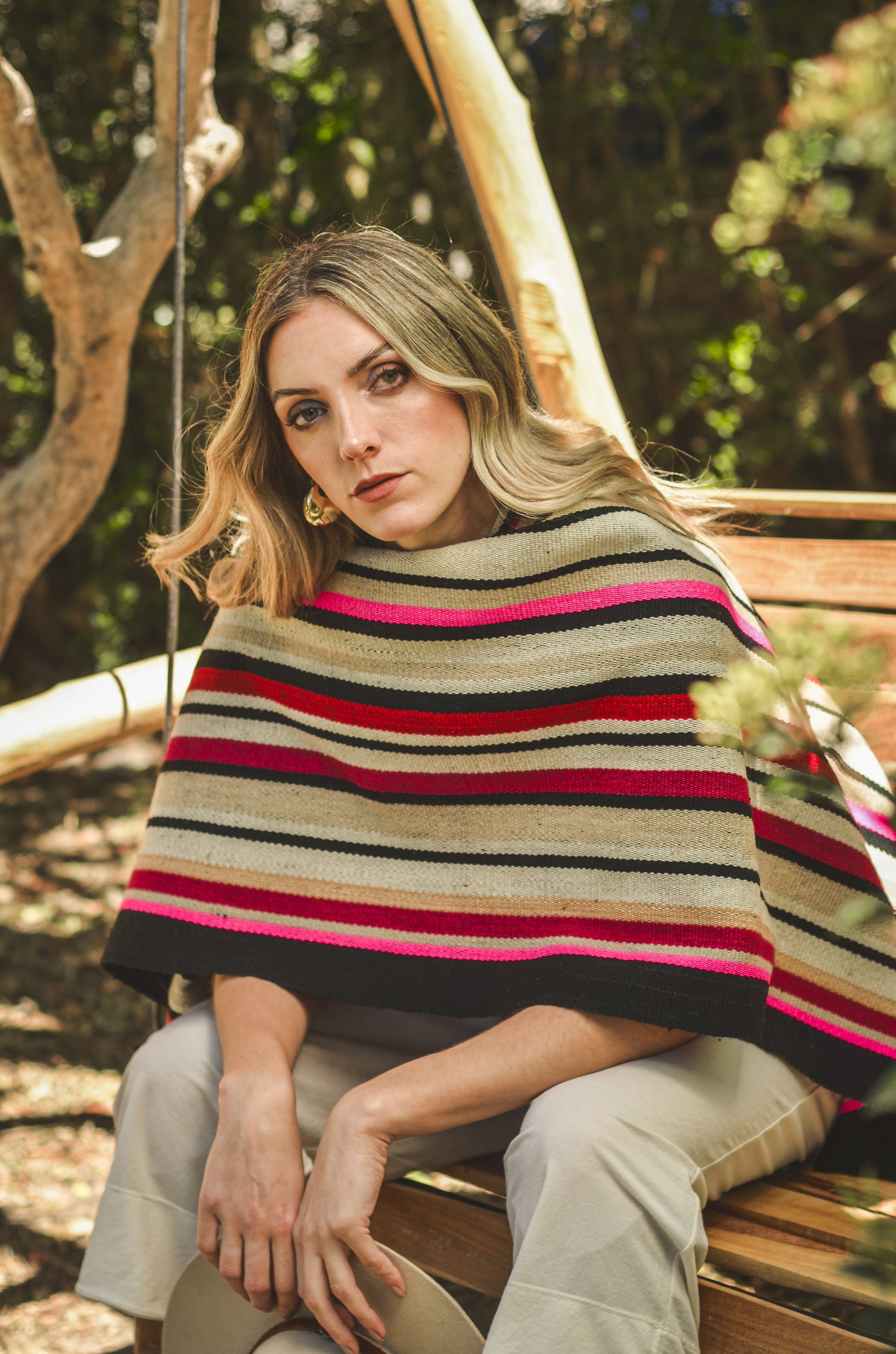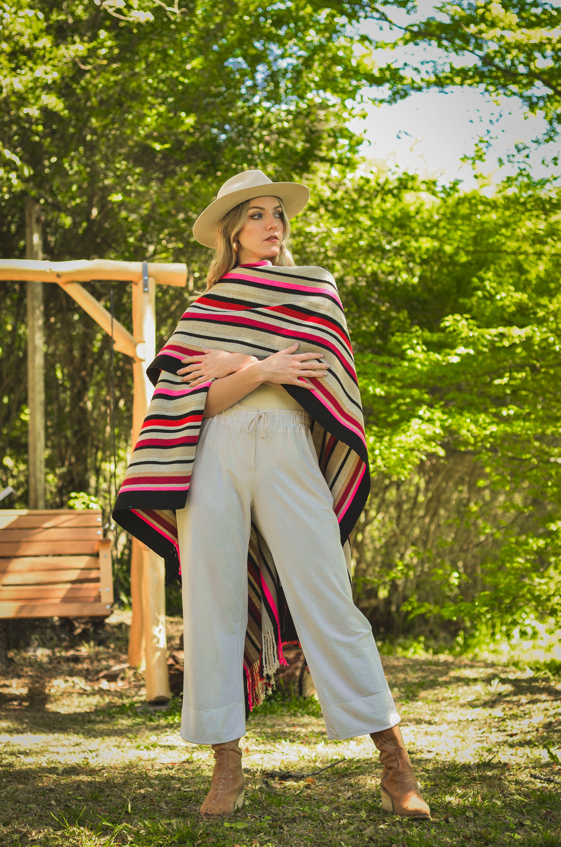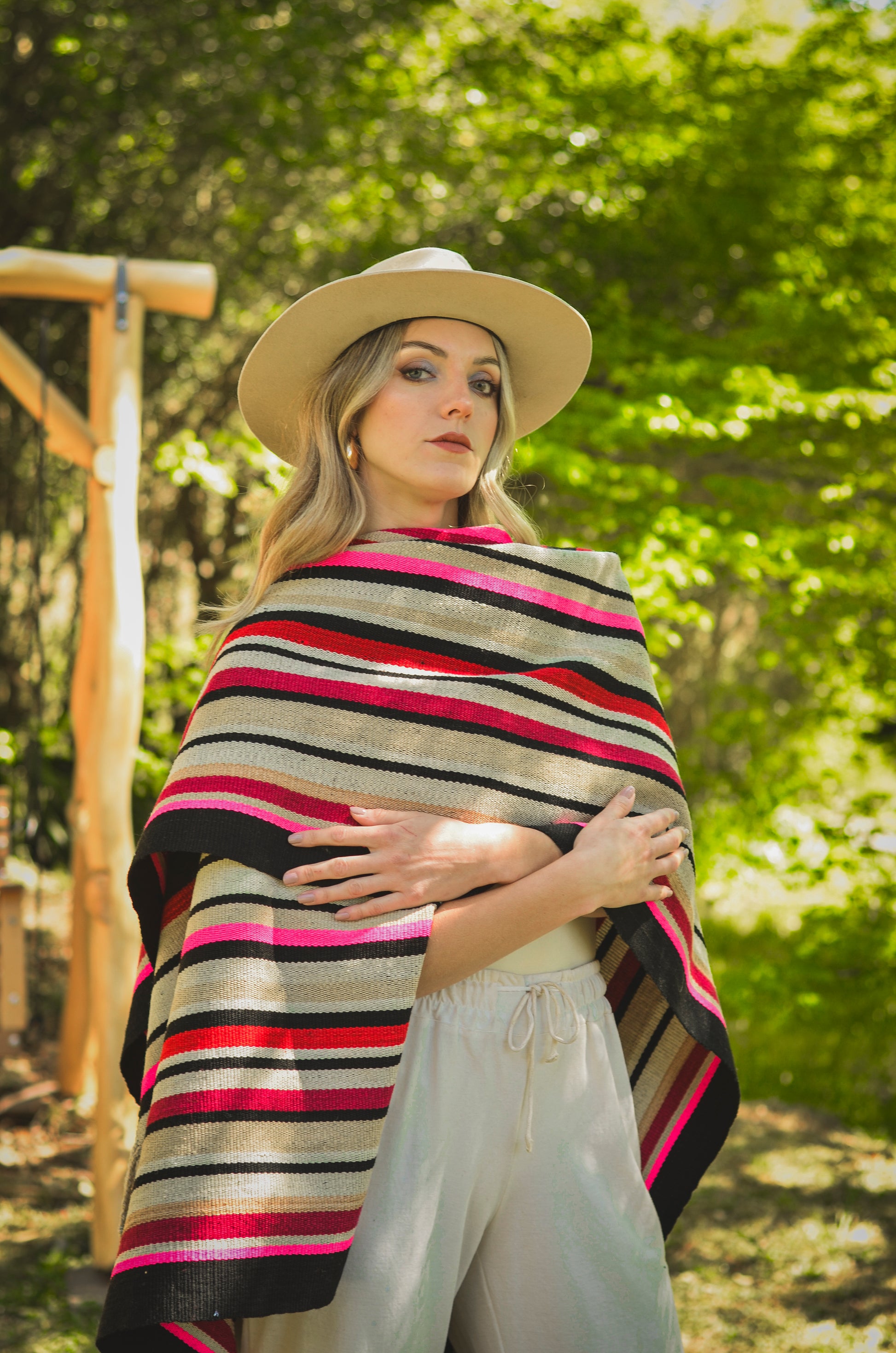 El poncho es una pieza única tejido artesanalmente en telar criollo, de alta densidad de trama cerrada y liviana en dos paños