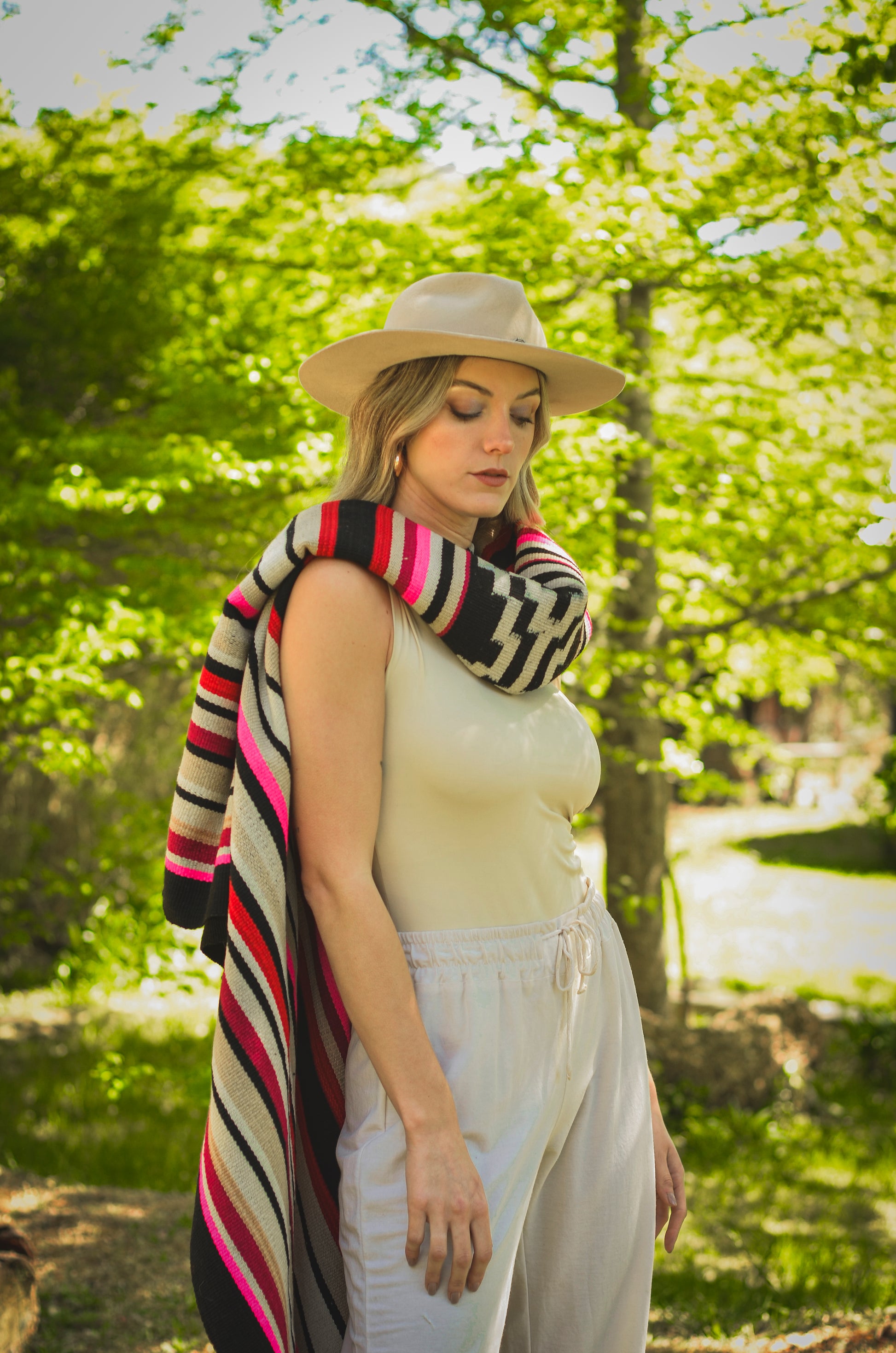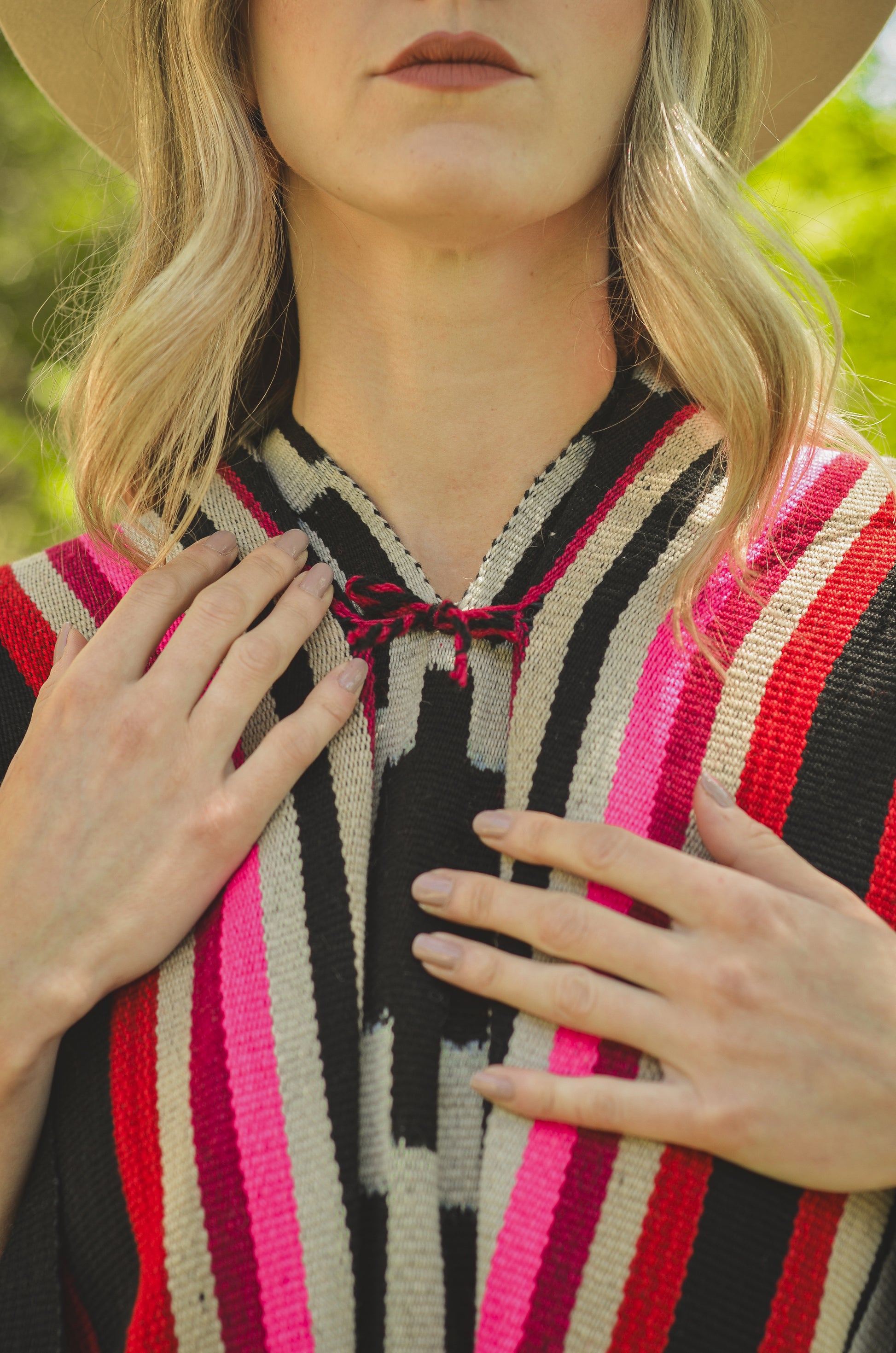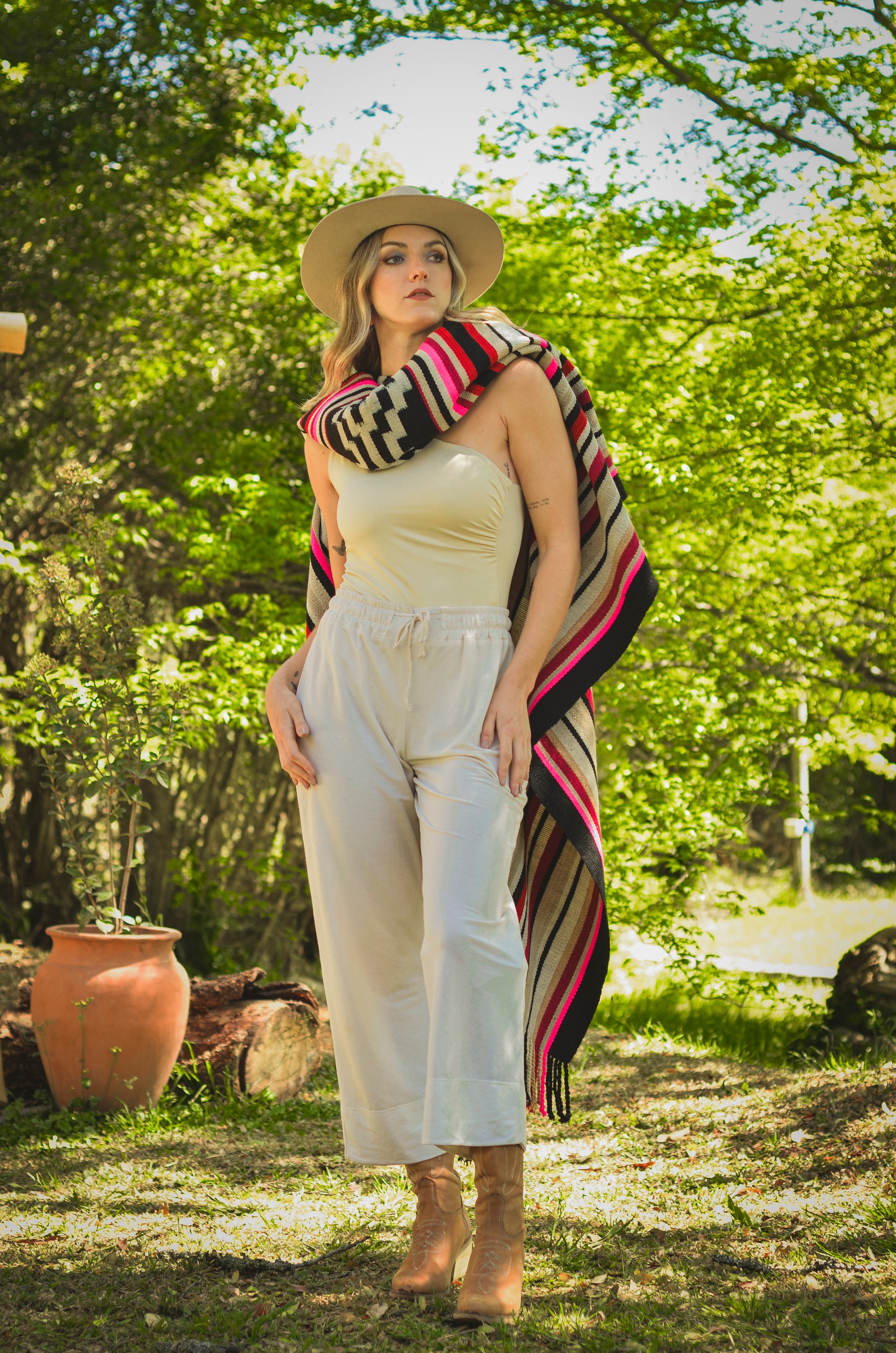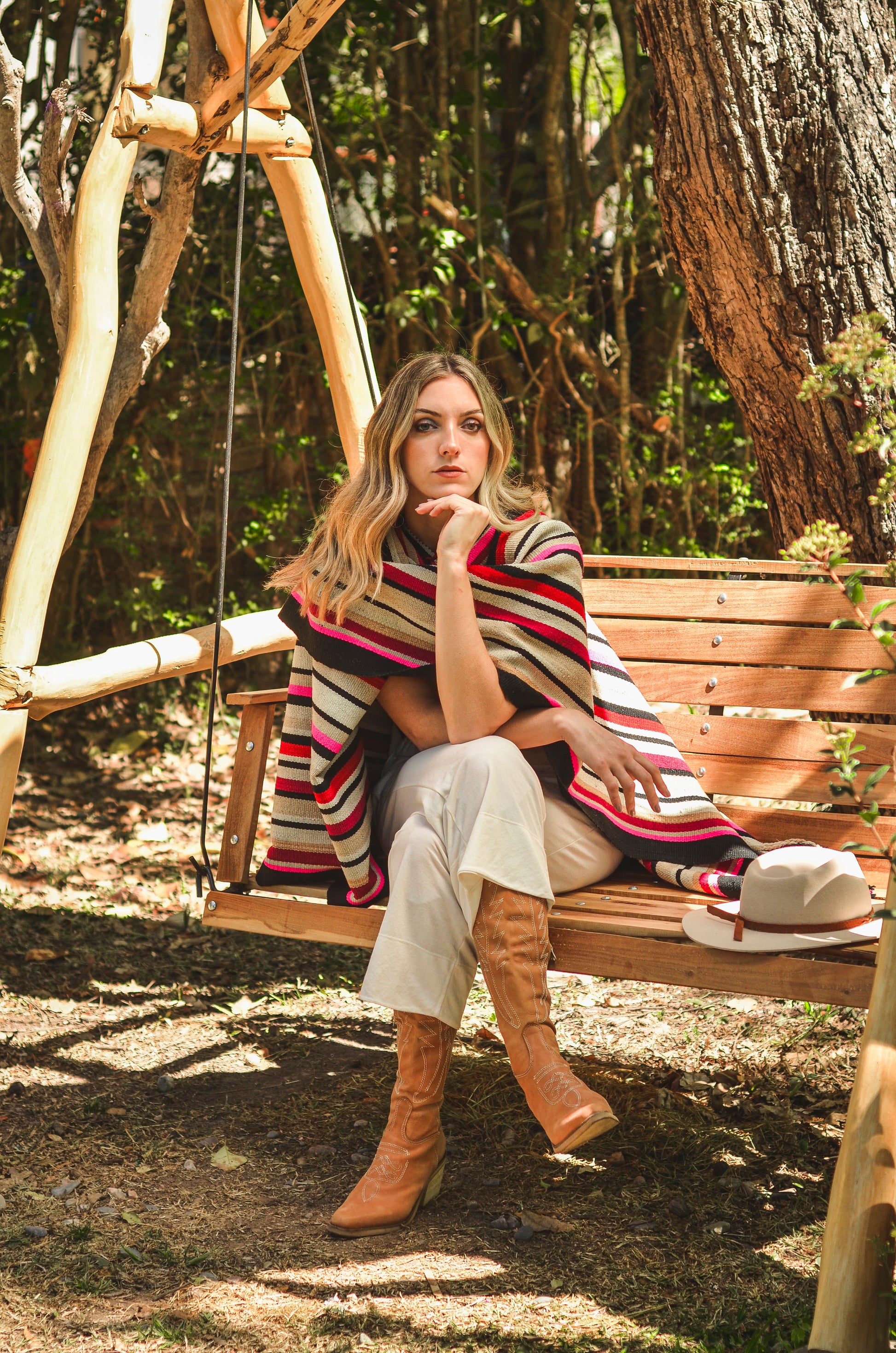 El poncho es una pieza única tejido artesanalmente en telar criollo, de alta densidad de trama cerrada y liviana en dos paños