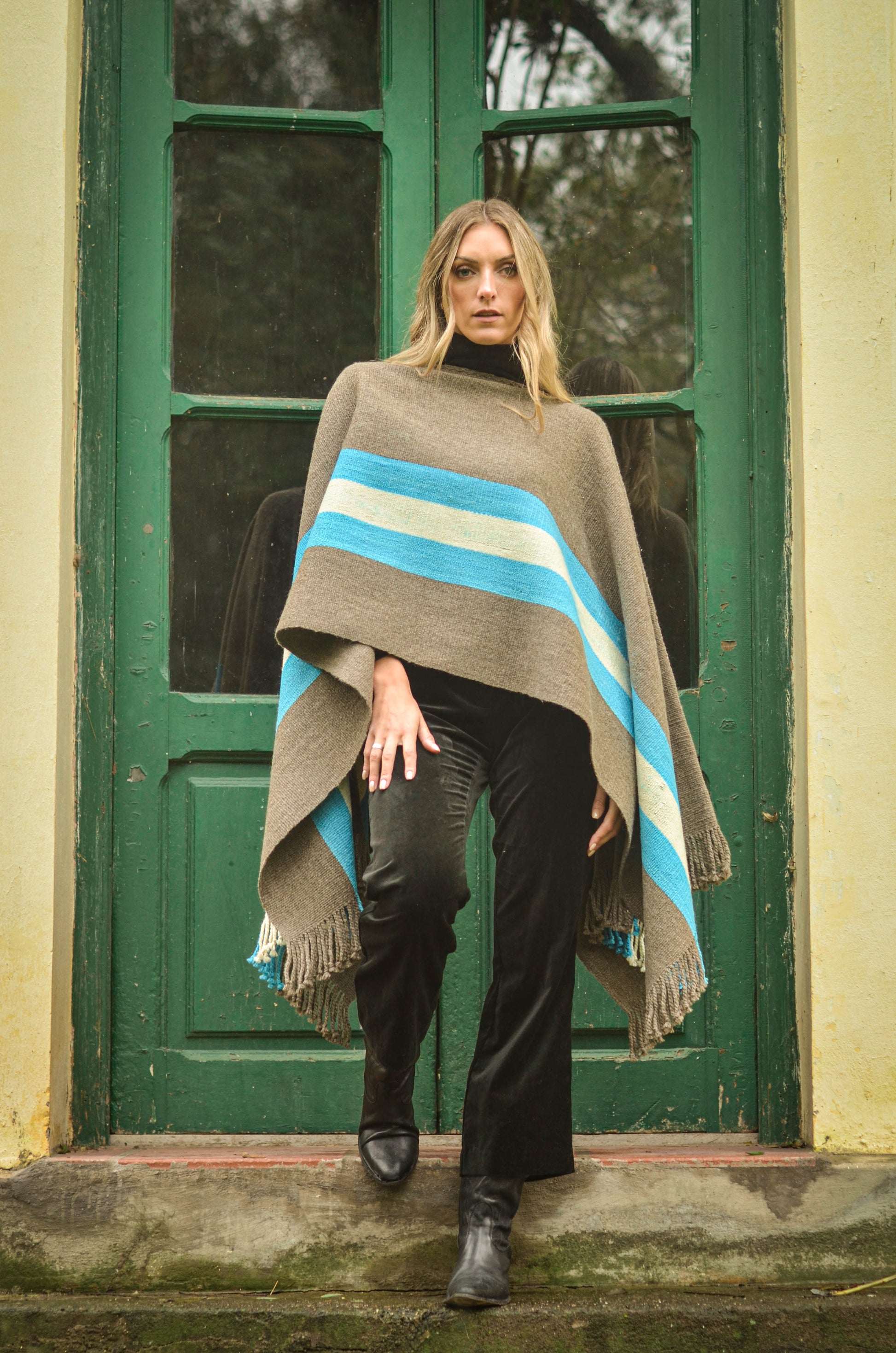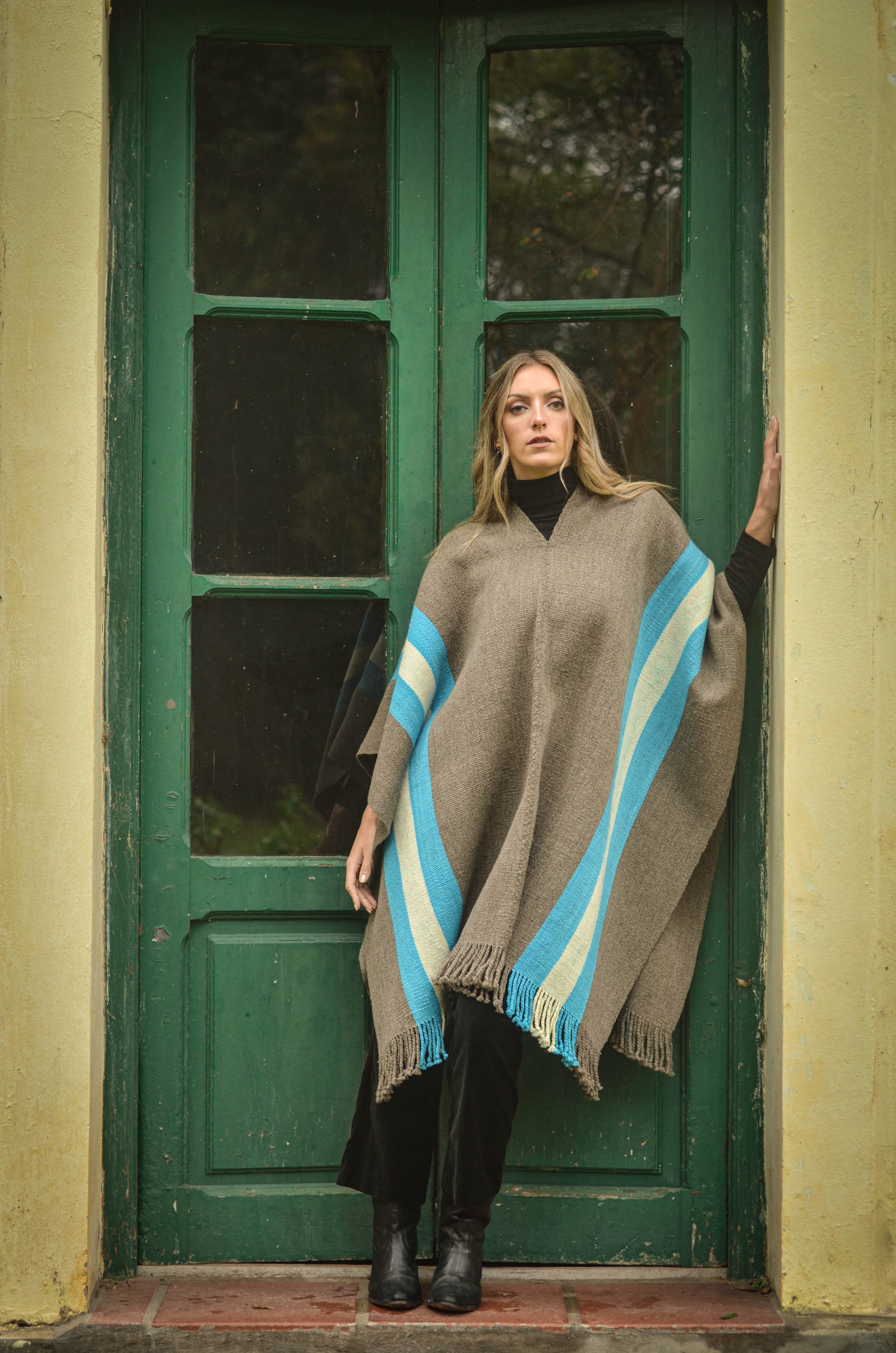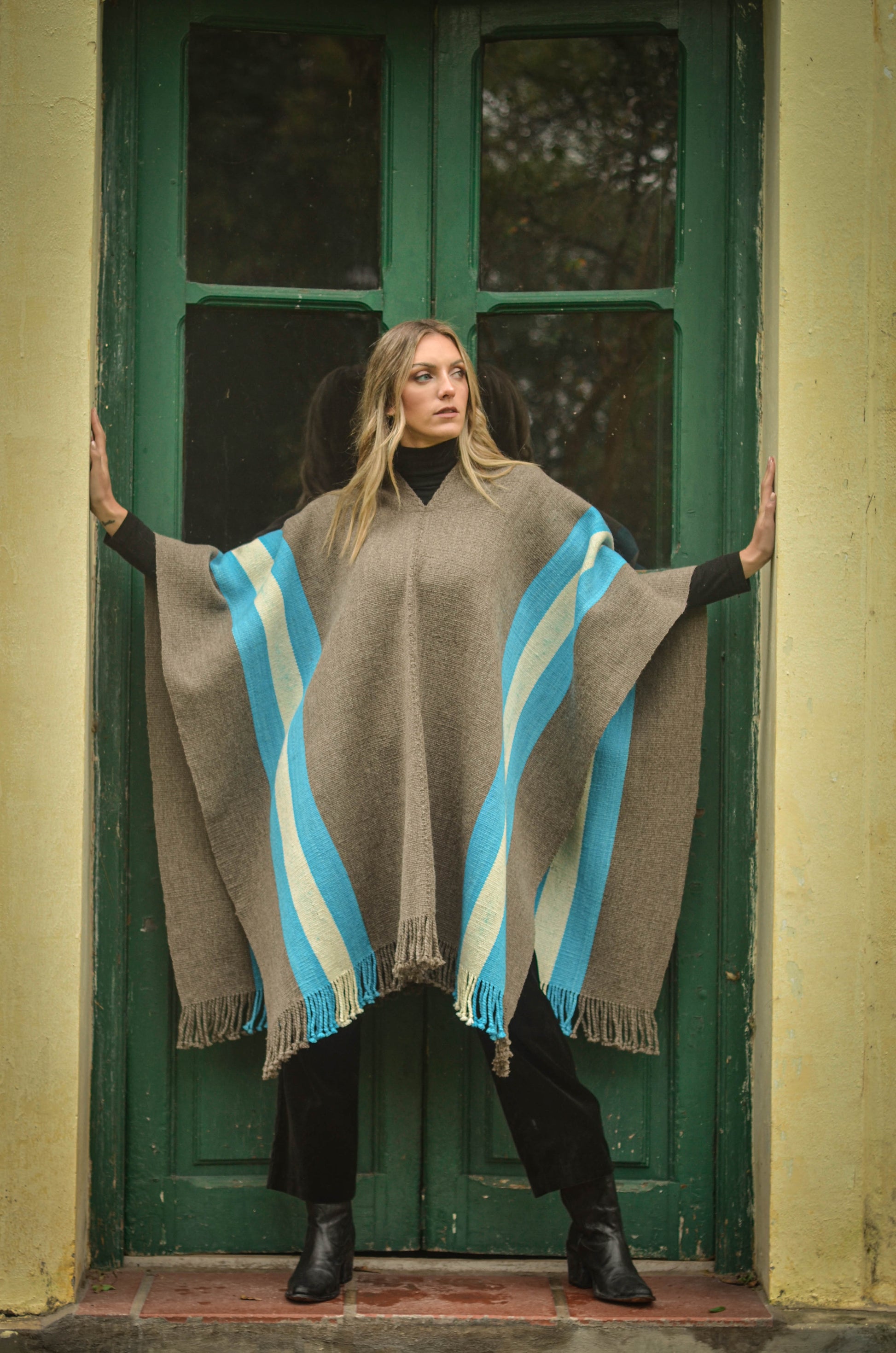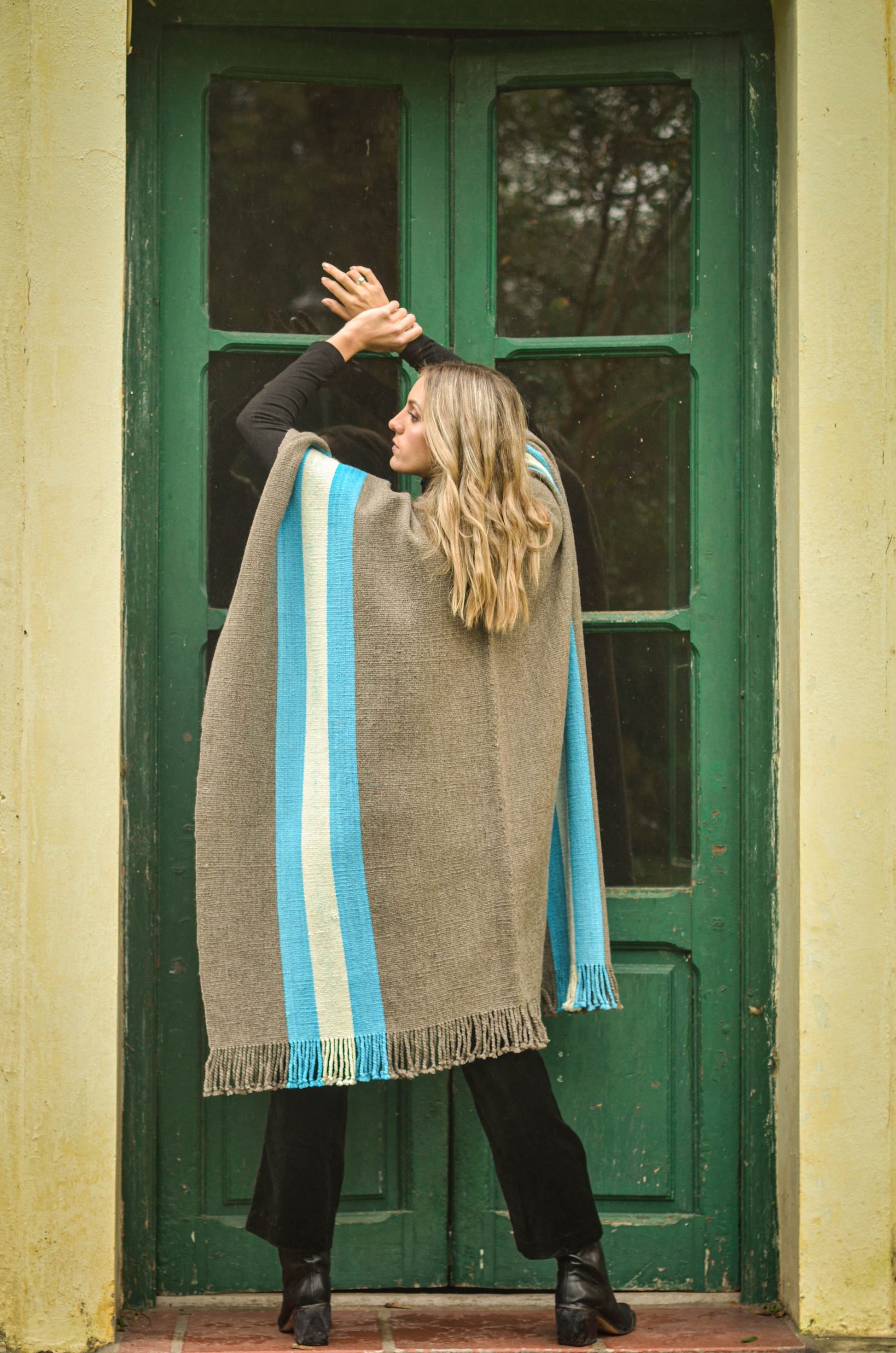 El poncho es una pieza única tejido artesanalmente en telar criollo, de alta densidad de trama cerrada y liviana en dos paños color Gris