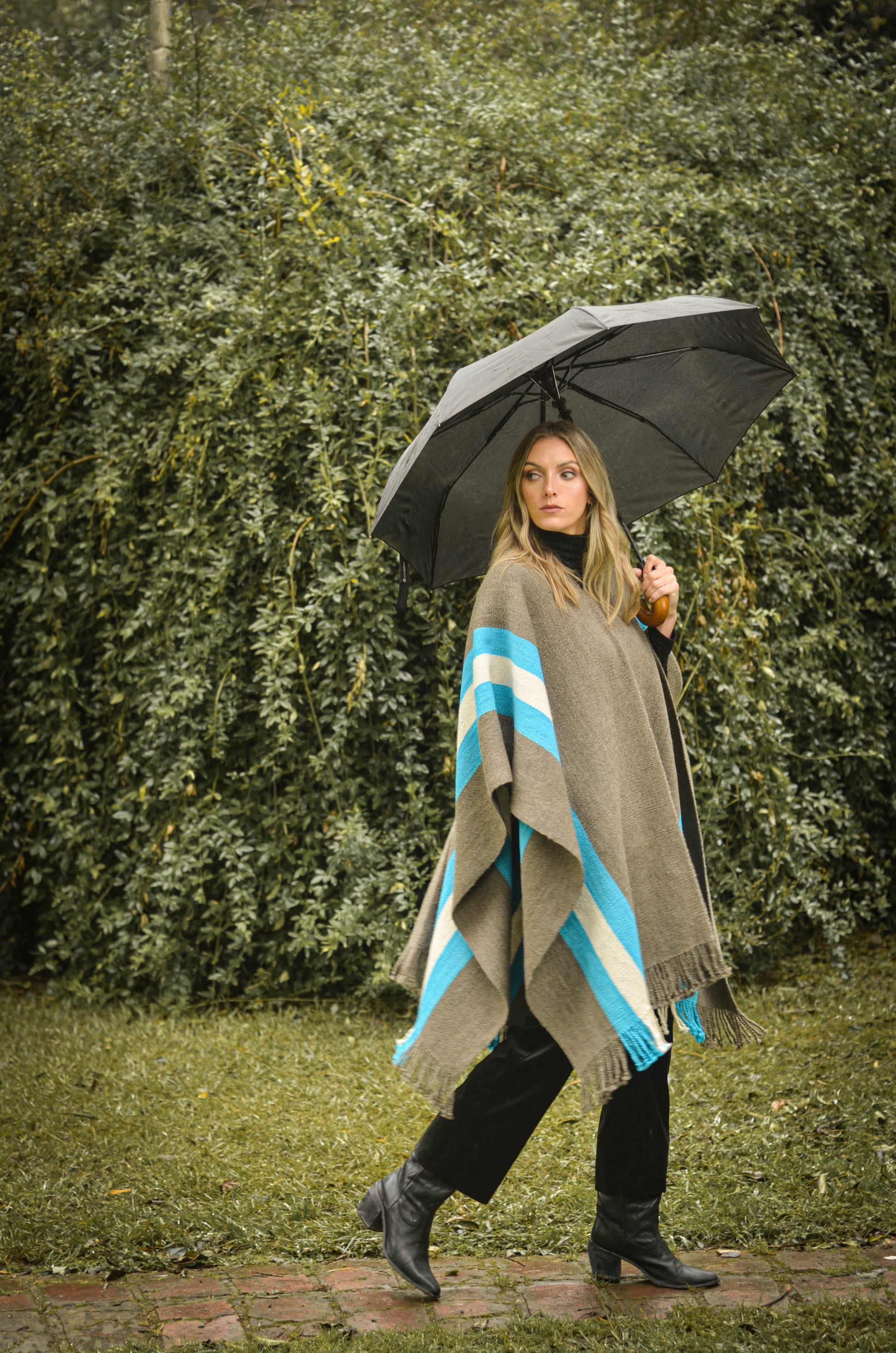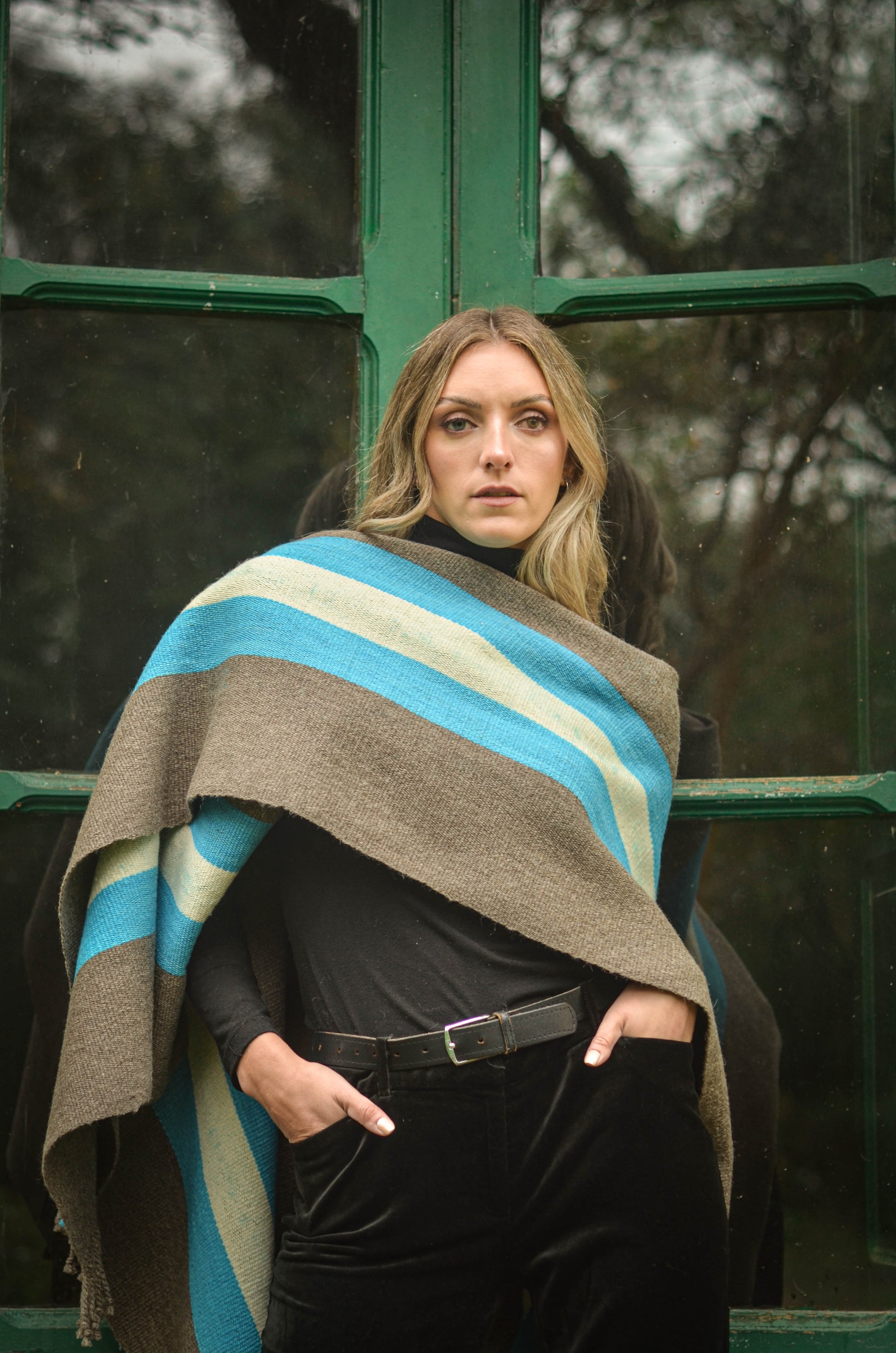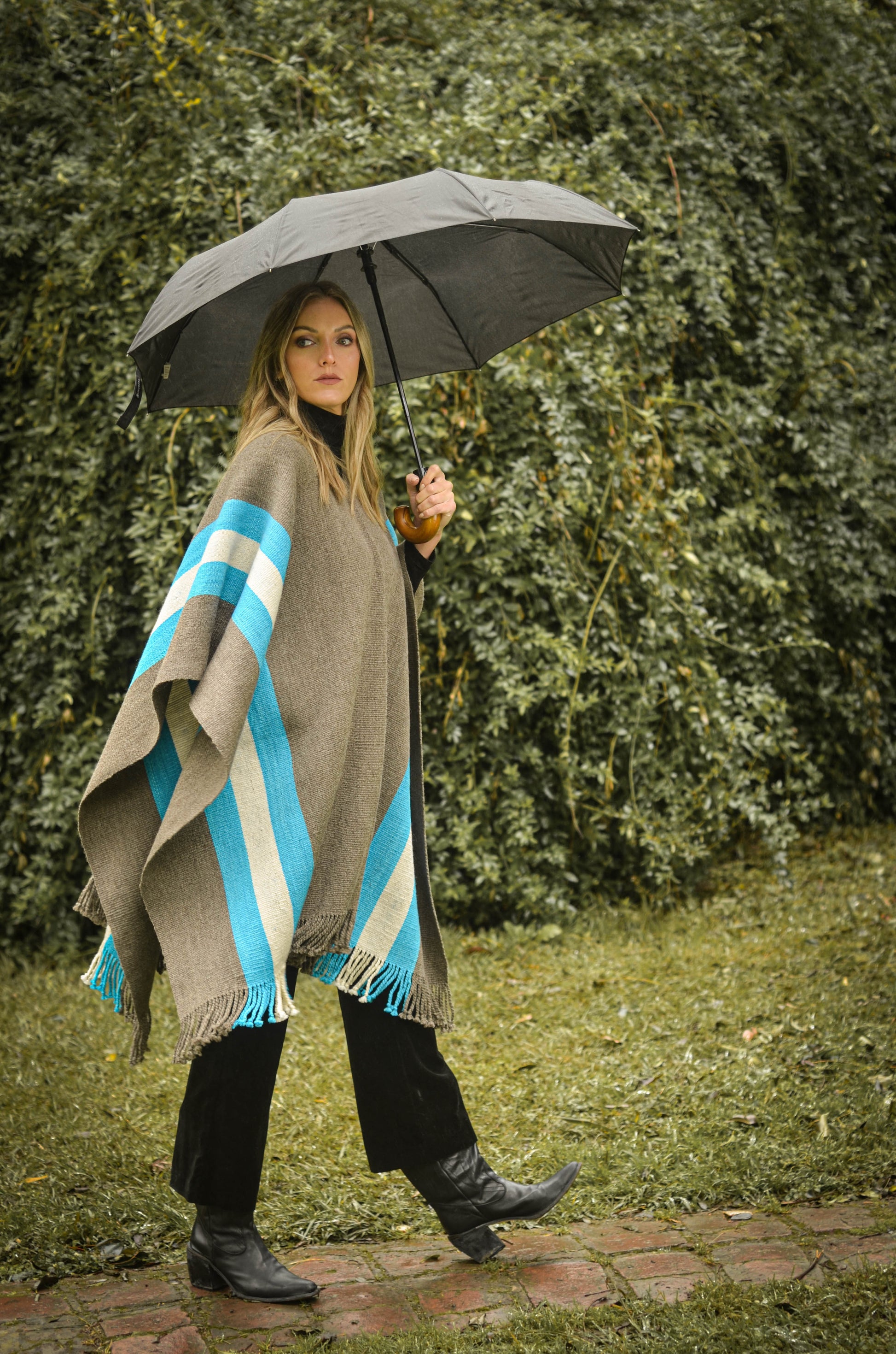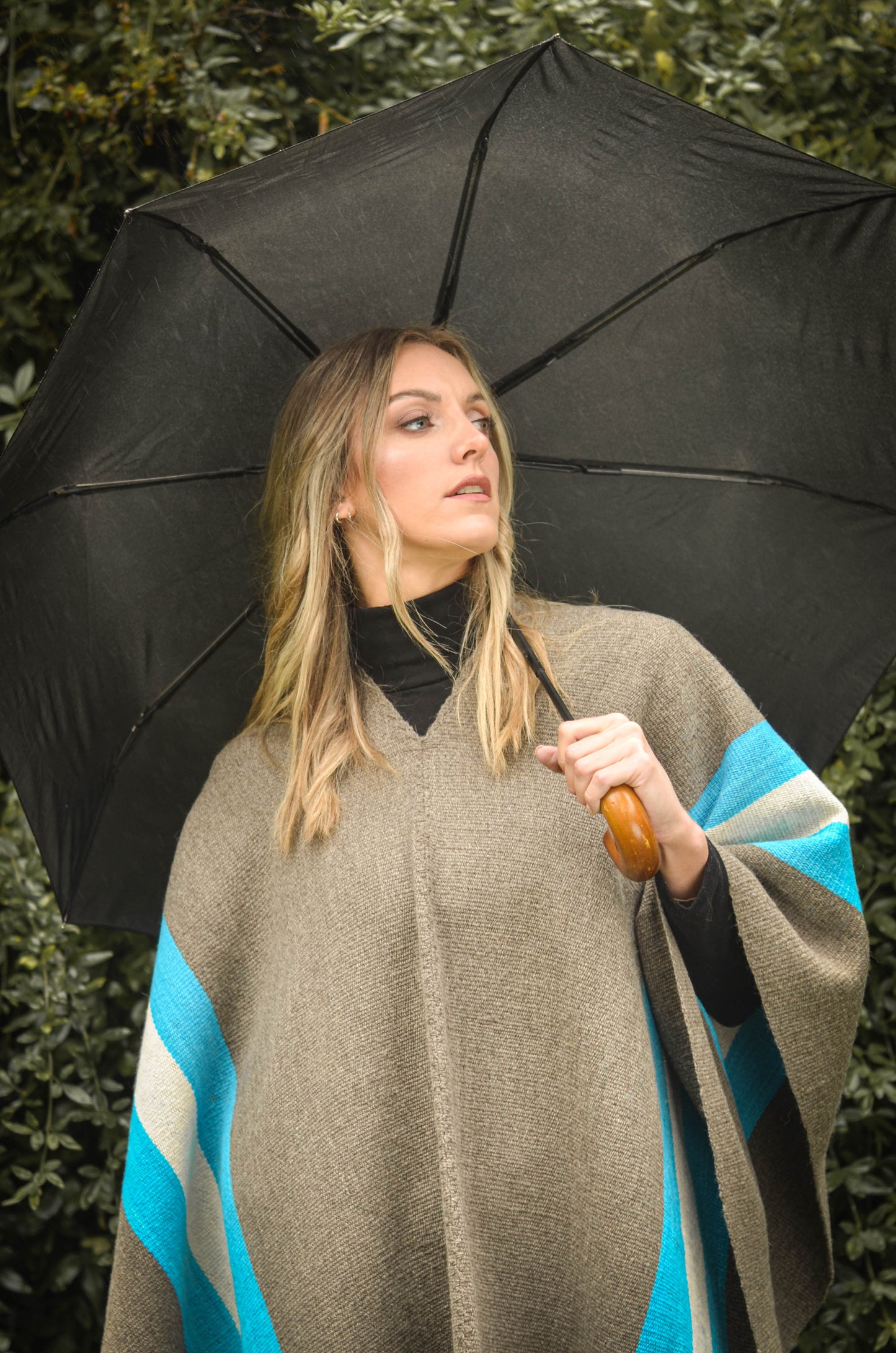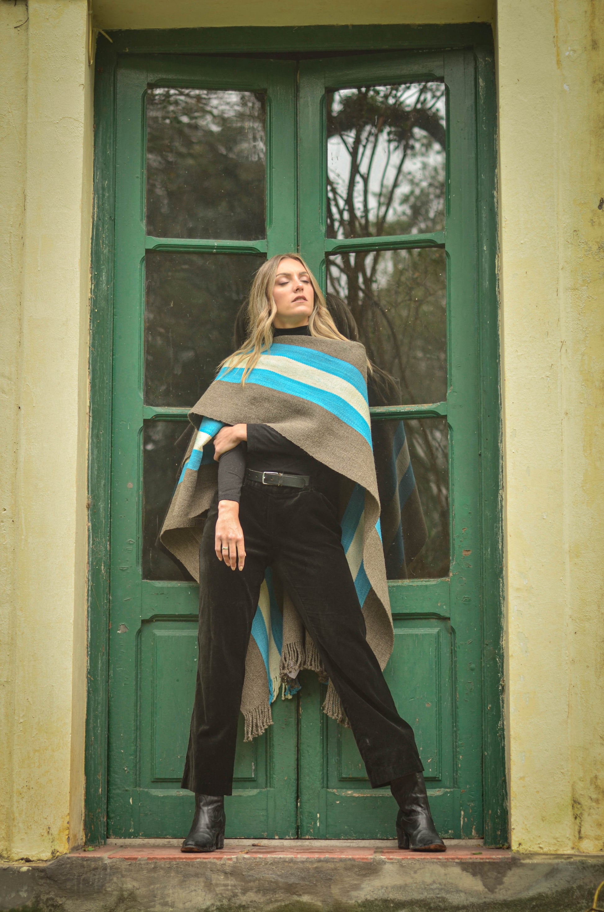 El poncho es una pieza única tejido artesanalmente en telar criollo, de alta densidad de trama cerrada y liviana en dos paños color Gris