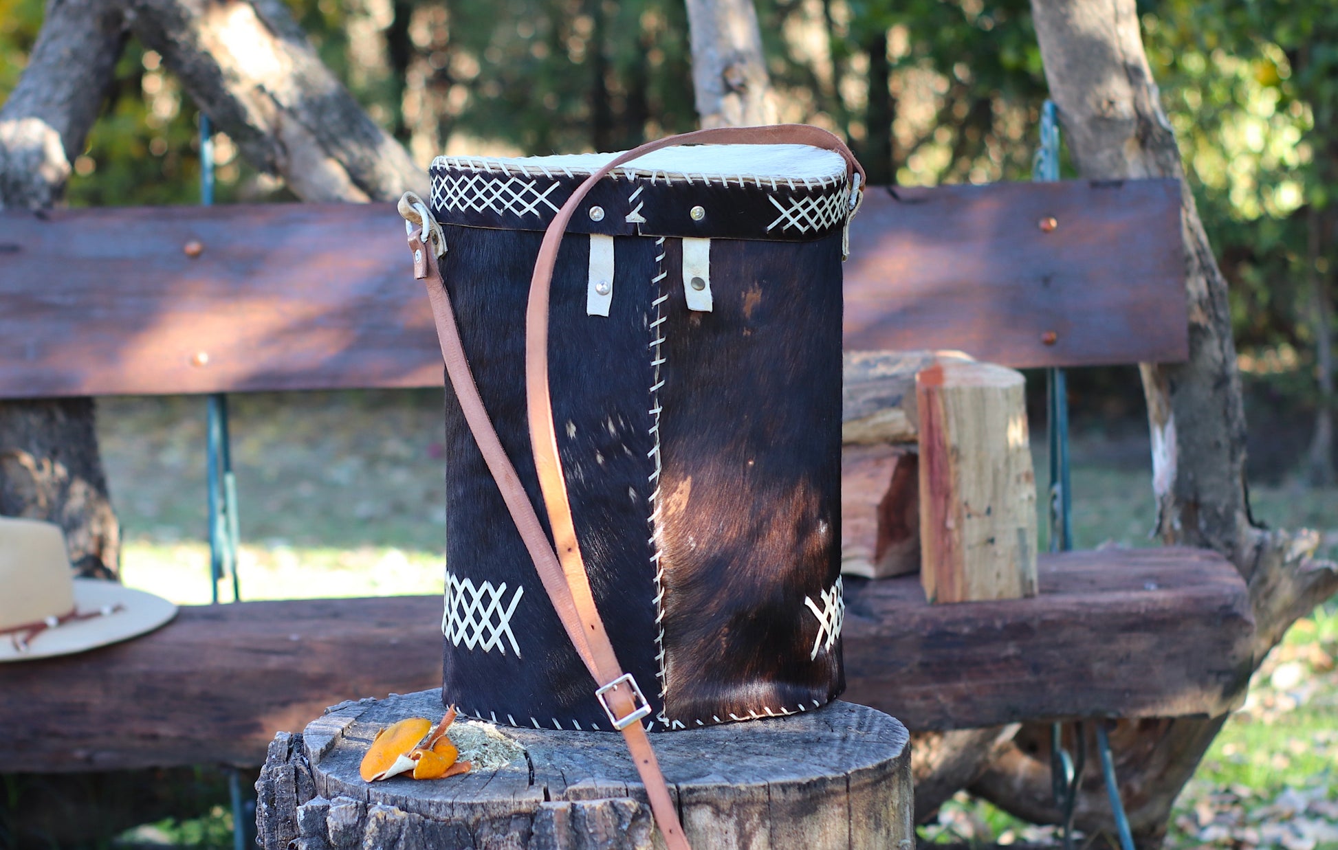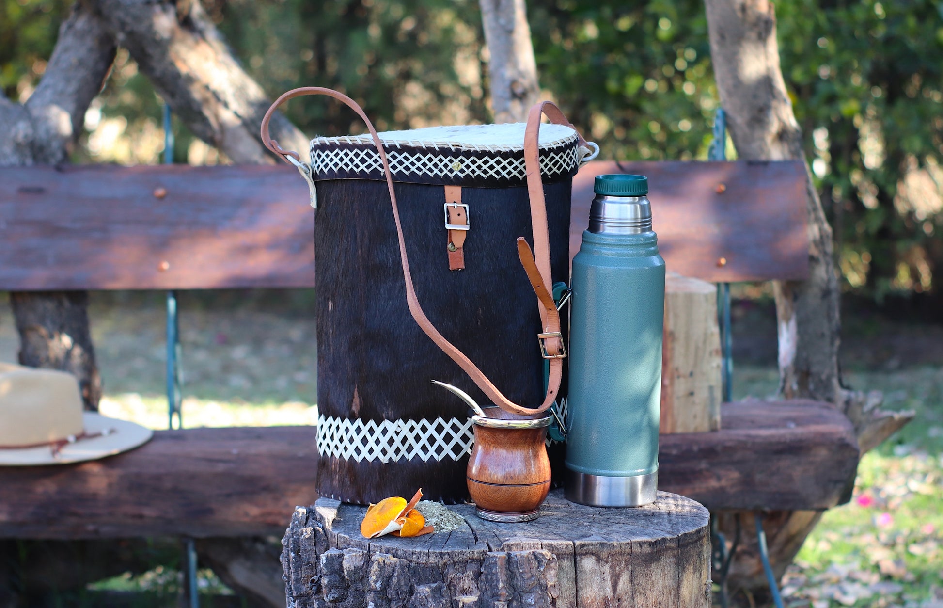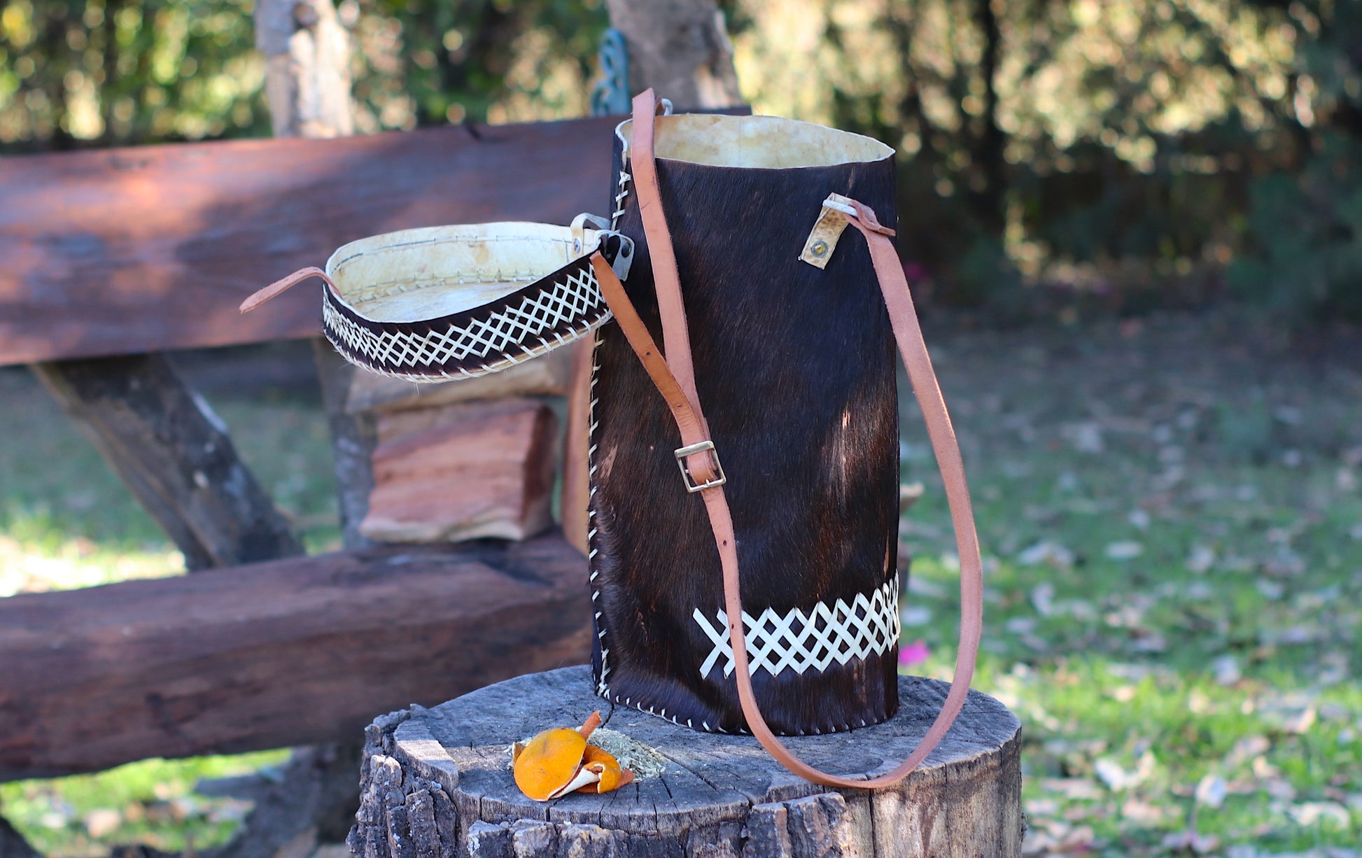 Porta equipo matero de cuero natural hecho a mano cocido con tientos.