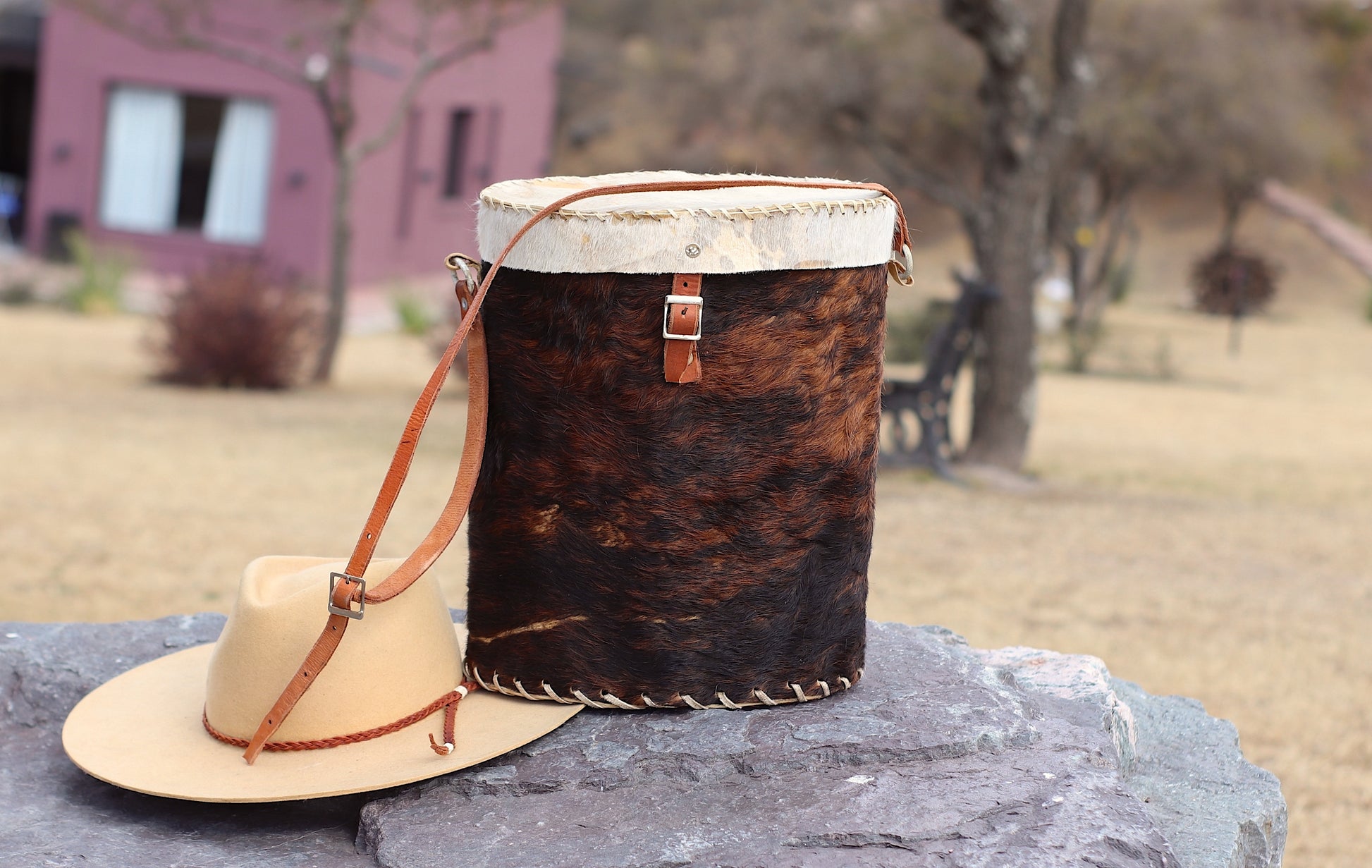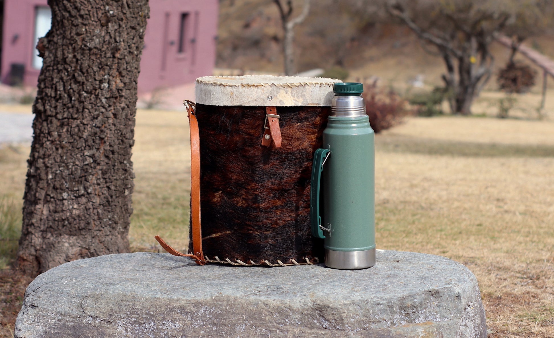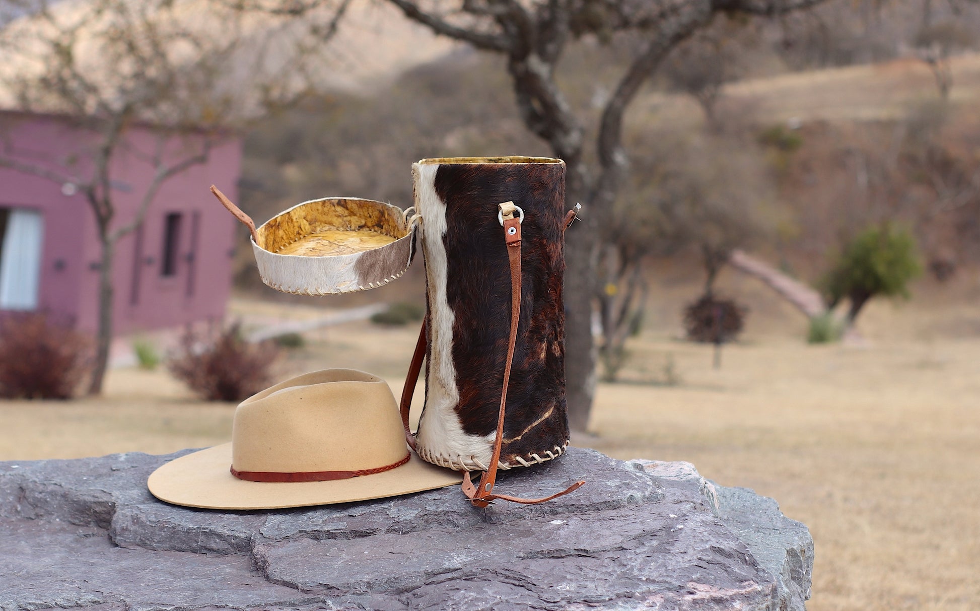 Porta equipo matero de cuero natural hecho a mano cocido con tientos.